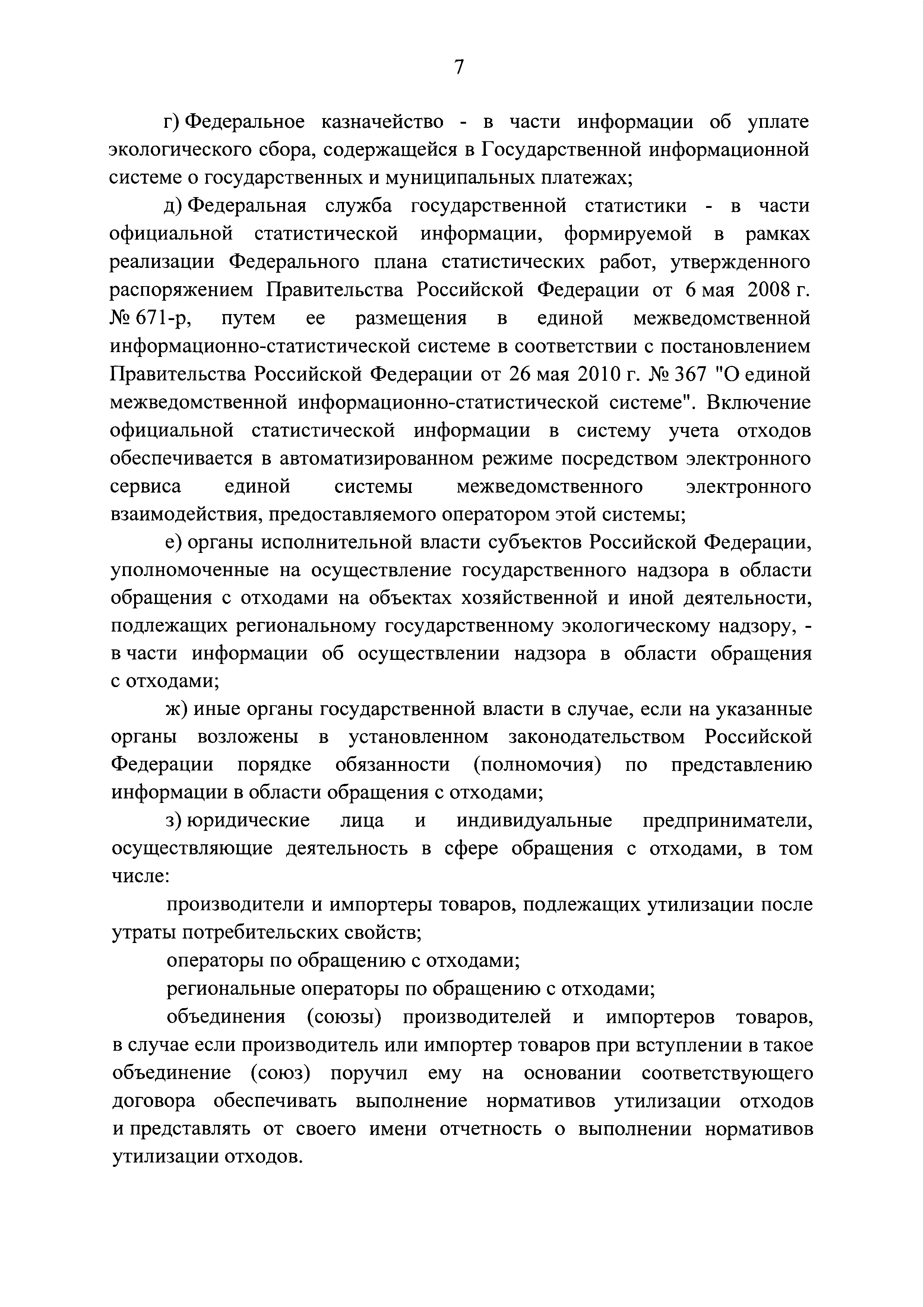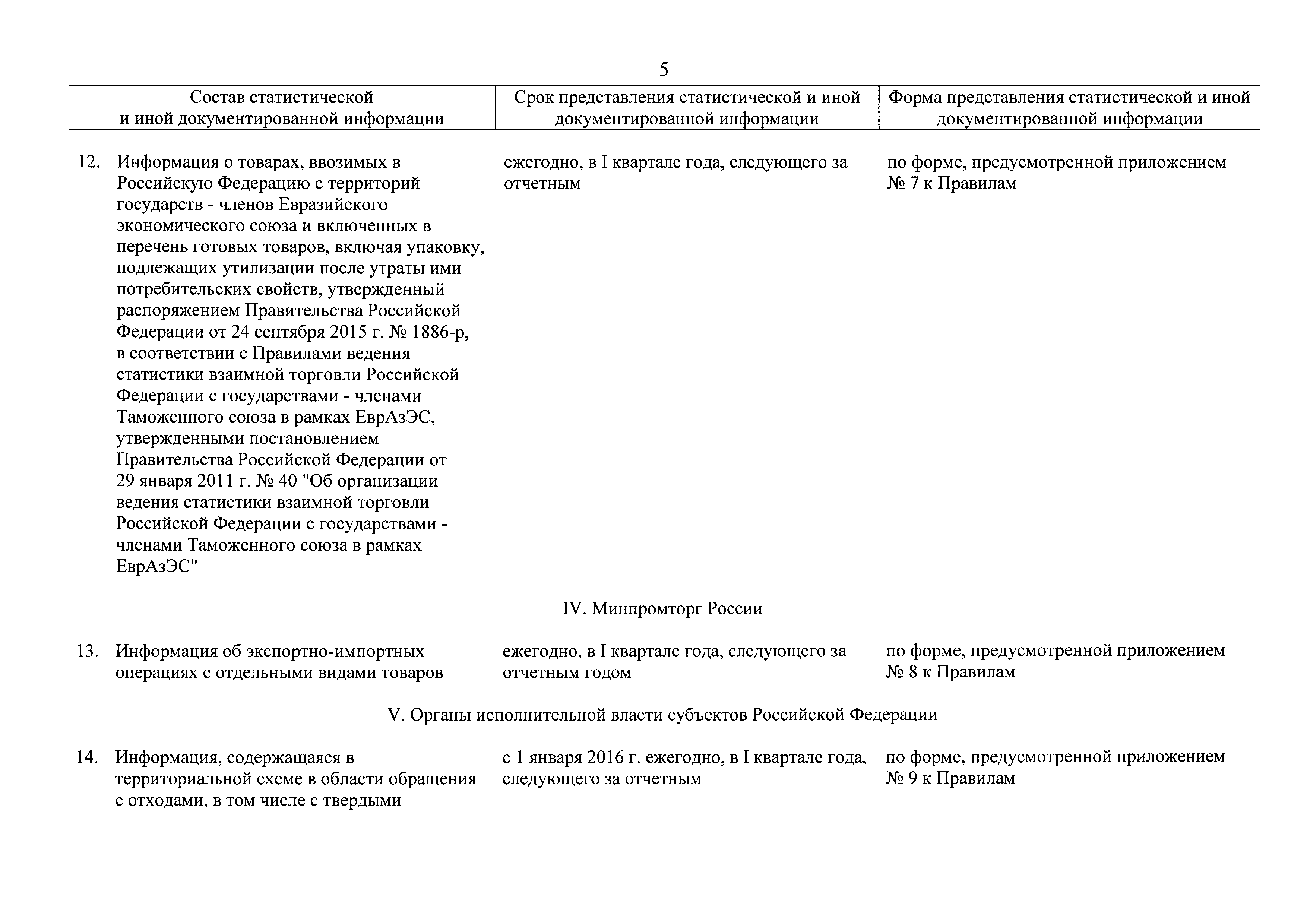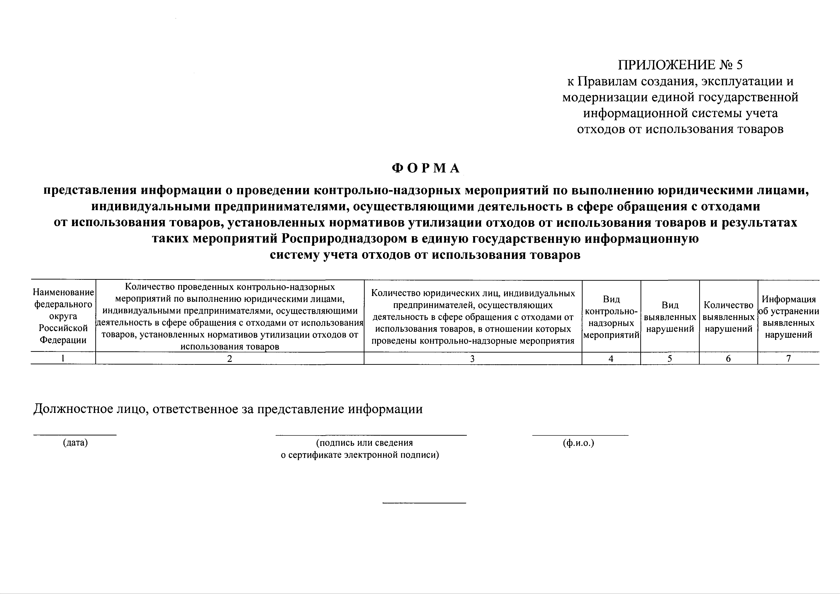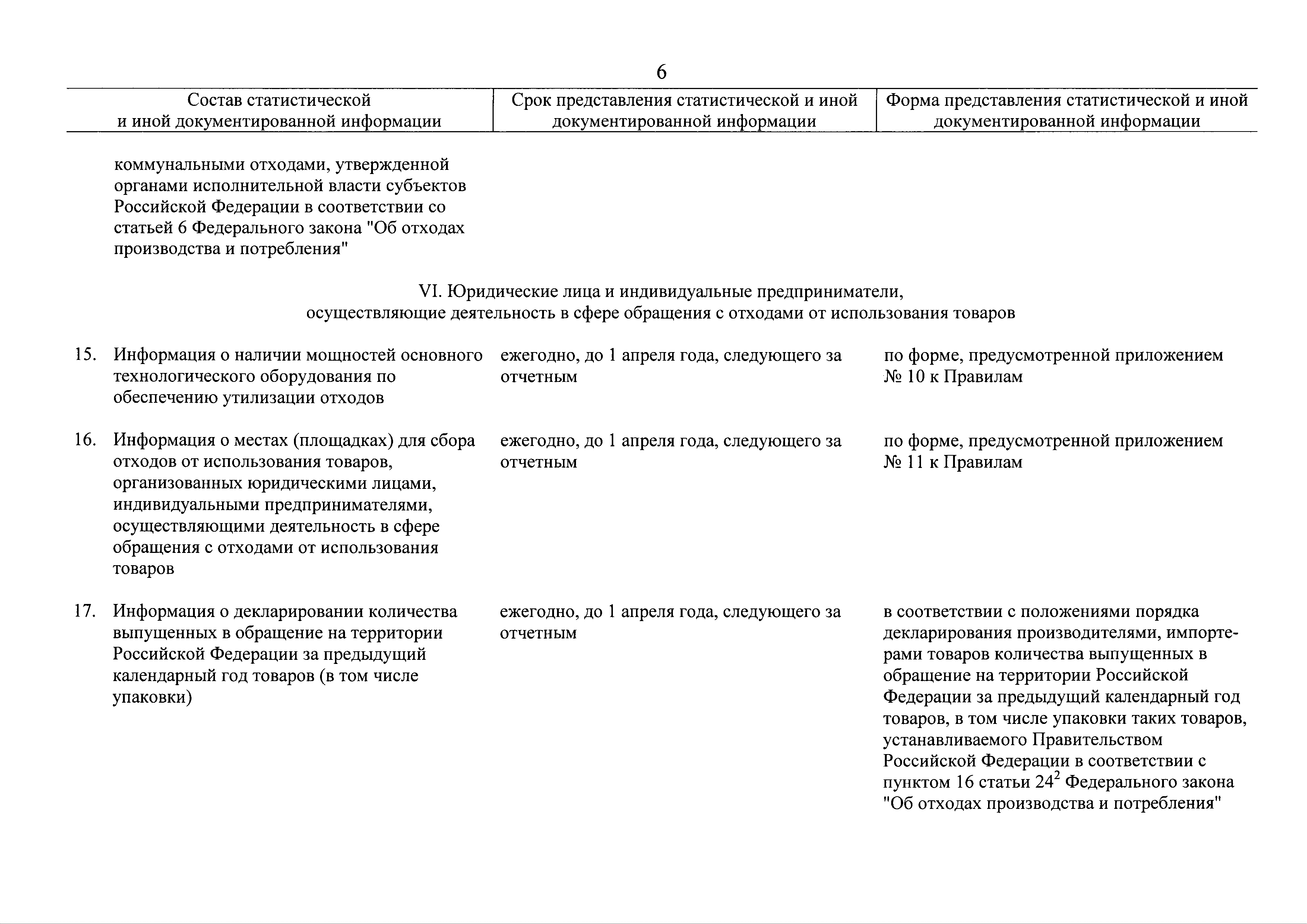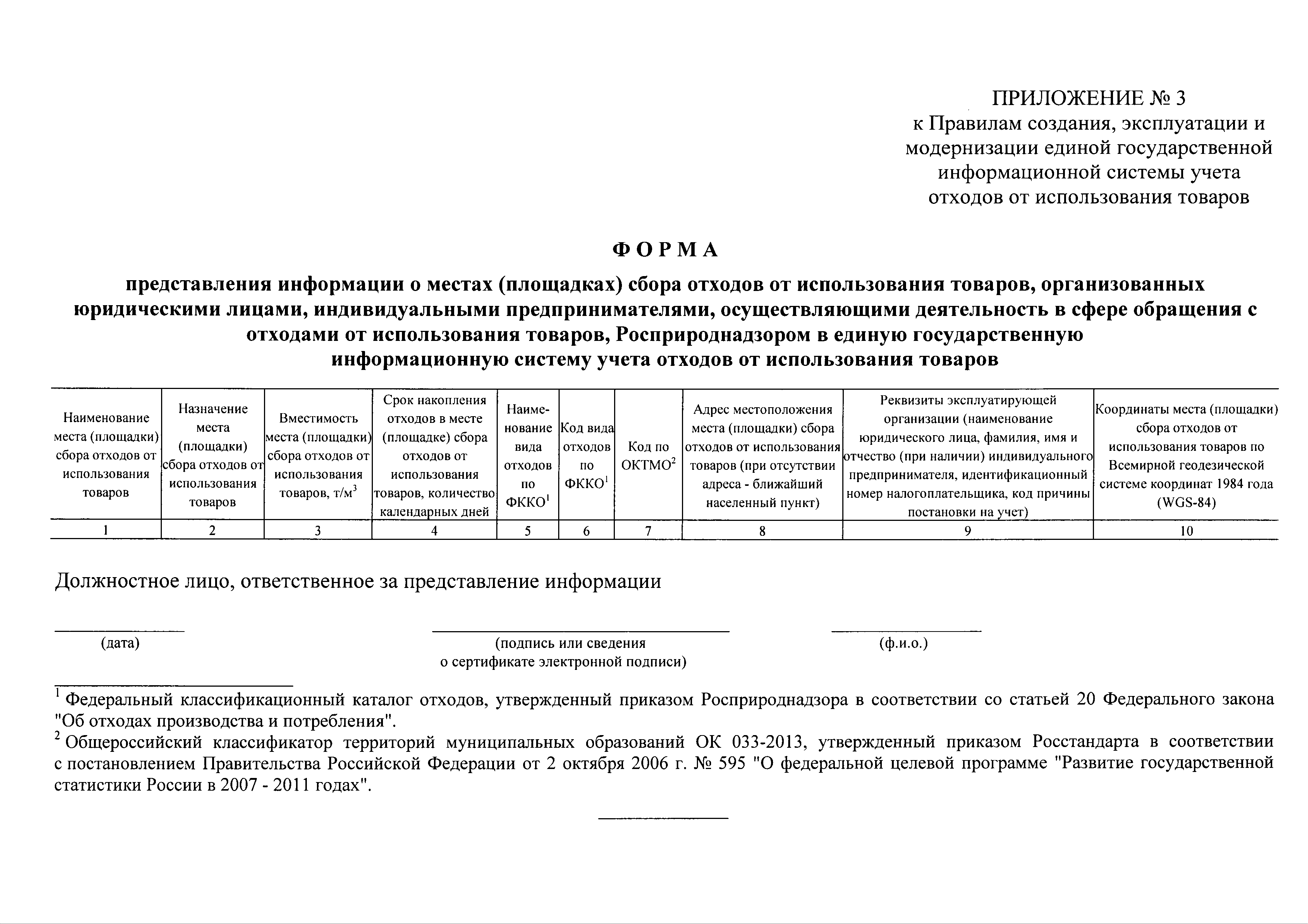 | Оглавление: | Приложение № 1. Перечень статистической и иной документированной информации, представляемой поставщиками информации в единую государственную информационную систему учета отходов от использования товаров Приложение № 2. Форма представления информации о наличии мощностей основного технологического оборудования по обеспечению утилизации отходов Росприроднадзором в единую государственную информационную систему учета отходов от использования товаров Приложение № 3. Форма представления информации о местах (площадках) сбора отходов от использования товаров, организованных юридическими лицами, индивидуальными предпринимателями, осуществляющими деятельность в сфере обращения с отходами от использования товаров, Росприроднадзором в единую государственную информационную систему учета отходов от использования товаров Приложение № 4. Форма представления информации о деятельности отчитывающихся юридических лиц, индивидуальных предпринимателей, осуществляющих деятельность в сфере обращения с отходами от использования товаров, Росприроднадзором в единую государственную информационную систему учета отходов от использования товаров Приложение № 5. Форма представления информации о проведении контрольно-надзорных мероприятий по выполнению юридическими лицами, индивидуальными предпринимателями, осуществляющими деятельность в сфере обращения с отходами от использования товаров, установленных нормативов утилизации отходов от использования товаров и результатах таких мероприятий Росприроднадзором в единую государственную информационную систему учета отходов от использования товаров Приложение № 6. Форма представления информации о товарах, которые ввозятся из государств, не являющихся членами Евразийского экономического союза, и включенных в перечень готовых товаров, включая упаковку, подлежащих утилизации после утраты ими потребительских свойств, ФТС России в единую государственную информационную систему учета отходов от использования товаров Приложение № 7. Форма представления информации о товарах, ввозимых в Российскую Федерацию с территорий государств - членов Евразийского экономического союза в соответствии с Правилами ведения статистики взаимной торговли Российской Федерации с государствами - членами Таможенного союза ЕврАзЭС и включенных в перечень готовых товаров, включая упаковку, подлежащих утилизации после утраты ими потребительских свойств, представляемая ФТС России в единую государственную информационную систему учета отходов от использования товаров Приложение № 8. Форма представления информации об экспортно-импортных операциях с отдельными видами товаров Минпромторгом России в единую государственную информационную систему учета отходов от использования товаров Приложение № 9. Форма представления информации, содержащейся в утвержденной территориальной схеме в области обращения с отходами, в том числе с твердыми коммунальными отходами, органами исполнительной власти субъектов Российской Федерации в единую государственную информационную систему учета отходов от использования товаров Приложение № 10. Форма представления информации о наличии мощностей основного технологического оборудования по обеспечению утилизации отходов юридическими лицами, и