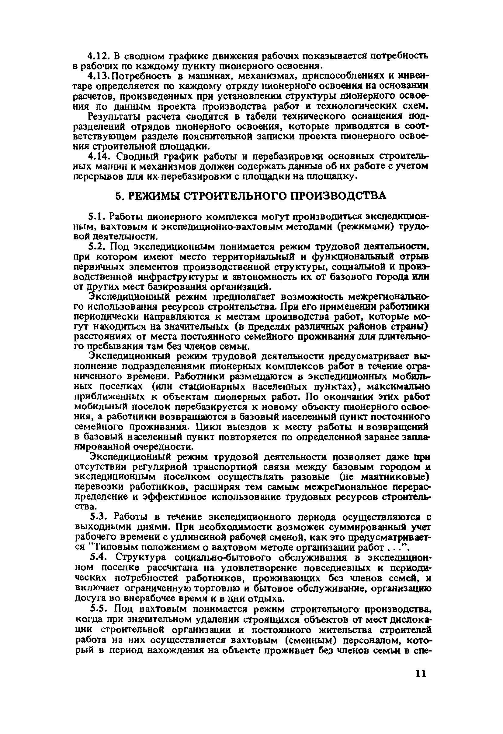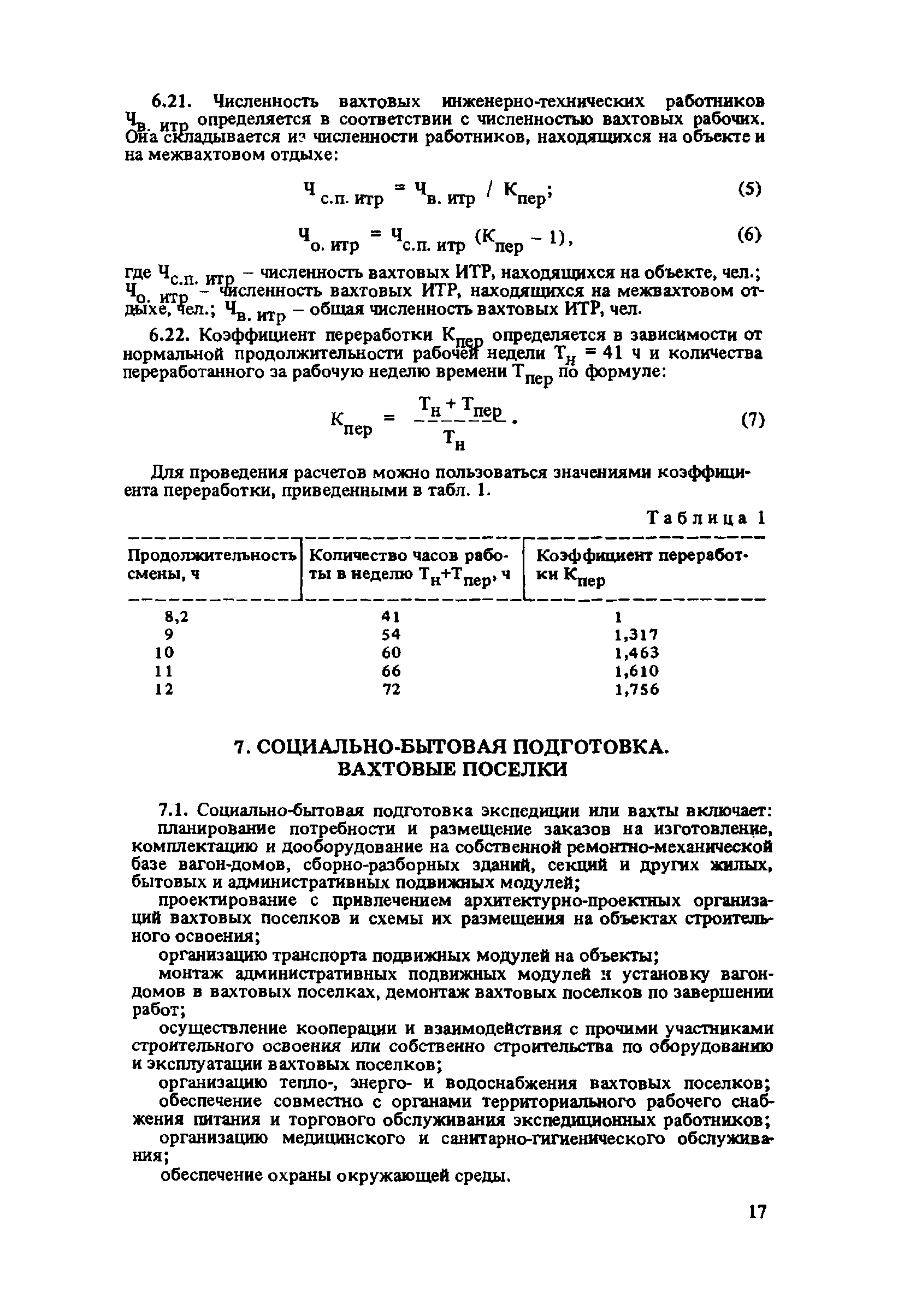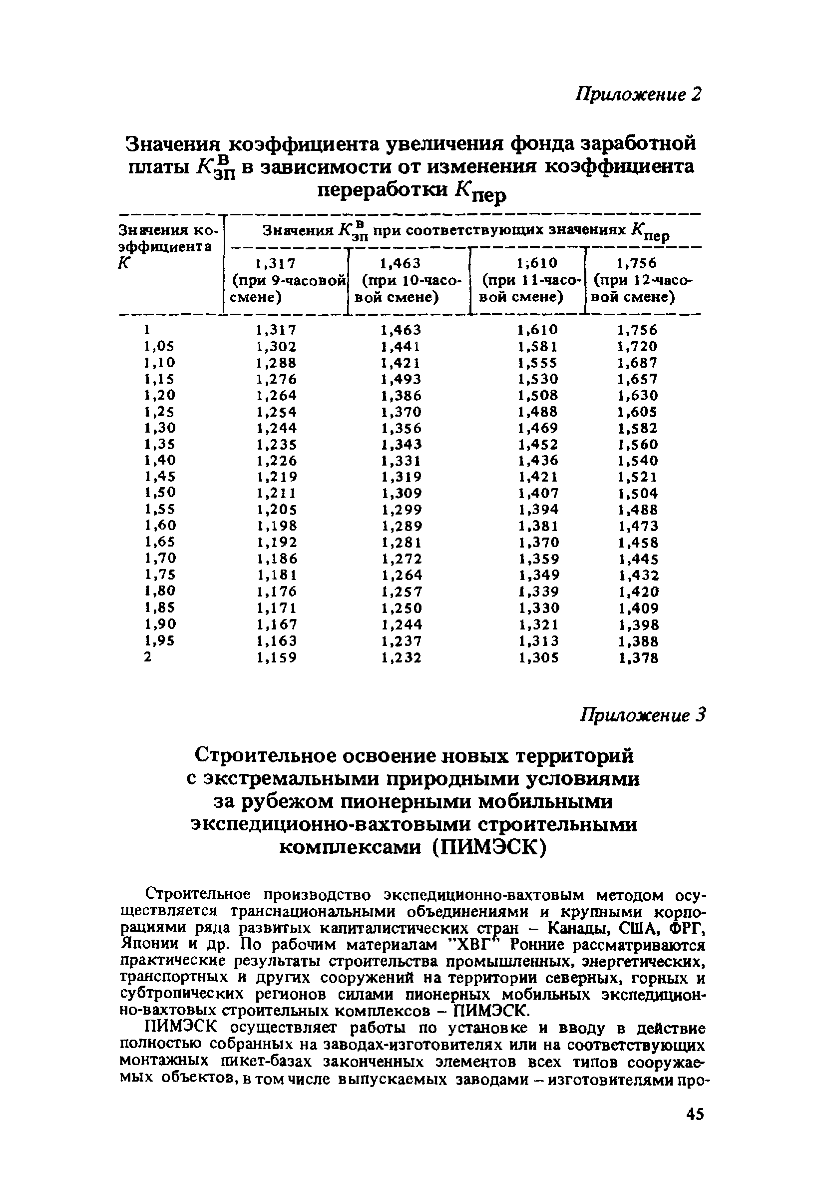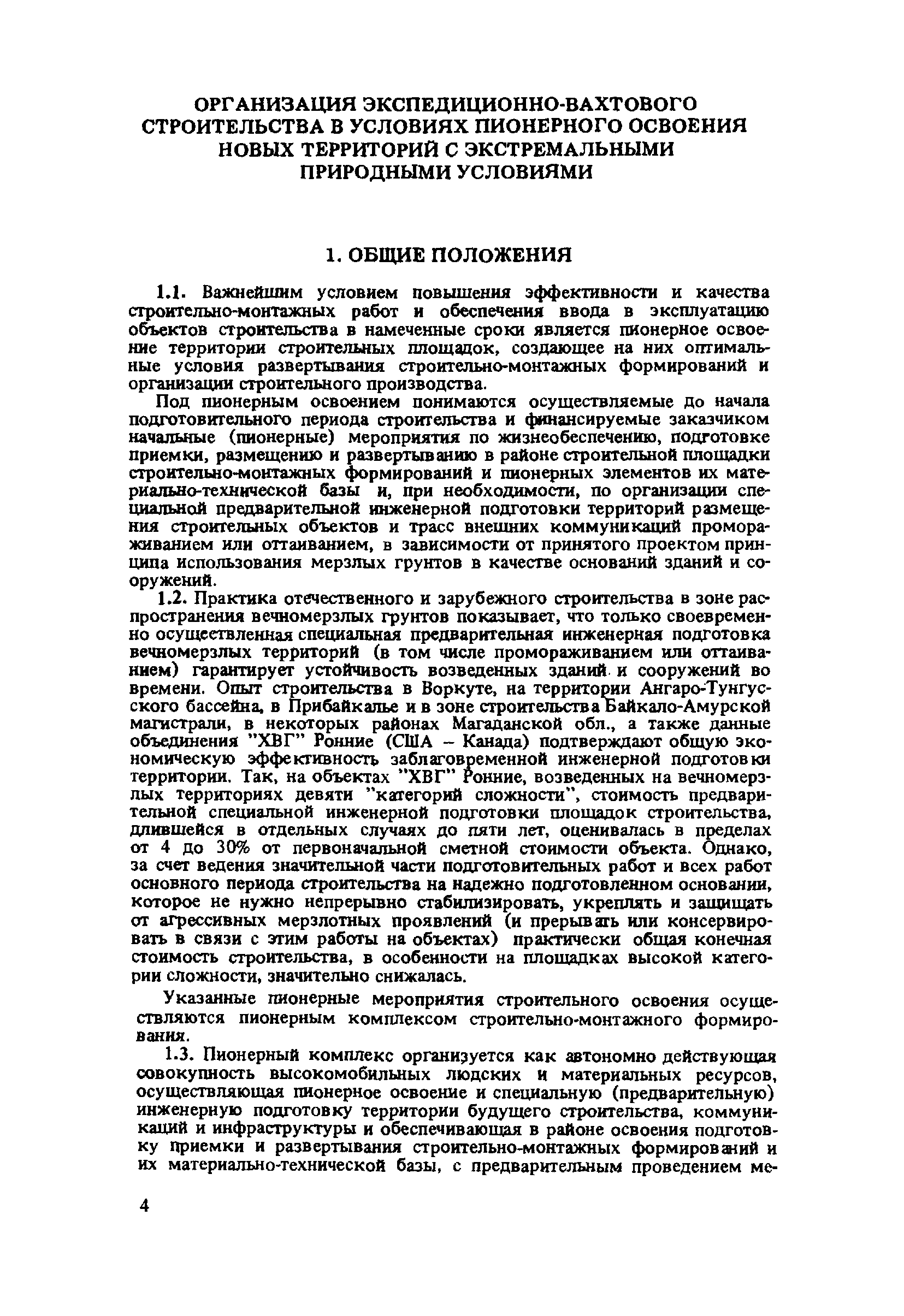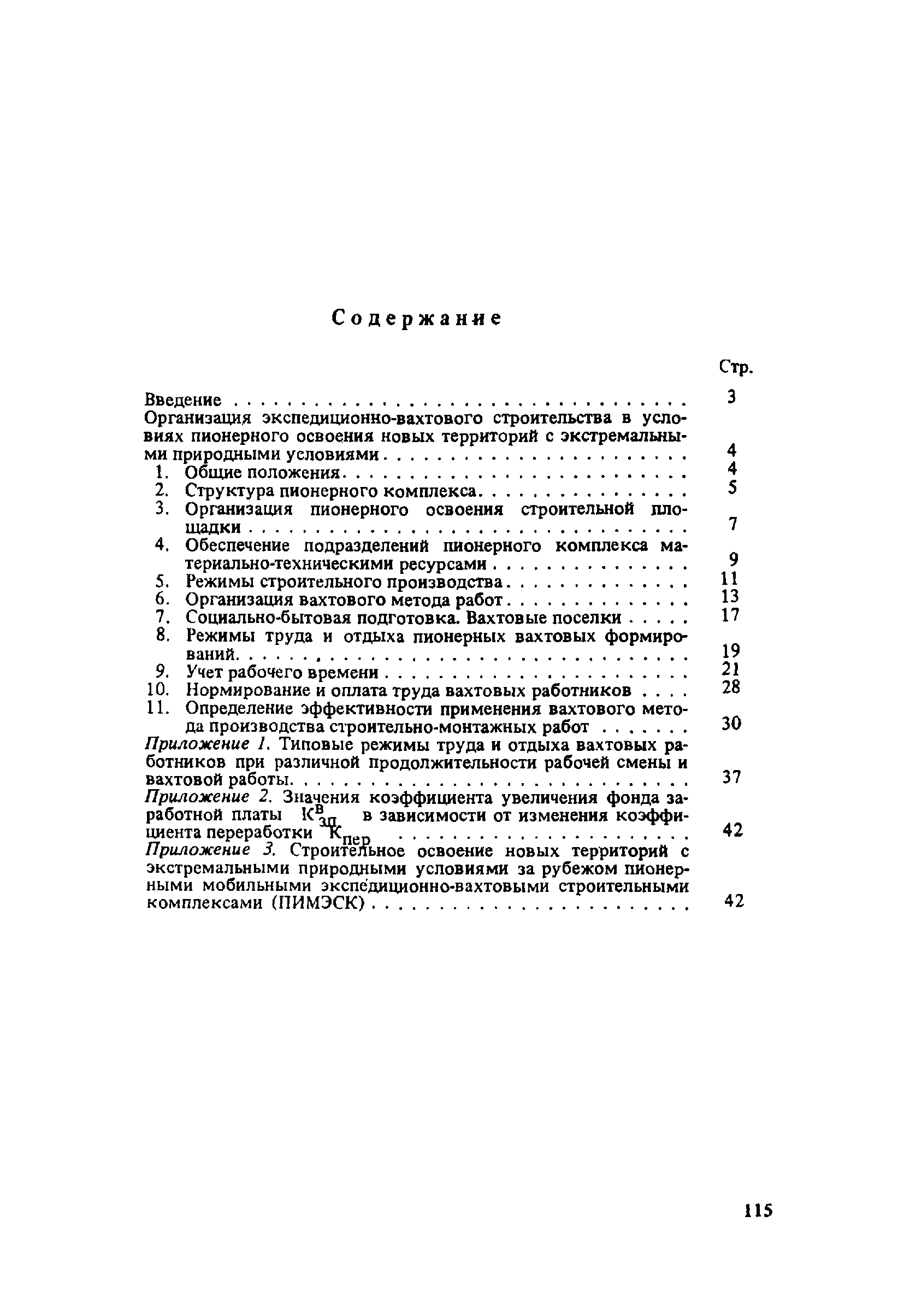 | Оглавление: | Введение 1. Общие положения 2. Структура пионерного комплекса 3. Организация пионерного освоения строительной площадки 4. Обеспечение подразделений пионерного комплекса материально-техническими ресурсами 5. Режимы строительного производства 6. Организация вахтового метода работ 7. Социально-бытовая подготовка. Вахтовые поселки 8. Режимы труда и отдыха пионерных вахтовых формирований 9. Учет рабочего времени 10. Нормирование и оплата труда вахтовых работников 11. Определение эффективности применения вахтового метода производства строительно-монтажных работ Приложение 1. Типовые режимы труда и отдыха вахтовых работников при различной продолжительности рабочей смены и вахтовой работы Приложение 2. Значения коэффициента увеличения фонда заработной платы К В ЗП в зависимости от изменения коэффициента переработки К пер Приложение 3. Строительное освоение новых территорий с экстремальными природными условиями за рубежом пионерными мобильными экспедиционно-вахтовыми строительными комплексами (ПММЭСК) |