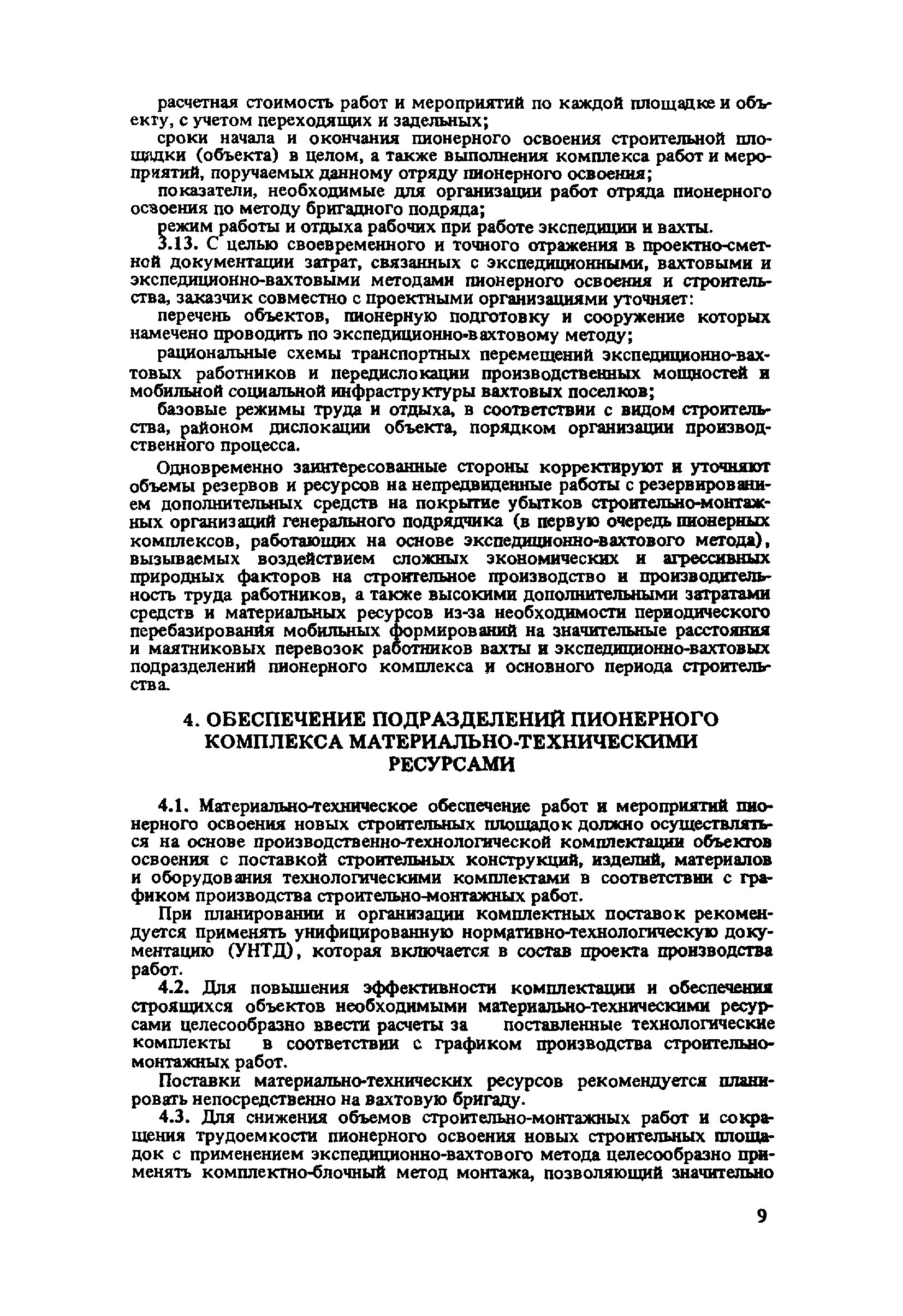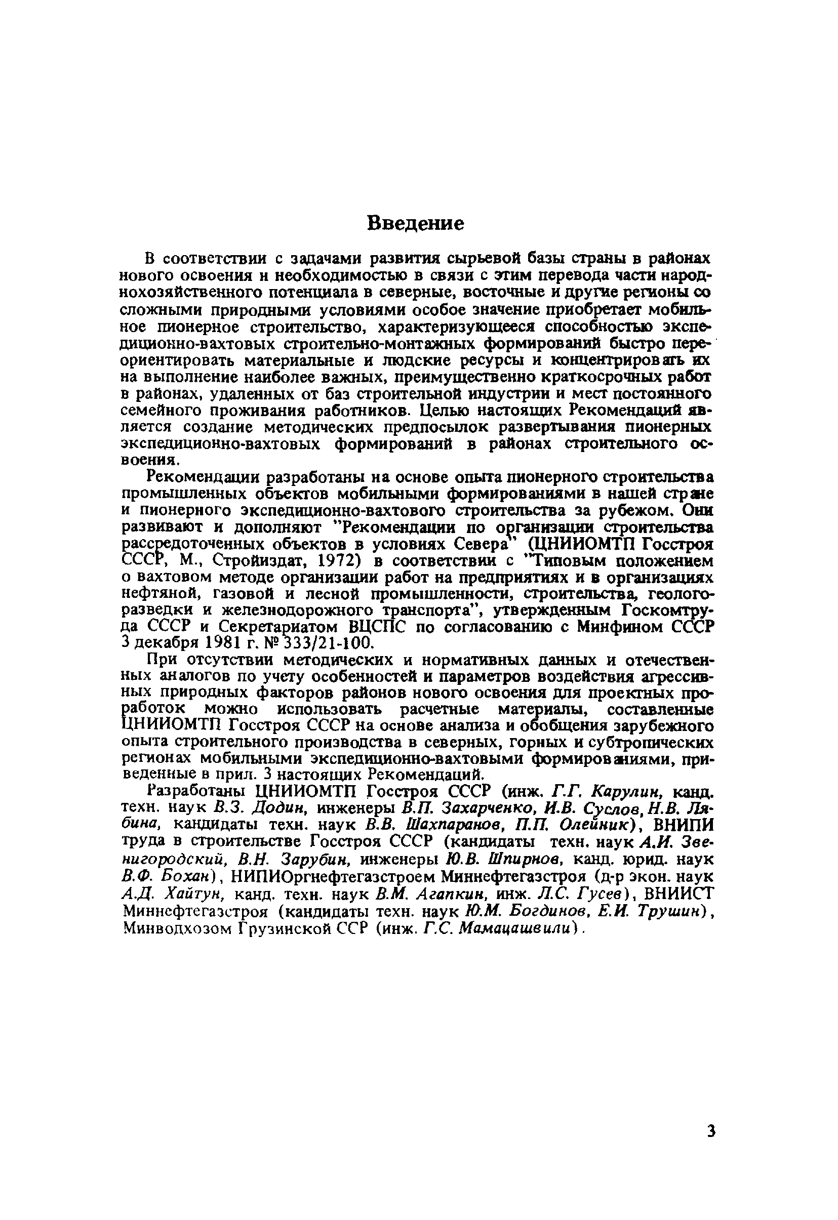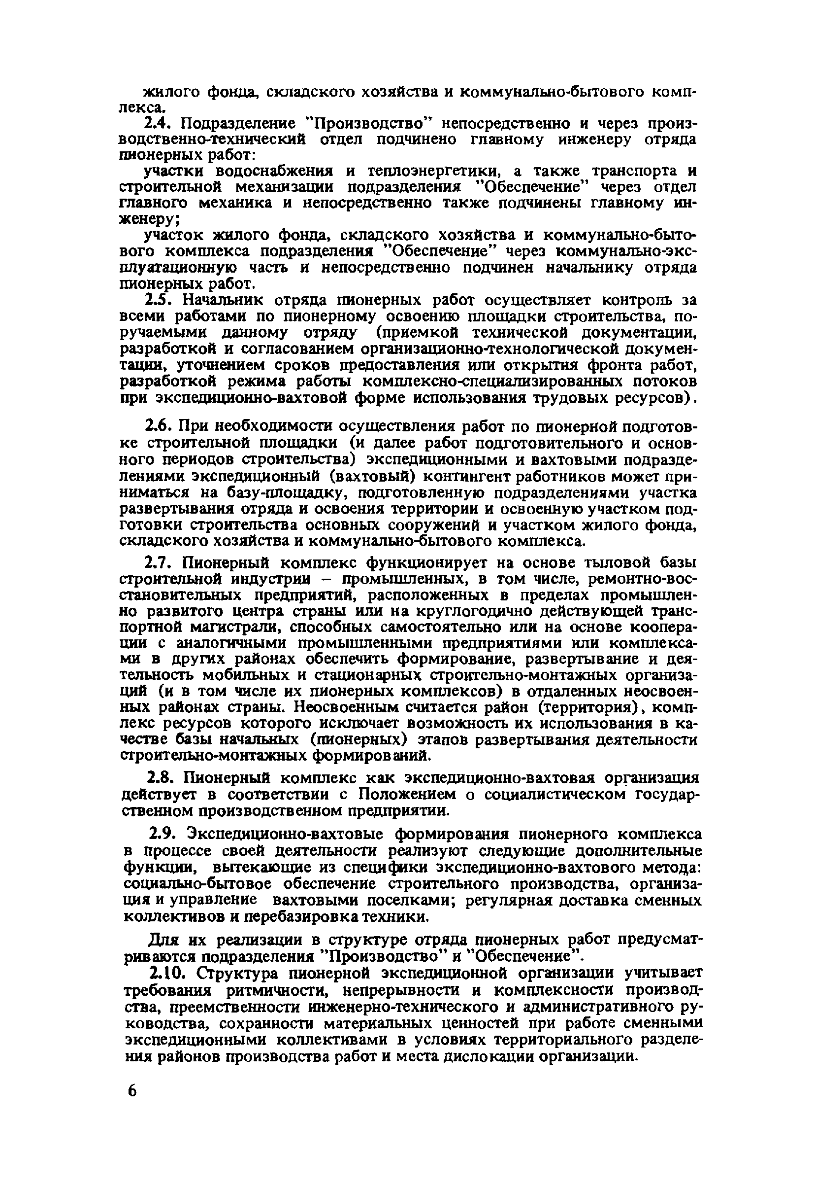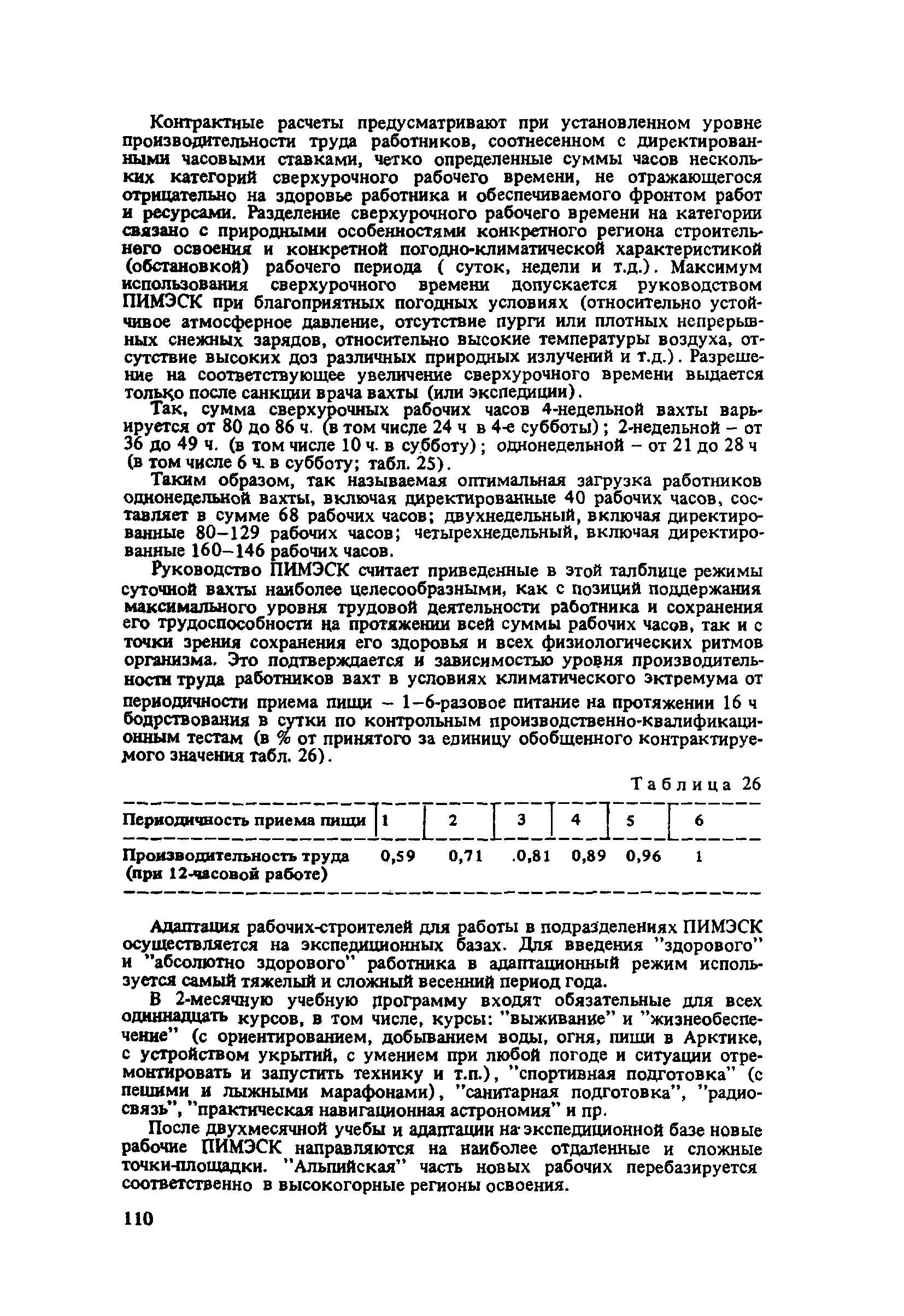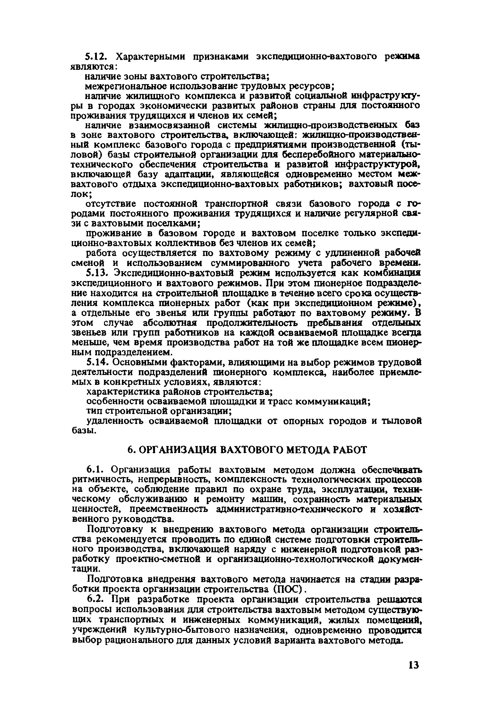 | Оглавление: | Введение 1. Общие положения 2. Структура пионерного комплекса 3. Организация пионерного освоения строительной площадки 4. Обеспечение подразделений пионерного комплекса материально-техническими ресурсами 5. Режимы строительного производства 6. Организация вахтового метода работ 7. Социально-бытовая подготовка. Вахтовые поселки 8. Режимы труда и отдыха пионерных вахтовых формирований 9. Учет рабочего времени 10. Нормирование и оплата труда вахтовых работников 11. Определение эффективности применения вахтового метода производства строительно-монтажных работ Приложение 1. Типовые режимы труда и отдыха вахтовых работников при различной продолжительности рабочей смены и вахтовой работы Приложение 2. Значения коэффициента увеличения фонда заработной платы К В ЗП в зависимости от изменения коэффициента переработки К пер Приложение 3. Строительное освоение новых территорий с экстремальными природными условиями за рубежом пионерными мобильными экспедиционно-вахтовыми строительными комплексами (ПММЭСК) |