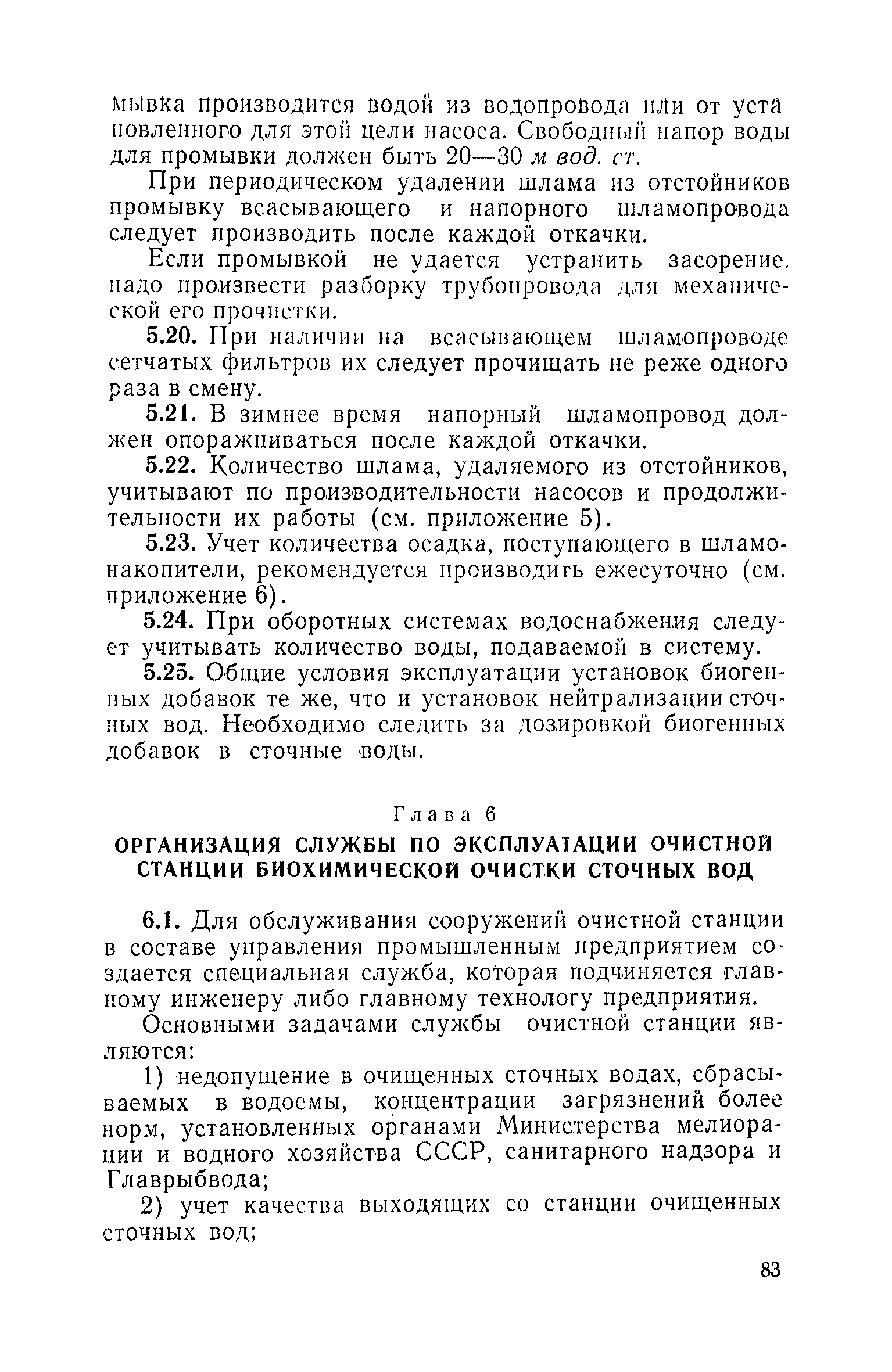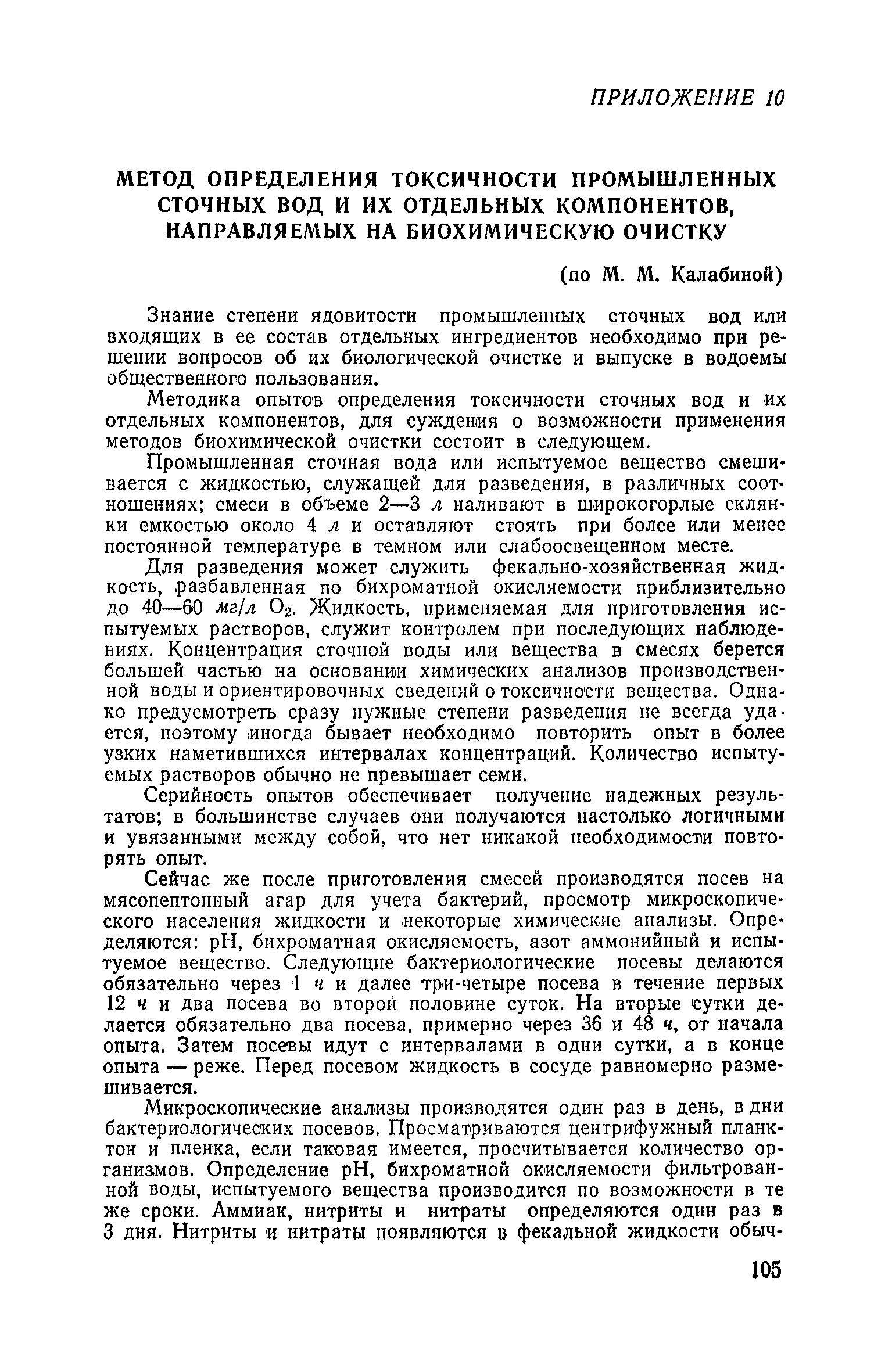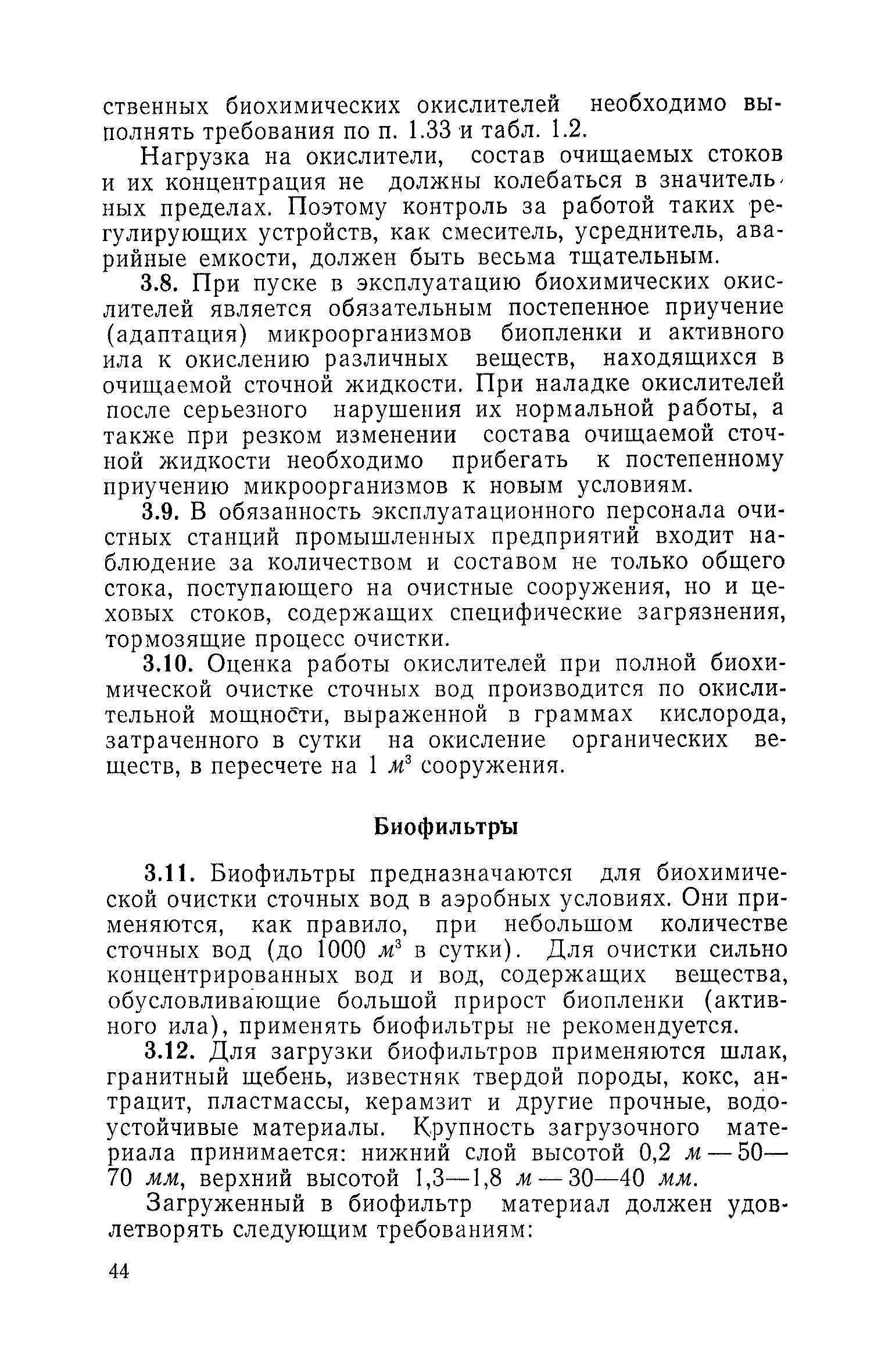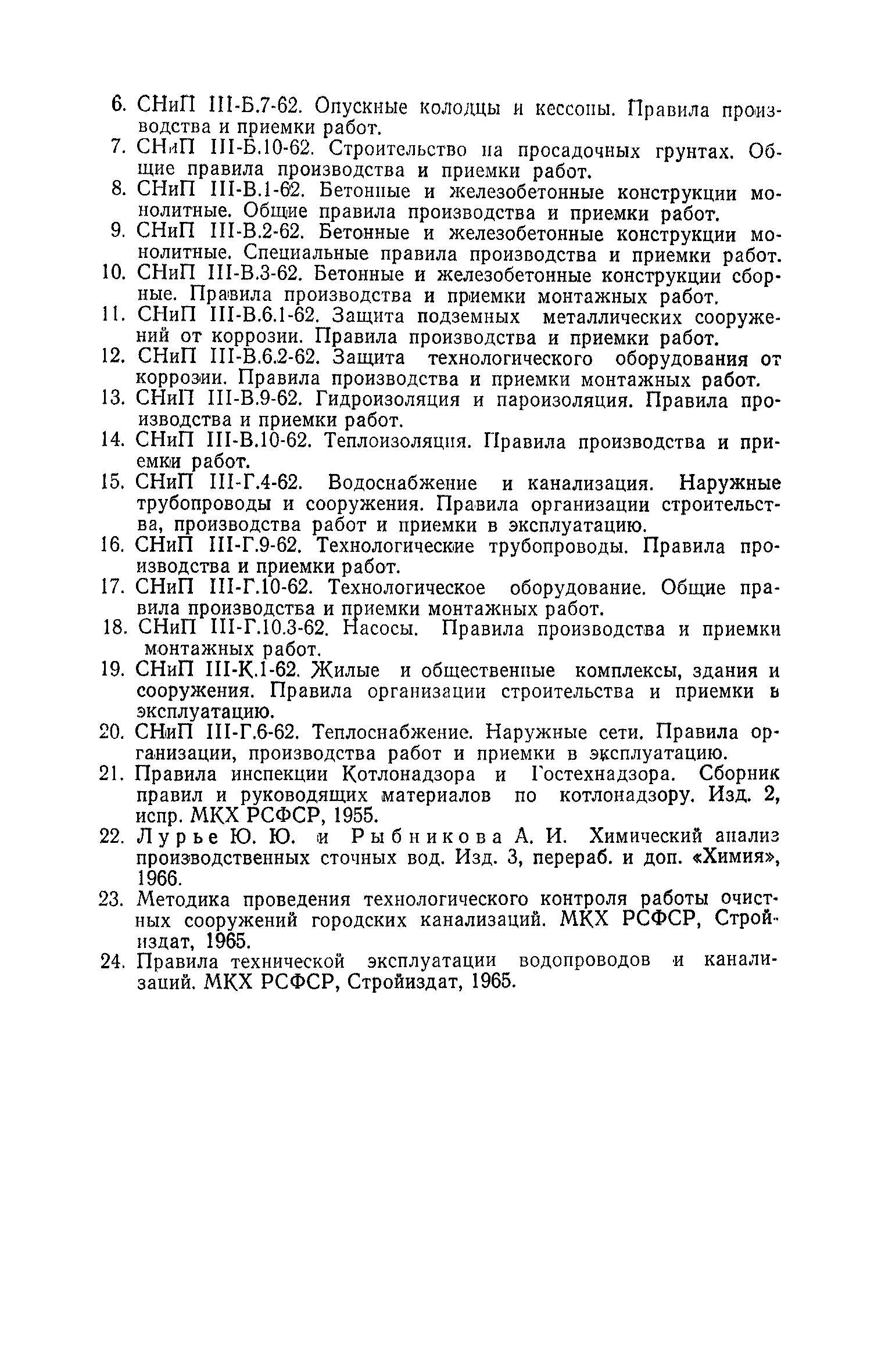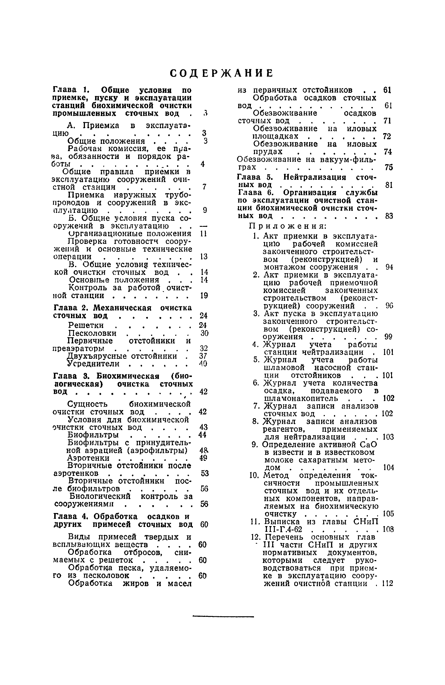 | Оглавление: | Глава 1. Общие условия по приемке, пуску и эксплуатации станций биохимической очистки промышленных сточных вод А. Приемка в эксплуатацию Общие положения Рабочая комиссия, ее права, обязанности и порядок работы Общие правила приемки в эксплуатацию сооружений очистной станции Приемка наружных трубопроводов и сооружений в эксплуатацию Б. Общие условия пуска сооружений в эксплуатацию Организационные положения Проверка готовности сооружений и основные технические операции В. Общие условие технической очистки сточных вод Основные положения Контроль за работой очистной станции Глава 2. Механическая очистка сточных вод Решетки Песколовки Первичные отстойники и преаэраторы Двухъярусные отстойники Усреднители Глава 3. Биохимическая (биологическая) очистка сточных вод . Сущность биохимической очистки сточных вод Условия для биохимической очистки сточных вод Биофильтры Биофильтры с принудительной аэрацией (аэрофильтры) Аэротенки Вторичные отстойники после аэротенков Вторичные отстойники после биофильтров Биологический контроль за сооружениями Глава 4. Обработка осадков и других примесей сточных вод Виды примесей твердых и всплывающих веществ Обработка отбросов, снимаемых с решеток Обработка песка, удаляемого из песколовок Обработка жиров и масел из первичных отстойников Обработка осадков сточных вод Обезвоживание осадков сточных вод Обезвоживание на иловых площадках Обезвоживание на иловых прудах Обезвоживание на вакуум-фильтрах Глава 5. Нейтрализация сточных вод Глава 6. Организация службы по эксплуатации очистной станции биохимической очистки сточных вод Приложение 1. Акт приемки в эксплуатацию рабочей комиссией законченного строительством (реконструкцией) и монтажом сооружения Приложение 2. Акт приемки в эксплуатацию рабочей приемочной комиссией законченных строительством (реконструкцией) сооружений Приложение 3. Акт пуска в эксплуатацию законченного строительством (реконструкцией) сооружения Приложение 4. Журнал учета работы станции нейтрализации Приложение 5. Журнал учета работы шламовой насосной станции отстойников Приложение 6. Журнал учета количества осадка, подаваемого в шламонакопитель Приложение 7. Журнал записи анализов сточных вод Приложение 8. Журнал записи анализов реагентов, применяемых для нейтрализации Приложение 9. Определение активной СаО в извести и в известковом молоке сахаратным методом Приложение 10. Метод определения токсичности промышленных сточных вод и их отдельных компонентов, направляемых на биохимическую очистку Приложение 11. Выписка из главы СНиП III-Г.4-62 Приложение 12. Перечень основных глав III части СНиП и других нормативных документов, которыми следует руководствоваться при приемке в эксплуатацию сооружений очистной станции |