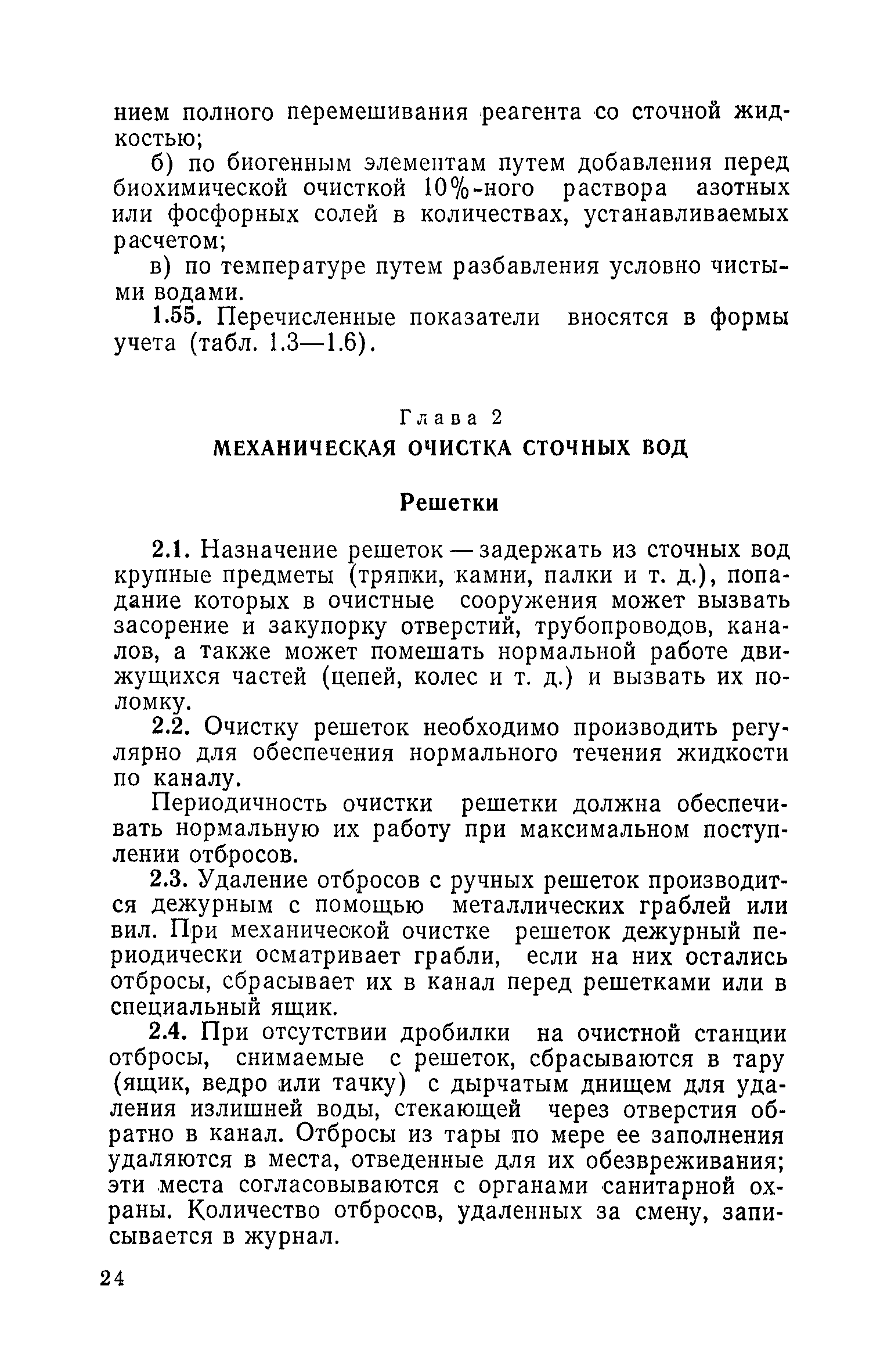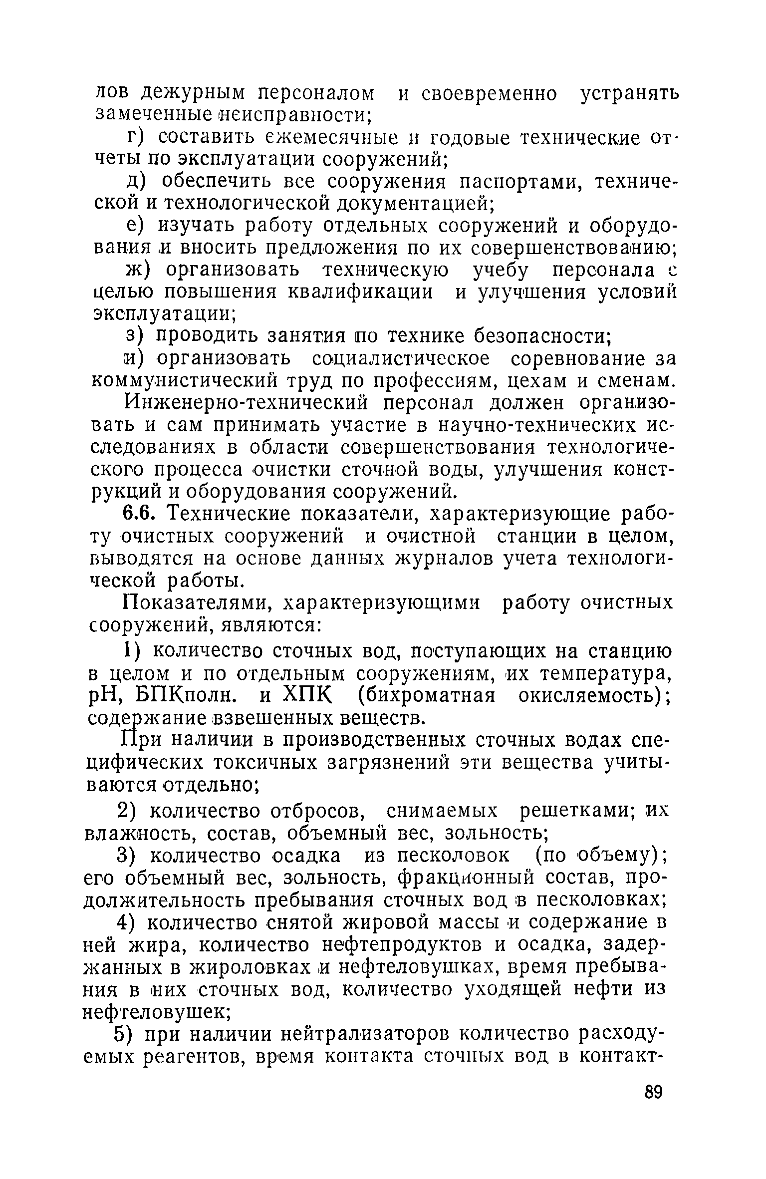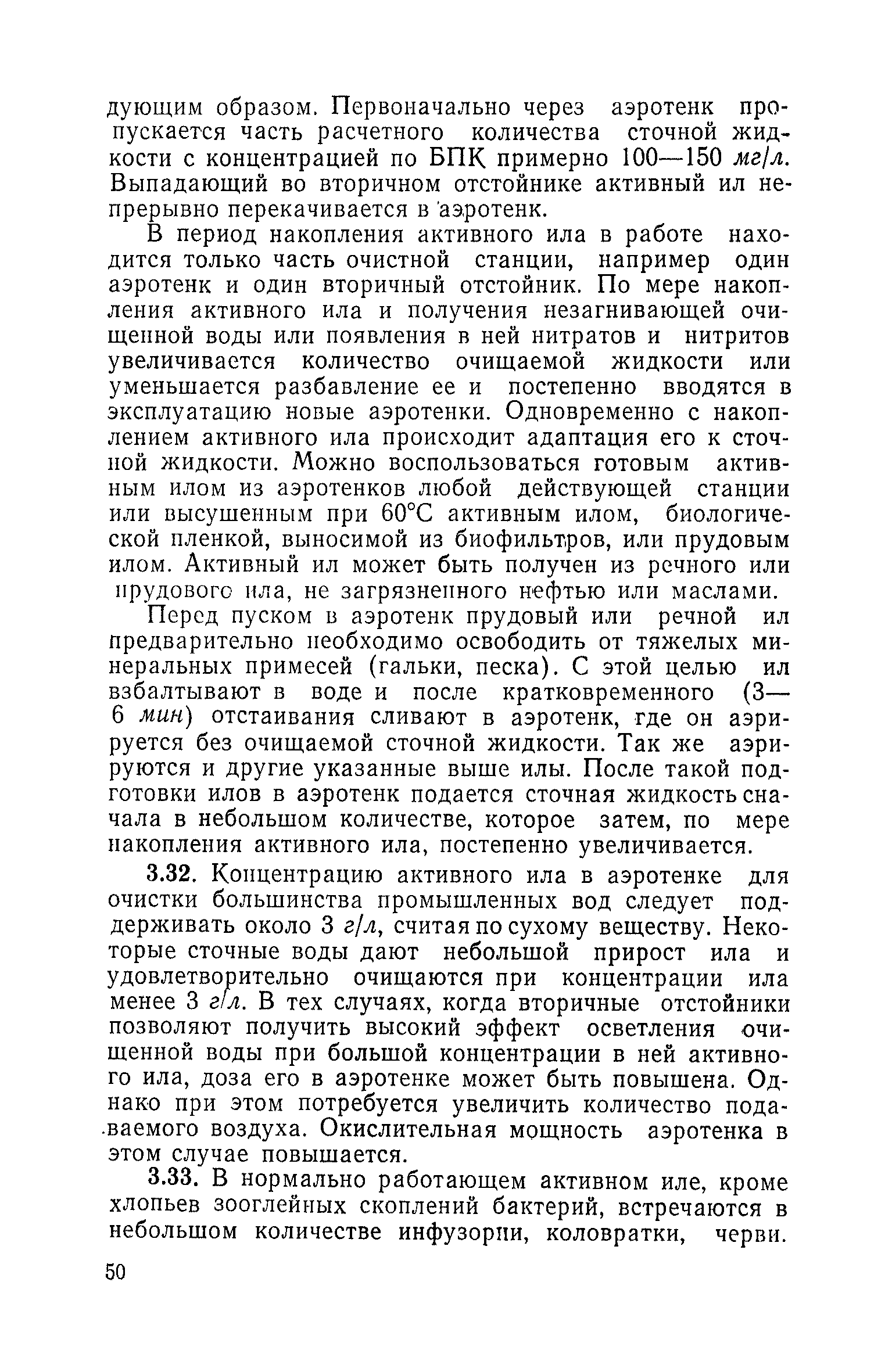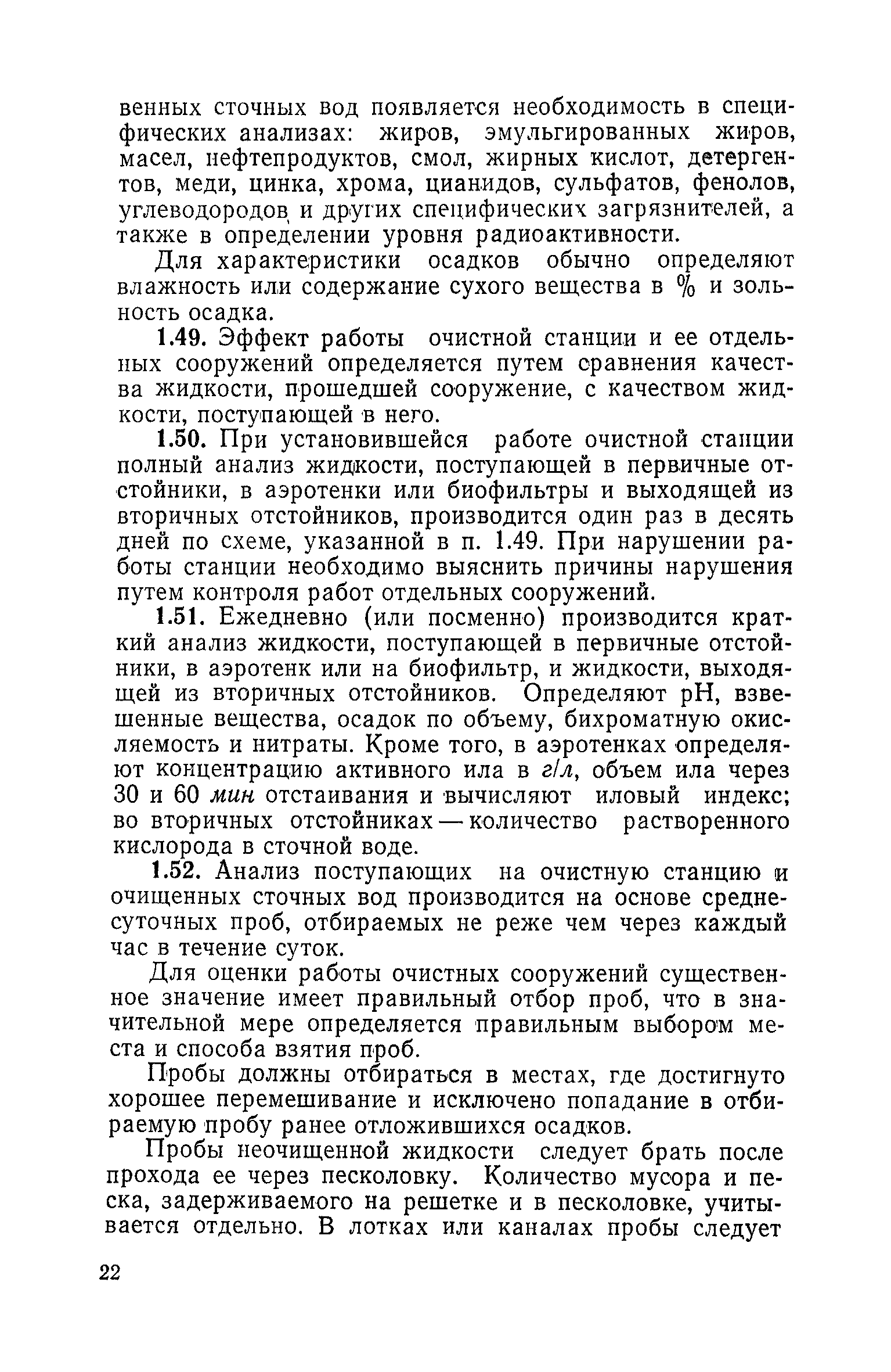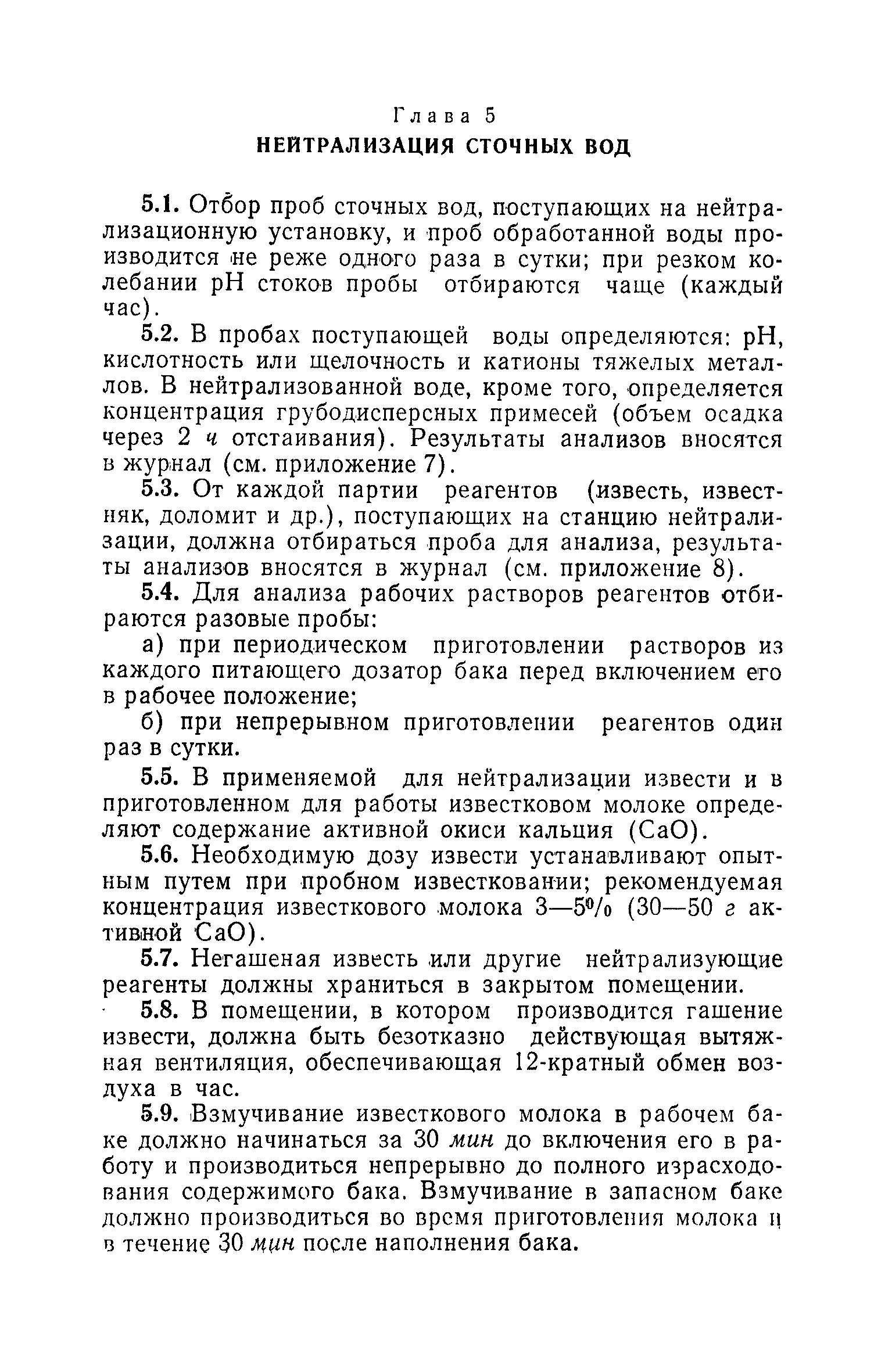 | Оглавление: | Глава 1. Общие условия по приемке, пуску и эксплуатации станций биохимической очистки промышленных сточных вод А. Приемка в эксплуатацию Общие положения Рабочая комиссия, ее права, обязанности и порядок работы Общие правила приемки в эксплуатацию сооружений очистной станции Приемка наружных трубопроводов и сооружений в эксплуатацию Б. Общие условия пуска сооружений в эксплуатацию Организационные положения Проверка готовности сооружений и основные технические операции В. Общие условие технической очистки сточных вод Основные положения Контроль за работой очистной станции Глава 2. Механическая очистка сточных вод Решетки Песколовки Первичные отстойники и преаэраторы Двухъярусные отстойники Усреднители Глава 3. Биохимическая (биологическая) очистка сточных вод . Сущность биохимической очистки сточных вод Условия для биохимической очистки сточных вод Биофильтры Биофильтры с принудительной аэрацией (аэрофильтры) Аэротенки Вторичные отстойники после аэротенков Вторичные отстойники после биофильтров Биологический контроль за сооружениями Глава 4. Обработка осадков и других примесей сточных вод Виды примесей твердых и всплывающих веществ Обработка отбросов, снимаемых с решеток Обработка песка, удаляемого из песколовок Обработка жиров и масел из первичных отстойников Обработка осадков сточных вод Обезвоживание осадков сточных вод Обезвоживание на иловых площадках Обезвоживание на иловых прудах Обезвоживание на вакуум-фильтрах Глава 5. Нейтрализация сточных вод Глава 6. Организация службы по эксплуатации очистной станции биохимической очистки сточных вод Приложение 1. Акт приемки в эксплуатацию рабочей комиссией законченного строительством (реконструкцией) и монтажом сооружения Приложение 2. Акт приемки в эксплуатацию рабочей приемочной комиссией законченных строительством (реконструкцией) сооружений Приложение 3. Акт пуска в эксплуатацию законченного строительством (реконструкцией) сооружения Приложение 4. Журнал учета работы станции нейтрализации Приложение 5. Журнал учета работы шламовой насосной станции отстойников Приложение 6. Журнал учета количества осадка, подаваемого в шламонакопитель Приложение 7. Журнал записи анализов сточных вод Приложение 8. Журнал записи анализов реагентов, применяемых для нейтрализации Приложение 9. Определение активной СаО в извести и в известковом молоке сахаратным методом Приложение 10. Метод определения токсичности промышленных сточных вод и их отдельных компонентов, направляемых на биохимическую очистку Приложение 11. Выписка из главы СНиП III-Г.4-62 Приложение 12. Перечень основных глав III части СНиП и других нормативных документов, которыми следует руководствоваться при приемке в эксплуатацию сооружений очистной станции |