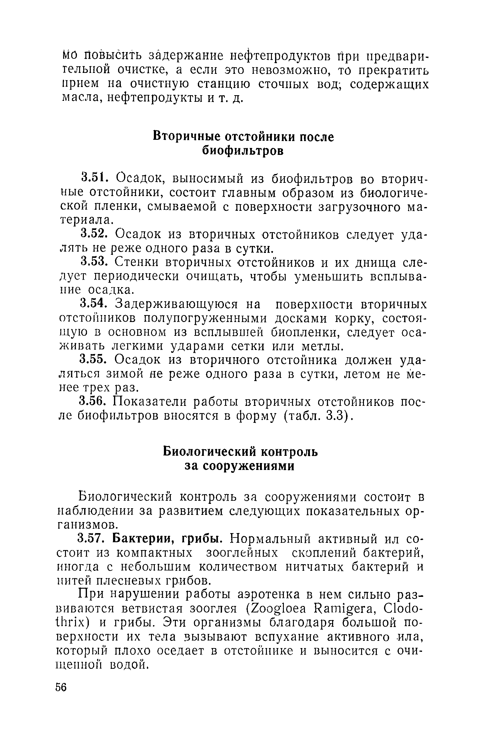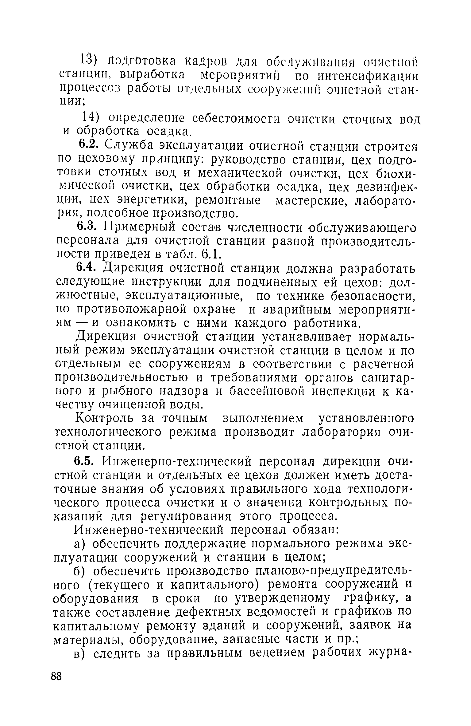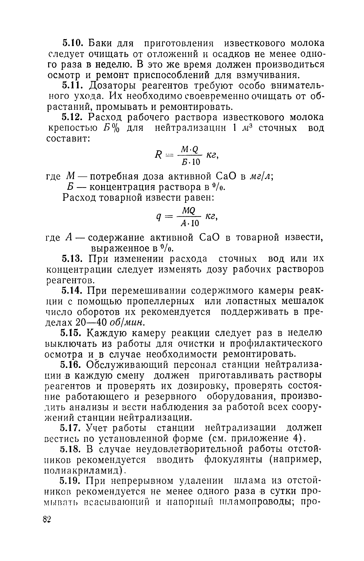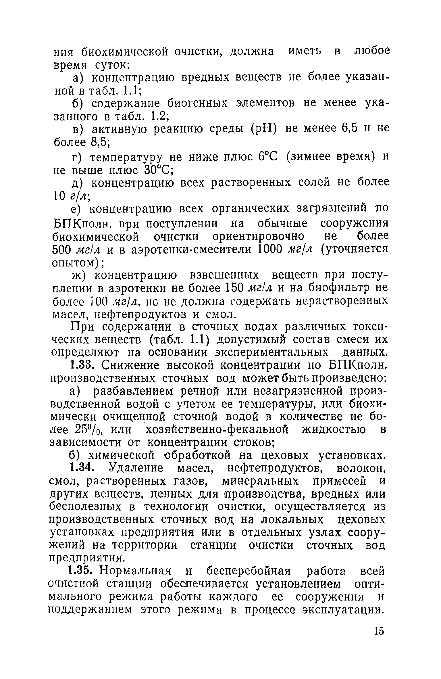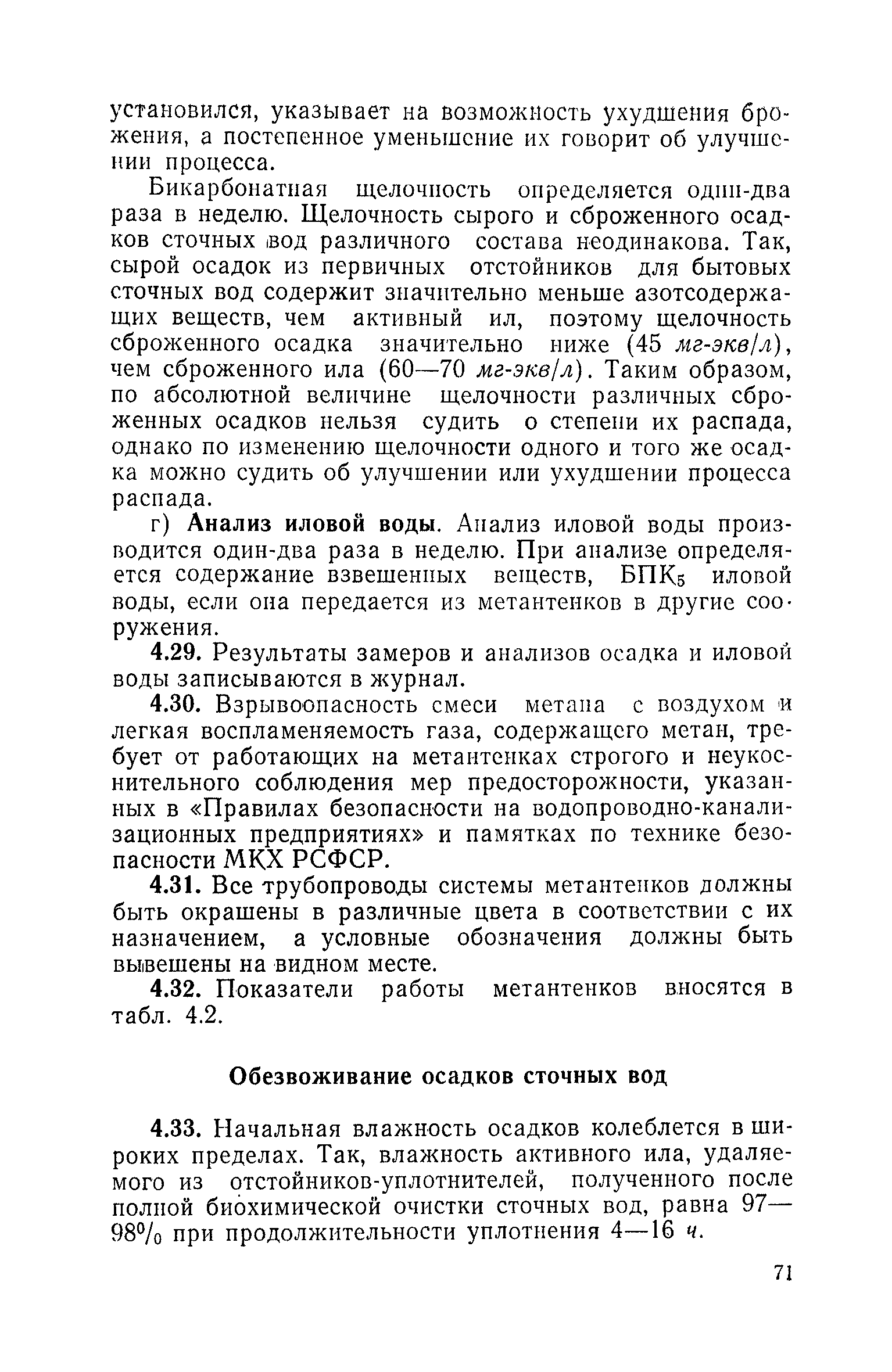 | Оглавление: | Глава 1. Общие условия по приемке, пуску и эксплуатации станций биохимической очистки промышленных сточных вод А. Приемка в эксплуатацию Общие положения Рабочая комиссия, ее права, обязанности и порядок работы Общие правила приемки в эксплуатацию сооружений очистной станции Приемка наружных трубопроводов и сооружений в эксплуатацию Б. Общие условия пуска сооружений в эксплуатацию Организационные положения Проверка готовности сооружений и основные технические операции В. Общие условие технической очистки сточных вод Основные положения Контроль за работой очистной станции Глава 2. Механическая очистка сточных вод Решетки Песколовки Первичные отстойники и преаэраторы Двухъярусные отстойники Усреднители Глава 3. Биохимическая (биологическая) очистка сточных вод . Сущность биохимической очистки сточных вод Условия для биохимической очистки сточных вод Биофильтры Биофильтры с принудительной аэрацией (аэрофильтры) Аэротенки Вторичные отстойники после аэротенков Вторичные отстойники после биофильтров Биологический контроль за сооружениями Глава 4. Обработка осадков и других примесей сточных вод Виды примесей твердых и всплывающих веществ Обработка отбросов, снимаемых с решеток Обработка песка, удаляемого из песколовок Обработка жиров и масел из первичных отстойников Обработка осадков сточных вод Обезвоживание осадков сточных вод Обезвоживание на иловых площадках Обезвоживание на иловых прудах Обезвоживание на вакуум-фильтрах Глава 5. Нейтрализация сточных вод Глава 6. Организация службы по эксплуатации очистной станции биохимической очистки сточных вод Приложение 1. Акт приемки в эксплуатацию рабочей комиссией законченного строительством (реконструкцией) и монтажом сооружения Приложение 2. Акт приемки в эксплуатацию рабочей приемочной комиссией законченных строительством (реконструкцией) сооружений Приложение 3. Акт пуска в эксплуатацию законченного строительством (реконструкцией) сооружения Приложение 4. Журнал учета работы станции нейтрализации Приложение 5. Журнал учета работы шламовой насосной станции отстойников Приложение 6. Журнал учета количества осадка, подаваемого в шламонакопитель Приложение 7. Журнал записи анализов сточных вод Приложение 8. Журнал записи анализов реагентов, применяемых для нейтрализации Приложение 9. Определение активной СаО в извести и в известковом молоке сахаратным методом Приложение 10. Метод определения токсичности промышленных сточных вод и их отдельных компонентов, направляемых на биохимическую очистку Приложение 11. Выписка из главы СНиП III-Г.4-62 Приложение 12. Перечень основных глав III части СНиП и других нормативных документов, которыми следует руководствоваться при приемке в эксплуатацию сооружений очистной станции |