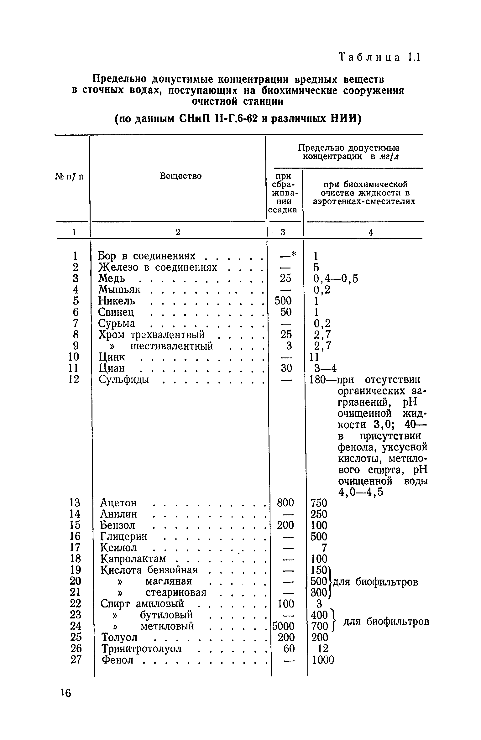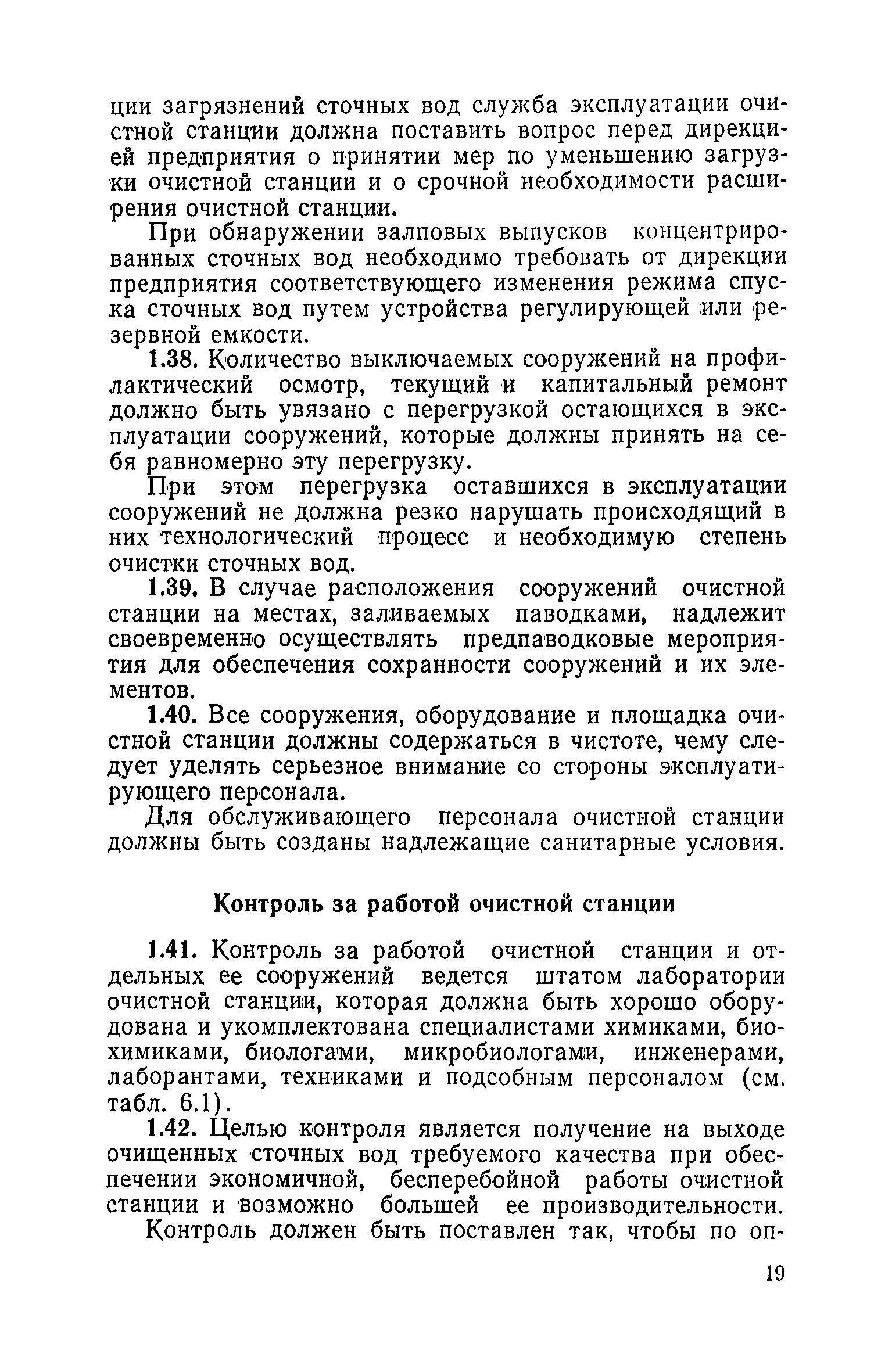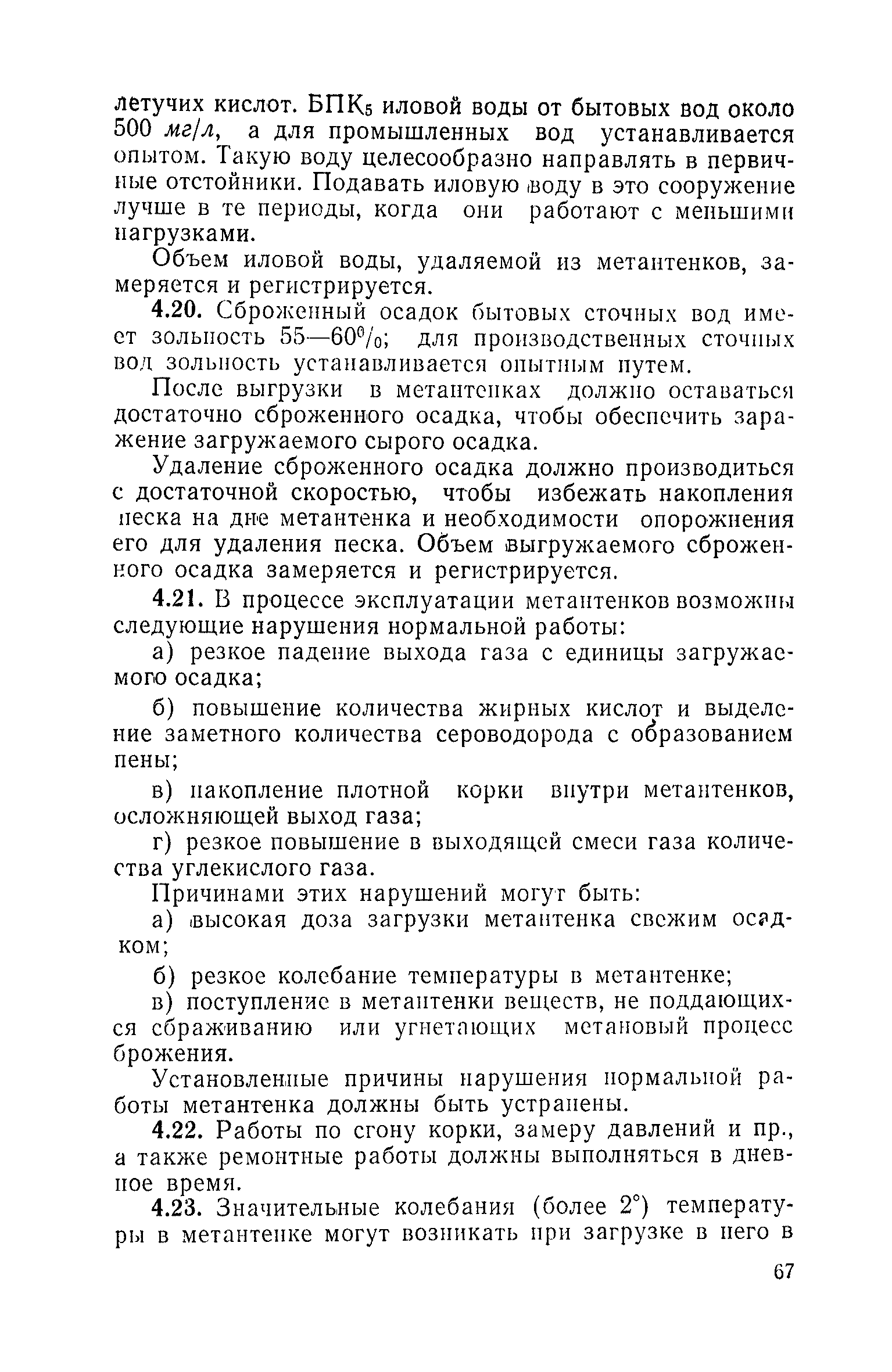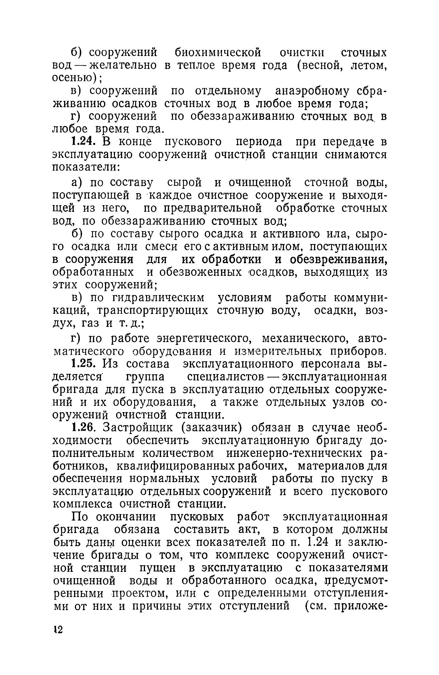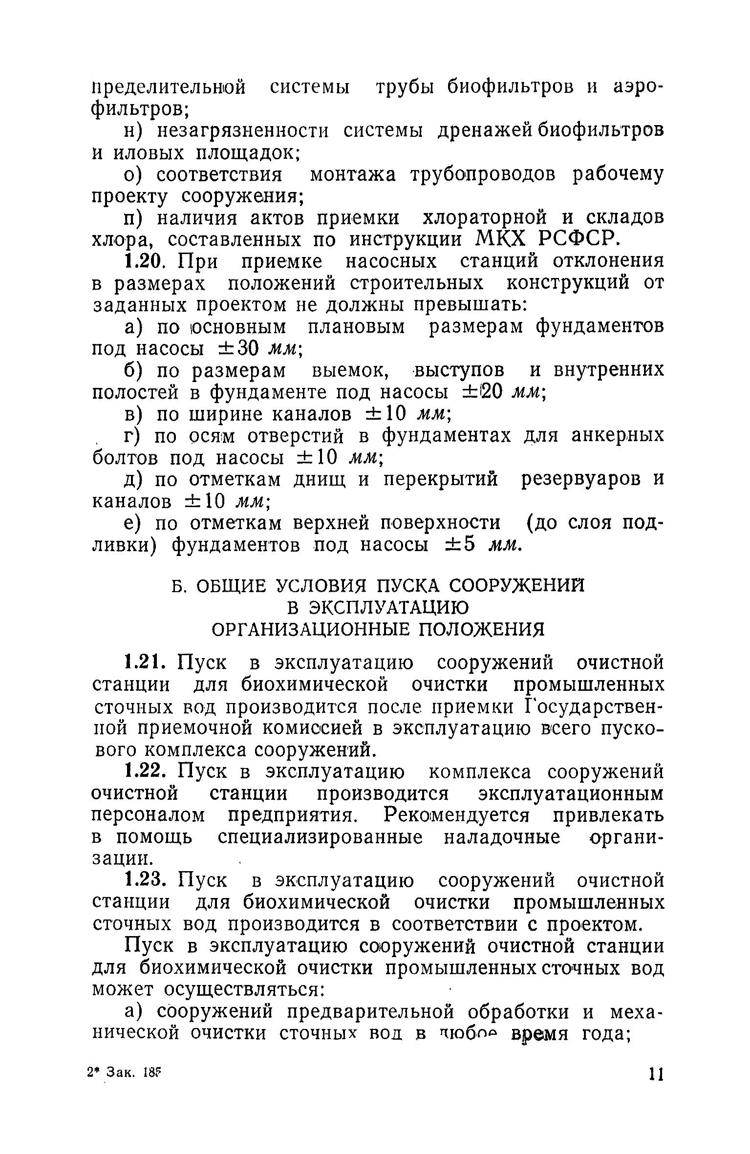 | Оглавление: | Глава 1. Общие условия по приемке, пуску и эксплуатации станций биохимической очистки промышленных сточных вод А. Приемка в эксплуатацию Общие положения Рабочая комиссия, ее права, обязанности и порядок работы Общие правила приемки в эксплуатацию сооружений очистной станции Приемка наружных трубопроводов и сооружений в эксплуатацию Б. Общие условия пуска сооружений в эксплуатацию Организационные положения Проверка готовности сооружений и основные технические операции В. Общие условие технической очистки сточных вод Основные положения Контроль за работой очистной станции Глава 2. Механическая очистка сточных вод Решетки Песколовки Первичные отстойники и преаэраторы Двухъярусные отстойники Усреднители Глава 3. Биохимическая (биологическая) очистка сточных вод . Сущность биохимической очистки сточных вод Условия для биохимической очистки сточных вод Биофильтры Биофильтры с принудительной аэрацией (аэрофильтры) Аэротенки Вторичные отстойники после аэротенков Вторичные отстойники после биофильтров Биологический контроль за сооружениями Глава 4. Обработка осадков и других примесей сточных вод Виды примесей твердых и всплывающих веществ Обработка отбросов, снимаемых с решеток Обработка песка, удаляемого из песколовок Обработка жиров и масел из первичных отстойников Обработка осадков сточных вод Обезвоживание осадков сточных вод Обезвоживание на иловых площадках Обезвоживание на иловых прудах Обезвоживание на вакуум-фильтрах Глава 5. Нейтрализация сточных вод Глава 6. Организация службы по эксплуатации очистной станции биохимической очистки сточных вод Приложение 1. Акт приемки в эксплуатацию рабочей комиссией законченного строительством (реконструкцией) и монтажом сооружения Приложение 2. Акт приемки в эксплуатацию рабочей приемочной комиссией законченных строительством (реконструкцией) сооружений Приложение 3. Акт пуска в эксплуатацию законченного строительством (реконструкцией) сооружения Приложение 4. Журнал учета работы станции нейтрализации Приложение 5. Журнал учета работы шламовой насосной станции отстойников Приложение 6. Журнал учета количества осадка, подаваемого в шламонакопитель Приложение 7. Журнал записи анализов сточных вод Приложение 8. Журнал записи анализов реагентов, применяемых для нейтрализации Приложение 9. Определение активной СаО в извести и в известковом молоке сахаратным методом Приложение 10. Метод определения токсичности промышленных сточных вод и их отдельных компонентов, направляемых на биохимическую очистку Приложение 11. Выписка из главы СНиП III-Г.4-62 Приложение 12. Перечень основных глав III части СНиП и других нормативных документов, которыми следует руководствоваться при приемке в эксплуатацию сооружений очистной станции |