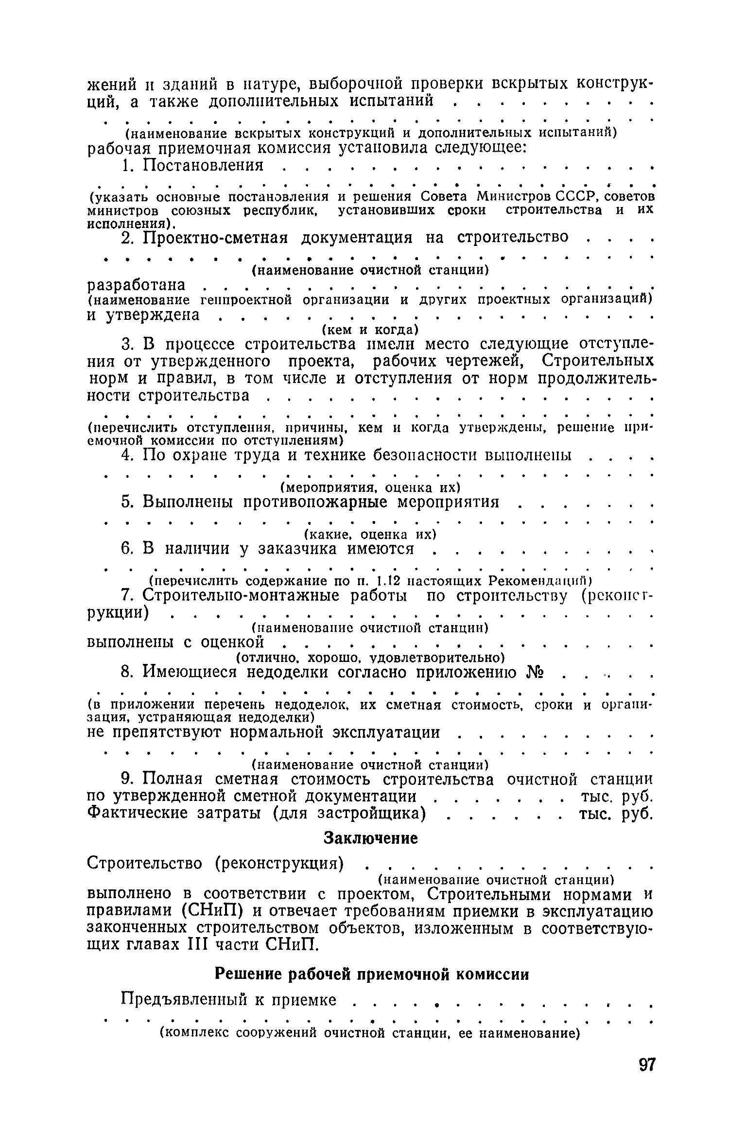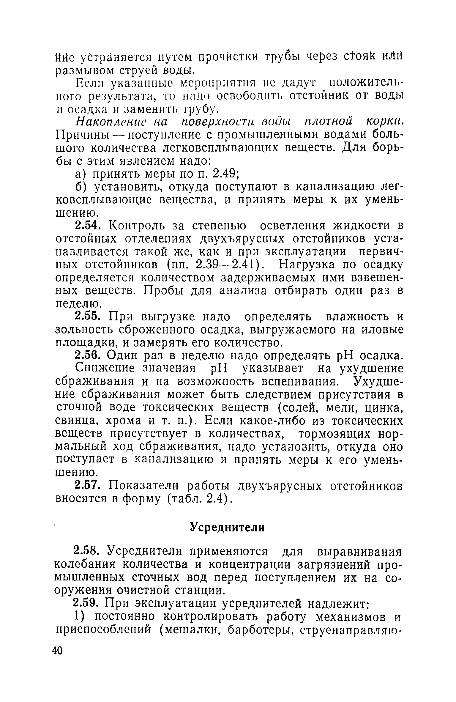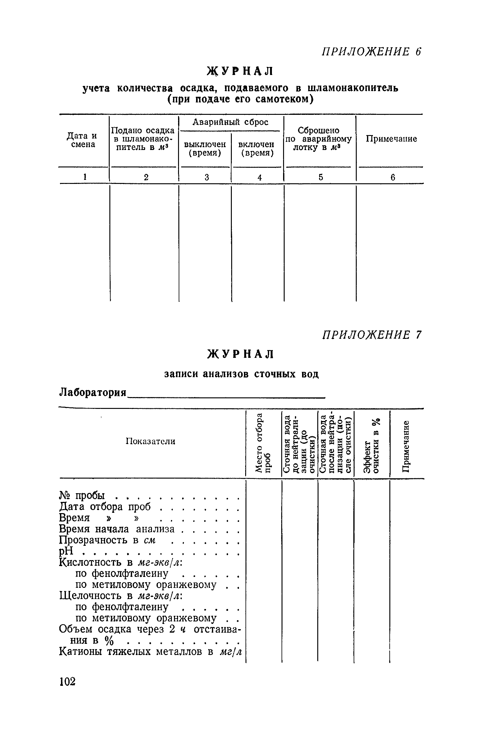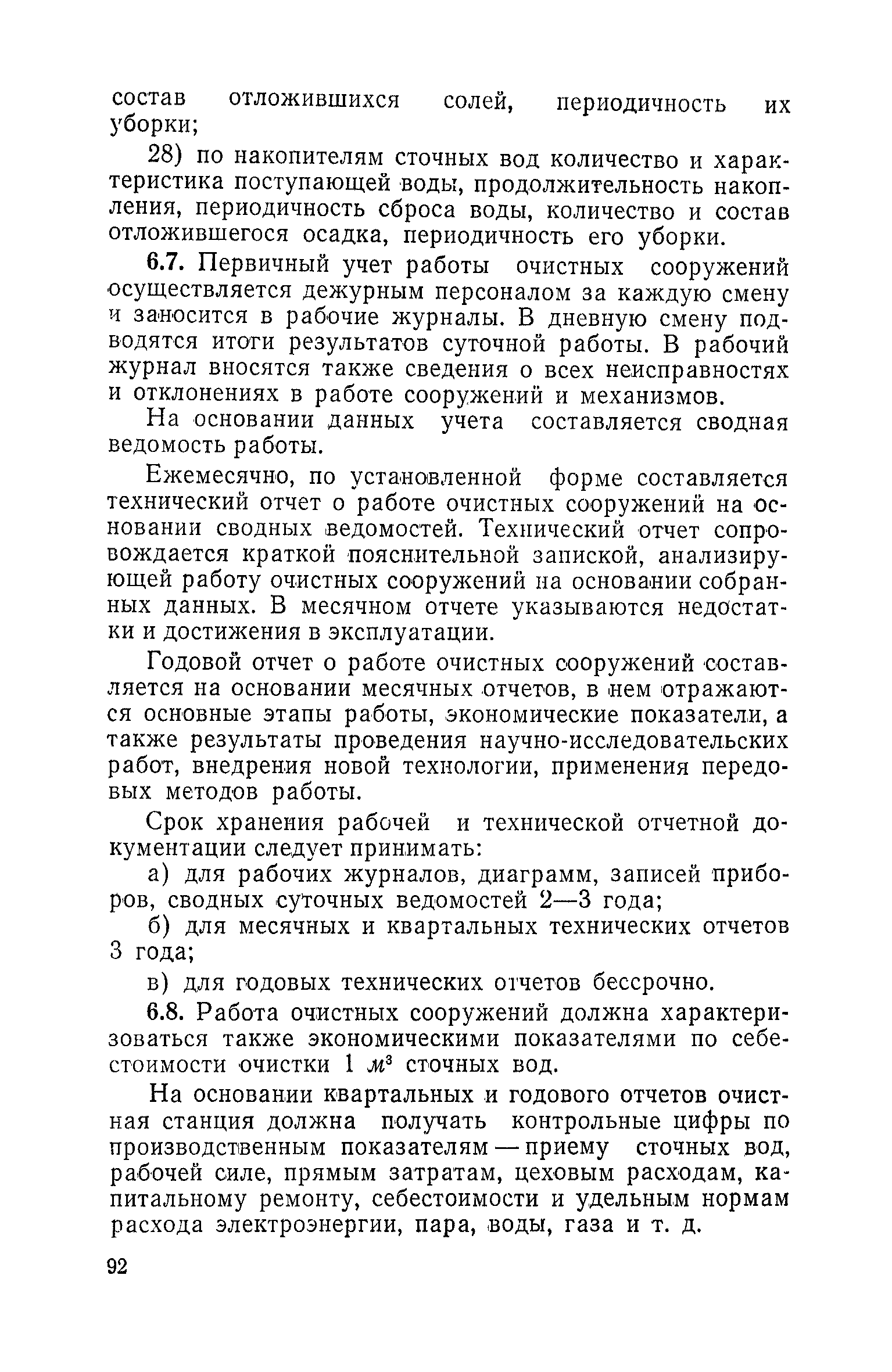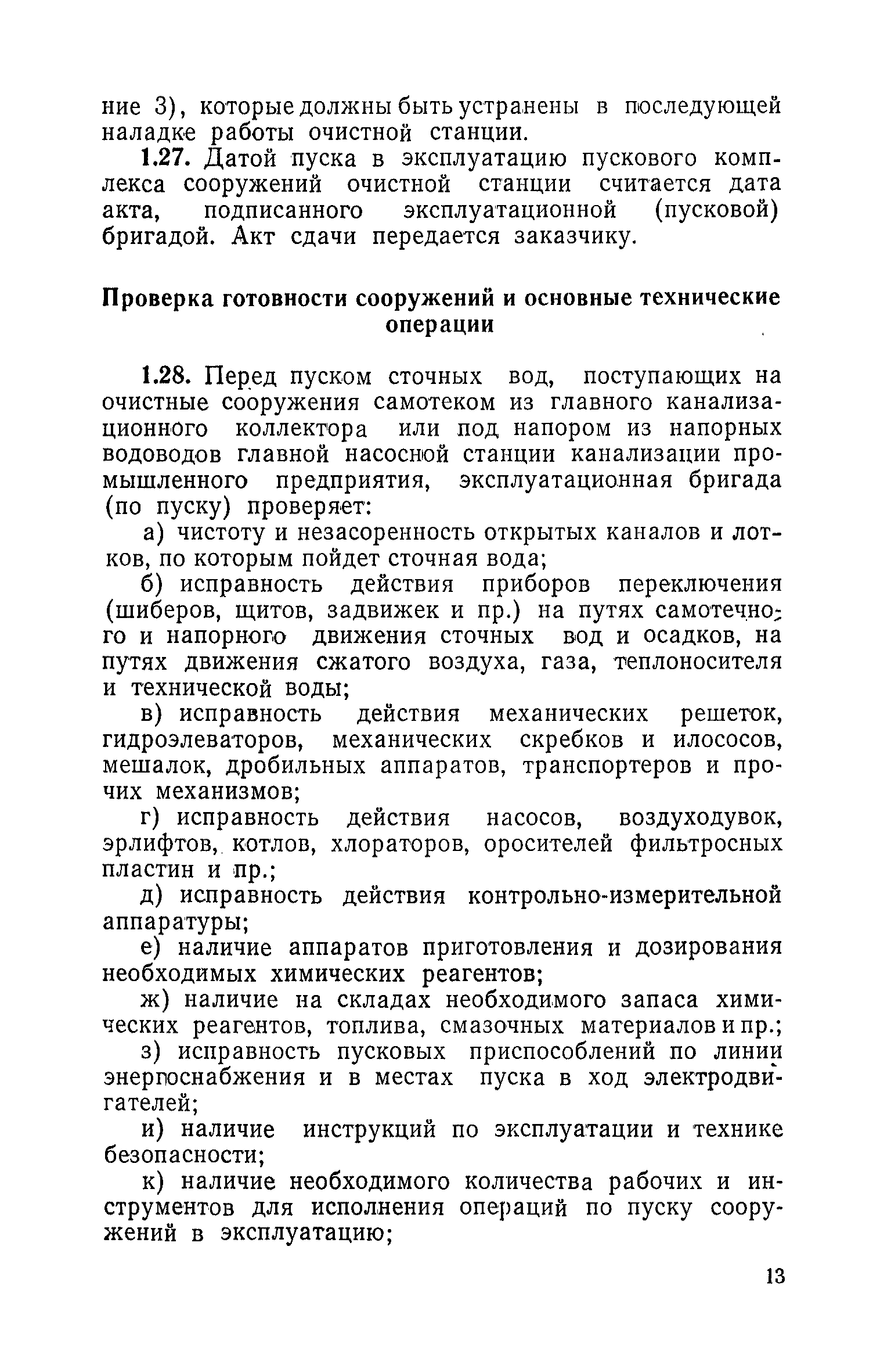 | Оглавление: | Глава 1. Общие условия по приемке, пуску и эксплуатации станций биохимической очистки промышленных сточных вод А. Приемка в эксплуатацию Общие положения Рабочая комиссия, ее права, обязанности и порядок работы Общие правила приемки в эксплуатацию сооружений очистной станции Приемка наружных трубопроводов и сооружений в эксплуатацию Б. Общие условия пуска сооружений в эксплуатацию Организационные положения Проверка готовности сооружений и основные технические операции В. Общие условие технической очистки сточных вод Основные положения Контроль за работой очистной станции Глава 2. Механическая очистка сточных вод Решетки Песколовки Первичные отстойники и преаэраторы Двухъярусные отстойники Усреднители Глава 3. Биохимическая (биологическая) очистка сточных вод . Сущность биохимической очистки сточных вод Условия для биохимической очистки сточных вод Биофильтры Биофильтры с принудительной аэрацией (аэрофильтры) Аэротенки Вторичные отстойники после аэротенков Вторичные отстойники после биофильтров Биологический контроль за сооружениями Глава 4. Обработка осадков и других примесей сточных вод Виды примесей твердых и всплывающих веществ Обработка отбросов, снимаемых с решеток Обработка песка, удаляемого из песколовок Обработка жиров и масел из первичных отстойников Обработка осадков сточных вод Обезвоживание осадков сточных вод Обезвоживание на иловых площадках Обезвоживание на иловых прудах Обезвоживание на вакуум-фильтрах Глава 5. Нейтрализация сточных вод Глава 6. Организация службы по эксплуатации очистной станции биохимической очистки сточных вод Приложение 1. Акт приемки в эксплуатацию рабочей комиссией законченного строительством (реконструкцией) и монтажом сооружения Приложение 2. Акт приемки в эксплуатацию рабочей приемочной комиссией законченных строительством (реконструкцией) сооружений Приложение 3. Акт пуска в эксплуатацию законченного строительством (реконструкцией) сооружения Приложение 4. Журнал учета работы станции нейтрализации Приложение 5. Журнал учета работы шламовой насосной станции отстойников Приложение 6. Журнал учета количества осадка, подаваемого в шламонакопитель Приложение 7. Журнал записи анализов сточных вод Приложение 8. Журнал записи анализов реагентов, применяемых для нейтрализации Приложение 9. Определение активной СаО в извести и в известковом молоке сахаратным методом Приложение 10. Метод определения токсичности промышленных сточных вод и их отдельных компонентов, направляемых на биохимическую очистку Приложение 11. Выписка из главы СНиП III-Г.4-62 Приложение 12. Перечень основных глав III части СНиП и других нормативных документов, которыми следует руководствоваться при приемке в эксплуатацию сооружений очистной станции |