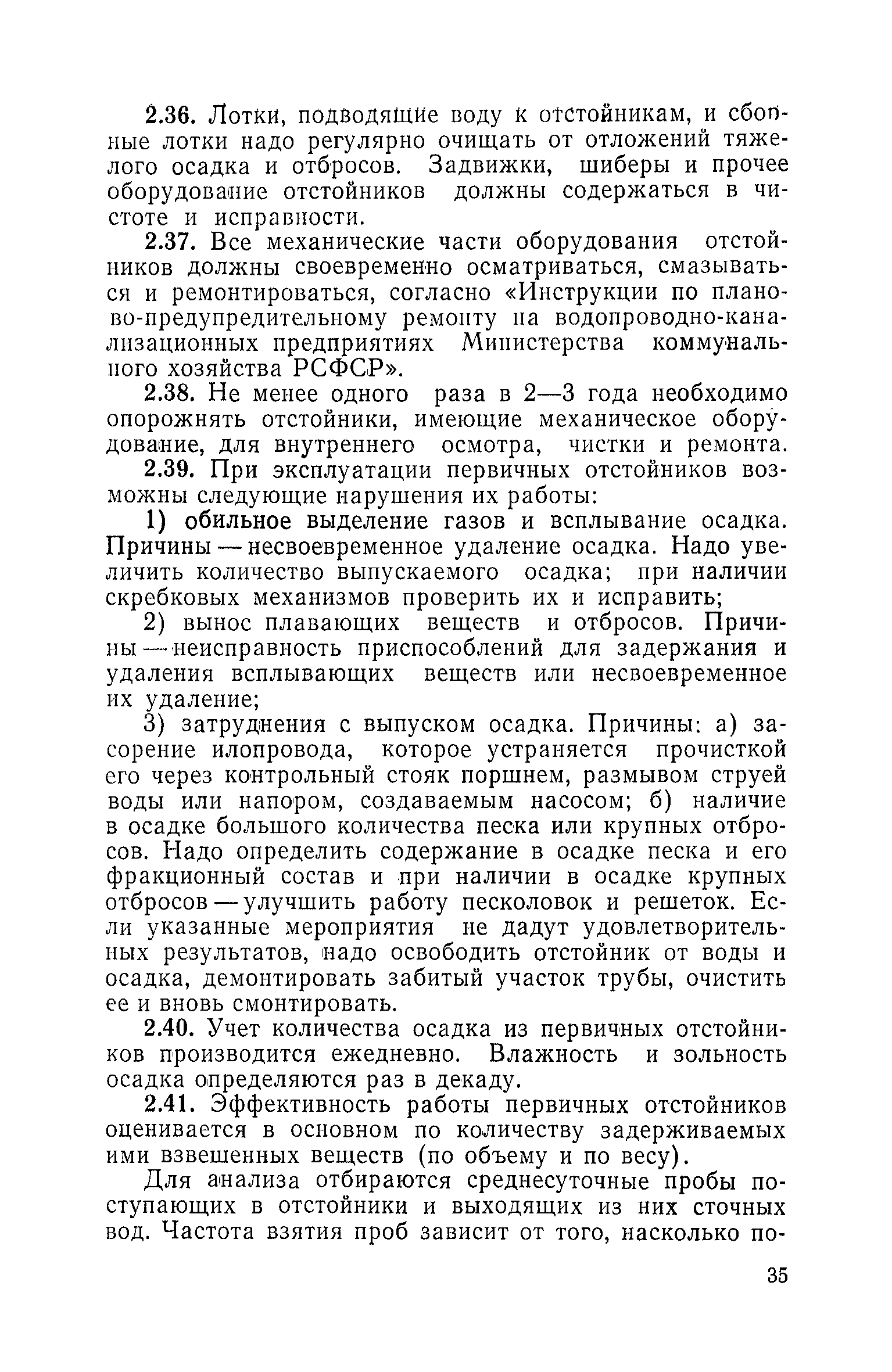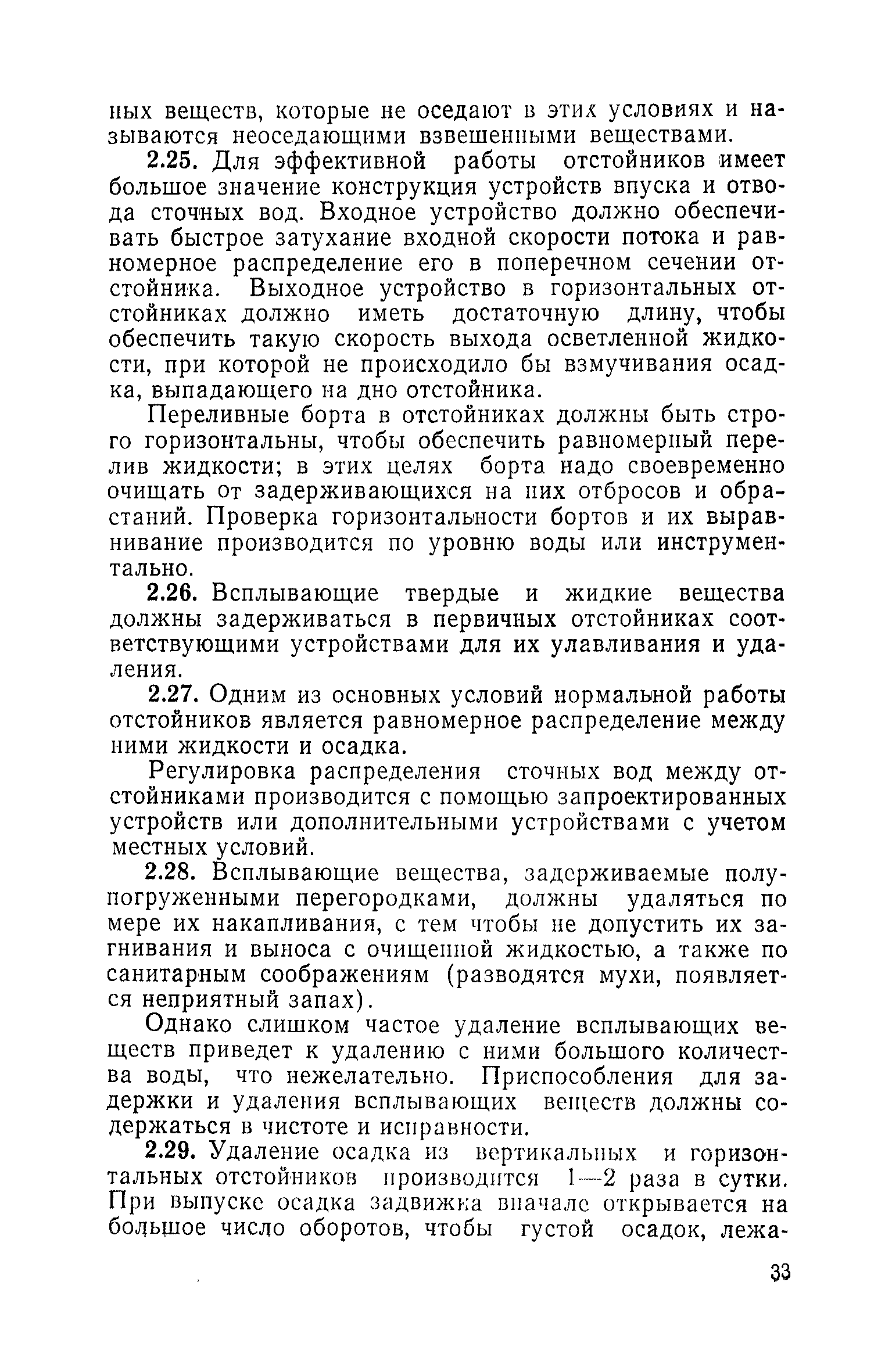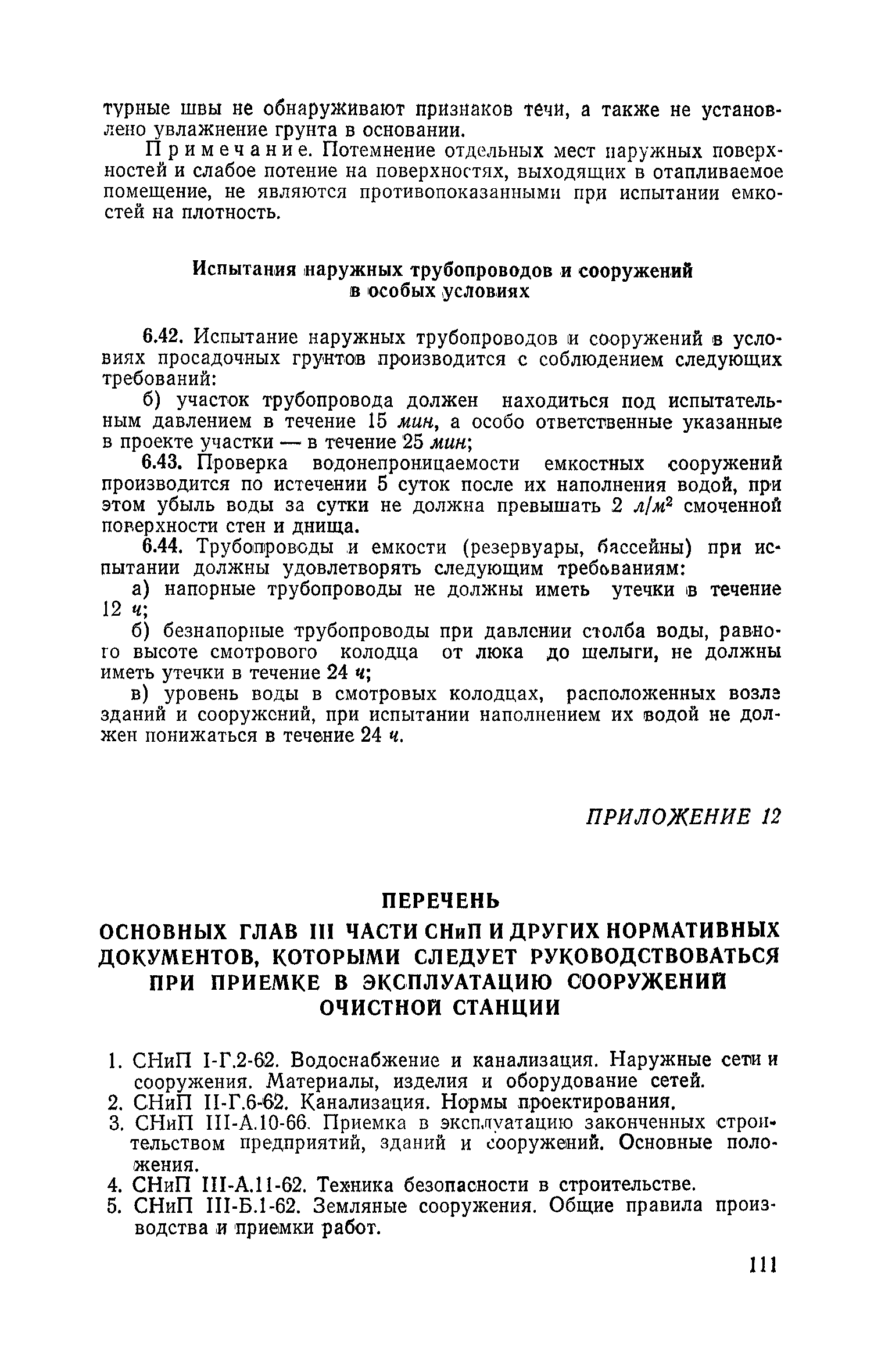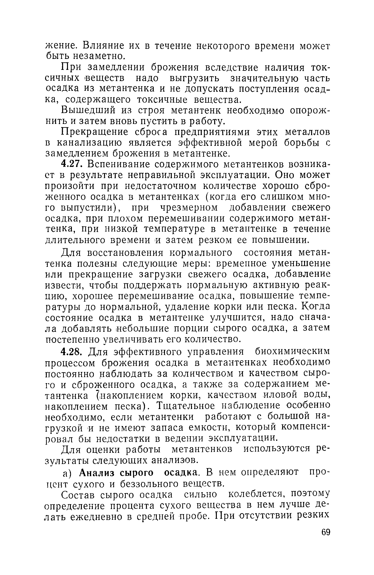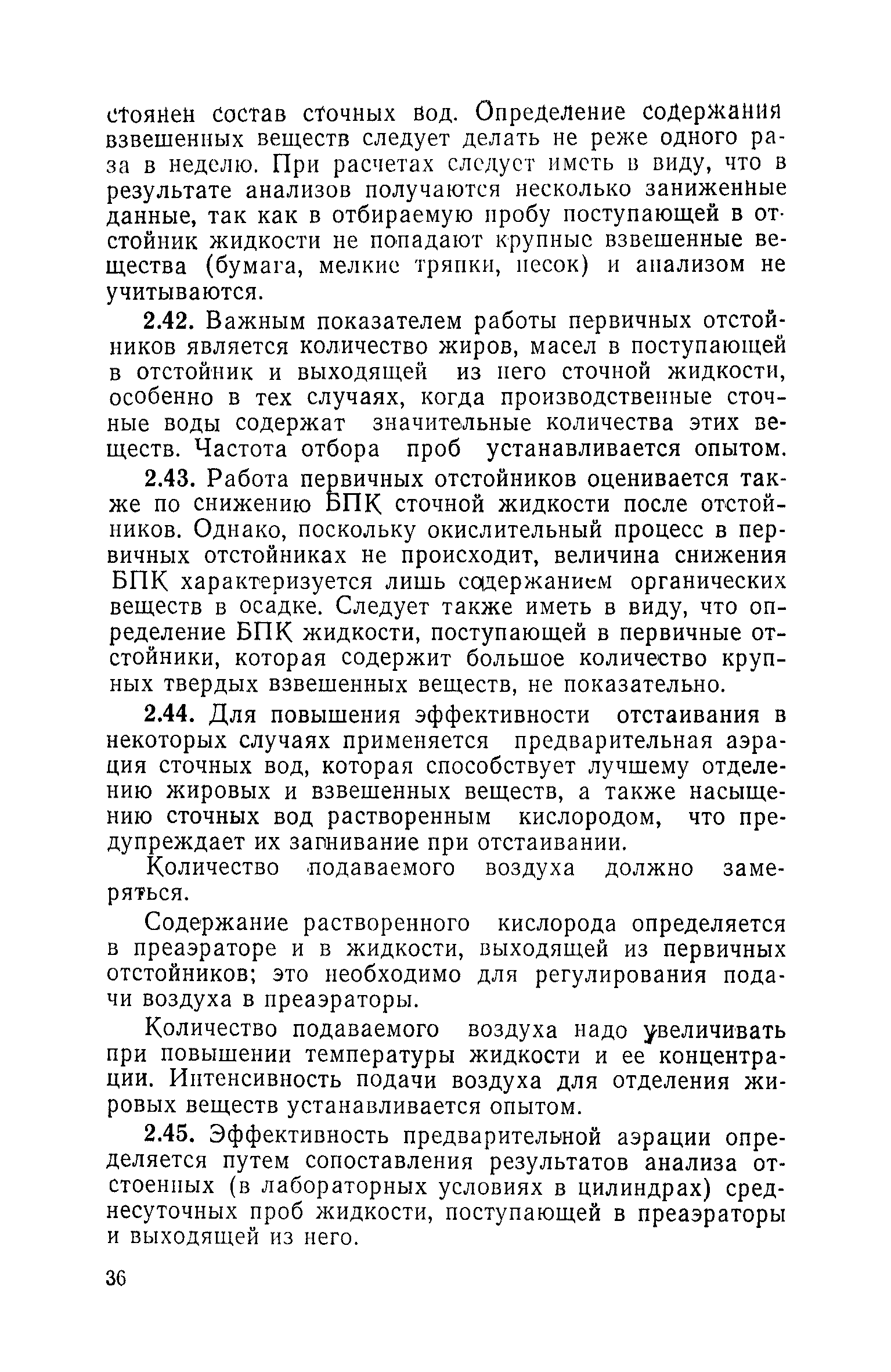 | Оглавление: | Глава 1. Общие условия по приемке, пуску и эксплуатации станций биохимической очистки промышленных сточных вод А. Приемка в эксплуатацию Общие положения Рабочая комиссия, ее права, обязанности и порядок работы Общие правила приемки в эксплуатацию сооружений очистной станции Приемка наружных трубопроводов и сооружений в эксплуатацию Б. Общие условия пуска сооружений в эксплуатацию Организационные положения Проверка готовности сооружений и основные технические операции В. Общие условие технической очистки сточных вод Основные положения Контроль за работой очистной станции Глава 2. Механическая очистка сточных вод Решетки Песколовки Первичные отстойники и преаэраторы Двухъярусные отстойники Усреднители Глава 3. Биохимическая (биологическая) очистка сточных вод . Сущность биохимической очистки сточных вод Условия для биохимической очистки сточных вод Биофильтры Биофильтры с принудительной аэрацией (аэрофильтры) Аэротенки Вторичные отстойники после аэротенков Вторичные отстойники после биофильтров Биологический контроль за сооружениями Глава 4. Обработка осадков и других примесей сточных вод Виды примесей твердых и всплывающих веществ Обработка отбросов, снимаемых с решеток Обработка песка, удаляемого из песколовок Обработка жиров и масел из первичных отстойников Обработка осадков сточных вод Обезвоживание осадков сточных вод Обезвоживание на иловых площадках Обезвоживание на иловых прудах Обезвоживание на вакуум-фильтрах Глава 5. Нейтрализация сточных вод Глава 6. Организация службы по эксплуатации очистной станции биохимической очистки сточных вод Приложение 1. Акт приемки в эксплуатацию рабочей комиссией законченного строительством (реконструкцией) и монтажом сооружения Приложение 2. Акт приемки в эксплуатацию рабочей приемочной комиссией законченных строительством (реконструкцией) сооружений Приложение 3. Акт пуска в эксплуатацию законченного строительством (реконструкцией) сооружения Приложение 4. Журнал учета работы станции нейтрализации Приложение 5. Журнал учета работы шламовой насосной станции отстойников Приложение 6. Журнал учета количества осадка, подаваемого в шламонакопитель Приложение 7. Журнал записи анализов сточных вод Приложение 8. Журнал записи анализов реагентов, применяемых для нейтрализации Приложение 9. Определение активной СаО в извести и в известковом молоке сахаратным методом Приложение 10. Метод определения токсичности промышленных сточных вод и их отдельных компонентов, направляемых на биохимическую очистку Приложение 11. Выписка из главы СНиП III-Г.4-62 Приложение 12. Перечень основных глав III части СНиП и других нормативных документов, которыми следует руководствоваться при приемке в эксплуатацию сооружений очистной станции |