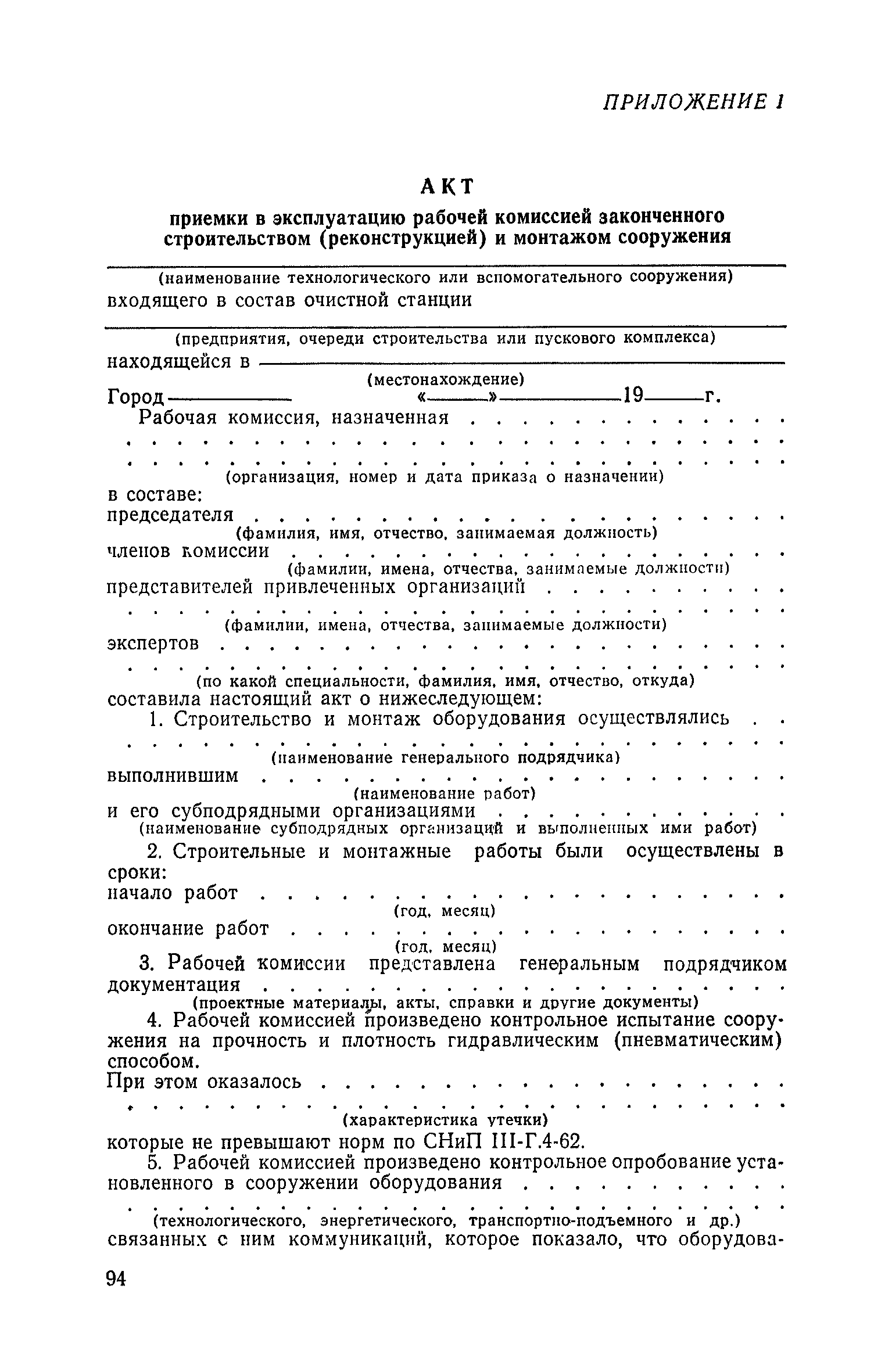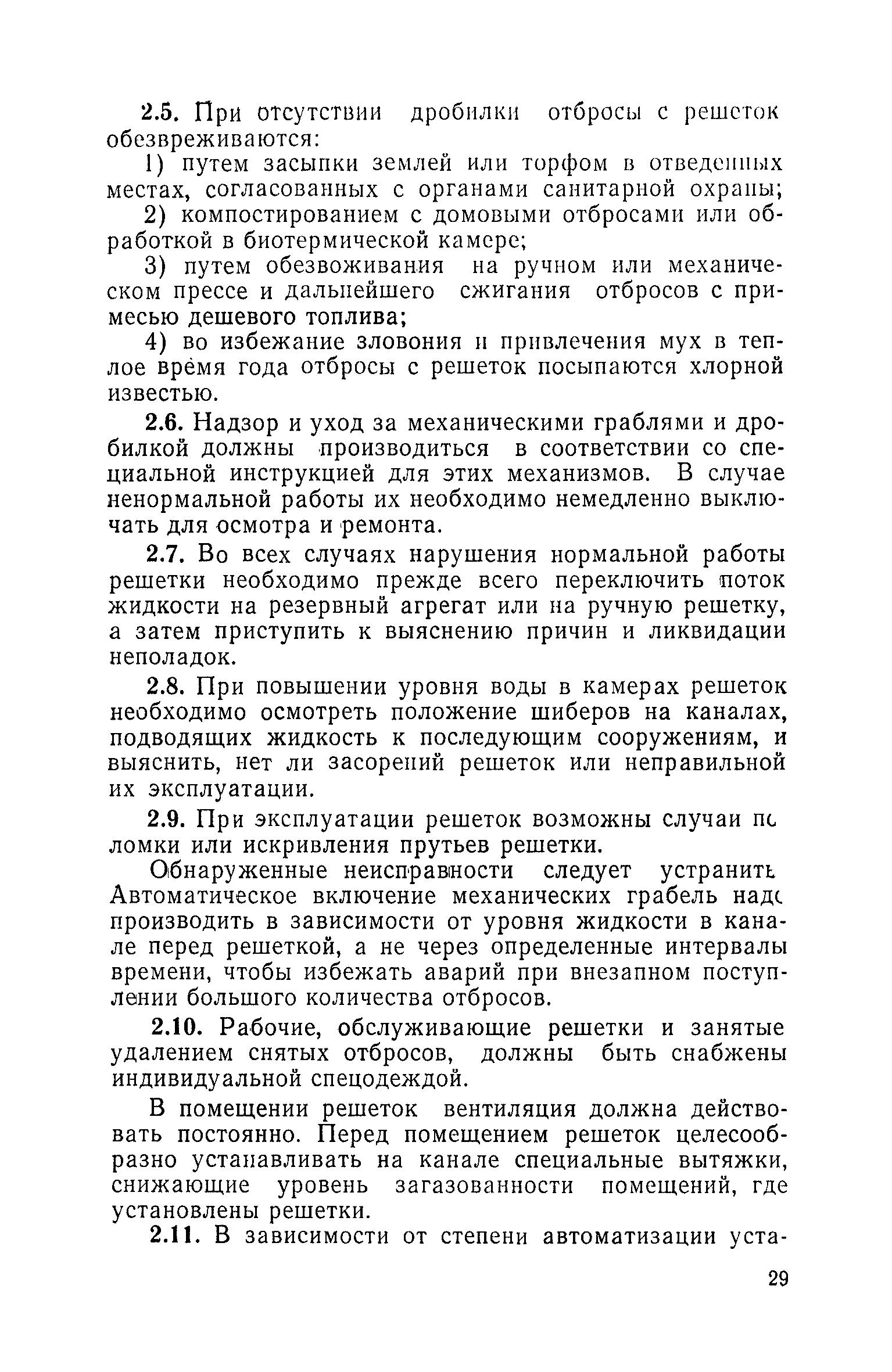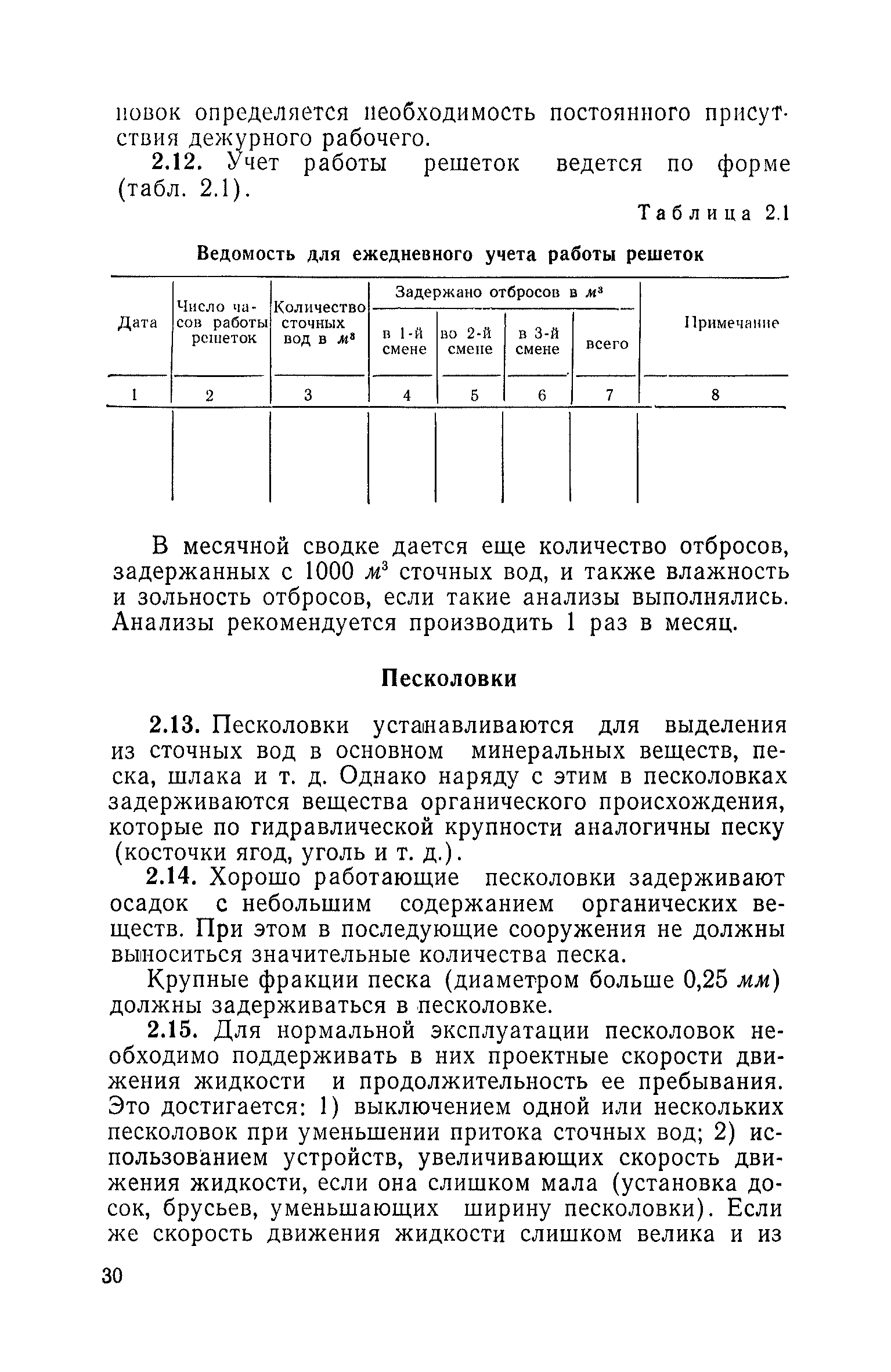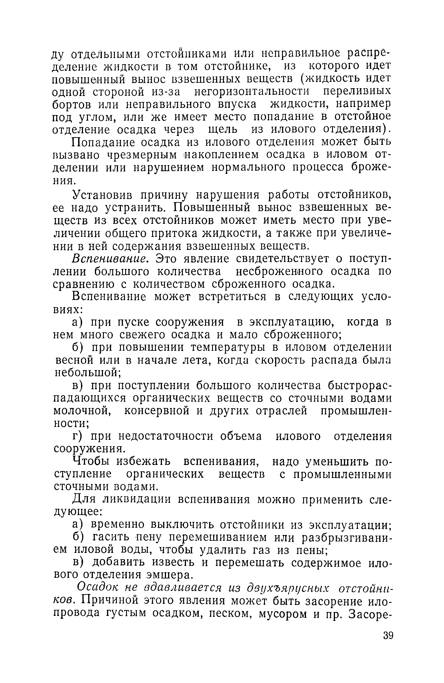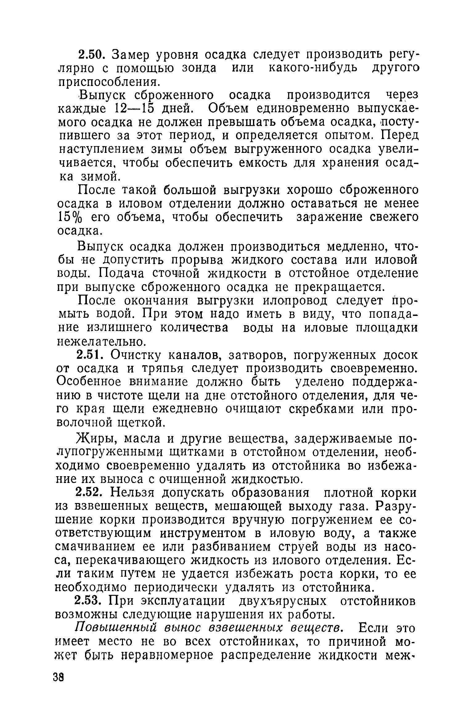 | Оглавление: | Глава 1. Общие условия по приемке, пуску и эксплуатации станций биохимической очистки промышленных сточных вод А. Приемка в эксплуатацию Общие положения Рабочая комиссия, ее права, обязанности и порядок работы Общие правила приемки в эксплуатацию сооружений очистной станции Приемка наружных трубопроводов и сооружений в эксплуатацию Б. Общие условия пуска сооружений в эксплуатацию Организационные положения Проверка готовности сооружений и основные технические операции В. Общие условие технической очистки сточных вод Основные положения Контроль за работой очистной станции Глава 2. Механическая очистка сточных вод Решетки Песколовки Первичные отстойники и преаэраторы Двухъярусные отстойники Усреднители Глава 3. Биохимическая (биологическая) очистка сточных вод . Сущность биохимической очистки сточных вод Условия для биохимической очистки сточных вод Биофильтры Биофильтры с принудительной аэрацией (аэрофильтры) Аэротенки Вторичные отстойники после аэротенков Вторичные отстойники после биофильтров Биологический контроль за сооружениями Глава 4. Обработка осадков и других примесей сточных вод Виды примесей твердых и всплывающих веществ Обработка отбросов, снимаемых с решеток Обработка песка, удаляемого из песколовок Обработка жиров и масел из первичных отстойников Обработка осадков сточных вод Обезвоживание осадков сточных вод Обезвоживание на иловых площадках Обезвоживание на иловых прудах Обезвоживание на вакуум-фильтрах Глава 5. Нейтрализация сточных вод Глава 6. Организация службы по эксплуатации очистной станции биохимической очистки сточных вод Приложение 1. Акт приемки в эксплуатацию рабочей комиссией законченного строительством (реконструкцией) и монтажом сооружения Приложение 2. Акт приемки в эксплуатацию рабочей приемочной комиссией законченных строительством (реконструкцией) сооружений Приложение 3. Акт пуска в эксплуатацию законченного строительством (реконструкцией) сооружения Приложение 4. Журнал учета работы станции нейтрализации Приложение 5. Журнал учета работы шламовой насосной станции отстойников Приложение 6. Журнал учета количества осадка, подаваемого в шламонакопитель Приложение 7. Журнал записи анализов сточных вод Приложение 8. Журнал записи анализов реагентов, применяемых для нейтрализации Приложение 9. Определение активной СаО в извести и в известковом молоке сахаратным методом Приложение 10. Метод определения токсичности промышленных сточных вод и их отдельных компонентов, направляемых на биохимическую очистку Приложение 11. Выписка из главы СНиП III-Г.4-62 Приложение 12. Перечень основных глав III части СНиП и других нормативных документов, которыми следует руководствоваться при приемке в эксплуатацию сооружений очистной станции |