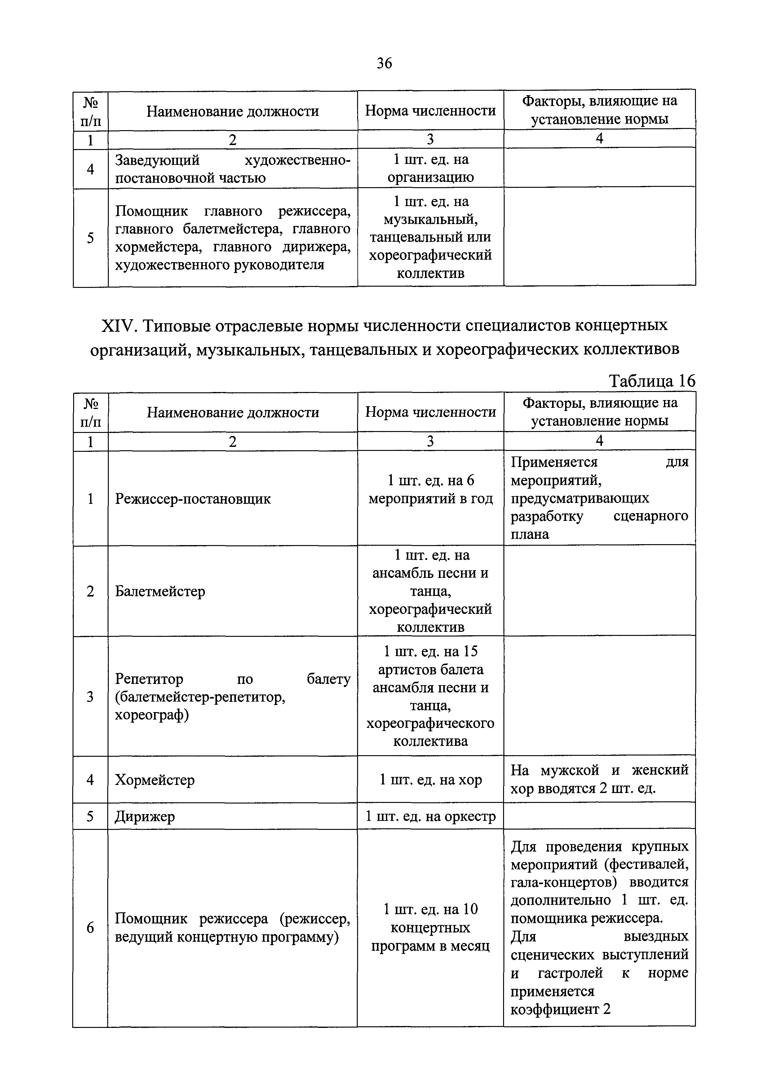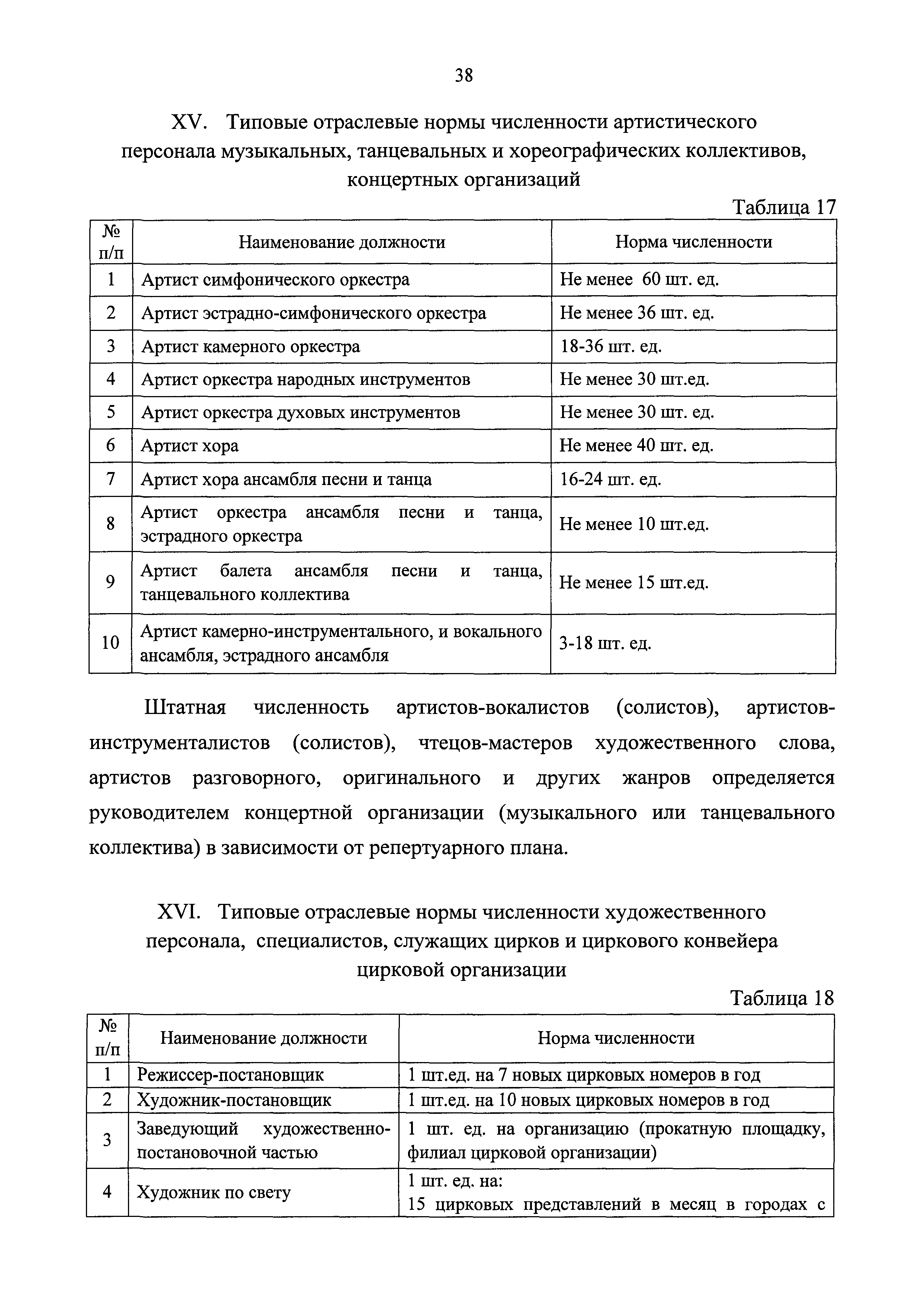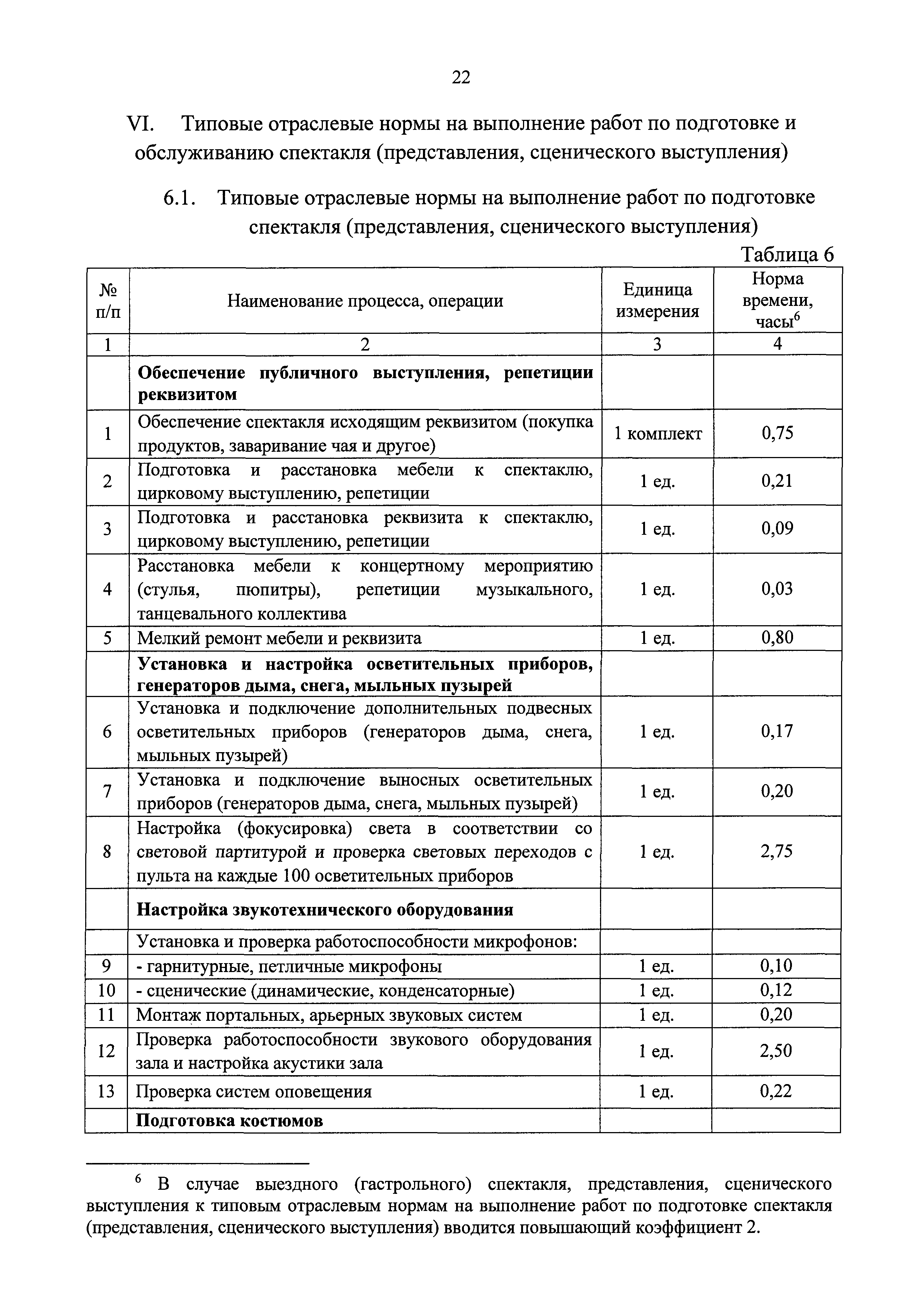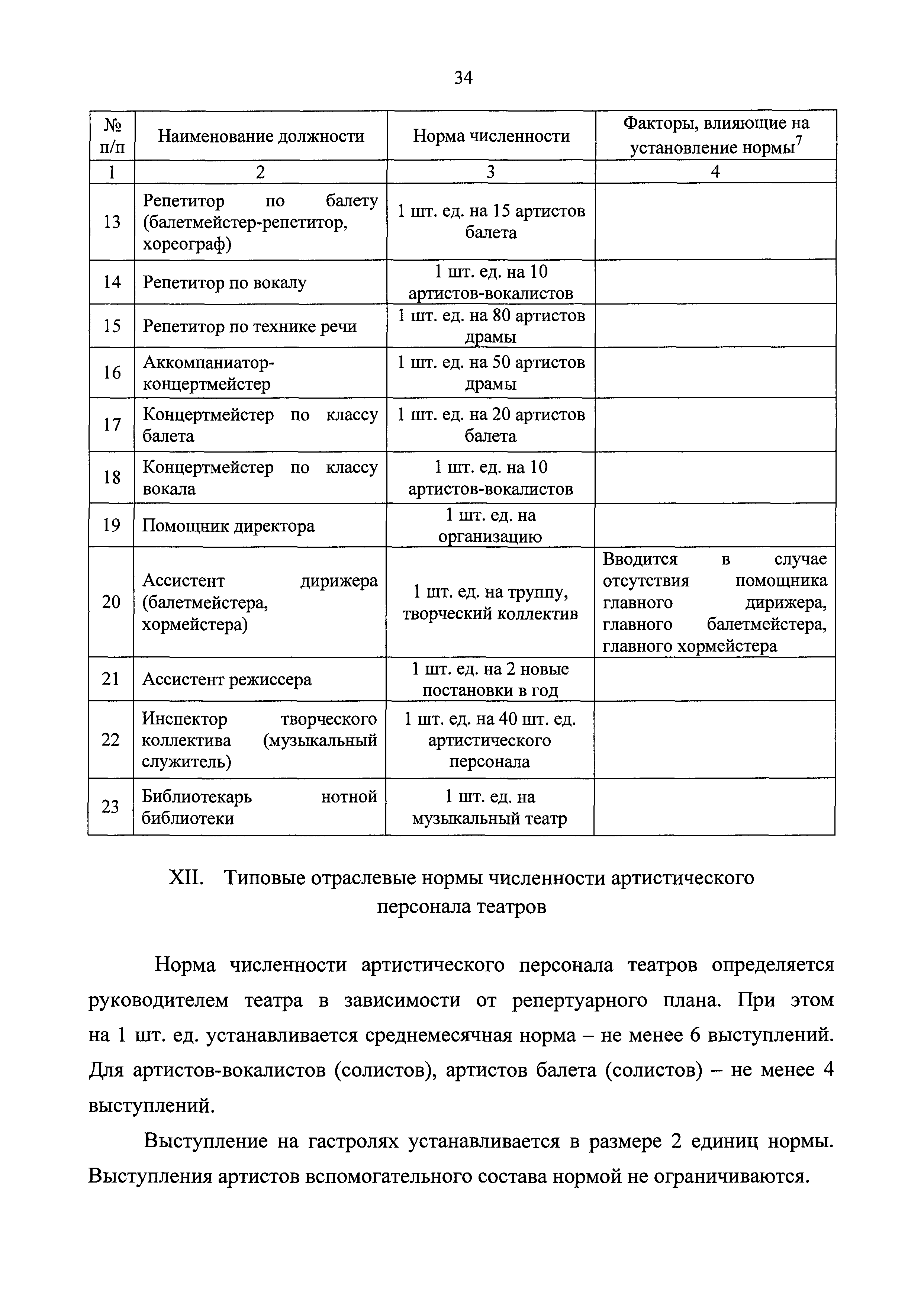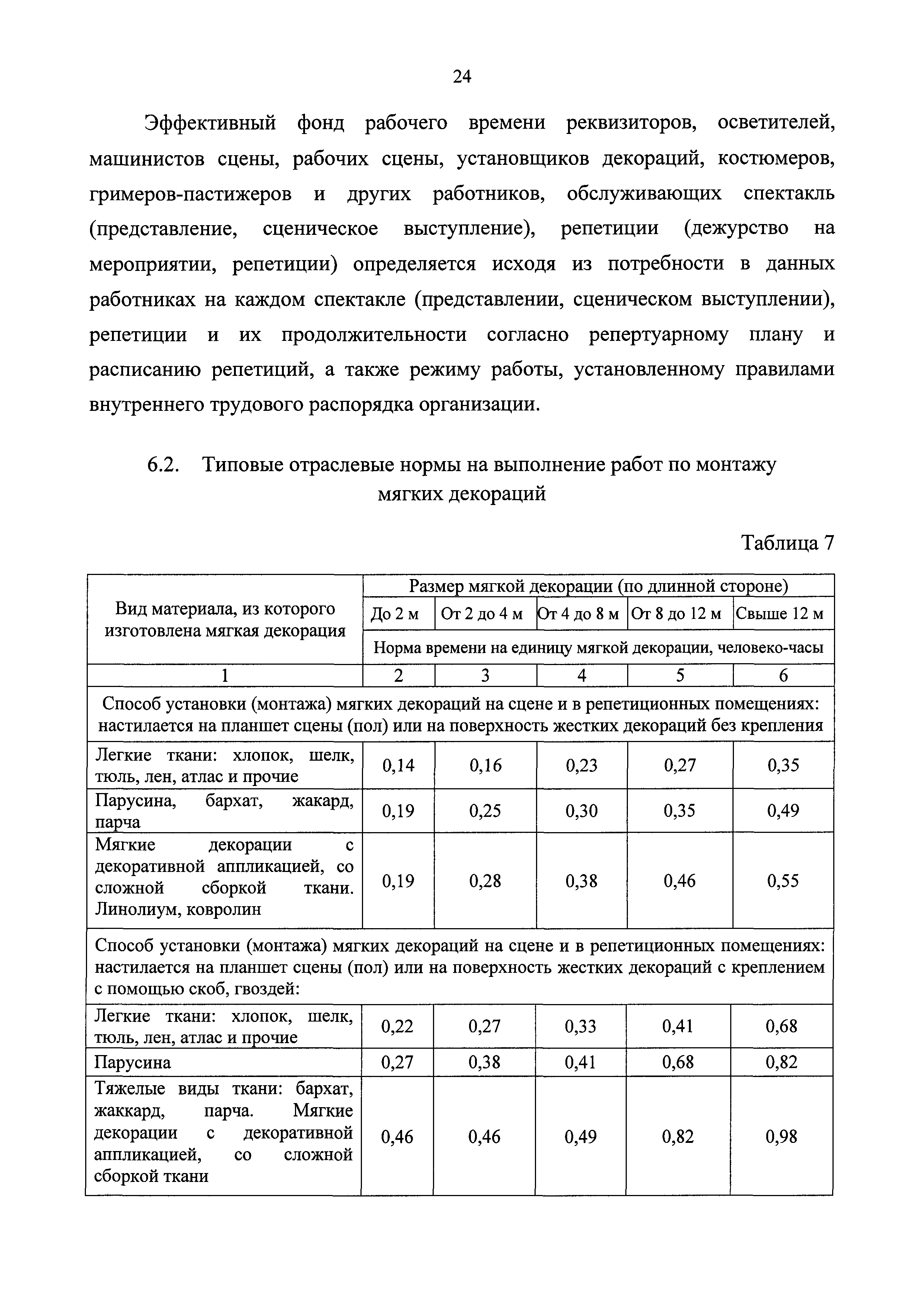Типовые отраслевые нормы труда на работы, выполняемые в организациях исполнительских искусств| Статус: | действует | | Название рус.: | Типовые отраслевые нормы труда на работы, выполняемые в организациях исполнительских искусств | | Дата добавления в базу: | 01.01.2019 | | Дата актуализации: | 01.01.2021 | | Область применения: | Типовые отраслевые нормы труда на работы, выполняемые в организациях исполнительских искусств предназначены для формирования обоснованных оптимальных показателей трудоемкости выполнения работ в государственных (муниципальных) организациях исполнительских искусств (театрах, цирках, концертных организациях, самостоятельных музыкальных коллективах), определения штатной численности работников, выдачи нормированных заданий и соотношений между плановыми и договорными работами | | Оглавление: | I. Общее положение II. Типовые отраслевые нормы на выполнение работ по созданию художественного оформления спектакля (представления, сценического выступления) III. Типовые отраслевые нормы труда на выполнение работ по созданию декораций IV. Типовые отраслевые нормы труда на выполнение работ по созданию костюмов, обуви, головных уборов 4.1. Типовые отраслевые нормы труда на выполнение работ по созданию балетных костюмов и ремонту костюмов 4.2. Типовые отраслевые нормы труда на выполнение работ по созданию обуви, головных уборов V. Типовые отраслевые нормы труда на выполнение работ по созданию игровых кукол VI. Типовые отраслевые нормы на выполнение работ по подготовке и обслуживанию спектакля (представления, сценического выступления) 6.1. Типовые отраслевые нормы на выполнение работ по подготовке спектакля (представления, сценического выступления) 6.2. Типовые отраслевые нормы на выполнение работ по монтажу мягких декораций 6.3. Типовые отраслевые нормы на выполнение работ по монтажу жестких декораций 6.4. Типовые отраслевые нормы на выполнение работ по монтажу объемных жестких декораций глубиной более 0,5 м VII. Типовые отраслевые нормы на выполнение работ по ремонту и реставрации музыкальных инструментов VIII. Типовые отраслевые нормы на выполнение работ по организации сценических выступлений, конкурсов, фестивалей и других видов публичных выступлений IX. Типовые отраслевые нормы численности руководителей организаций исполнительского искусства, руководителей структурных подразделений X. Типовые отраслевые нормы численности художественного персонала театров XI. Типовые отраслевые нормы численности специалистов театров XII. Типовые отраслевые нормы численности артистического персонала театров XIII. Типовые отраслевые нормы численности художественного персонала концертных организаций, музыкальных, танцевальных и хореографических коллективов XIV. Типовые отраслевые нормы численности специалистов концертных организаций, музыкальных, танцевальных и хореографических коллективов ХV. Типовые отраслевые нормы численности артистического персонала музыкальных, танцевальных и хореографических коллективов, концертных организаций XVI. Типовые отраслевые нормы численности художественного персонала, специалистов, служащих цирков и циркового конвейера цирковой организации XVII. Типовые отраслевые нормы численности артистического персонала цирков XVIII. Типовые отраслевые нормы численности ассистентов, рабочих по уходу за животн