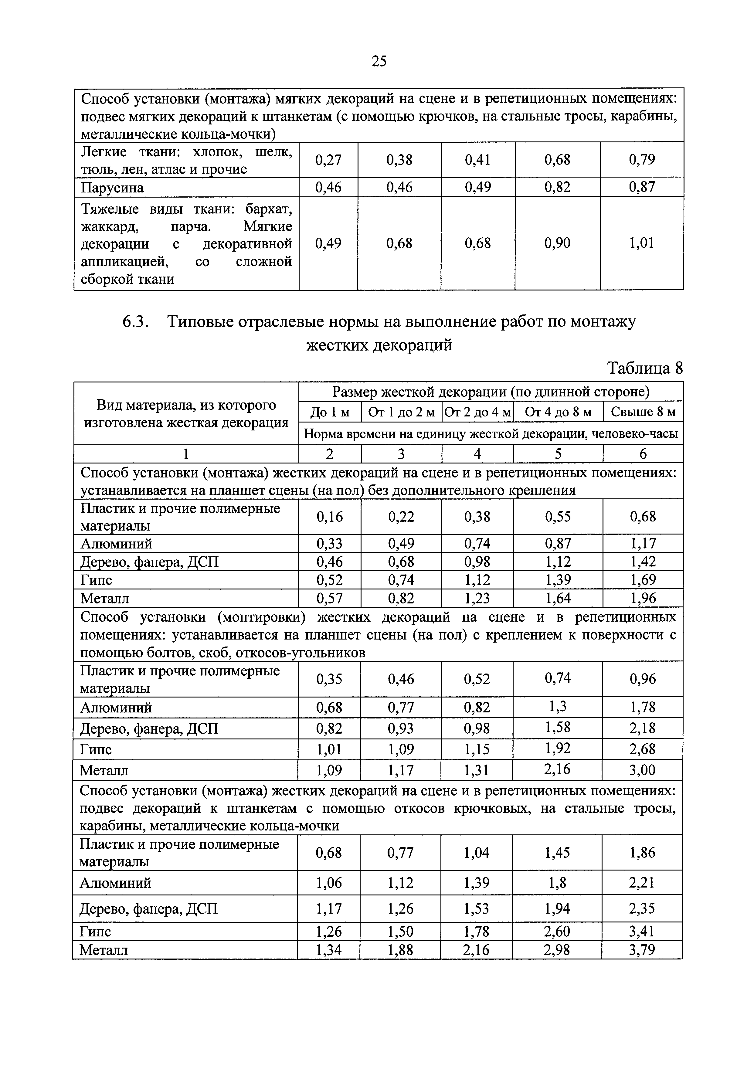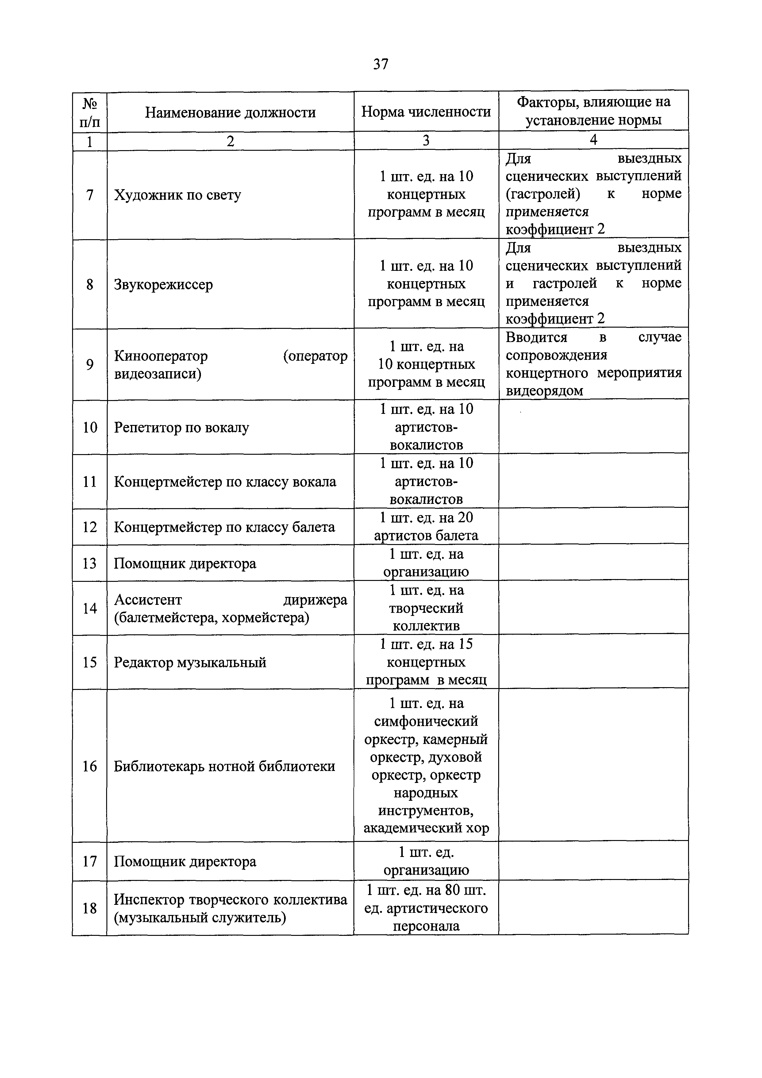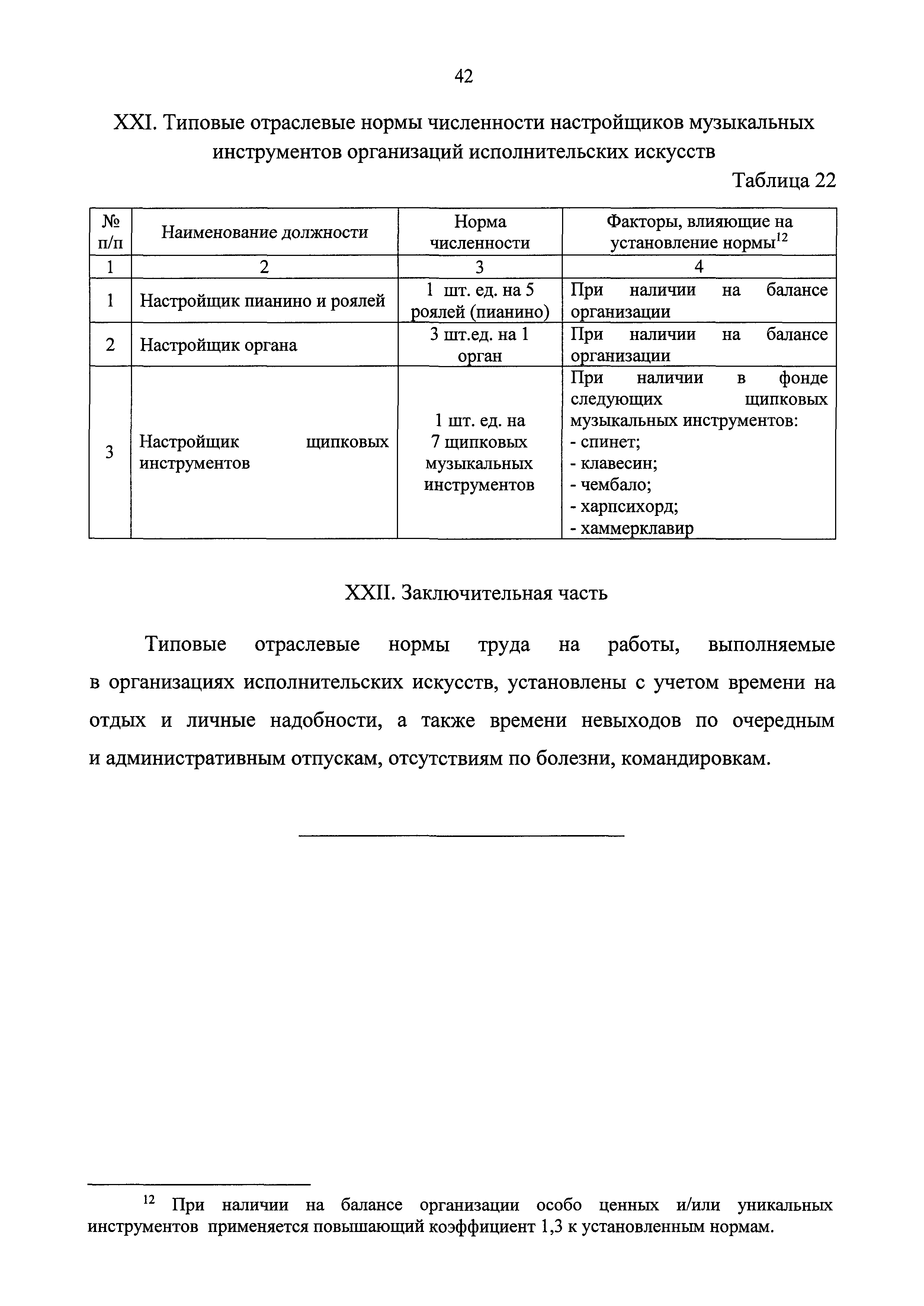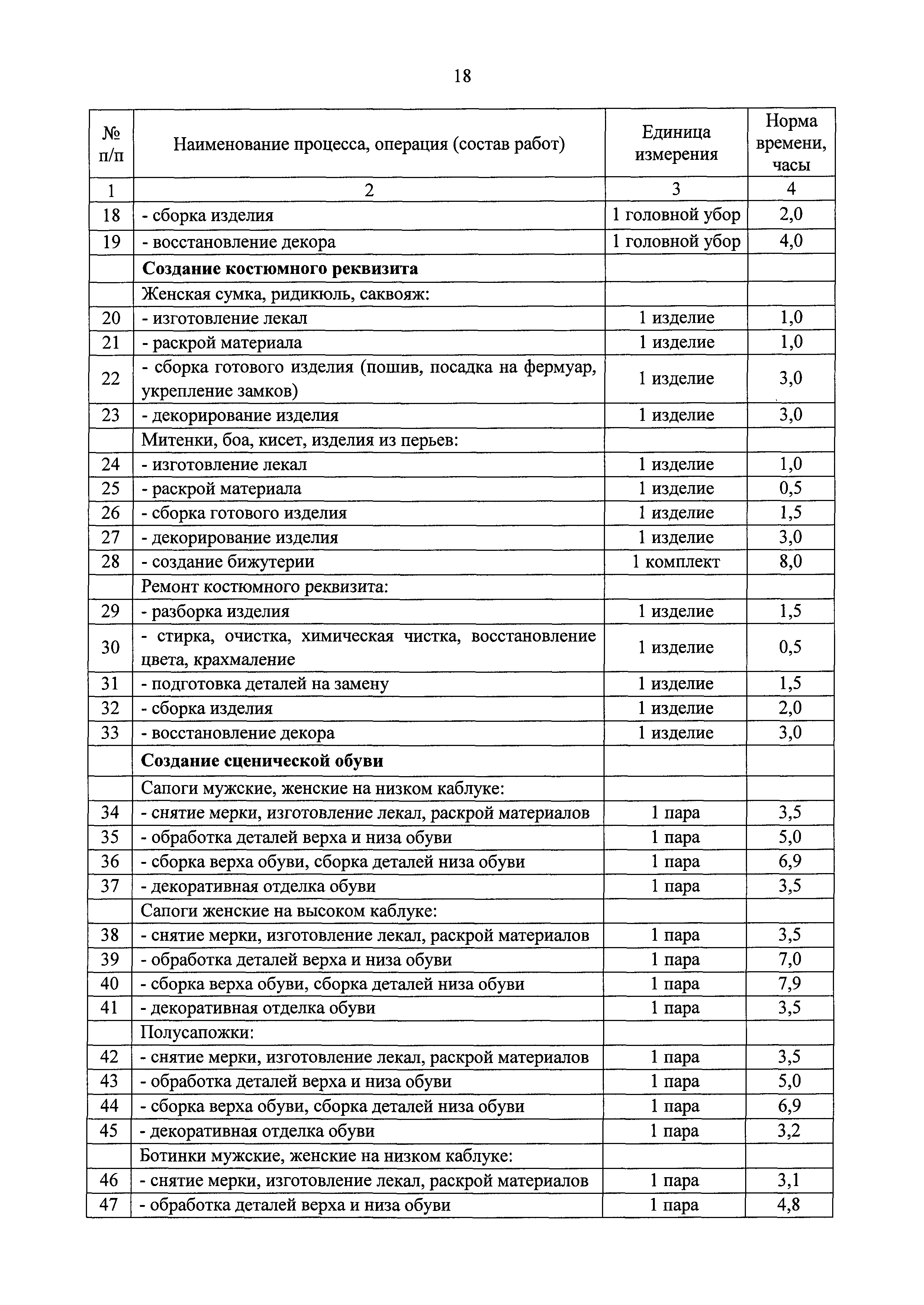 Типовые отраслевые нормы труда на работы, выполняемые в организациях исполнительских искусств| Статус: | действует | | Название рус.: | Типовые отраслевые нормы труда на работы, выполняемые в организациях исполнительских искусств | | Дата добавления в базу: | 01.01.2019 | | Дата актуализации: | 01.01.2021 | | Область применения: | Типовые отраслевые нормы труда на работы, выполняемые в организациях исполнительских искусств предназначены для формирования обоснованных оптимальных показателей трудоемкости выполнения работ в государственных (муниципальных) организациях исполнительских искусств (театрах, цирках, концертных организациях, самостоятельных музыкальных коллективах), определения штатной численности работников, выдачи нормированных заданий и соотношений между плановыми и договорными работами | | Оглавление: | I. Общее положение II. Типовые отраслевые нормы на выполнение работ по созданию художественного оформления спектакля (представления, сценического выступления) III. Типовые отраслевые нормы труда на выполнение работ по созданию декораций IV. Типовые отраслевые нормы труда на выполнение работ по созданию костюмов, обуви, головных уборов 4.1. Типовые отраслевые нормы труда на выполнение работ по созданию балетных костюмов и ремонту костюмов 4.2. Типовые отраслевые нормы труда на выполнение работ по созданию обуви, головных уборов V. Типовые отраслевые нормы труда на выполнение работ по созданию игровых кукол VI. Типовые отраслевые нормы на выполнение работ по подготовке и обслуживанию спектакля (представления, сценического выступления) 6.1. Типовые отраслевые нормы на выполнение работ по подготовке спектакля (представления, сценического выступления) 6.2. Типовые отраслевые нормы на выполнение работ по монтажу мягких декораций 6.3. Типовые отраслевые нормы на выполнение работ по монтажу жестких декораций 6.4. Типовые отраслевые нормы на выполнение работ по монтажу объемных жестких декораций глубиной более 0,5 м VII. Типовые отраслевые нормы на выполнение работ по ремонту и реставрации музыкальных инструментов VIII. Типовые отраслевые нормы на выполнение работ по организации сценических выступлений, конкурсов, фестивалей и других видов публичных выступлений IX. Типовые отраслевые нормы численности руководителей организаций исполнительского искусства, руководителей структурных подразделений X. Типовые отраслевые нормы численности художественного персонала театров XI. Типовые отраслевые нормы численности специалистов театров XII. Типовые отраслевые нормы численности артистического персонала театров XIII. Типовые отраслевые нормы численности художественного персонала концертных организаций, музыкальных, танцевальных и хореографических коллективов XIV. Типовые отраслевые нормы численности специалистов концертных организаций, музыкальных, танцевальных и хореографических коллективов ХV. Типовые отраслевые нормы численности артистического персонала музыкальных, танцевальных и хореографических коллективов, концертных организаций XVI. Типовые отраслевые нормы численности художественного персонала, специалистов, служащих цирков и циркового конвейера цирковой организации XVII. Типовые отраслевые нормы численности артистического персонала цирков XVIII. Типовые отраслевые нормы численности ассистентов, рабочих по уходу за животн