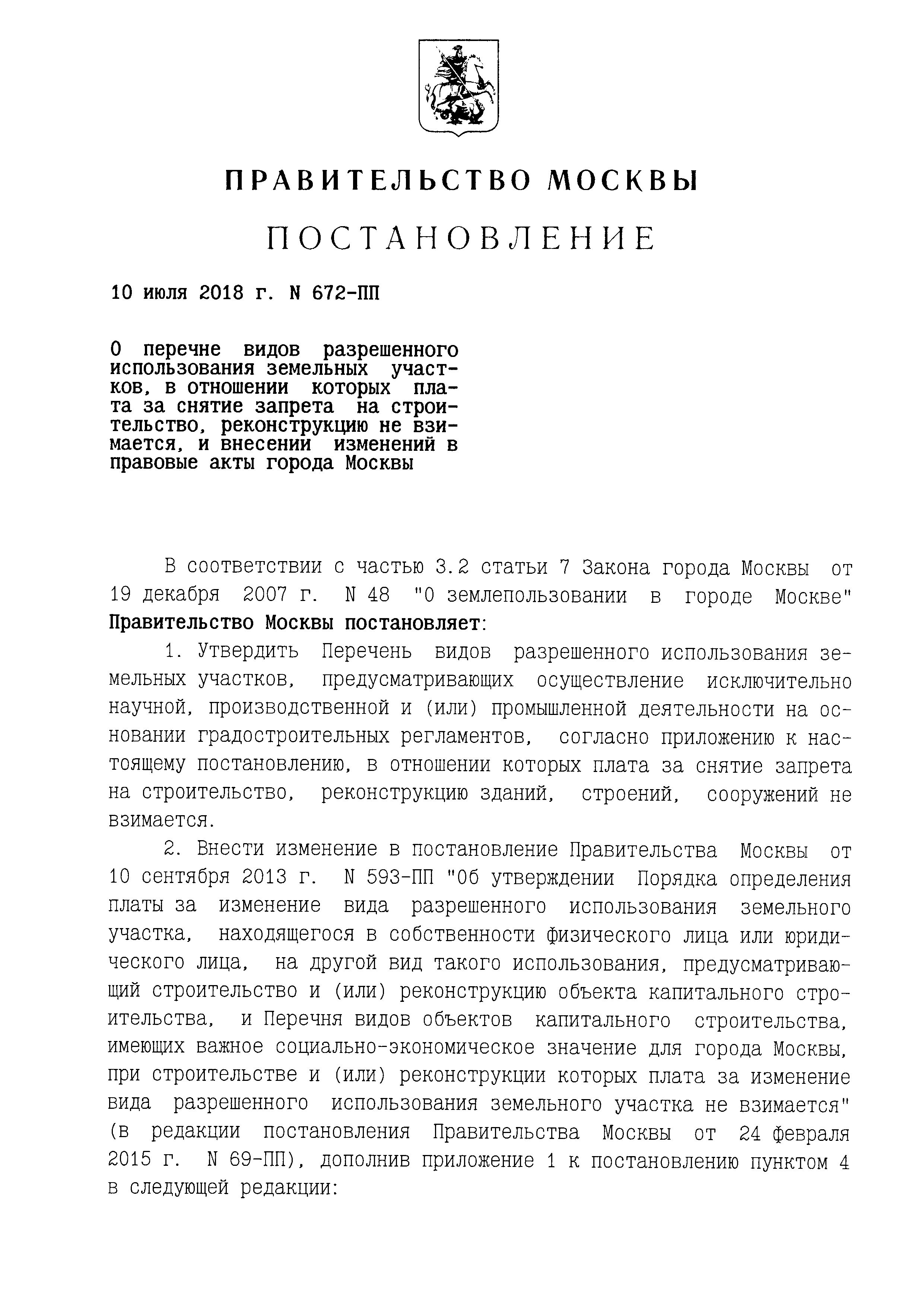 Перечень видов разрешенного использования земельных участков, предусматривающих осуществление исключительно научной, производственной и (или) промышленной деятельности на основании градостроительных регламентов| Статус: | действует | | Название рус.: | Перечень видов разрешенного использования земельных участков, предусматривающих осуществление исключительно научной, производственной и (или) промышленной деятельности на основании градостроительных регламентов | | Дата добавления в базу: | 01.01.2019 | | Дата актуализации: | 01.01.2021 | | Дата введения: | 11.07.2018 | | Утверждён: | 10.07.2018 Правительство Москвы (Government of the City of Moscow 672-ПП)
