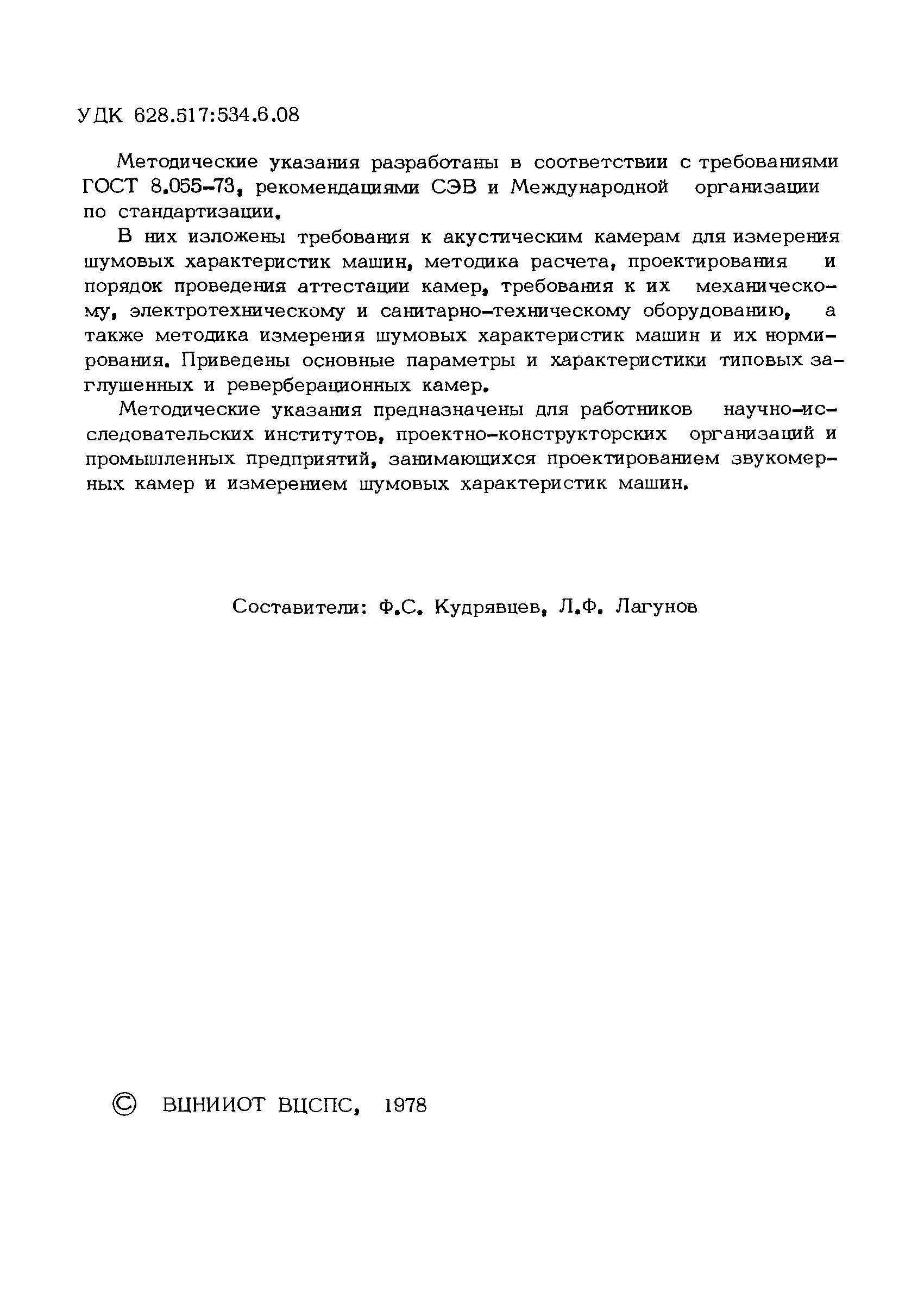 | Область применения: | Методические указания предназначены для работников научно-исследовательских институтов, проектно-конструкторских организаций и промышленных предприятий, занимающихся проектированием звукомерных камер и измерением шумовых характеристик машин |