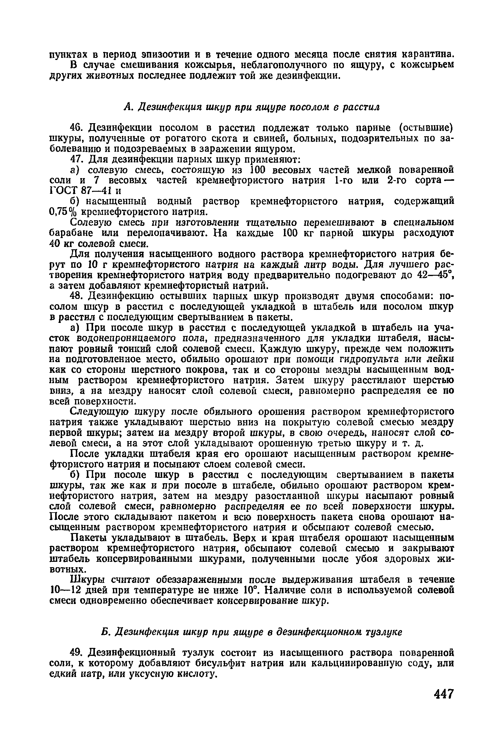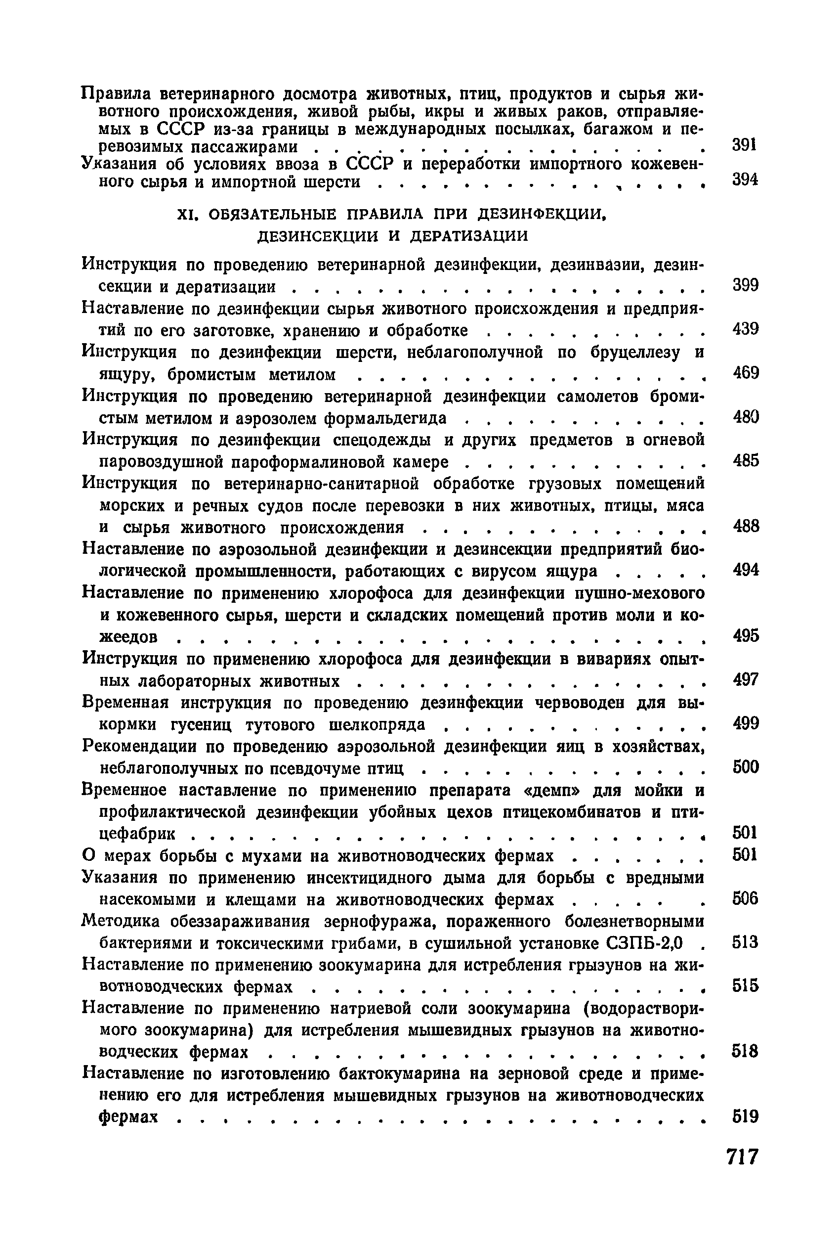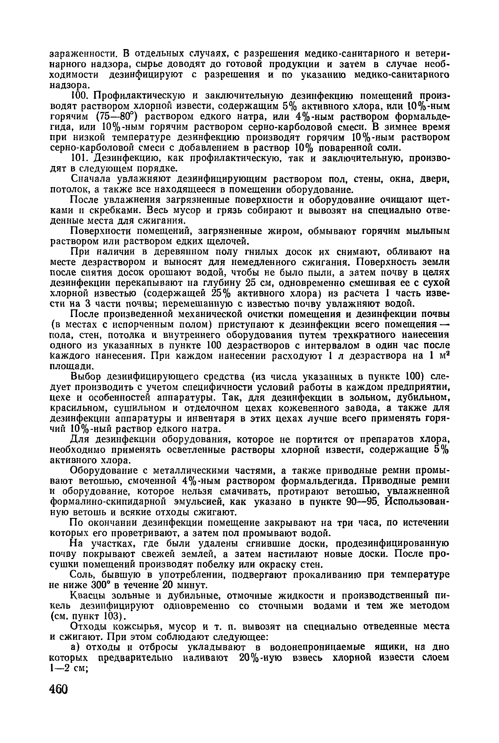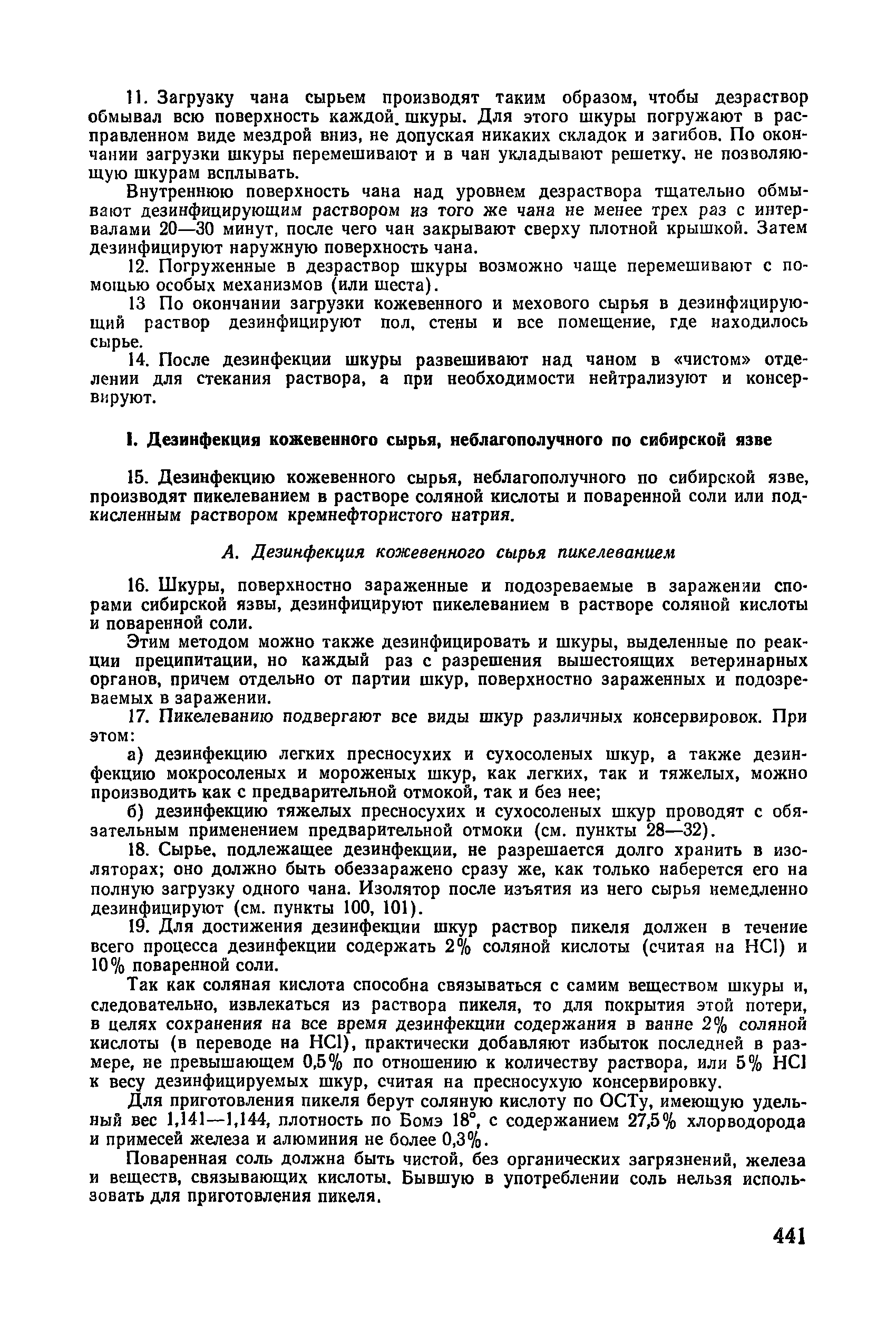 Наставление по дезинфекции сырья животного происхождения и предприятий по его заготовке, хранению и обработке| Статус: | заменен | | Название рус.: | Наставление по дезинфекции сырья животного происхождения и предприятий по его заготовке, хранению и обработке | | Дата добавления в базу: | 01.01.2021 | | Дата актуализации: | 01.01.2021 | | Оглавление: | Дезинфекция кожевенного и мехового сырья I. Дезинфекция кожевенного сырья, неблагополучного по сибирской язве А. Дезинфекция кожевенного сырья пикелеванием Порядок дезинфекции шкур пикелеванием без предварительной отмоки Порядок дезинфекции шкур пикелеванием с предварительной отмокой Б. Дезинфекция кожевенного сырья подкисленным раствором кремнефтористого натрия II. Дезинфекция мехового сырья, неблагополучного по сибирской язве Порядок дезинфекции мехового сырья пресносухой и сухосоленой консервировки Порядок дезинфекции мехового сырья квашеной консервировки III. Дезинфекция шкур при ящуре А. Дезинфекция шкур при ящуре посолом в расстил Б. Дезинфекция шкур при ящуре в дезинфекционном тузлуке IV. Дезинфекция кожевенного сырья при других заразных болезнях V. Дезинфекция пушно-мехового сырья при болезни Ауески VI. Профилактическая дезинфекция шкур, снятых с убитых бродячих собак VII. Дезинфекция шкур на утильзаводах и утильустановках Дезинфекция шерсти, щетины, волоса, пуха и пера I. Дезинфекция шерсти, щетины, волоса и козьего пуха, подозреваемых в неблагополучии по сибирской язве II. Дезинфекция шерсти, щетины, волоса, пуха и пера при заболеваниях, вызываемых неспорообразующими видами микробов III. Дезинфекция волевой и неизвестного происхождения кости IV. Дезинфекция тары V. Дезинфекция машин шерстеобрабатывающей промышленности при сибирской язве Дезинфекция помещений на предприятиях по заготовке, хранению и обработке сырья животного происхождения Приложение 1. Ветеринарно-санитарные требования к строительству камеры упрощенного типа для дезинфекции кожсырья и оборудованию этой камеры Приложение 2. Коэффициенты для перевода веса парных или консервированных шкур на вес пресносухого сырья Приложение 3. Содержание хлорводорода в соляной кислоте Приложение 4. Количество соляной кислоты, необходимое для приготовления 1000 л пикеля для обеззараживания 100 кг пресносухого сырья Приложение 5. Определение концентрации соляной кислоты в пикеле Приложение 6. Таблица по определению количества серной кислоты Приложение 7. Определение кислотности в хлебном киселе Приложение 8. Расчет необходимого количества дезвеществ для дезинфекции шкур в тузлуке (на 500 л тузлука) Приложение 9. Определение концентрации поваренной соли в тузлуке Приложение 10. Приготовление и титрование раствора формальдегида | | Утверждён: | 03.10.1958 Минсельхоз СССР (USSR Minselkhoz )