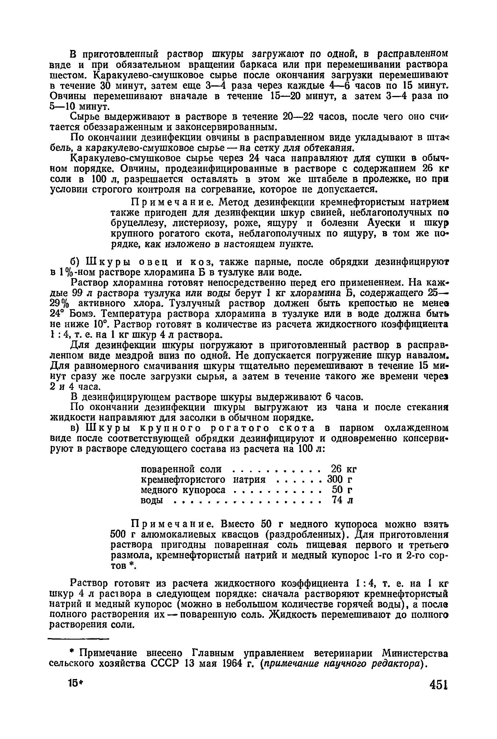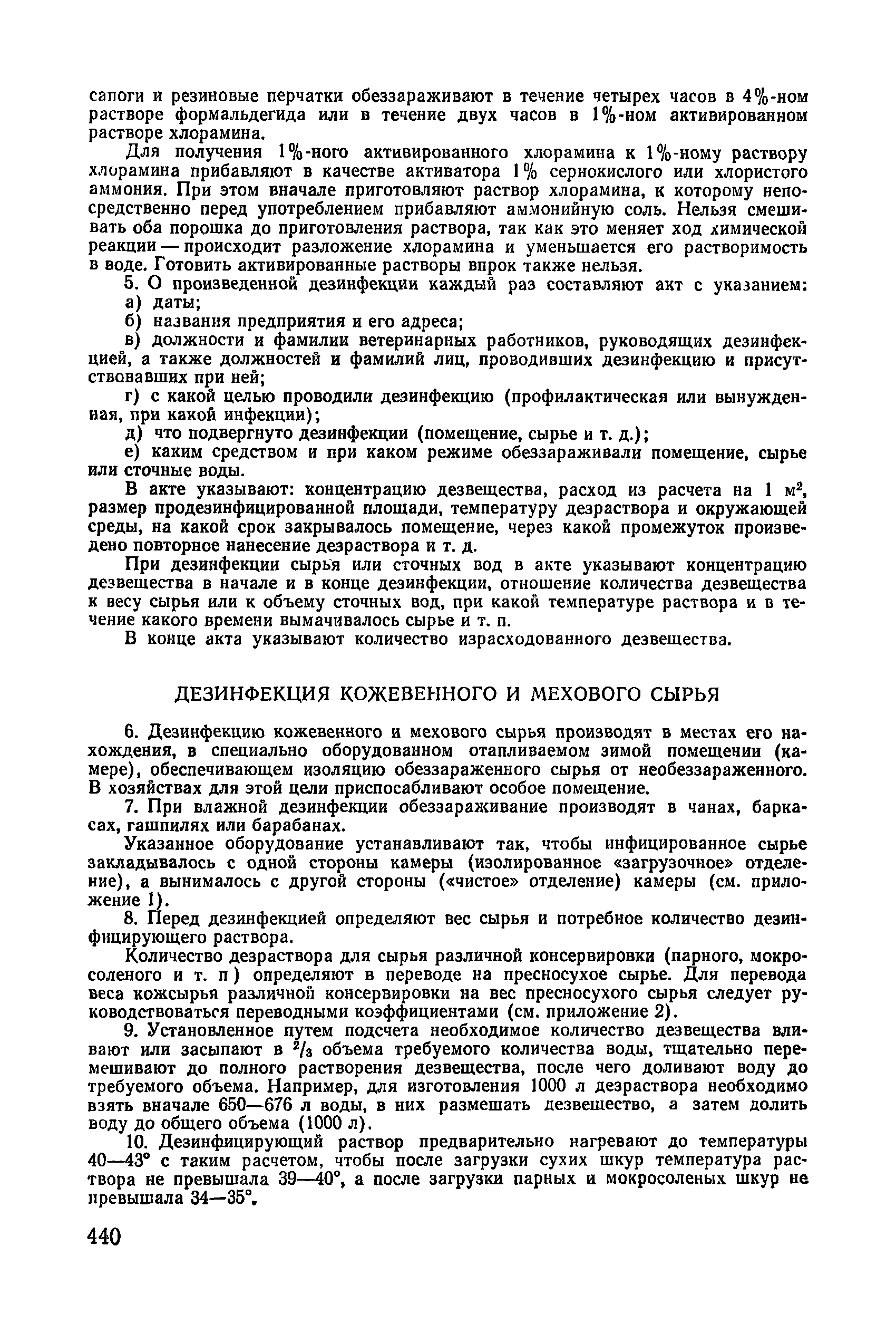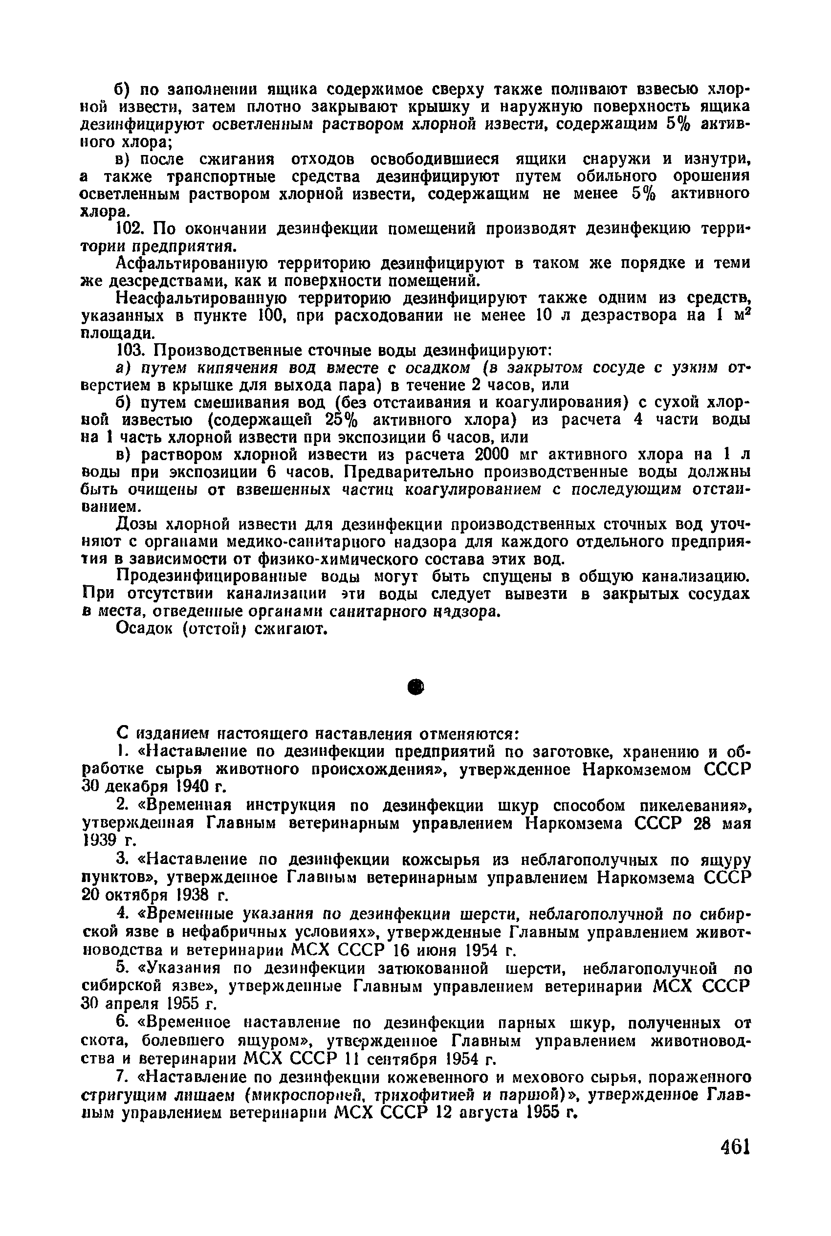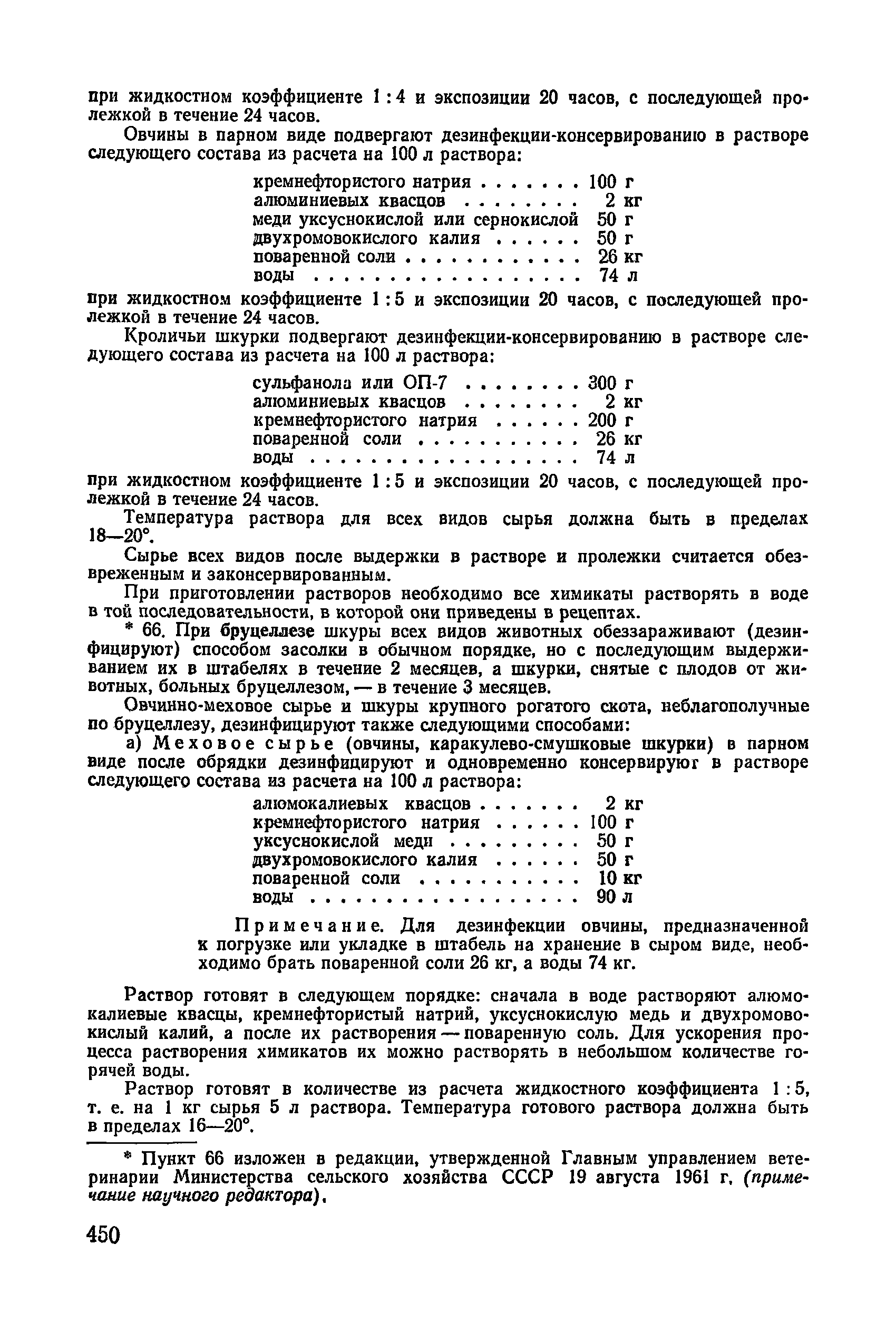 Наставление по дезинфекции сырья животного происхождения и предприятий по его заготовке, хранению и обработке| Статус: | заменен | | Название рус.: | Наставление по дезинфекции сырья животного происхождения и предприятий по его заготовке, хранению и обработке | | Дата добавления в базу: | 01.01.2021 | | Дата актуализации: | 01.01.2021 | | Оглавление: | Дезинфекция кожевенного и мехового сырья I. Дезинфекция кожевенного сырья, неблагополучного по сибирской язве А. Дезинфекция кожевенного сырья пикелеванием Порядок дезинфекции шкур пикелеванием без предварительной отмоки Порядок дезинфекции шкур пикелеванием с предварительной отмокой Б. Дезинфекция кожевенного сырья подкисленным раствором кремнефтористого натрия II. Дезинфекция мехового сырья, неблагополучного по сибирской язве Порядок дезинфекции мехового сырья пресносухой и сухосоленой консервировки Порядок дезинфекции мехового сырья квашеной консервировки III. Дезинфекция шкур при ящуре А. Дезинфекция шкур при ящуре посолом в расстил Б. Дезинфекция шкур при ящуре в дезинфекционном тузлуке IV. Дезинфекция кожевенного сырья при других заразных болезнях V. Дезинфекция пушно-мехового сырья при болезни Ауески VI. Профилактическая дезинфекция шкур, снятых с убитых бродячих собак VII. Дезинфекция шкур на утильзаводах и утильустановках Дезинфекция шерсти, щетины, волоса, пуха и пера I. Дезинфекция шерсти, щетины, волоса и козьего пуха, подозреваемых в неблагополучии по сибирской язве II. Дезинфекция шерсти, щетины, волоса, пуха и пера при заболеваниях, вызываемых неспорообразующими видами микробов III. Дезинфекция волевой и неизвестного происхождения кости IV. Дезинфекция тары V. Дезинфекция машин шерстеобрабатывающей промышленности при сибирской язве Дезинфекция помещений на предприятиях по заготовке, хранению и обработке сырья животного происхождения Приложение 1. Ветеринарно-санитарные требования к строительству камеры упрощенного типа для дезинфекции кожсырья и оборудованию этой камеры Приложение 2. Коэффициенты для перевода веса парных или консервированных шкур на вес пресносухого сырья Приложение 3. Содержание хлорводорода в соляной кислоте Приложение 4. Количество соляной кислоты, необходимое для приготовления 1000 л пикеля для обеззараживания 100 кг пресносухого сырья Приложение 5. Определение концентрации соляной кислоты в пикеле Приложение 6. Таблица по определению количества серной кислоты Приложение 7. Определение кислотности в хлебном киселе Приложение 8. Расчет необходимого количества дезвеществ для дезинфекции шкур в тузлуке (на 500 л тузлука) Приложение 9. Определение концентрации поваренной соли в тузлуке Приложение 10. Приготовление и титрование раствора формальдегида | | Утверждён: | 03.10.1958 Минсельхоз СССР (USSR Minselkhoz )