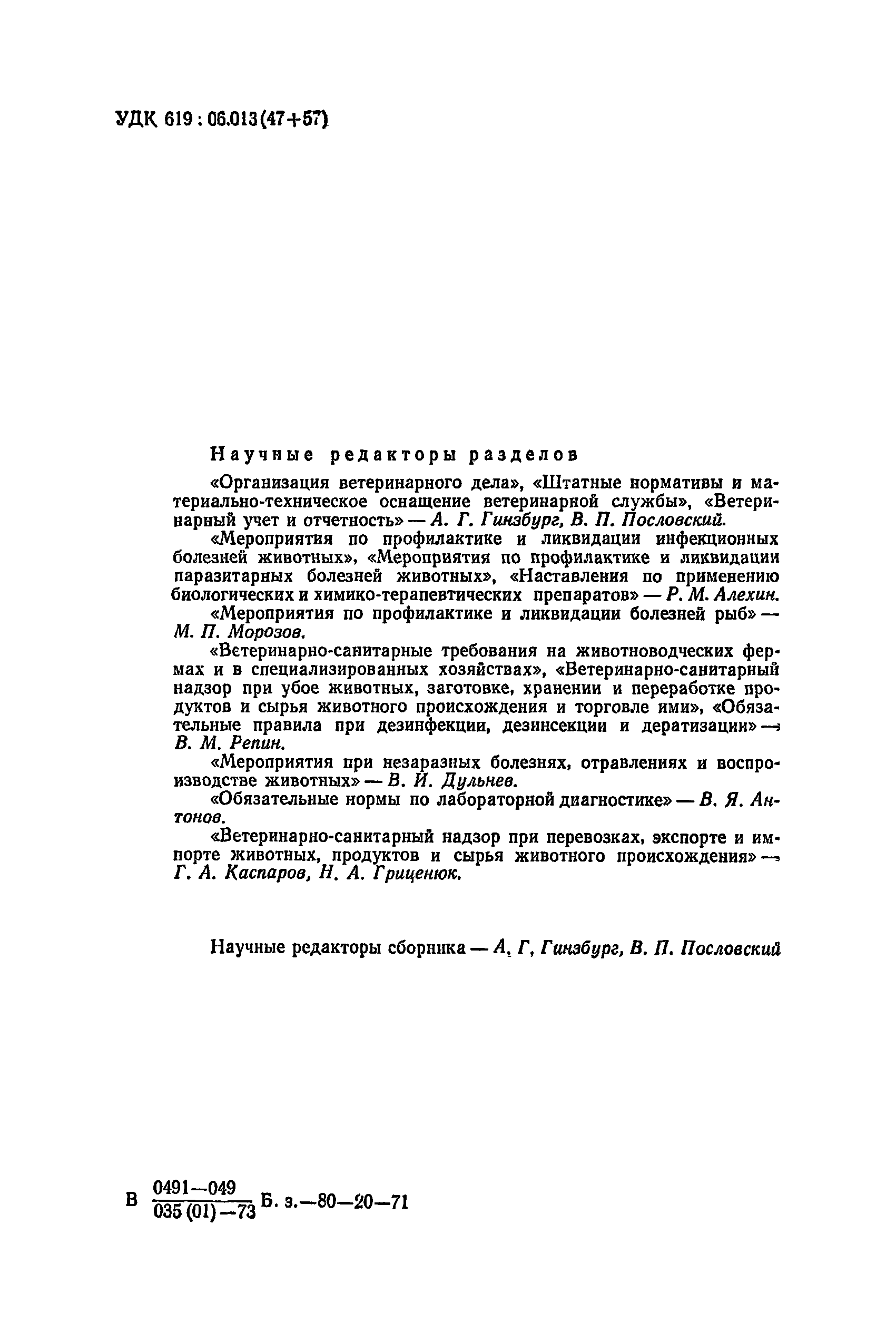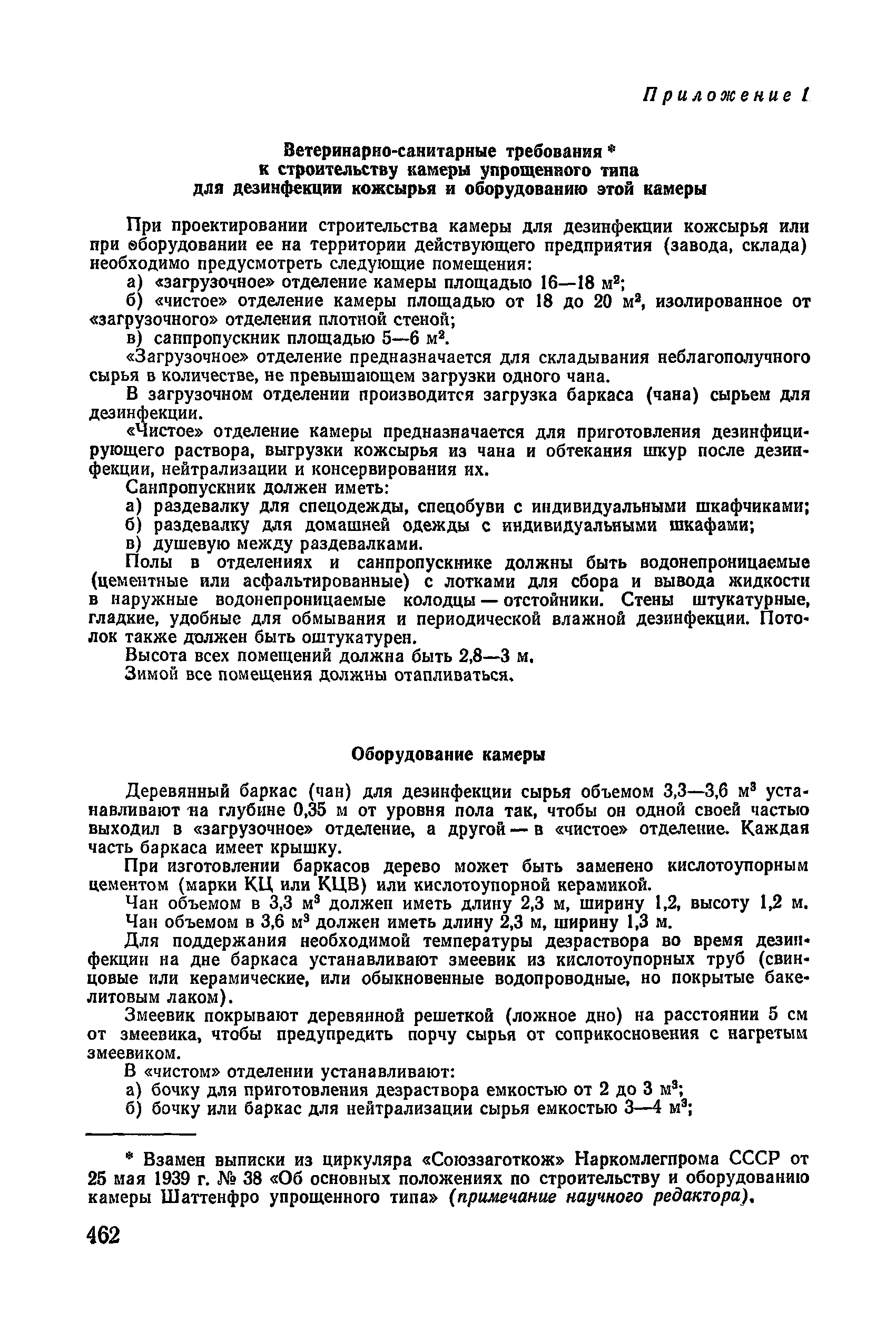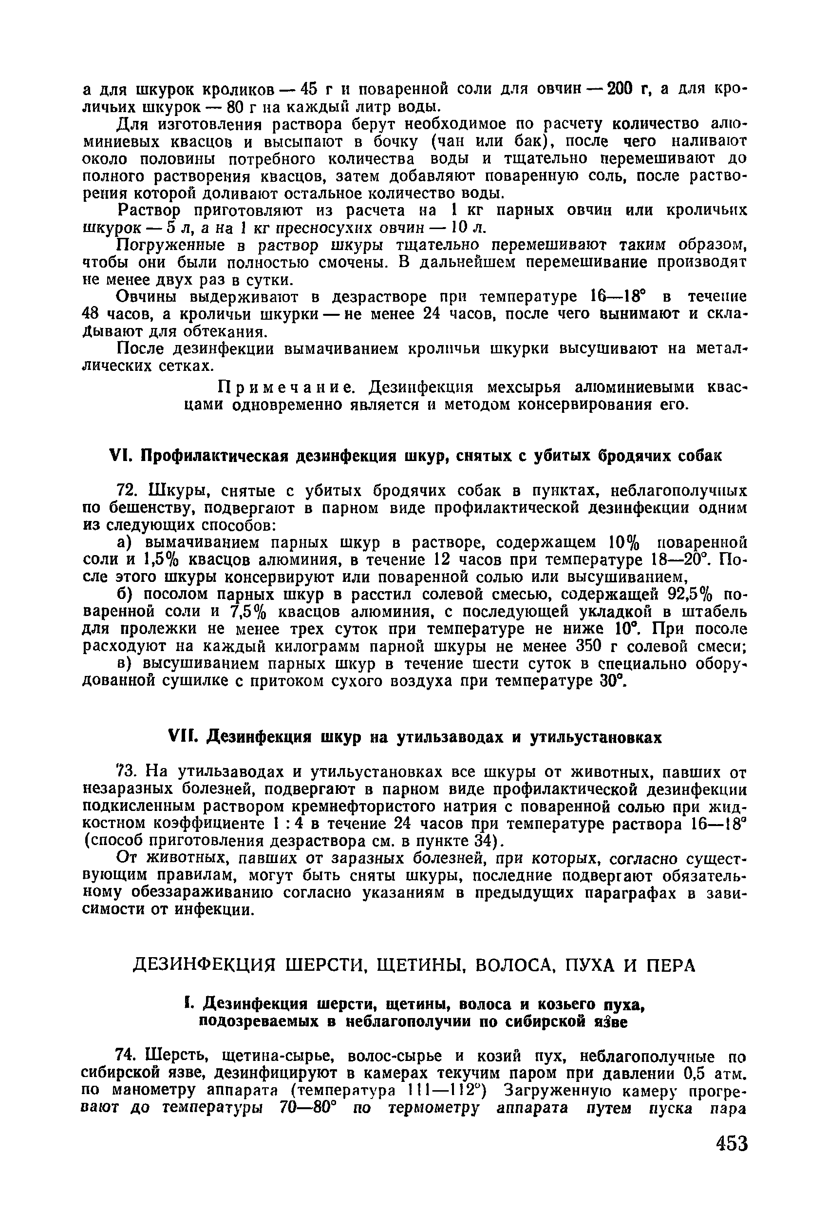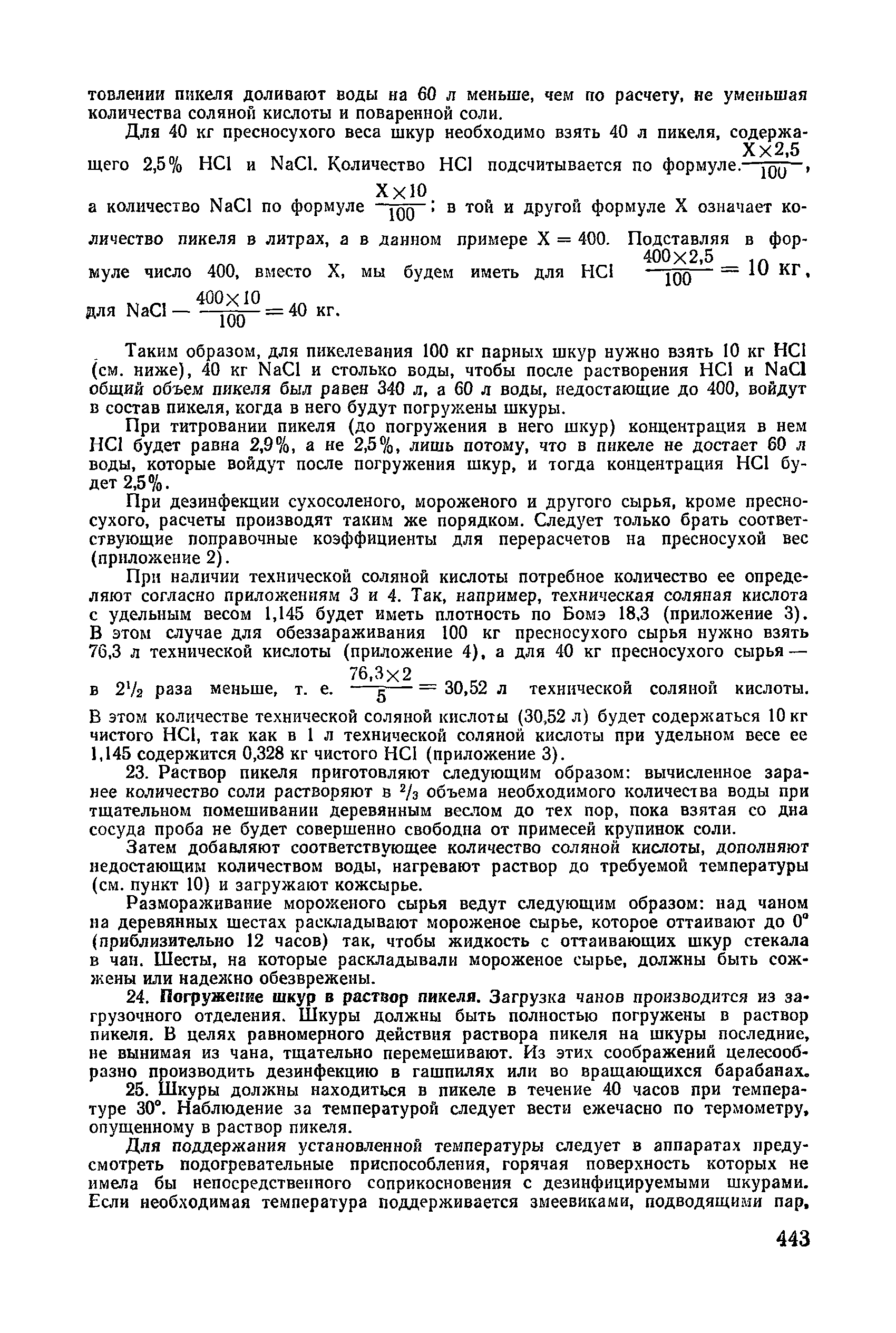 Наставление по дезинфекции сырья животного происхождения и предприятий по его заготовке, хранению и обработке| Статус: | заменен | | Название рус.: | Наставление по дезинфекции сырья животного происхождения и предприятий по его заготовке, хранению и обработке | | Дата добавления в базу: | 01.01.2021 | | Дата актуализации: | 01.01.2021 | | Оглавление: | Дезинфекция кожевенного и мехового сырья I. Дезинфекция кожевенного сырья, неблагополучного по сибирской язве А. Дезинфекция кожевенного сырья пикелеванием Порядок дезинфекции шкур пикелеванием без предварительной отмоки Порядок дезинфекции шкур пикелеванием с предварительной отмокой Б. Дезинфекция кожевенного сырья подкисленным раствором кремнефтористого натрия II. Дезинфекция мехового сырья, неблагополучного по сибирской язве Порядок дезинфекции мехового сырья пресносухой и сухосоленой консервировки Порядок дезинфекции мехового сырья квашеной консервировки III. Дезинфекция шкур при ящуре А. Дезинфекция шкур при ящуре посолом в расстил Б. Дезинфекция шкур при ящуре в дезинфекционном тузлуке IV. Дезинфекция кожевенного сырья при других заразных болезнях V. Дезинфекция пушно-мехового сырья при болезни Ауески VI. Профилактическая дезинфекция шкур, снятых с убитых бродячих собак VII. Дезинфекция шкур на утильзаводах и утильустановках Дезинфекция шерсти, щетины, волоса, пуха и пера I. Дезинфекция шерсти, щетины, волоса и козьего пуха, подозреваемых в неблагополучии по сибирской язве II. Дезинфекция шерсти, щетины, волоса, пуха и пера при заболеваниях, вызываемых неспорообразующими видами микробов III. Дезинфекция волевой и неизвестного происхождения кости IV. Дезинфекция тары V. Дезинфекция машин шерстеобрабатывающей промышленности при сибирской язве Дезинфекция помещений на предприятиях по заготовке, хранению и обработке сырья животного происхождения Приложение 1. Ветеринарно-санитарные требования к строительству камеры упрощенного типа для дезинфекции кожсырья и оборудованию этой камеры Приложение 2. Коэффициенты для перевода веса парных или консервированных шкур на вес пресносухого сырья Приложение 3. Содержание хлорводорода в соляной кислоте Приложение 4. Количество соляной кислоты, необходимое для приготовления 1000 л пикеля для обеззараживания 100 кг пресносухого сырья Приложение 5. Определение концентрации соляной кислоты в пикеле Приложение 6. Таблица по определению количества серной кислоты Приложение 7. Определение кислотности в хлебном киселе Приложение 8. Расчет необходимого количества дезвеществ для дезинфекции шкур в тузлуке (на 500 л тузлука) Приложение 9. Определение концентрации поваренной соли в тузлуке Приложение 10. Приготовление и титрование раствора формальдегида | | Утверждён: | 03.10.1958 Минсельхоз СССР (USSR Minselkhoz )