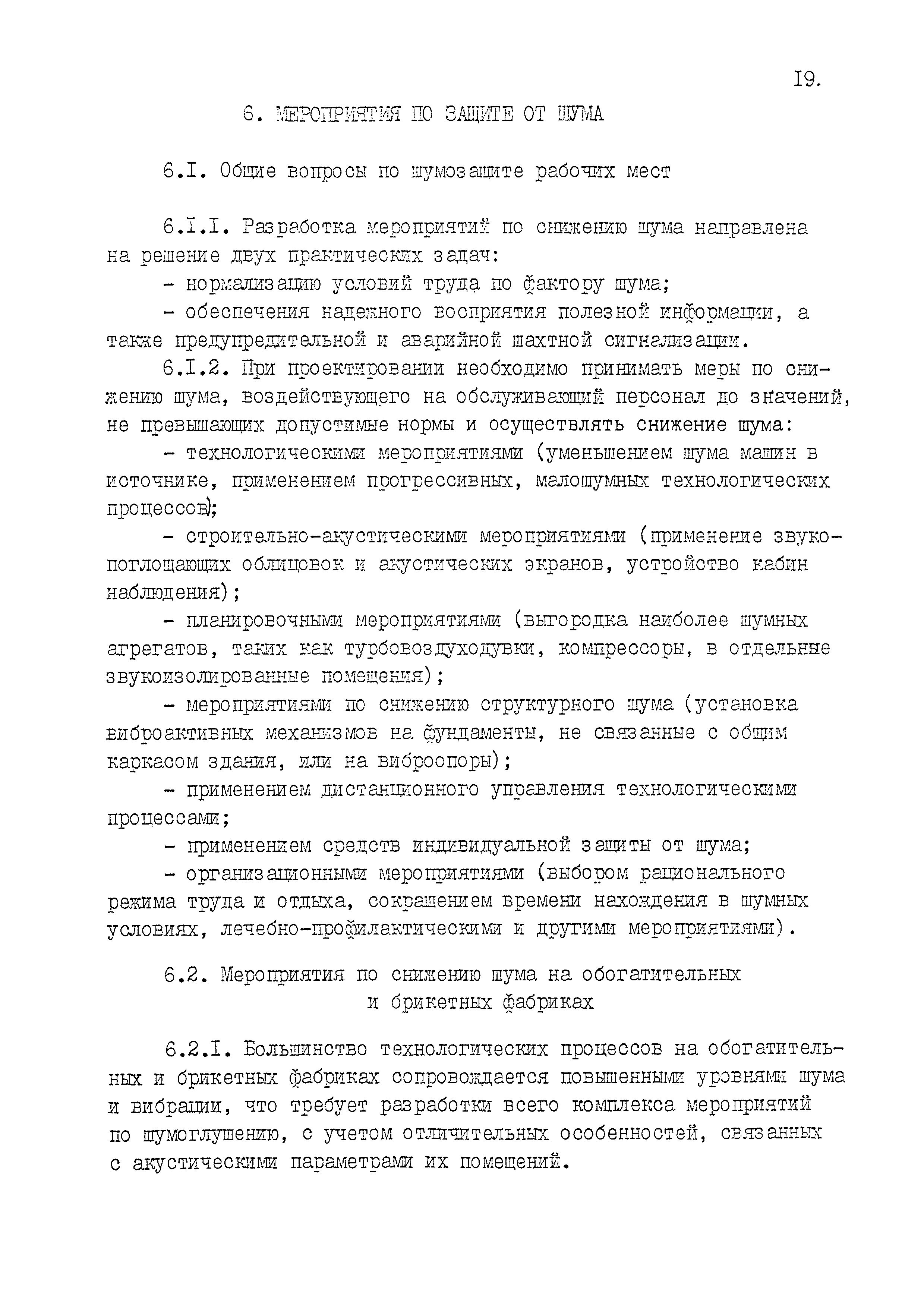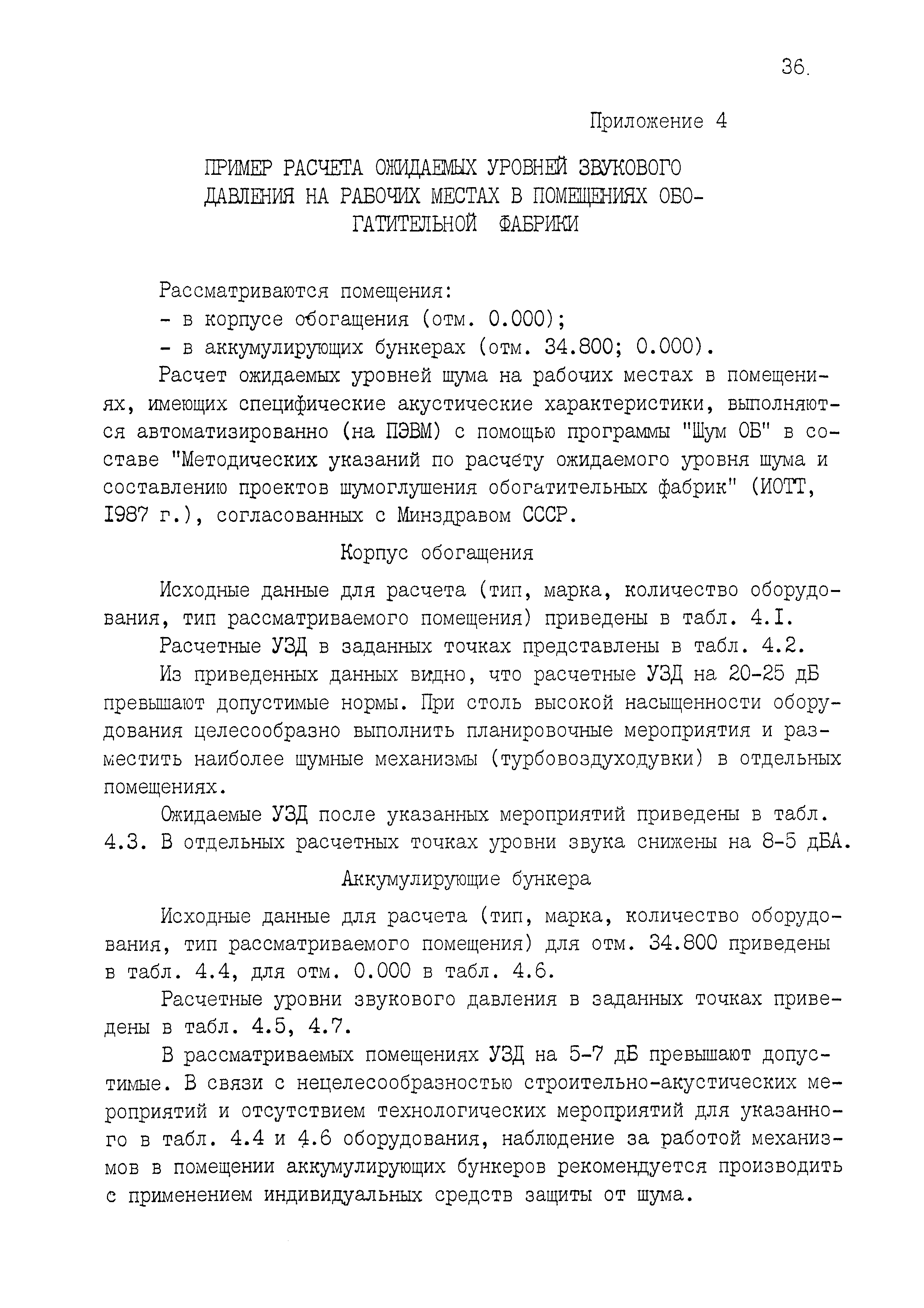 | Оглавление: | 1. Общие положения 2. Санитарно-гигиеническая оценка воздействия шума на обслуживающий персонал 3. Перечень шумовых характеристик добычного, транспортного и обогатительного оборудования 4. Указания по расчету ожидаемого уровня шума на рабочих местах в горных выработках и в помещениях поверхностного технологического комплекса 5. Указания по расчету внешнего шума и размеров санитарно-защитной зоны предприятия 6. Мероприятия по защите от шума Литература Приложение 1. База данных горно-обогатительного оборудования (Уровни звукового давления) Приложение 2. База данных горно-шахтного оборудования (Уровни звуковой мощности) Приложение 3. Эффективность звукоизолирующей кабины Приложение 4. Пример расчета ожидаемых уровней звукового давления на рабочих местах в помещениях обогатительной фабрики Приложение 5. Пример расчета ожидаемых уровней звукового давления в помещениях мастерской поверхностного комплекса угледобывающего предприятия Приложение 6. Пример расчета внешнего производственного шума предприятия. Определение размеров санитарно-защитной зоны |