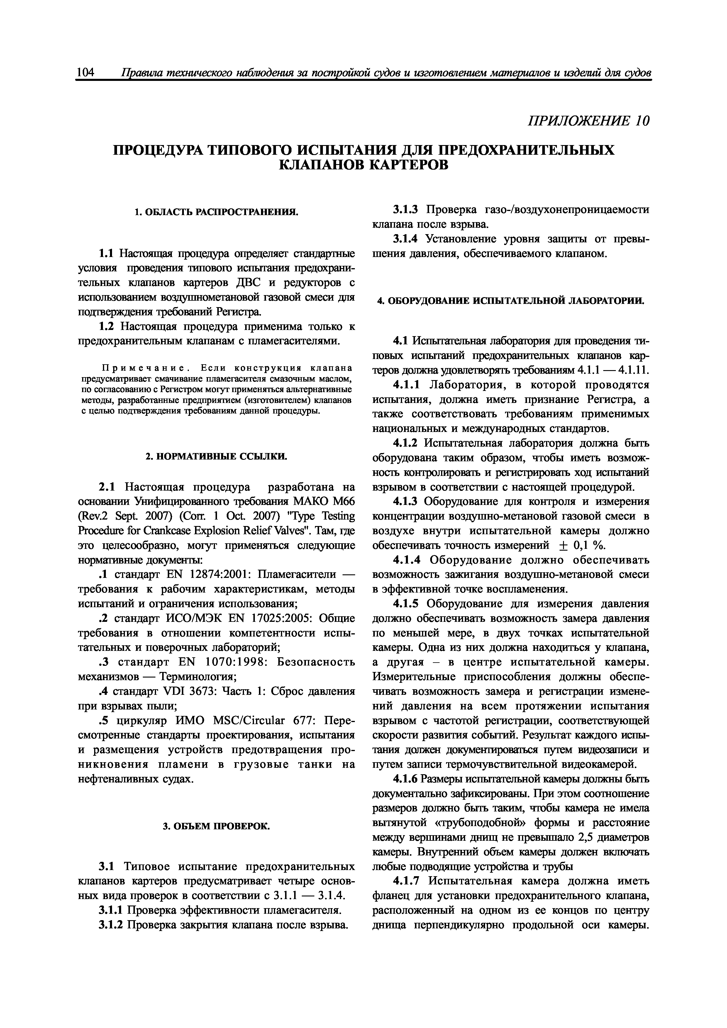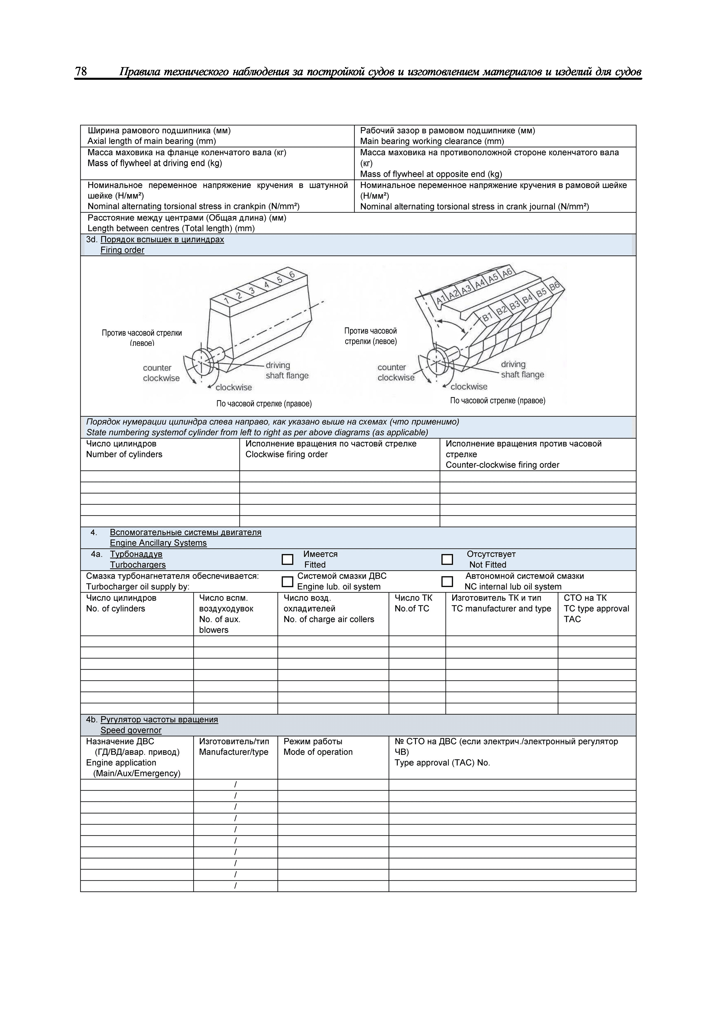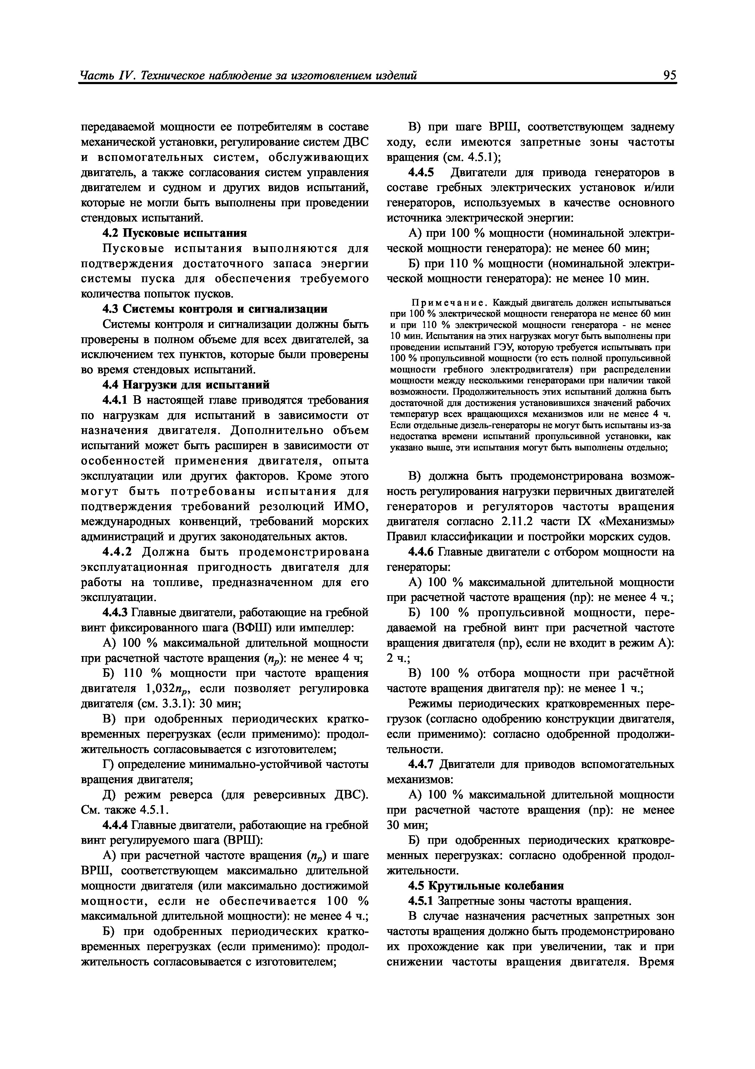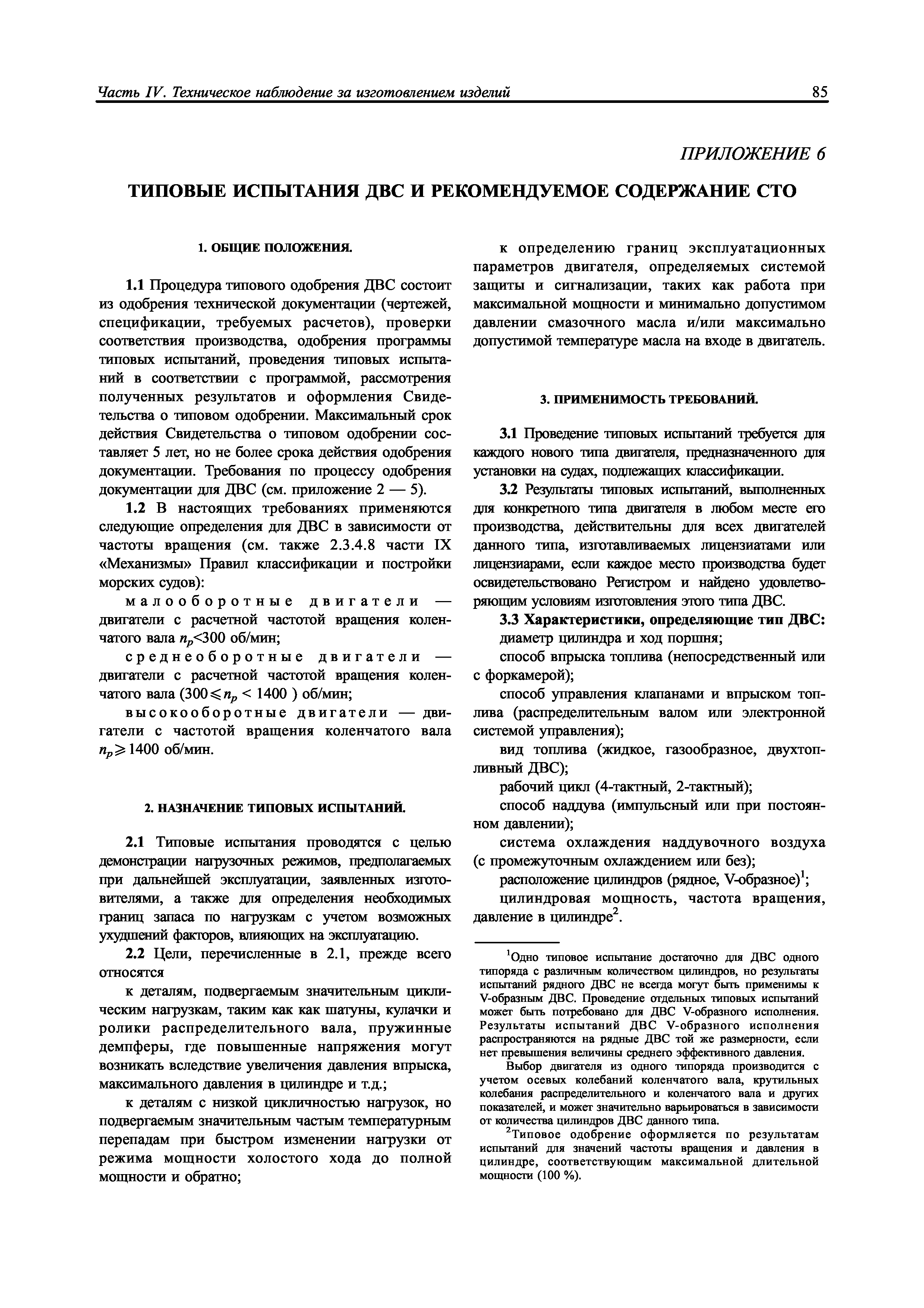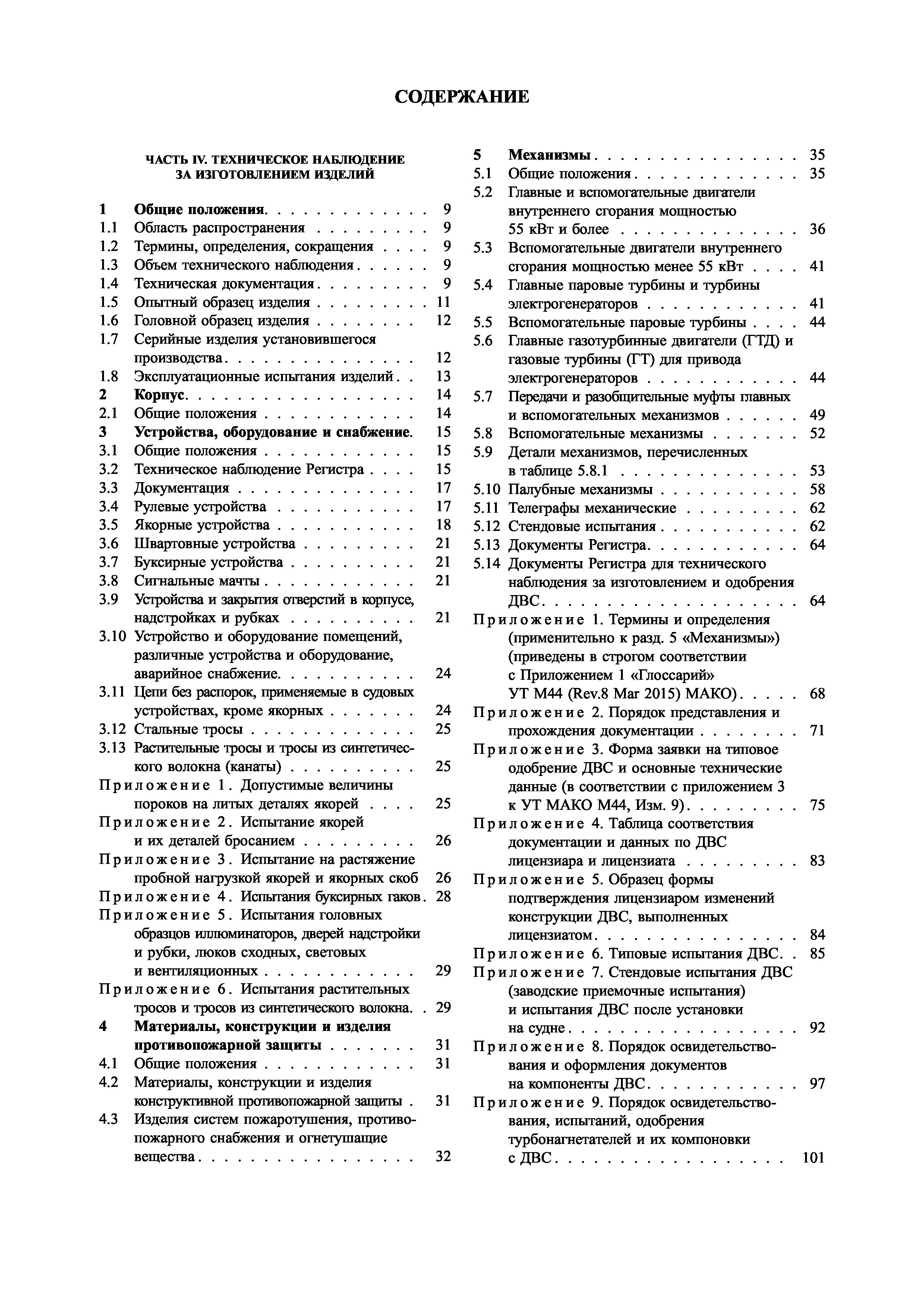 | Оглавление: | 1 Общие положения 1.1 Область распространения 1.2 Термины, определения, сокращения 1.3 Объем технического наблюдения 1.4 Техническая документация 1.5 Опытный образец изделия 1.6 Головной образец изделия 1.7 Серийные изделия установившегося производства 1.8 Эксплуатационные испытания изделий 2 Корпус 2.1 Общие положения 3 Устройства, оборудование и снабжение 3.1 Общие положения 3.2 Техническое наблюдение Регистра 3.3 Документация 3.4 Рулевые устройства 3.5 Якорные устройства 3.6 Швартовные устройства 3.7 Буксирные устройства 3.8 Сигнальные мачты 3.9 Устройства и закрытия отверстий в корпусе, надстройках и рубках 3.10 Устройство и оборудование помещений, различные устройства и оборудование, аварийное снабжение 3.11 Цепи без распорок, применяемые в судовых устройствах, кроме якорных 3.12 Стальные тросы 3.13 Растительные тросы и тросы из синтетического волокна (канаты) Приложение 1. Допустимые величины пороков на литых деталях якорей Приложение 2. Испытание якорей и их деталей бросанием Приложение 3. Испытание на растяжение пробной нагрузкой якорей и якорных скоб Приложение 4. Испытания буксирных гаков Приложение 5. Испытания головных образцов иллюминаторов, дверей надстройки и рубки, люков сходных, световых и вентиляционных Приложение 6. Испытания растительных тросов и тросов из синтетического волокна 4 Материалы, конструкции и изделия противопожарной защиты 4.1 Общие положения 4.2 Материалы, конструкции и изделия конструктивной противопожарной защиты 4.3 Изделия систем пожаротушения, противопожарного снабжения и огнетушащие вещества 5 Механизмы 5.1 Общие положения 5.2 Главные и вспомогательные двигатели внутреннего сгорания мощностью 55 кВт и более 5.3 Вспомогательные двигатели внутреннего сгорания мощностью менее 55 кВт 5.4 Главные паровые турбины и турбины электрогенераторов 5.5 Вспомогательные паровые турбины 5.6 Главные газотурбинные двигатели (ГТД) и газовые турбины (ГТ) для привода электрогенераторов 5.7 Передачи и разобщительные муфты главных и вспомогательных механизмов 5.8 Вспомогательные механизмы 5.9 Детали механизмов, перечисленных в таблице 5.8.1 5.10 Палубные механизмы 5.11 Телеграфы механические 5.12 Стендовые испытания 5.13 Документы Регистра 5.14 Документы Регистра для технического наблюдения за изготовлением и одобрения ДВС Приложение 1.Термины и определения (применительно к разд. 5 "Механизмы") (приведены в строгом соответствии с Приложением 1 "Глоссарий" УТ М44 (Rev.8 Mar 2015) МАКО) Приложение 2. Порядок представления и прохождения документации Приложение 3. Форма заявки на типовое одобрение ДВС и основные технические данные (в соответствии с приложением 3 к УТ МАКО М44, изм. 9) Приложение 4. Таблица соответствия документации и данных по ДВС лицензиара и лицензиата Приложение 5. Образец формы подтверждения лицензиаром изменений конструкции ДВС, выполненных лицензиатом Приложение 6. Типовые испытания ДВС Приложение 7. Стендовые испытания ДВС (заводские приемочные испытания) и испытания ДВС после установки на судне Приложение 8. Порядок освидетельствования и оформления документов на компоненты ДВС Приложение 9. Порядок освидетельствования, испытаний, одобрения турбонагнетателей и их компоновки с ДВС Приложение 10. Процедура типового испытания для предохранительных клапанов картеров Приложение 11. Процедура типовых испытаний приборов обнар