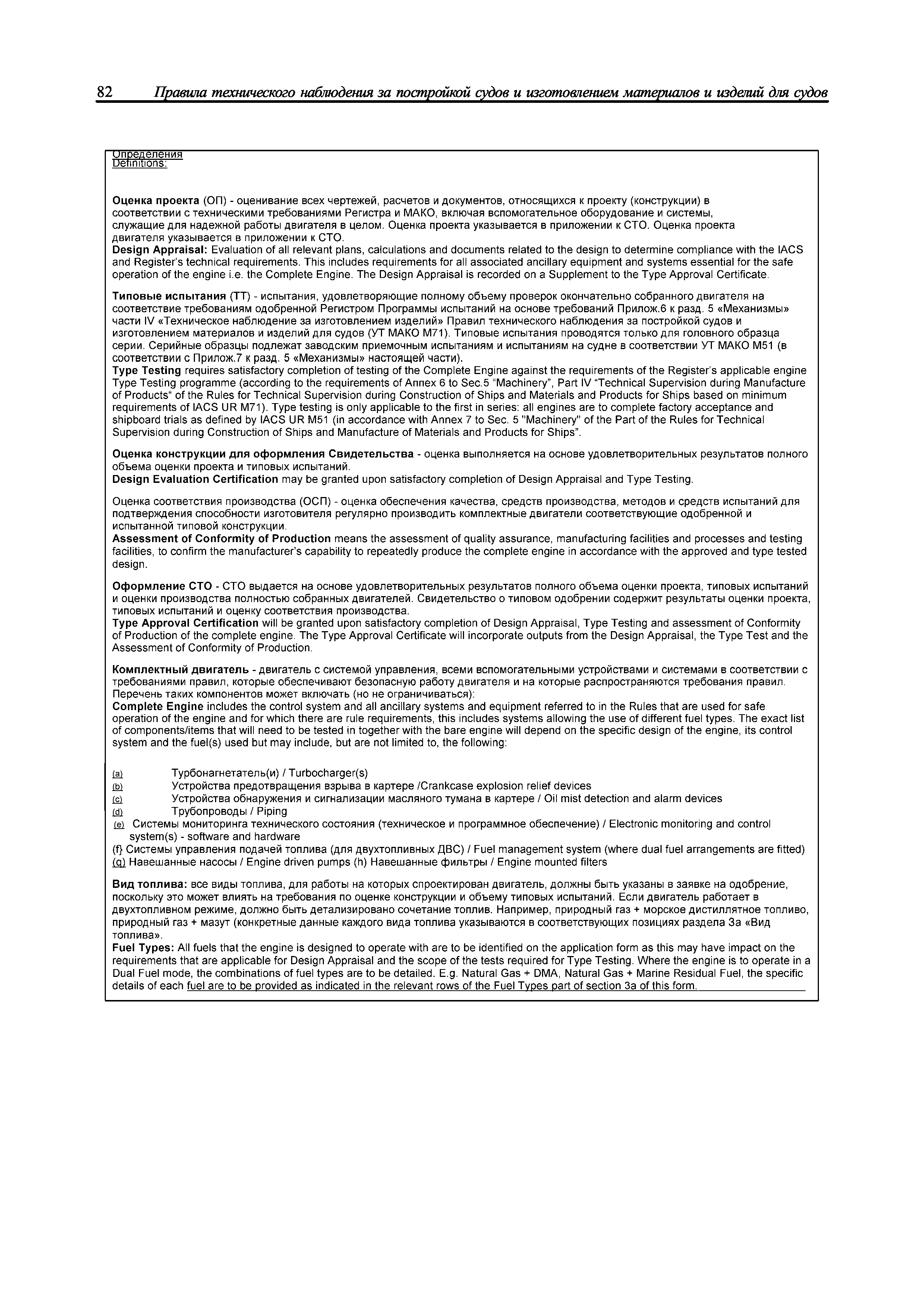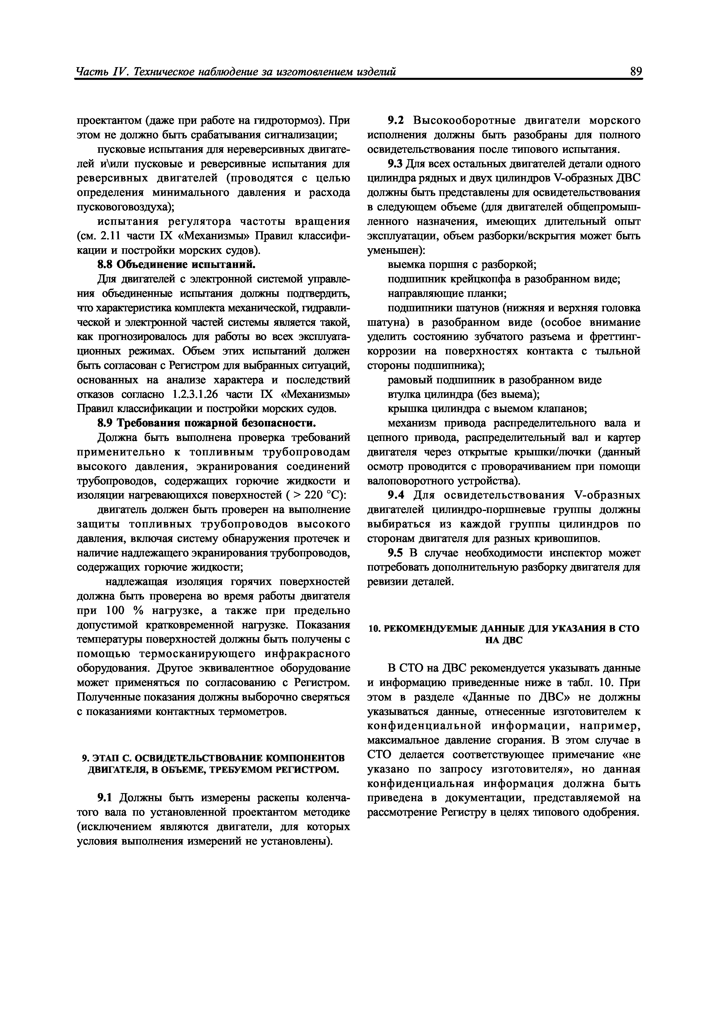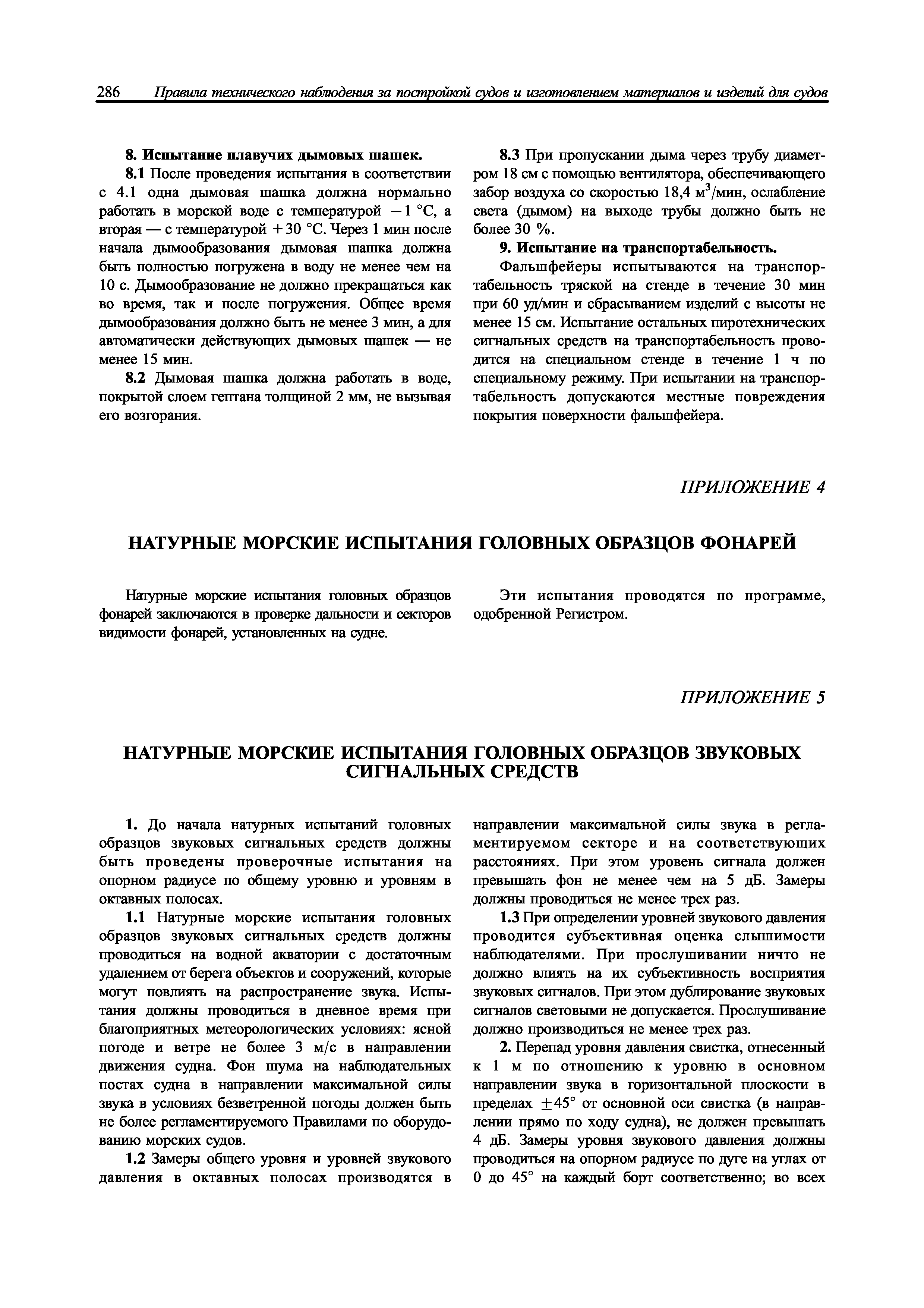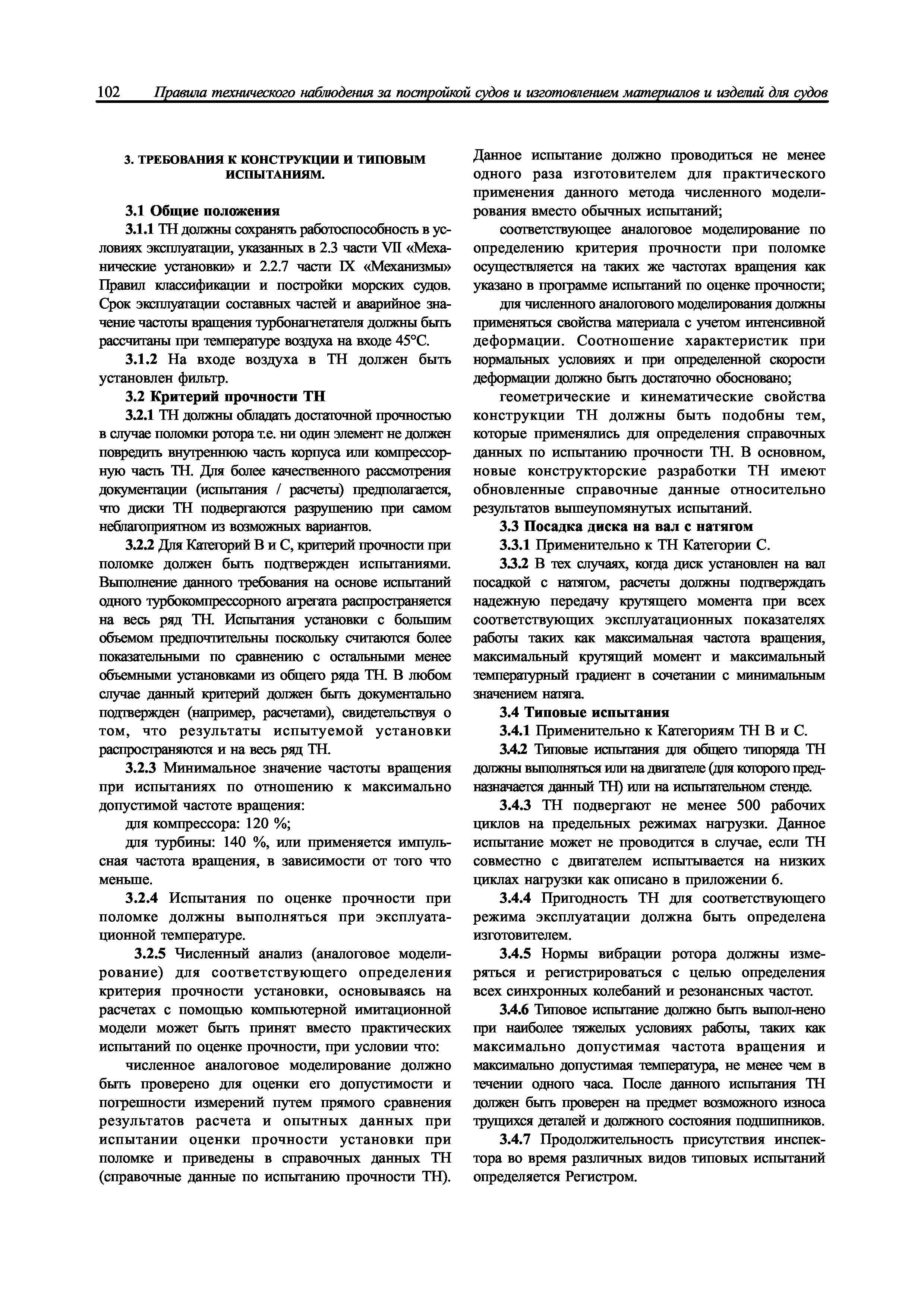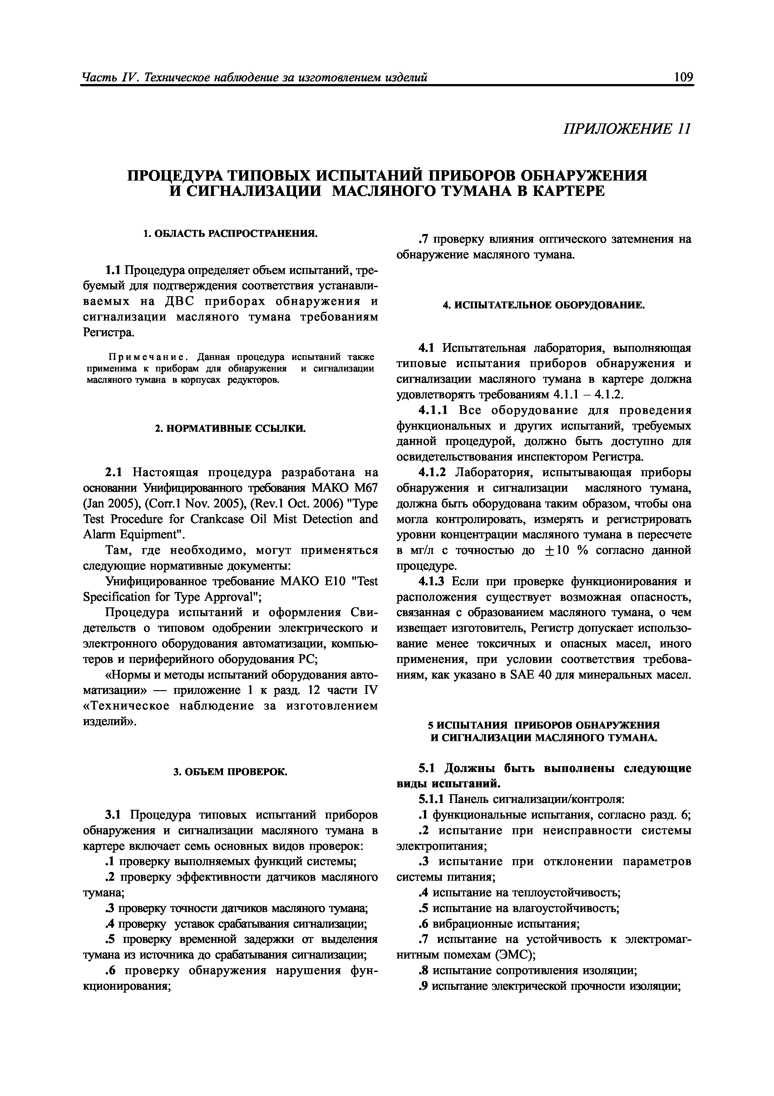 | Оглавление: | 1 Общие положения 1.1 Область распространения 1.2 Термины, определения, сокращения 1.3 Объем технического наблюдения 1.4 Техническая документация 1.5 Опытный образец изделия 1.6 Головной образец изделия 1.7 Серийные изделия установившегося производства 1.8 Эксплуатационные испытания изделий 2 Корпус 2.1 Общие положения 3 Устройства, оборудование и снабжение 3.1 Общие положения 3.2 Техническое наблюдение Регистра 3.3 Документация 3.4 Рулевые устройства 3.5 Якорные устройства 3.6 Швартовные устройства 3.7 Буксирные устройства 3.8 Сигнальные мачты 3.9 Устройства и закрытия отверстий в корпусе, надстройках и рубках 3.10 Устройство и оборудование помещений, различные устройства и оборудование, аварийное снабжение 3.11 Цепи без распорок, применяемые в судовых устройствах, кроме якорных 3.12 Стальные тросы 3.13 Растительные тросы и тросы из синтетического волокна (канаты) Приложение 1. Допустимые величины пороков на литых деталях якорей Приложение 2. Испытание якорей и их деталей бросанием Приложение 3. Испытание на растяжение пробной нагрузкой якорей и якорных скоб Приложение 4. Испытания буксирных гаков Приложение 5. Испытания головных образцов иллюминаторов, дверей надстройки и рубки, люков сходных, световых и вентиляционных Приложение 6. Испытания растительных тросов и тросов из синтетического волокна 4 Материалы, конструкции и изделия противопожарной защиты 4.1 Общие положения 4.2 Материалы, конструкции и изделия конструктивной противопожарной защиты 4.3 Изделия систем пожаротушения, противопожарного снабжения и огнетушащие вещества 5 Механизмы 5.1 Общие положения 5.2 Главные и вспомогательные двигатели внутреннего сгорания мощностью 55 кВт и более 5.3 Вспомогательные двигатели внутреннего сгорания мощностью менее 55 кВт 5.4 Главные паровые турбины и турбины электрогенераторов 5.5 Вспомогательные паровые турбины 5.6 Главные газотурбинные двигатели (ГТД) и газовые турбины (ГТ) для привода электрогенераторов 5.7 Передачи и разобщительные муфты главных и вспомогательных механизмов 5.8 Вспомогательные механизмы 5.9 Детали механизмов, перечисленных в таблице 5.8.1 5.10 Палубные механизмы 5.11 Телеграфы механические 5.12 Стендовые испытания 5.13 Документы Регистра 5.14 Документы Регистра для технического наблюдения за изготовлением и одобрения ДВС Приложение 1.Термины и определения (применительно к разд. 5 "Механизмы") (приведены в строгом соответствии с Приложением 1 "Глоссарий" УТ М44 (Rev.8 Mar 2015) МАКО) Приложение 2. Порядок представления и прохождения документации Приложение 3. Форма заявки на типовое одобрение ДВС и основные технические данные (в соответствии с приложением 3 к УТ МАКО М44, изм. 9) Приложение 4. Таблица соответствия документации и данных по ДВС лицензиара и лицензиата Приложение 5. Образец формы подтверждения лицензиаром изменений конструкции ДВС, выполненных лицензиатом Приложение 6. Типовые испытания ДВС Приложение 7. Стендовые испытания ДВС (заводские приемочные испытания) и испытания ДВС после установки на судне Приложение 8. Порядок освидетельствования и оформления документов на компоненты ДВС Приложение 9. Порядок освидетельствования, испытаний, одобрения турбонагнетателей и их компоновки с ДВС Приложение 10. Процедура типового испытания для предохранительных клапанов картеров Приложение 11. Процедура типовых испытаний приборов обнар
