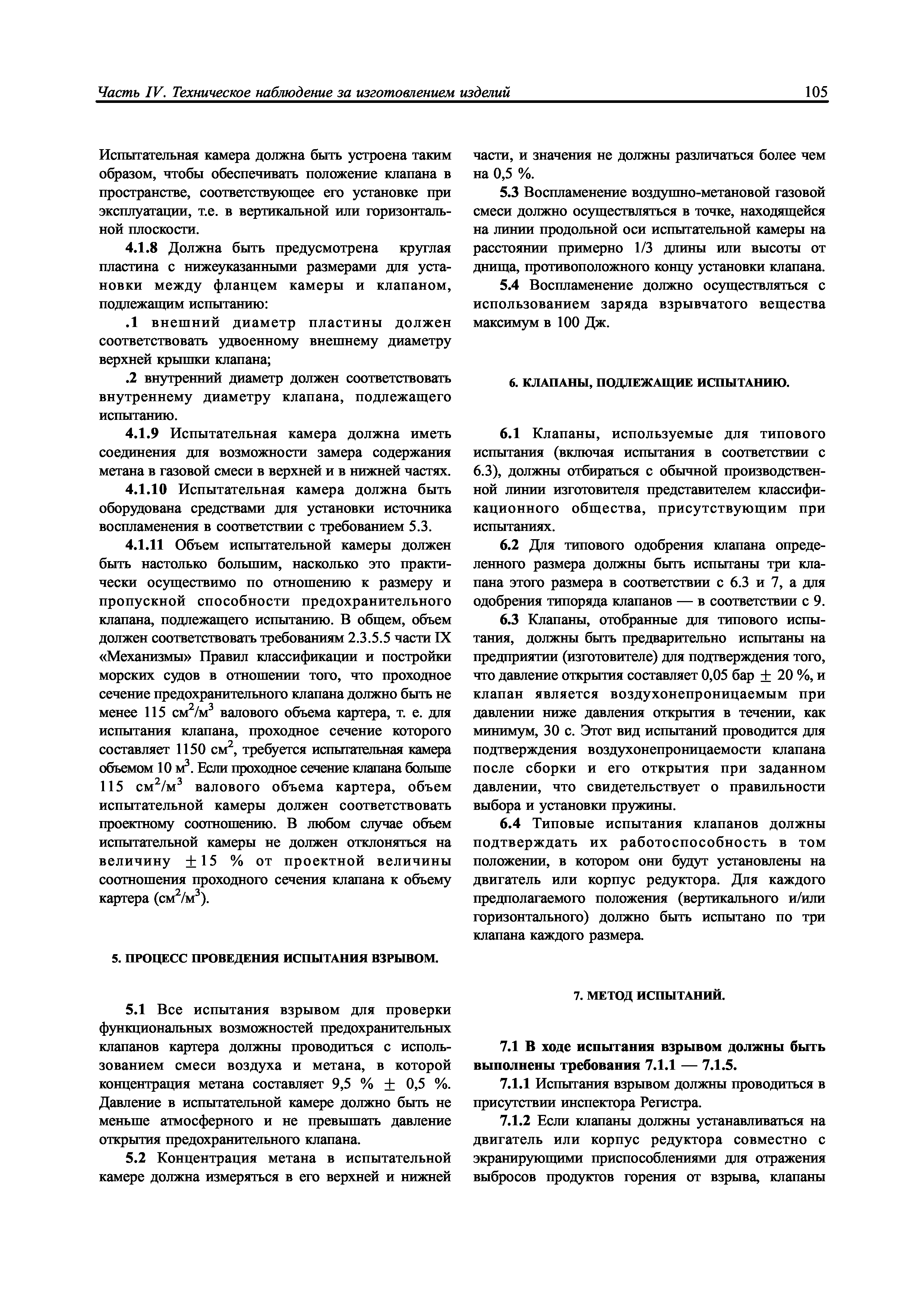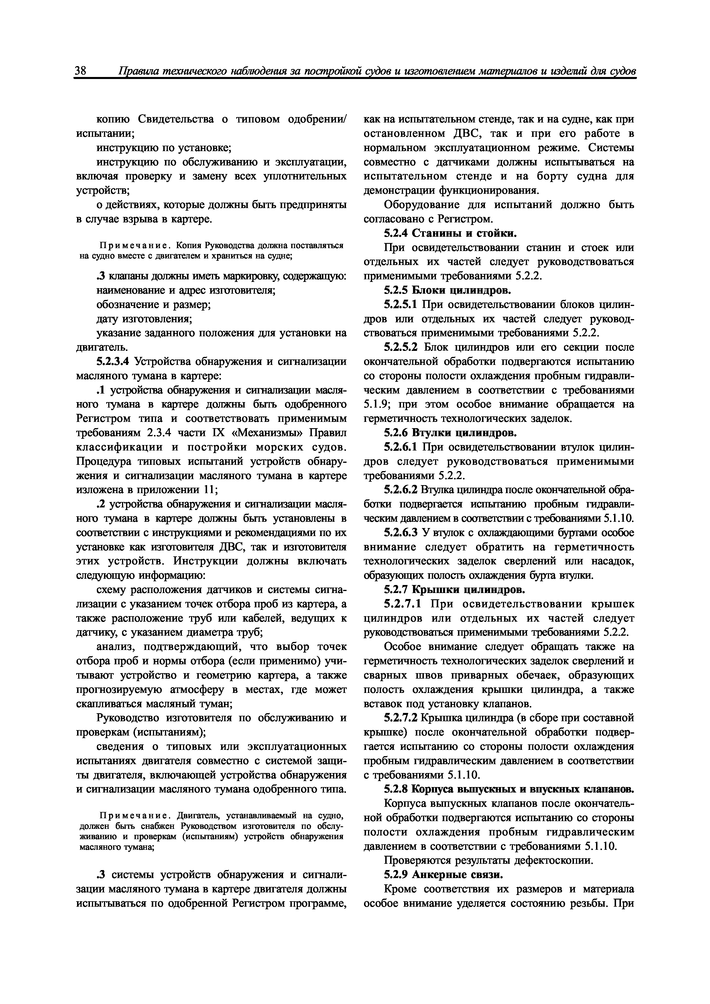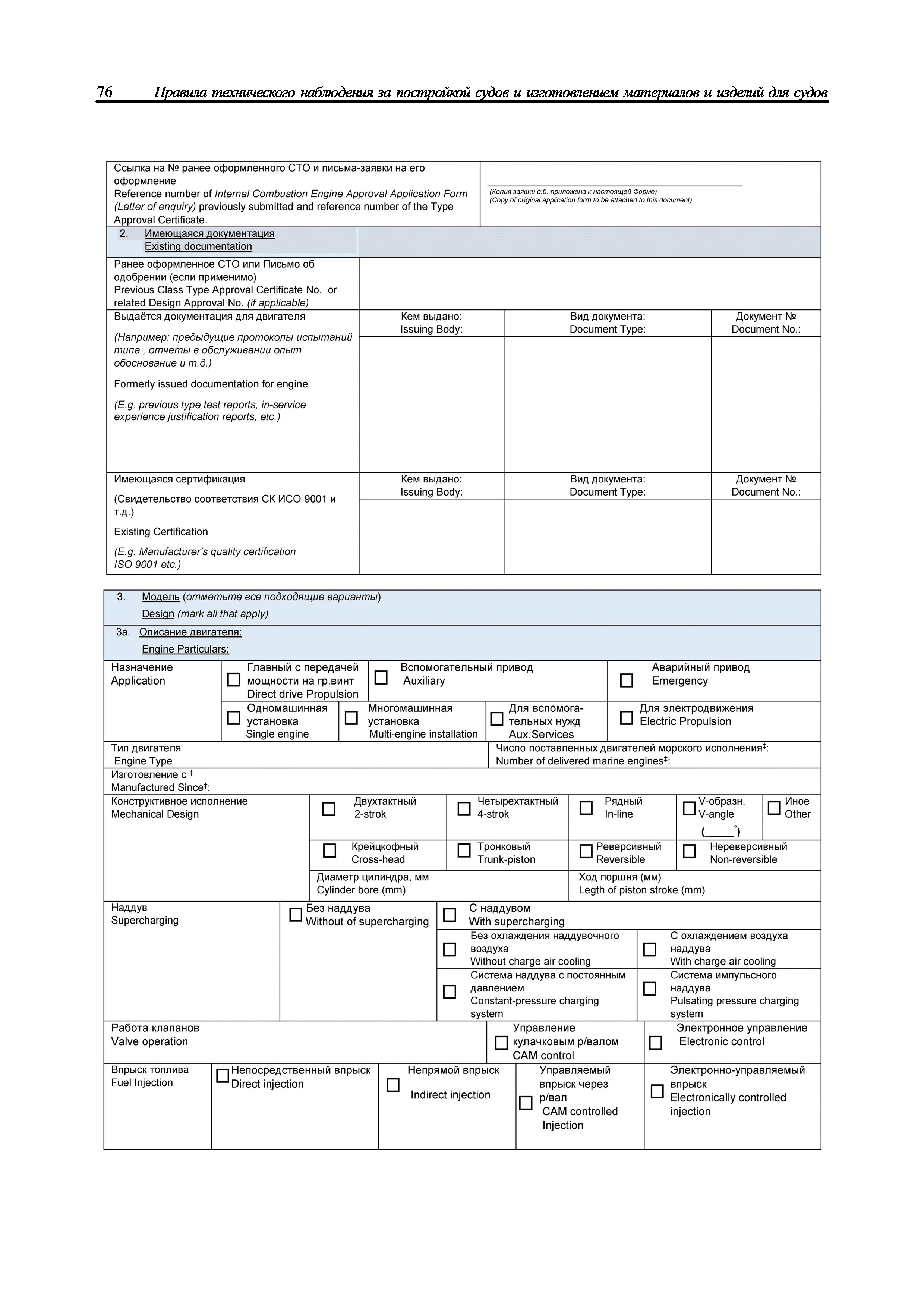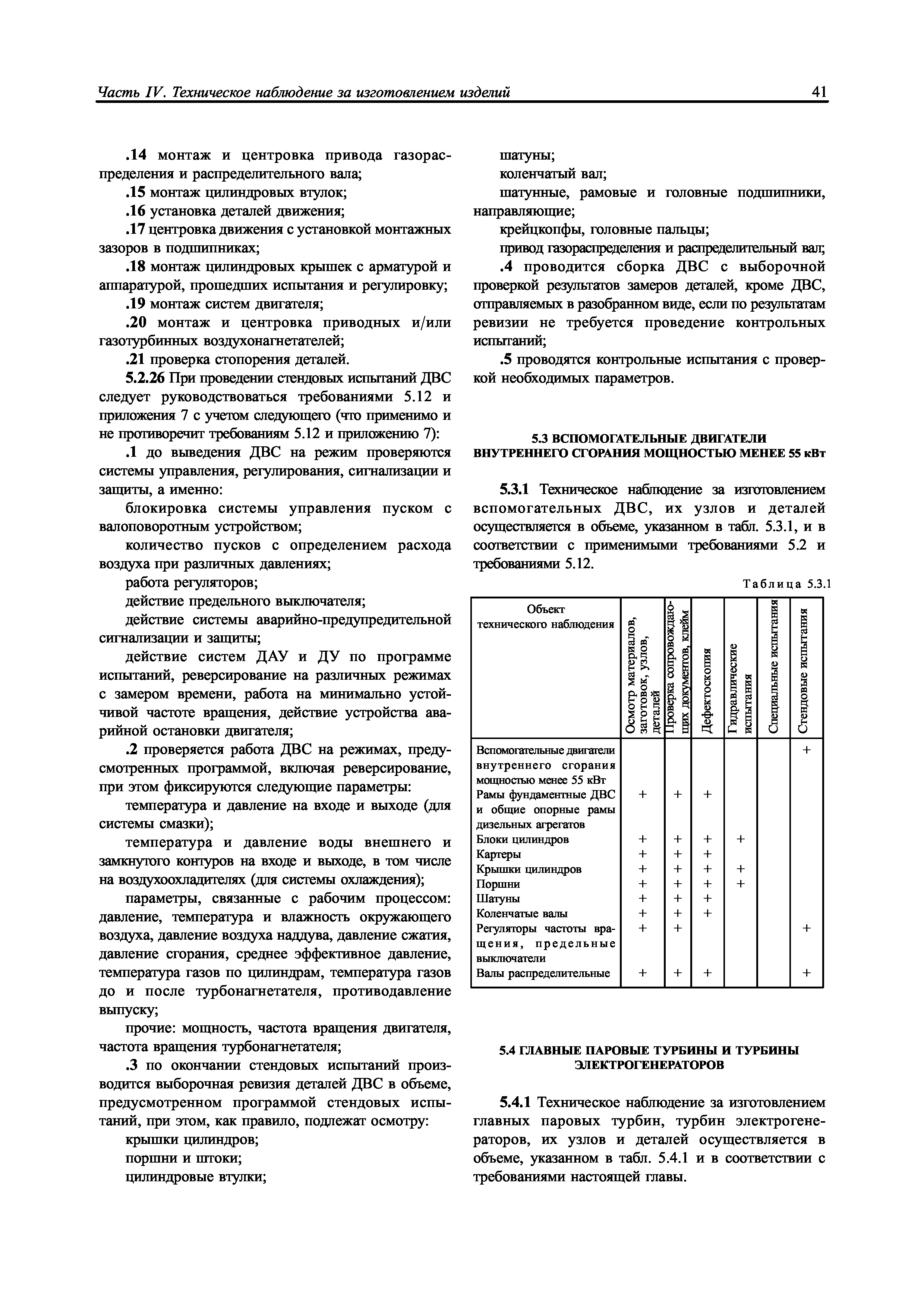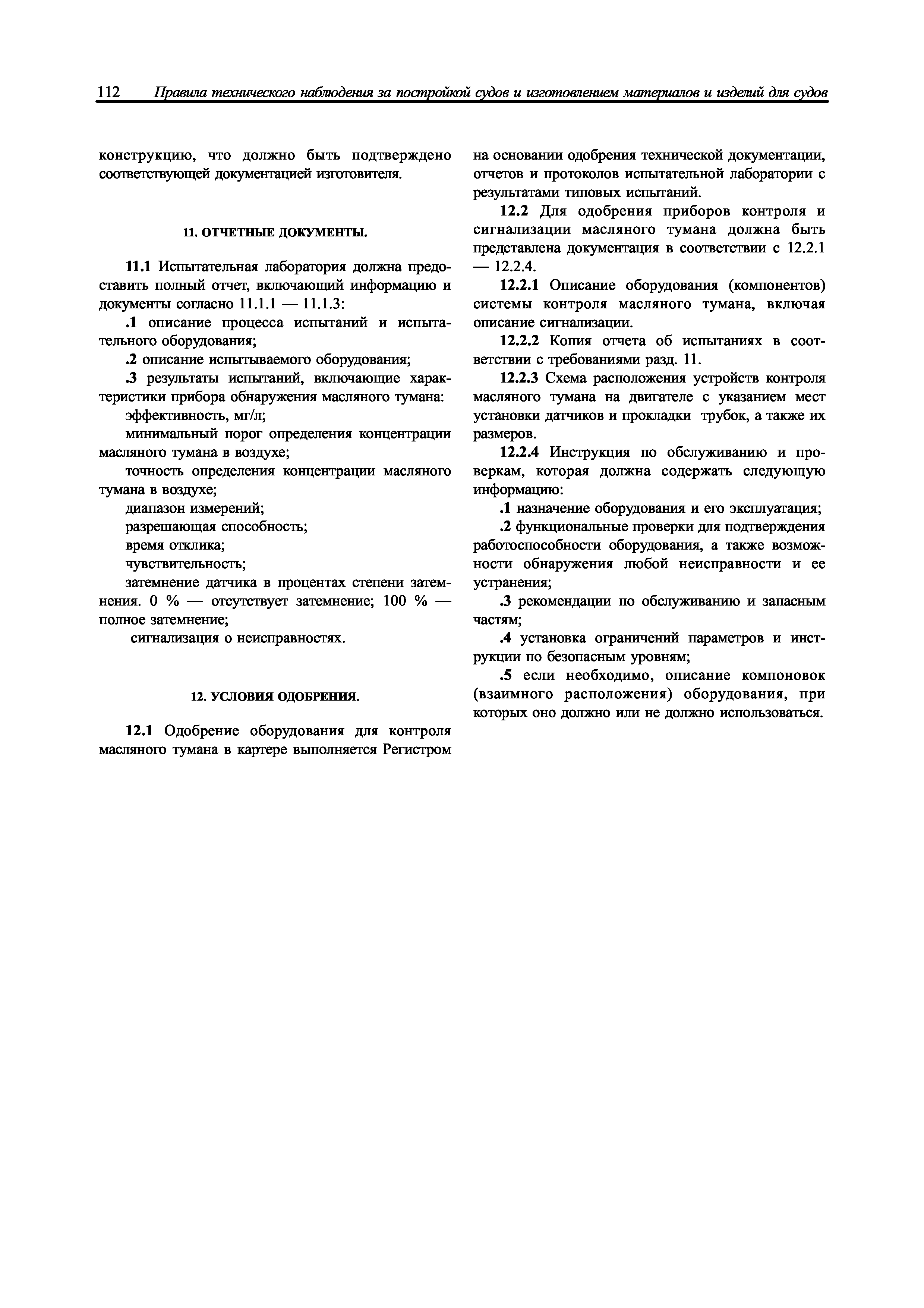| Оглавление: | 1 Общие положения 1.1 Область распространения 1.2 Термины, определения, сокращения 1.3 Объем технического наблюдения 1.4 Техническая документация 1.5 Опытный образец изделия 1.6 Головной образец изделия 1.7 Серийные изделия установившегося производства 1.8 Эксплуатационные испытания изделий 2 Корпус 2.1 Общие положения 3 Устройства, оборудование и снабжение 3.1 Общие положения 3.2 Техническое наблюдение Регистра 3.3 Документация 3.4 Рулевые устройства 3.5 Якорные устройства 3.6 Швартовные устройства 3.7 Буксирные устройства 3.8 Сигнальные мачты 3.9 Устройства и закрытия отверстий в корпусе, надстройках и рубках 3.10 Устройство и оборудование помещений, различные устройства и оборудование, аварийное снабжение 3.11 Цепи без распорок, применяемые в судовых устройствах, кроме якорных 3.12 Стальные тросы 3.13 Растительные тросы и тросы из синтетического волокна (канаты) Приложение 1. Допустимые величины пороков на литых деталях якорей Приложение 2. Испытание якорей и их деталей бросанием Приложение 3. Испытание на растяжение пробной нагрузкой якорей и якорных скоб Приложение 4. Испытания буксирных гаков Приложение 5. Испытания головных образцов иллюминаторов, дверей надстройки и рубки, люков сходных, световых и вентиляционных Приложение 6. Испытания растительных тросов и тросов из синтетического волокна 4 Материалы, конструкции и изделия противопожарной защиты 4.1 Общие положения 4.2 Материалы, конструкции и изделия конструктивной противопожарной защиты 4.3 Изделия систем пожаротушения, противопожарного снабжения и огнетушащие вещества 5 Механизмы 5.1 Общие положения 5.2 Главные и вспомогательные двигатели внутреннего сгорания мощностью 55 кВт и более 5.3 Вспомогательные двигатели внутреннего сгорания мощностью менее 55 кВт 5.4 Главные паровые турбины и турбины электрогенераторов 5.5 Вспомогательные паровые турбины 5.6 Главные газотурбинные двигатели (ГТД) и газовые турбины (ГТ) для привода электрогенераторов 5.7 Передачи и разобщительные муфты главных и вспомогательных механизмов 5.8 Вспомогательные механизмы 5.9 Детали механизмов, перечисленных в таблице 5.8.1 5.10 Палубные механизмы 5.11 Телеграфы механические 5.12 Стендовые испытания 5.13 Документы Регистра 5.14 Документы Регистра для технического наблюдения за изготовлением и одобрения ДВС Приложение 1.Термины и определения (применительно к разд. 5 "Механизмы") (приведены в строгом соответствии с Приложением 1 "Глоссарий" УТ М44 (Rev.8 Mar 2015) МАКО) Приложение 2. Порядок представления и прохождения документации Приложение 3. Форма заявки на типовое одобрение ДВС и основные технические данные (в соответствии с приложением 3 к УТ МАКО М44, изм. 9) Приложение 4. Таблица соответствия документации и данных по ДВС лицензиара и лицензиата Приложение 5. Образец формы подтверждения лицензиаром изменений конструкции ДВС, выполненных лицензиатом Приложение 6. Типовые испытания ДВС Приложение 7. Стендовые испытания ДВС (заводские приемочные испытания) и испытания ДВС после установки на судне Приложение 8. Порядок освидетельствования и оформления документов на компоненты ДВС Приложение 9. Порядок освидетельствования, испытаний, одобрения турбонагнетателей и их компоновки с ДВС Приложение 10. Процедура типового испытания для предохранительных клапанов картеров Приложение 11. Процедура типовых испытаний приборов обнар