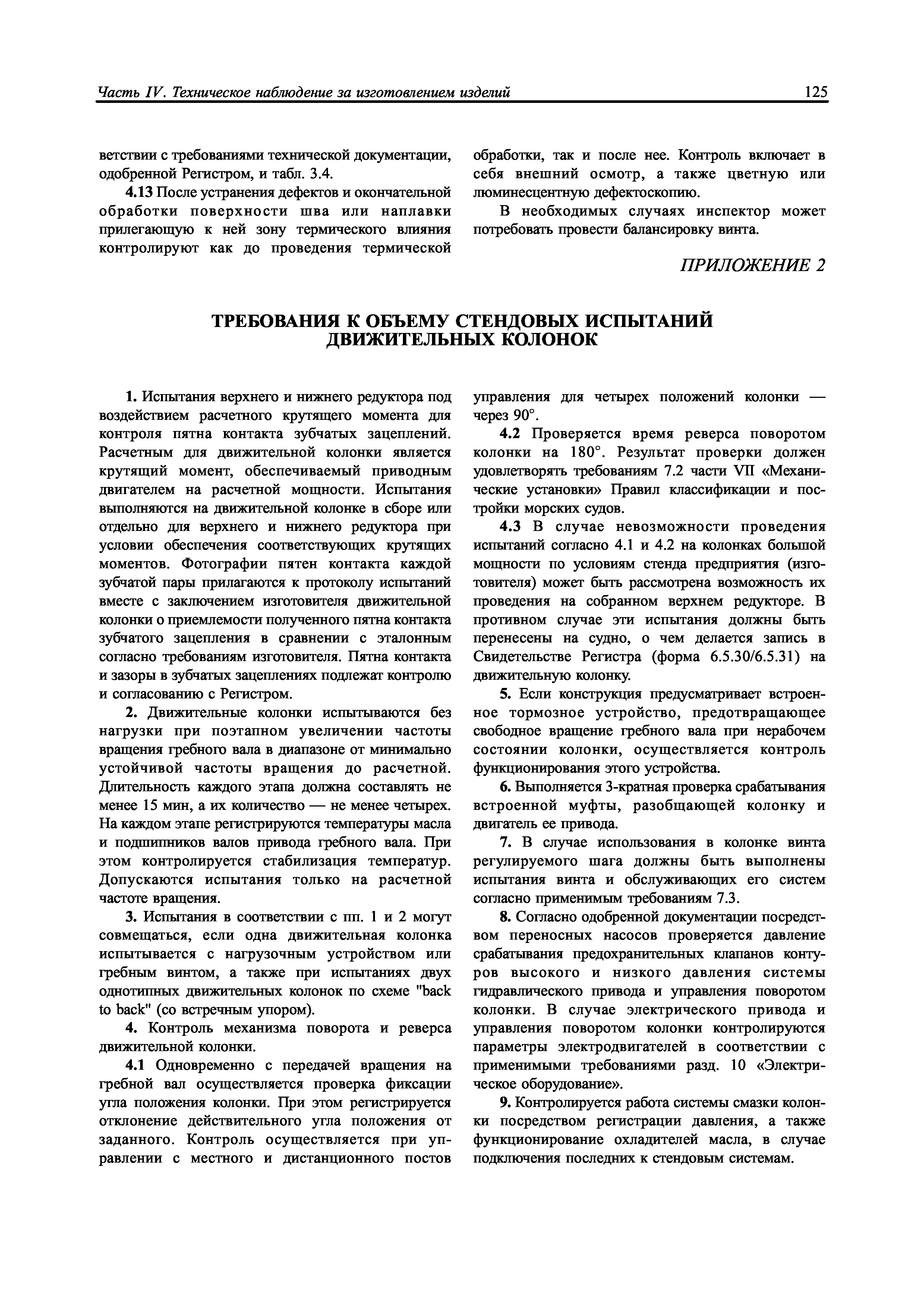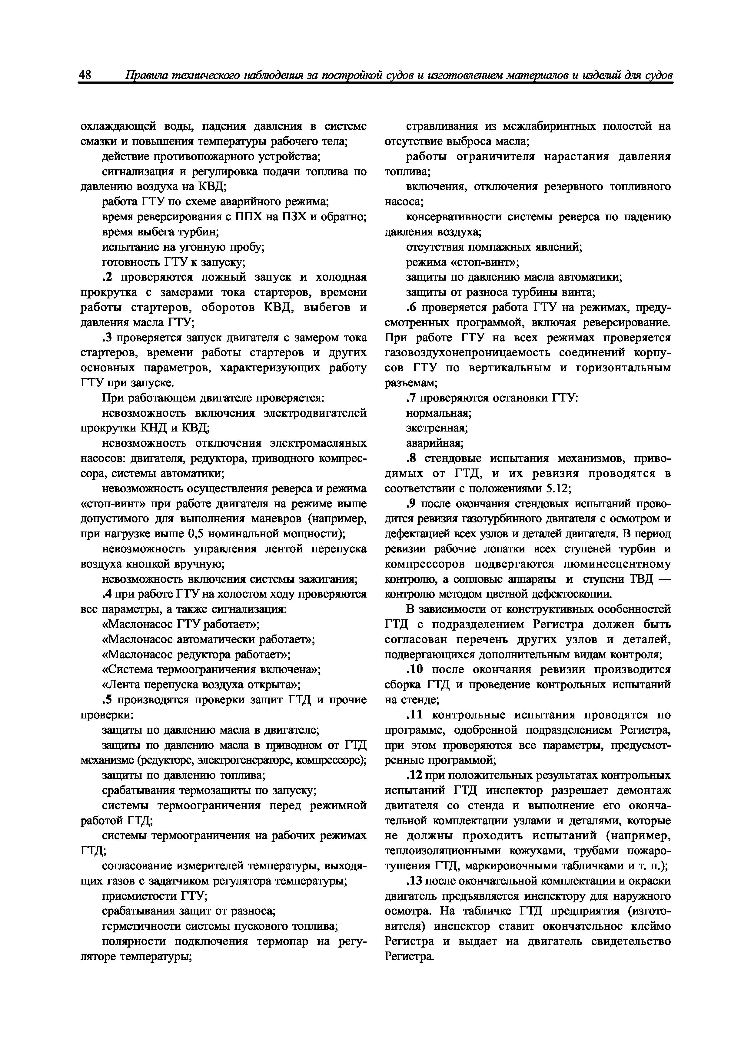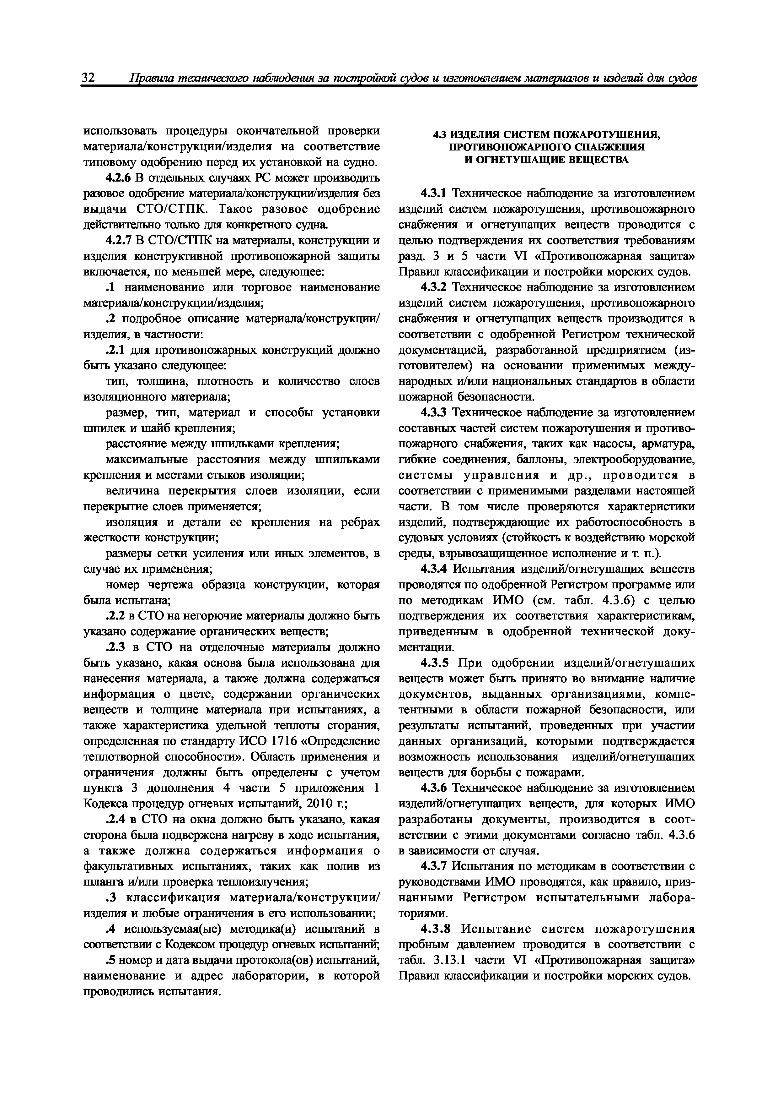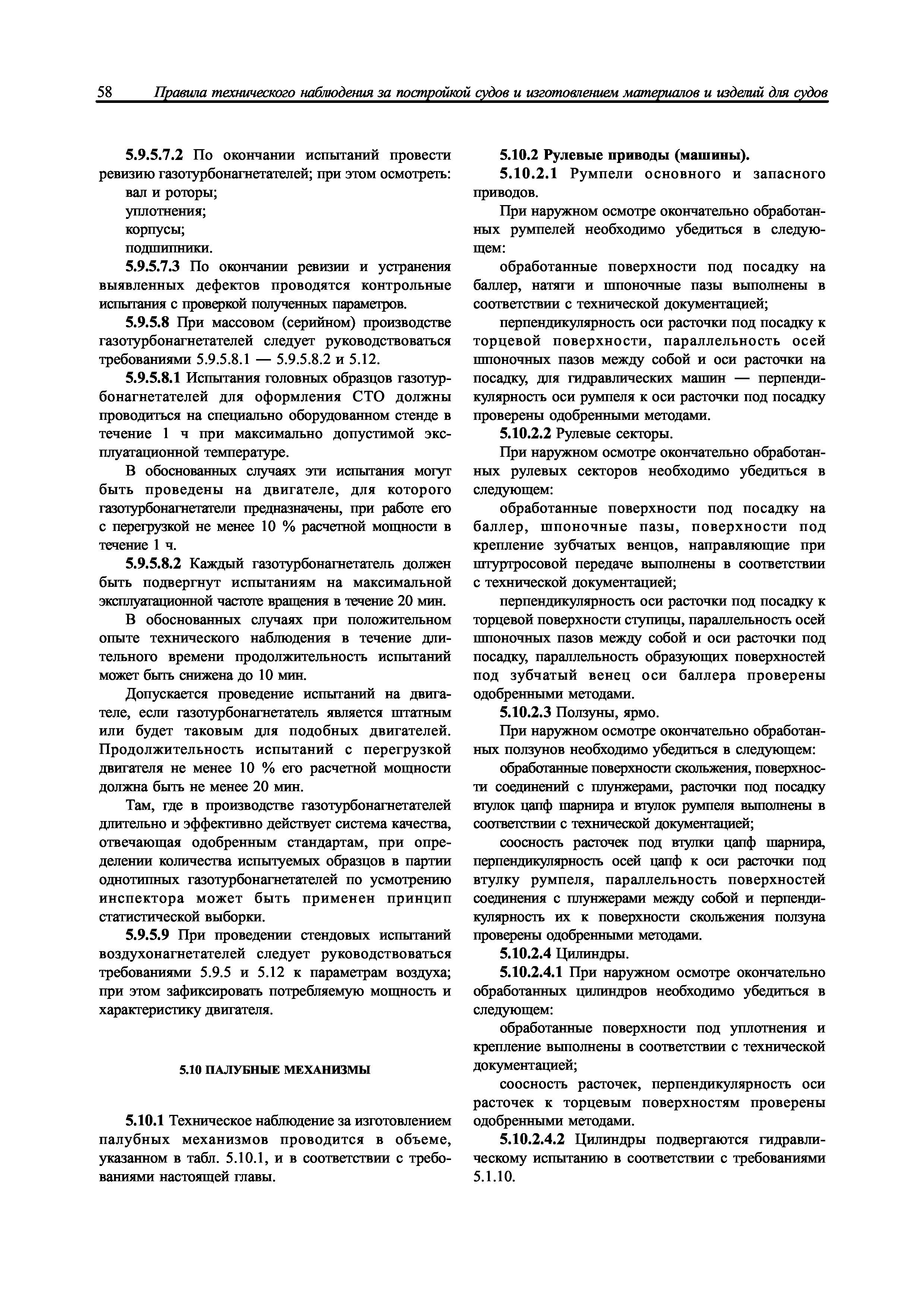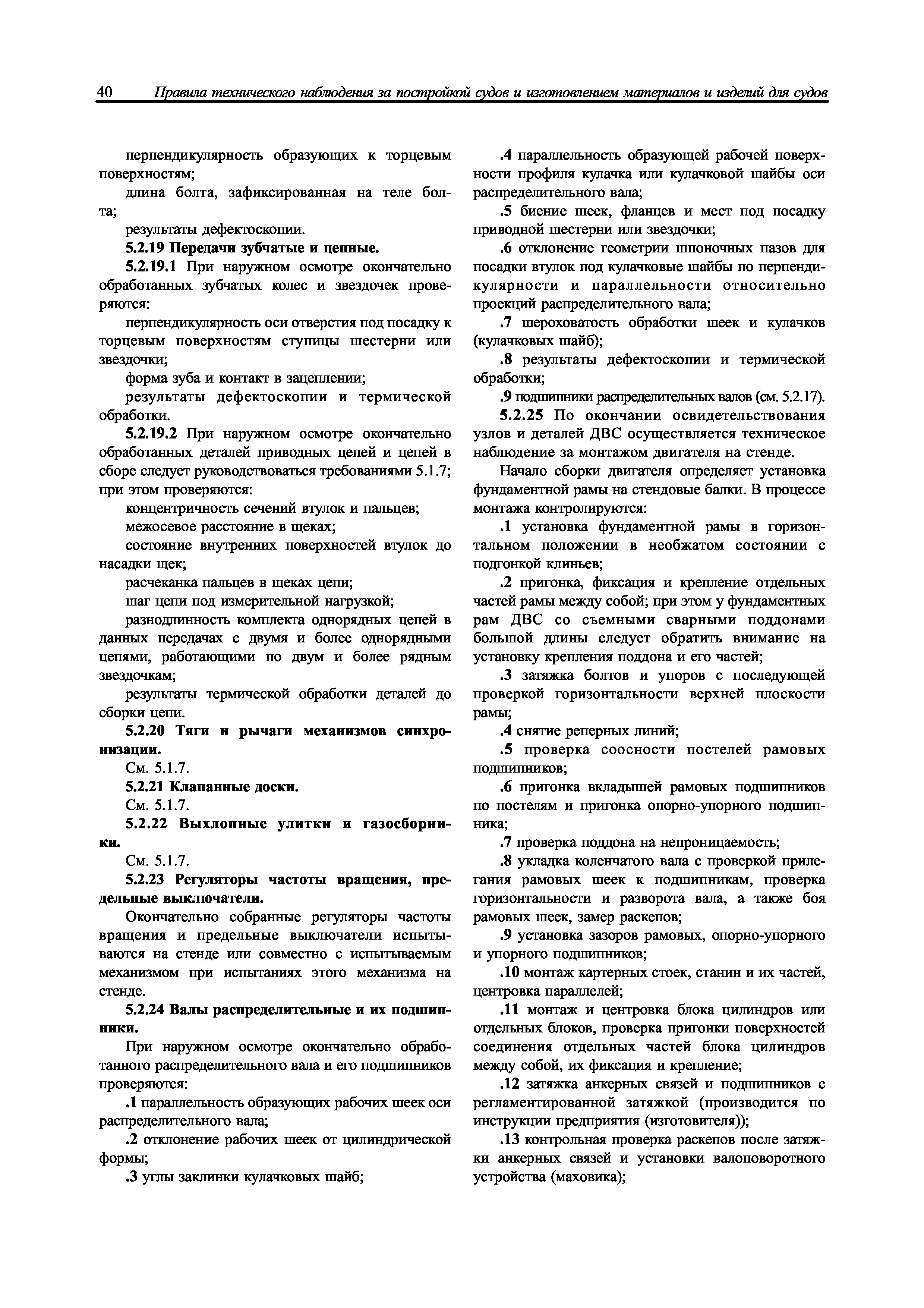 | Оглавление: | 1 Общие положения 1.1 Область распространения 1.2 Термины, определения, сокращения 1.3 Объем технического наблюдения 1.4 Техническая документация 1.5 Опытный образец изделия 1.6 Головной образец изделия 1.7 Серийные изделия установившегося производства 1.8 Эксплуатационные испытания изделий 2 Корпус 2.1 Общие положения 3 Устройства, оборудование и снабжение 3.1 Общие положения 3.2 Техническое наблюдение Регистра 3.3 Документация 3.4 Рулевые устройства 3.5 Якорные устройства 3.6 Швартовные устройства 3.7 Буксирные устройства 3.8 Сигнальные мачты 3.9 Устройства и закрытия отверстий в корпусе, надстройках и рубках 3.10 Устройство и оборудование помещений, различные устройства и оборудование, аварийное снабжение 3.11 Цепи без распорок, применяемые в судовых устройствах, кроме якорных 3.12 Стальные тросы 3.13 Растительные тросы и тросы из синтетического волокна (канаты) Приложение 1. Допустимые величины пороков на литых деталях якорей Приложение 2. Испытание якорей и их деталей бросанием Приложение 3. Испытание на растяжение пробной нагрузкой якорей и якорных скоб Приложение 4. Испытания буксирных гаков Приложение 5. Испытания головных образцов иллюминаторов, дверей надстройки и рубки, люков сходных, световых и вентиляционных Приложение 6. Испытания растительных тросов и тросов из синтетического волокна 4 Материалы, конструкции и изделия противопожарной защиты 4.1 Общие положения 4.2 Материалы, конструкции и изделия конструктивной противопожарной защиты 4.3 Изделия систем пожаротушения, противопожарного снабжения и огнетушащие вещества 5 Механизмы 5.1 Общие положения 5.2 Главные и вспомогательные двигатели внутреннего сгорания мощностью 55 кВт и более 5.3 Вспомогательные двигатели внутреннего сгорания мощностью менее 55 кВт 5.4 Главные паровые турбины и турбины электрогенераторов 5.5 Вспомогательные паровые турбины 5.6 Главные газотурбинные двигатели (ГТД) и газовые турбины (ГТ) для привода электрогенераторов 5.7 Передачи и разобщительные муфты главных и вспомогательных механизмов 5.8 Вспомогательные механизмы 5.9 Детали механизмов, перечисленных в таблице 5.8.1 5.10 Палубные механизмы 5.11 Телеграфы механические 5.12 Стендовые испытания 5.13 Документы Регистра 5.14 Документы Регистра для технического наблюдения за изготовлением и одобрения ДВС Приложение 1.Термины и определения (применительно к разд. 5 "Механизмы") (приведены в строгом соответствии с Приложением 1 "Глоссарий" УТ М44 (Rev.8 Mar 2015) МАКО) Приложение 2. Порядок представления и прохождения документации Приложение 3. Форма заявки на типовое одобрение ДВС и основные технические данные (в соответствии с приложением 3 к УТ МАКО М44, изм. 9) Приложение 4. Таблица соответствия документации и данных по ДВС лицензиара и лицензиата Приложение 5. Образец формы подтверждения лицензиаром изменений конструкции ДВС, выполненных лицензиатом Приложение 6. Типовые испытания ДВС Приложение 7. Стендовые испытания ДВС (заводские приемочные испытания) и испытания ДВС после установки на судне Приложение 8. Порядок освидетельствования и оформления документов на компоненты ДВС Приложение 9. Порядок освидетельствования, испытаний, одобрения турбонагнетателей и их компоновки с ДВС Приложение 10. Процедура типового испытания для предохранительных клапанов картеров Приложение 11. Процедура типовых испытаний приборов обнар