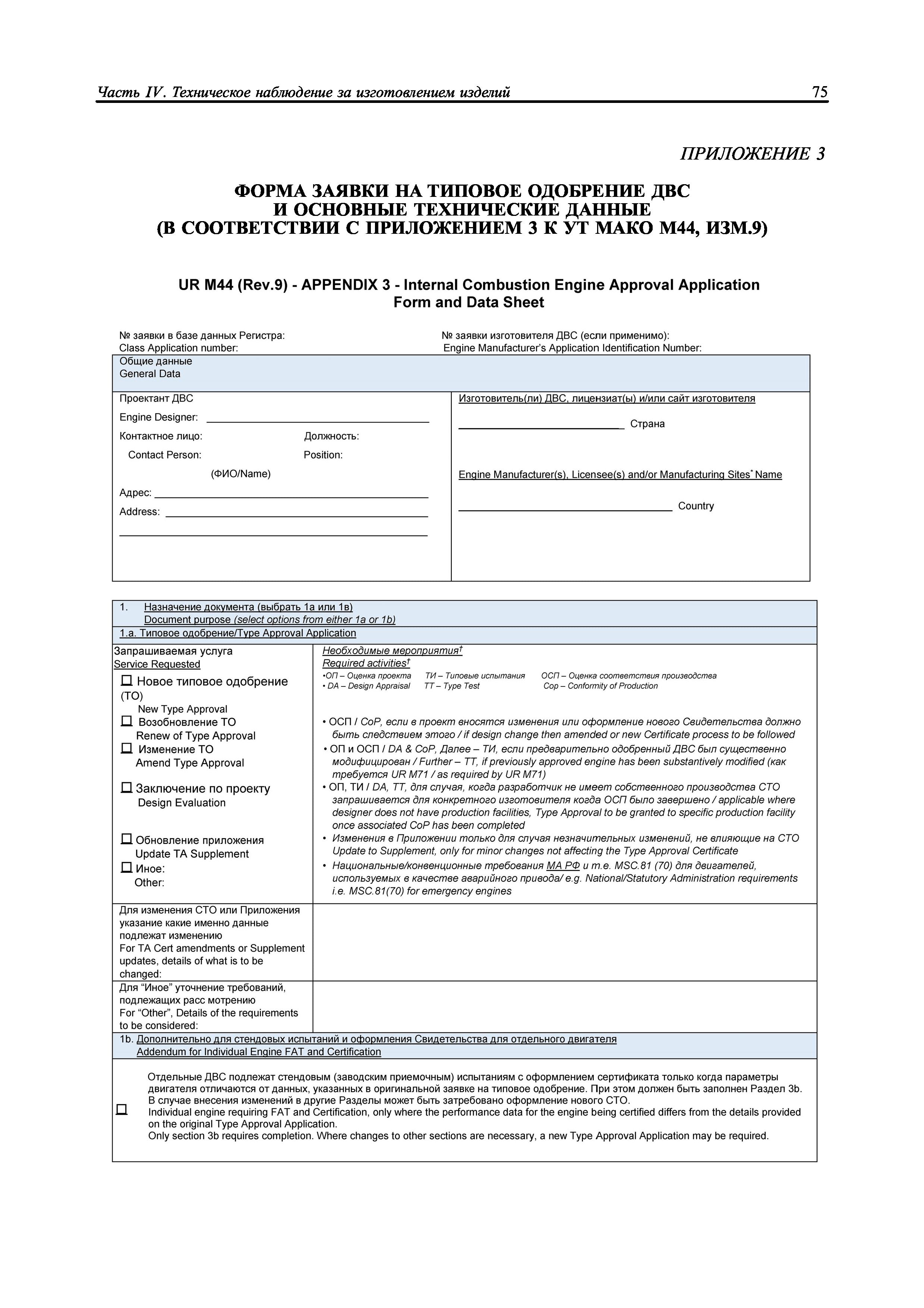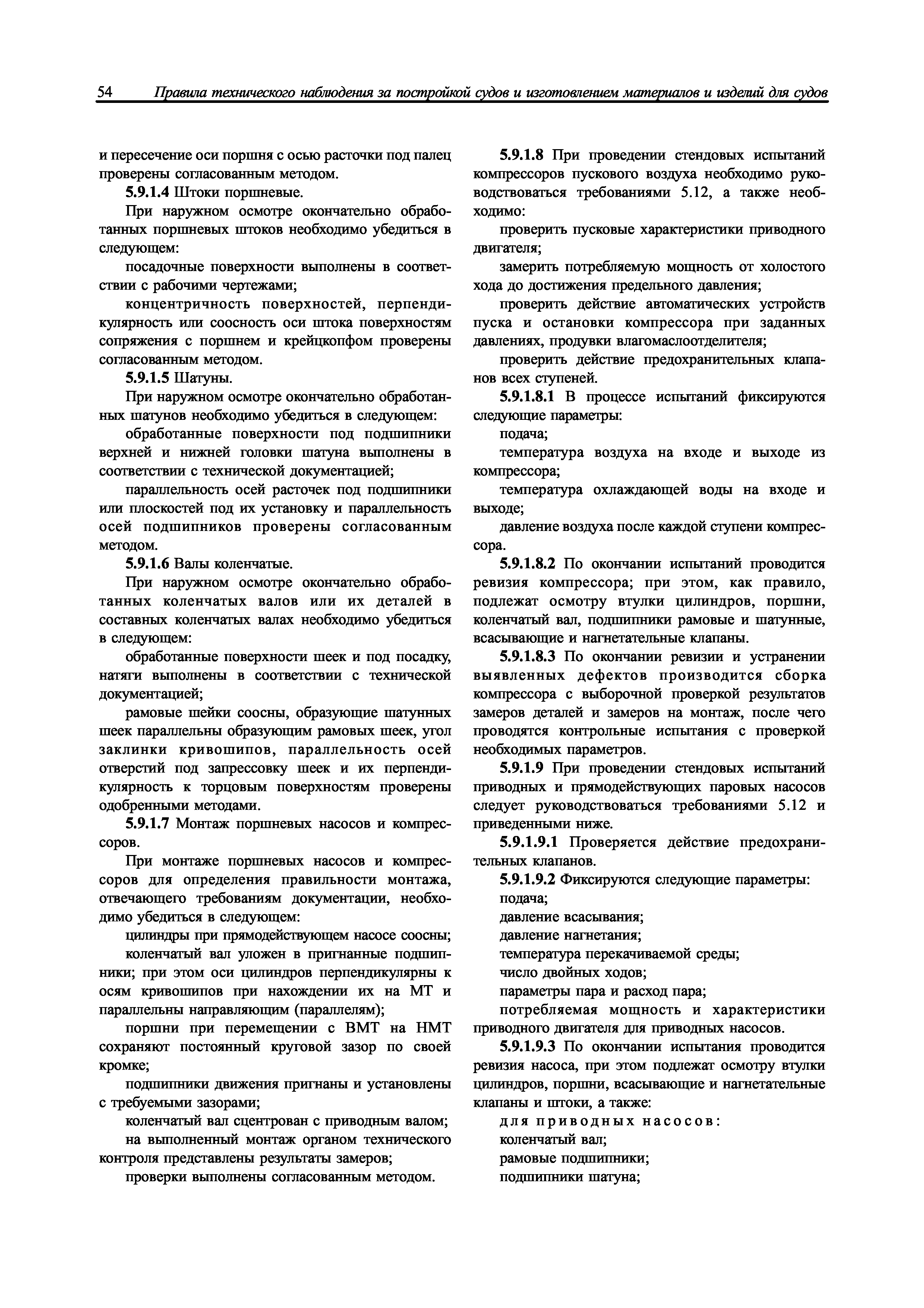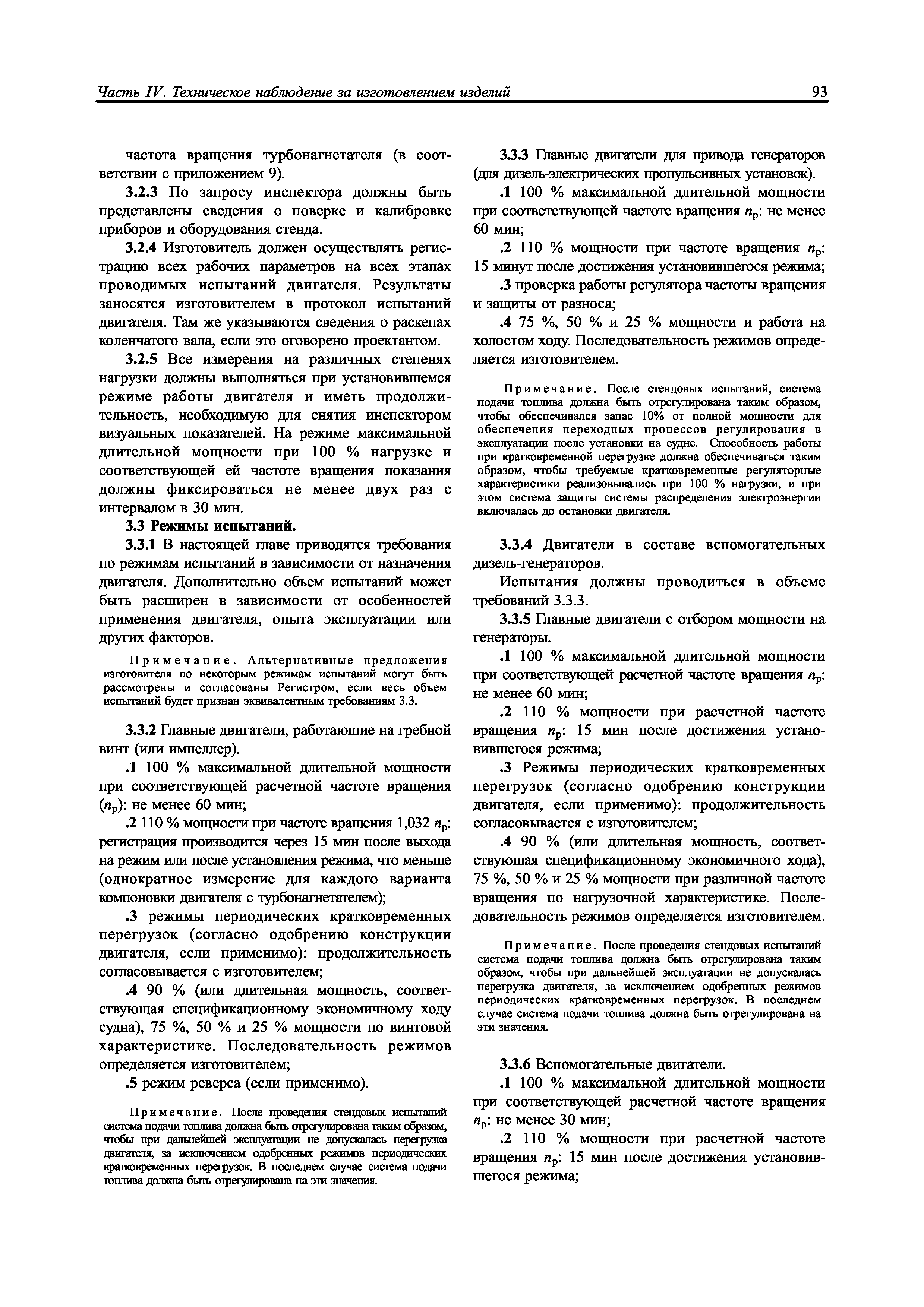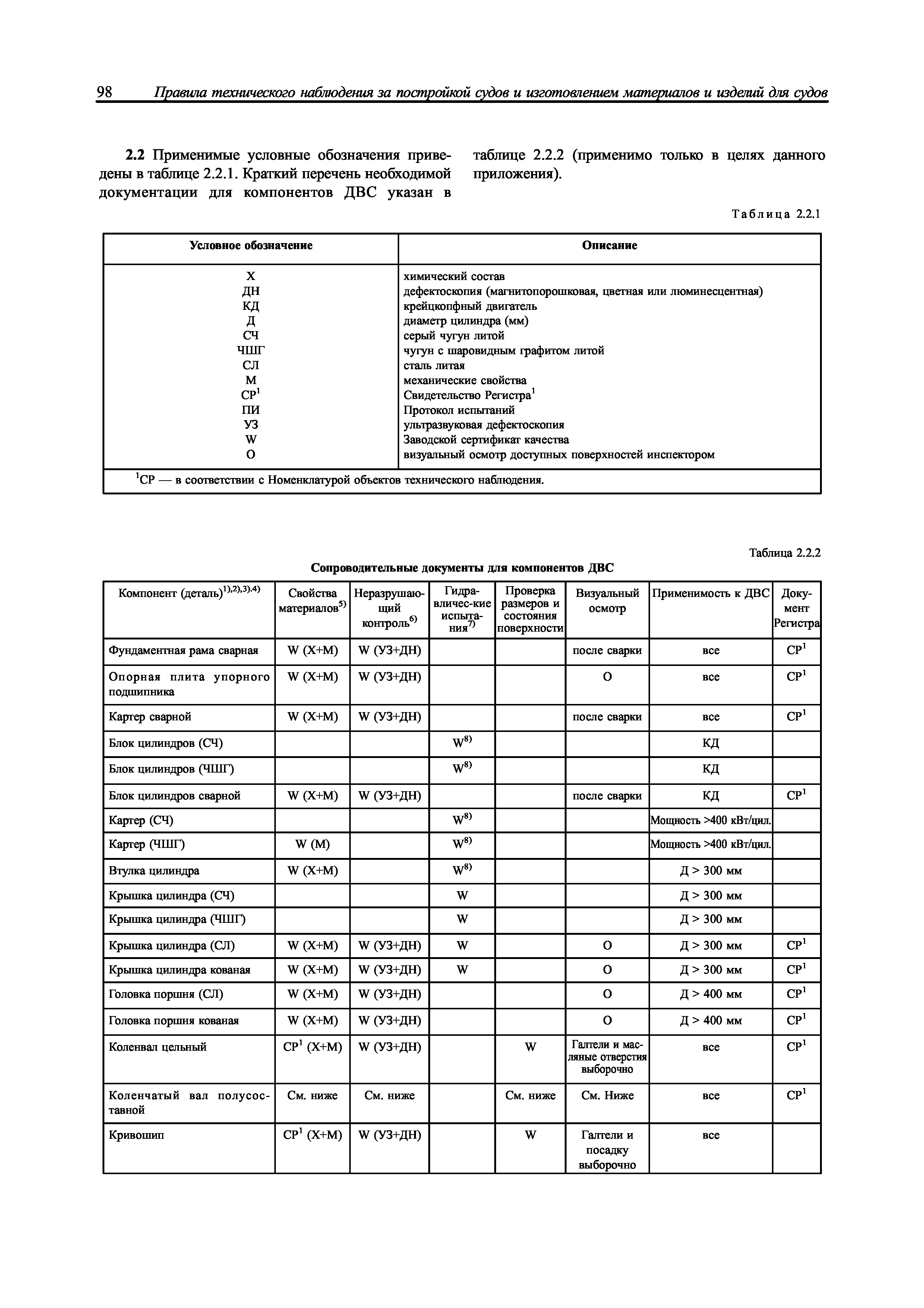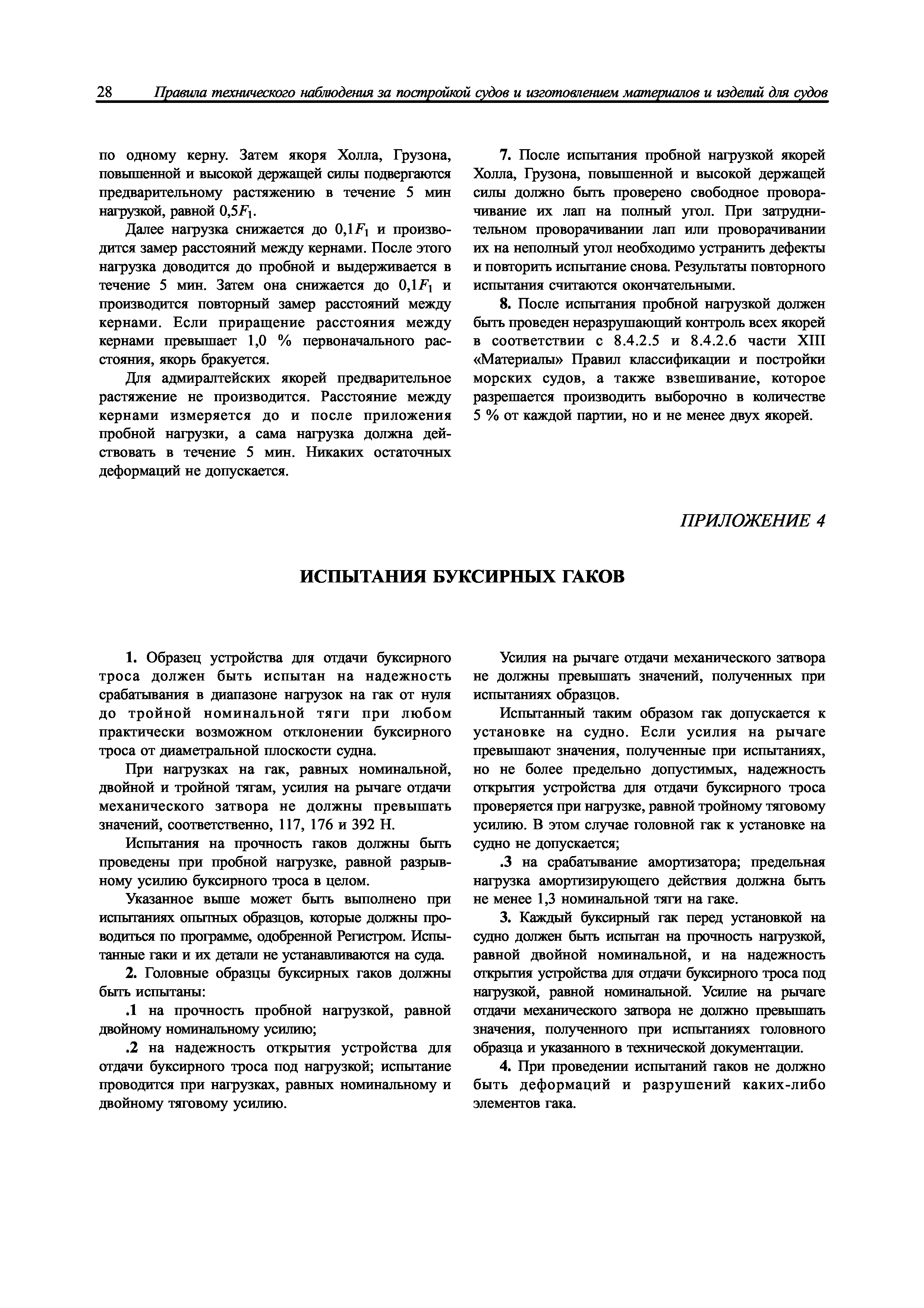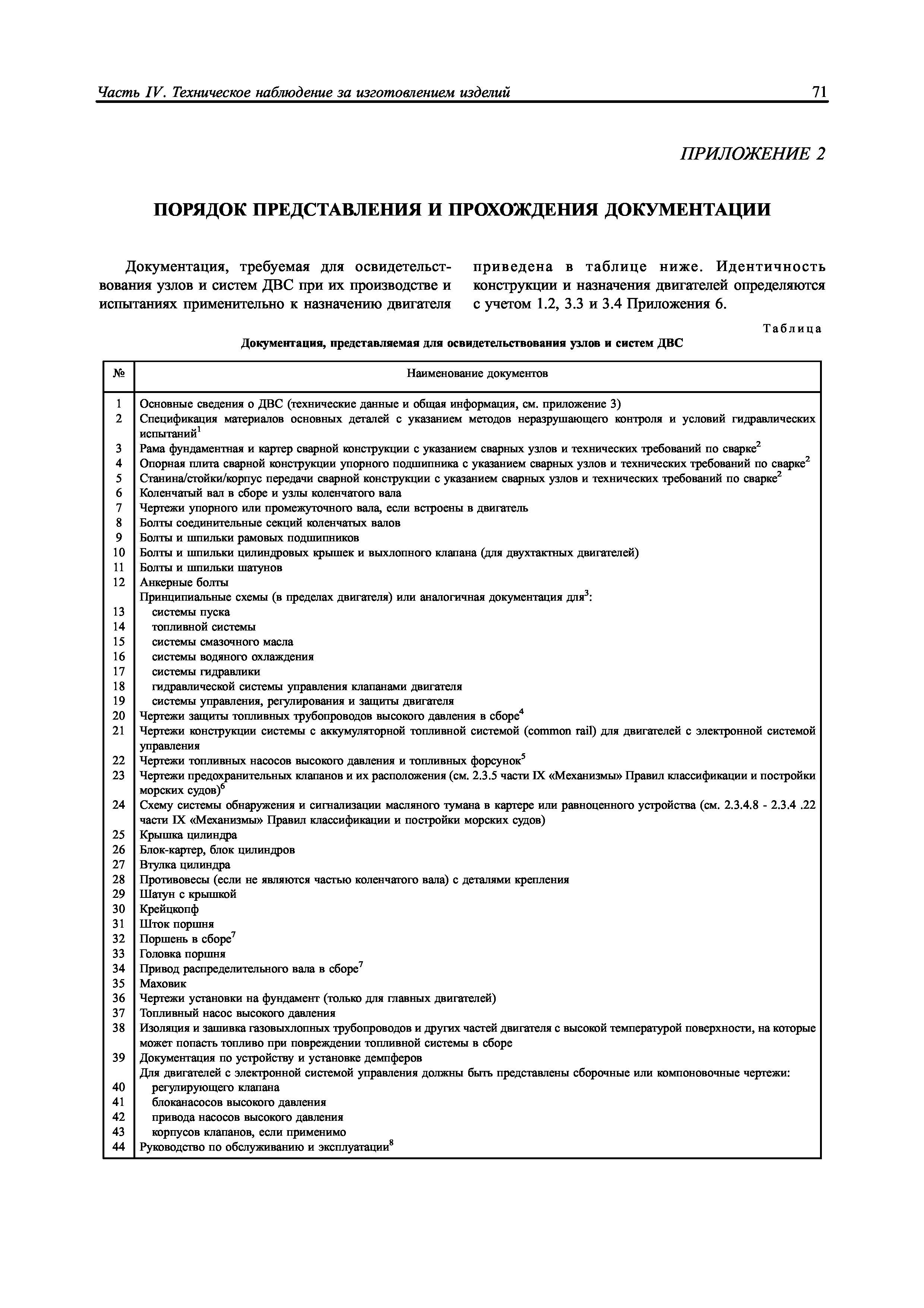 | Оглавление: | 1 Общие положения 1.1 Область распространения 1.2 Термины, определения, сокращения 1.3 Объем технического наблюдения 1.4 Техническая документация 1.5 Опытный образец изделия 1.6 Головной образец изделия 1.7 Серийные изделия установившегося производства 1.8 Эксплуатационные испытания изделий 2 Корпус 2.1 Общие положения 3 Устройства, оборудование и снабжение 3.1 Общие положения 3.2 Техническое наблюдение Регистра 3.3 Документация 3.4 Рулевые устройства 3.5 Якорные устройства 3.6 Швартовные устройства 3.7 Буксирные устройства 3.8 Сигнальные мачты 3.9 Устройства и закрытия отверстий в корпусе, надстройках и рубках 3.10 Устройство и оборудование помещений, различные устройства и оборудование, аварийное снабжение 3.11 Цепи без распорок, применяемые в судовых устройствах, кроме якорных 3.12 Стальные тросы 3.13 Растительные тросы и тросы из синтетического волокна (канаты) Приложение 1. Допустимые величины пороков на литых деталях якорей Приложение 2. Испытание якорей и их деталей бросанием Приложение 3. Испытание на растяжение пробной нагрузкой якорей и якорных скоб Приложение 4. Испытания буксирных гаков Приложение 5. Испытания головных образцов иллюминаторов, дверей надстройки и рубки, люков сходных, световых и вентиляционных Приложение 6. Испытания растительных тросов и тросов из синтетического волокна 4 Материалы, конструкции и изделия противопожарной защиты 4.1 Общие положения 4.2 Материалы, конструкции и изделия конструктивной противопожарной защиты 4.3 Изделия систем пожаротушения, противопожарного снабжения и огнетушащие вещества 5 Механизмы 5.1 Общие положения 5.2 Главные и вспомогательные двигатели внутреннего сгорания мощностью 55 кВт и более 5.3 Вспомогательные двигатели внутреннего сгорания мощностью менее 55 кВт 5.4 Главные паровые турбины и турбины электрогенераторов 5.5 Вспомогательные паровые турбины 5.6 Главные газотурбинные двигатели (ГТД) и газовые турбины (ГТ) для привода электрогенераторов 5.7 Передачи и разобщительные муфты главных и вспомогательных механизмов 5.8 Вспомогательные механизмы 5.9 Детали механизмов, перечисленных в таблице 5.8.1 5.10 Палубные механизмы 5.11 Телеграфы механические 5.12 Стендовые испытания 5.13 Документы Регистра 5.14 Документы Регистра для технического наблюдения за изготовлением и одобрения ДВС Приложение 1.Термины и определения (применительно к разд. 5 "Механизмы") (приведены в строгом соответствии с Приложением 1 "Глоссарий" УТ М44 (Rev.8 Mar 2015) МАКО) Приложение 2. Порядок представления и прохождения документации Приложение 3. Форма заявки на типовое одобрение ДВС и основные технические данные (в соответствии с приложением 3 к УТ МАКО М44, изм. 9) Приложение 4. Таблица соответствия документации и данных по ДВС лицензиара и лицензиата Приложение 5. Образец формы подтверждения лицензиаром изменений конструкции ДВС, выполненных лицензиатом Приложение 6. Типовые испытания ДВС Приложение 7. Стендовые испытания ДВС (заводские приемочные испытания) и испытания ДВС после установки на судне Приложение 8. Порядок освидетельствования и оформления документов на компоненты ДВС Приложение 9. Порядок освидетельствования, испытаний, одобрения турбонагнетателей и их компоновки с ДВС Приложение 10. Процедура типового испытания для предохранительных клапанов картеров Приложение 11. Процедура типовых испытаний приборов обнар