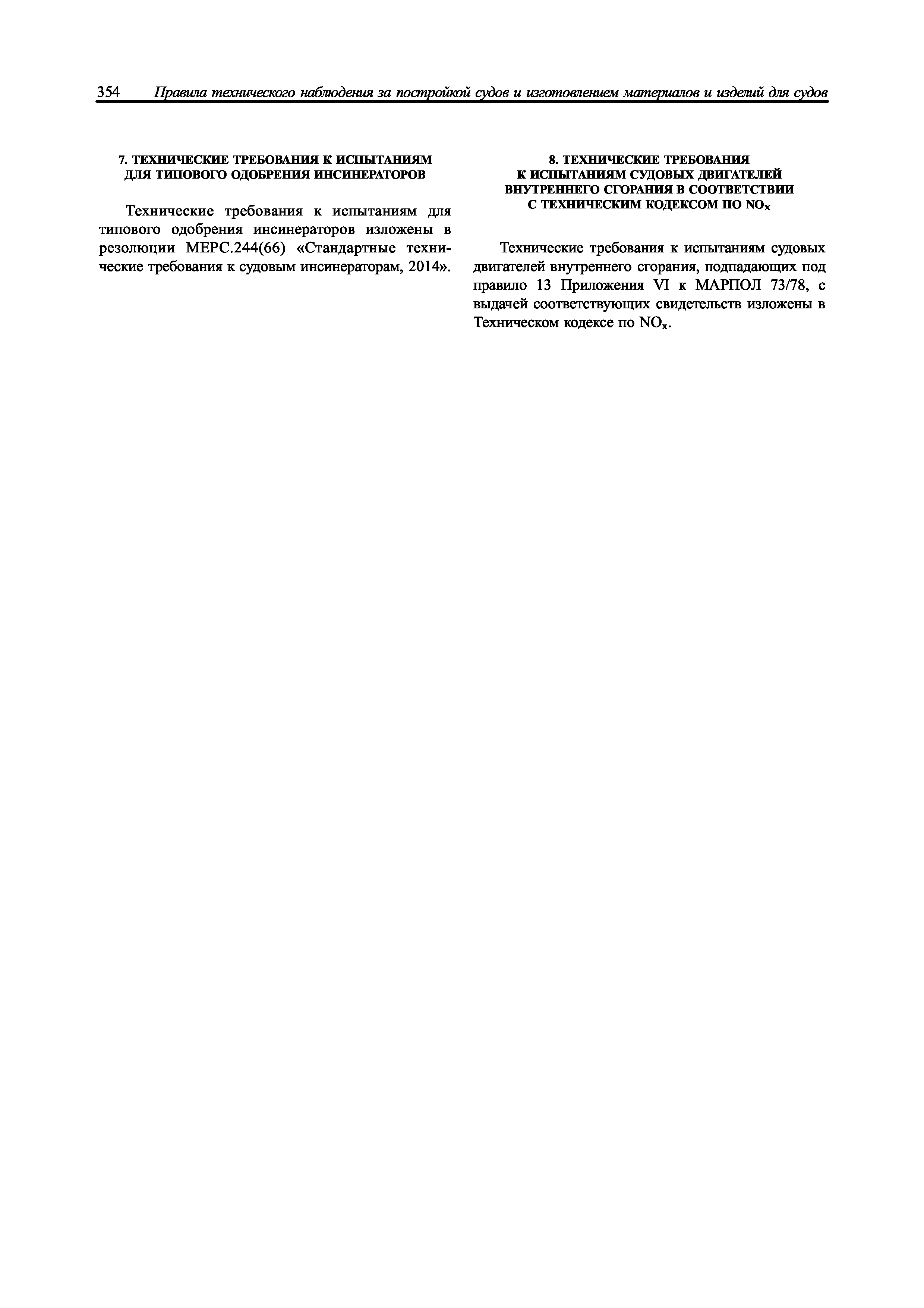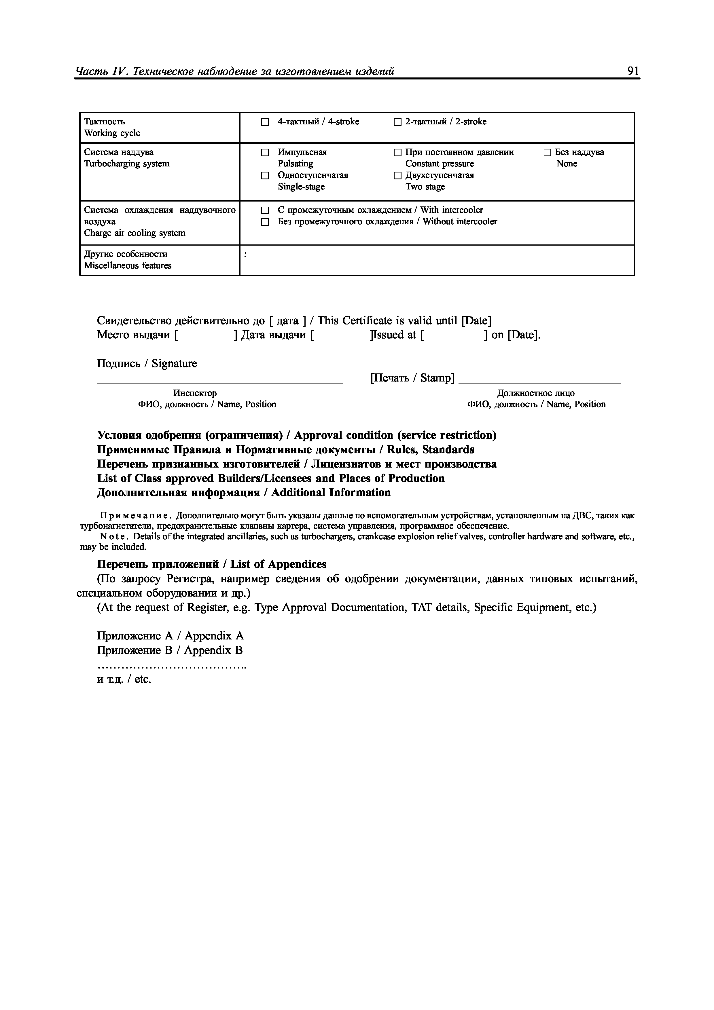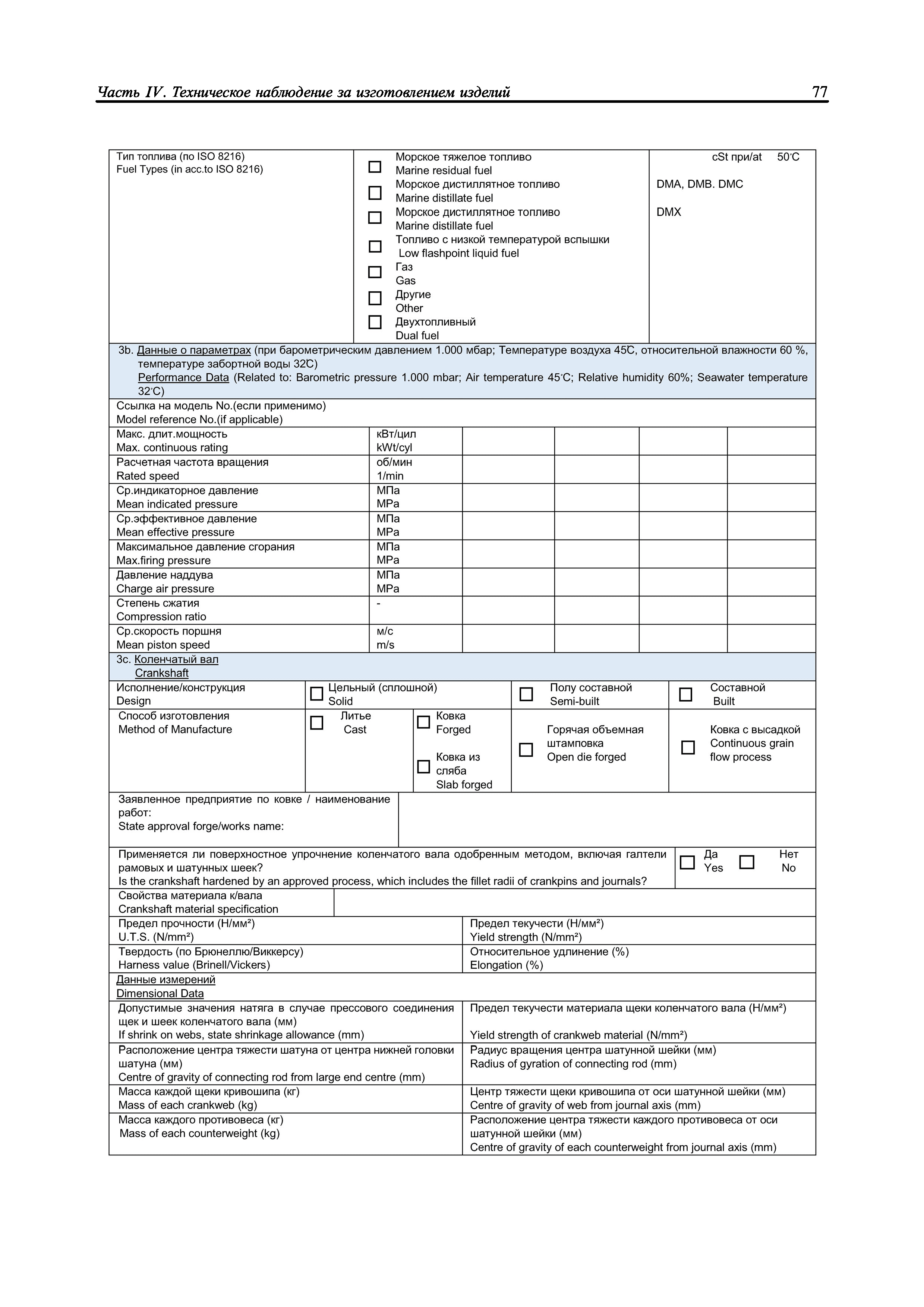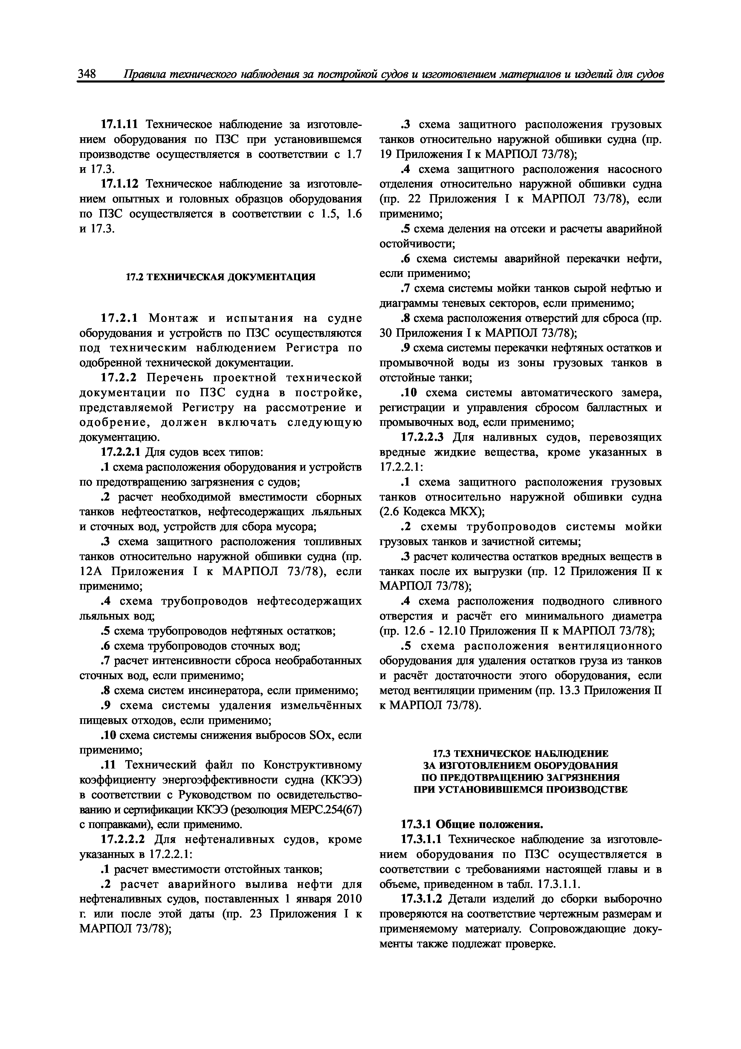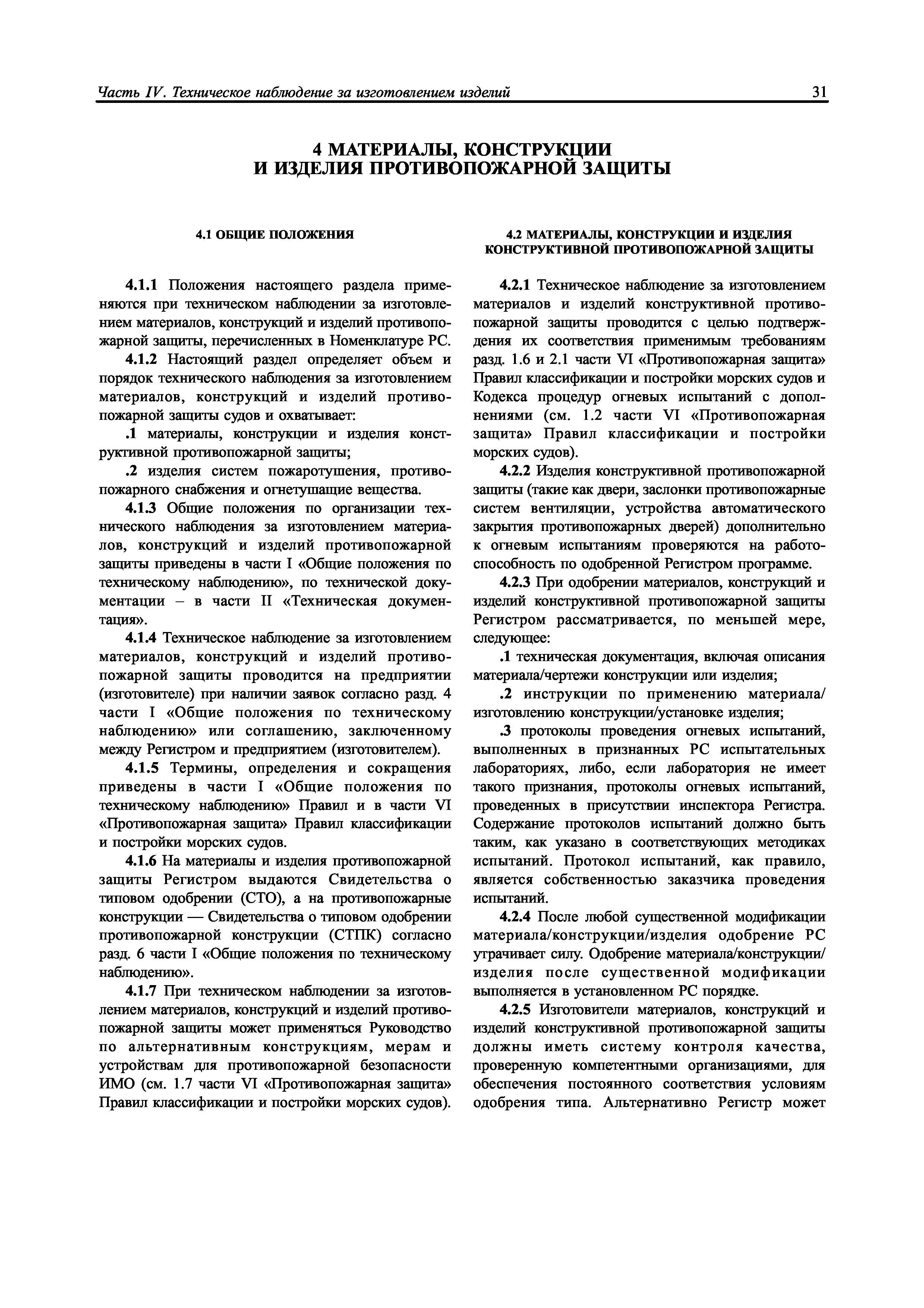 | Оглавление: | 1 Общие положения 1.1 Область распространения 1.2 Термины, определения, сокращения 1.3 Объем технического наблюдения 1.4 Техническая документация 1.5 Опытный образец изделия 1.6 Головной образец изделия 1.7 Серийные изделия установившегося производства 1.8 Эксплуатационные испытания изделий 2 Корпус 2.1 Общие положения 3 Устройства, оборудование и снабжение 3.1 Общие положения 3.2 Техническое наблюдение Регистра 3.3 Документация 3.4 Рулевые устройства 3.5 Якорные устройства 3.6 Швартовные устройства 3.7 Буксирные устройства 3.8 Сигнальные мачты 3.9 Устройства и закрытия отверстий в корпусе, надстройках и рубках 3.10 Устройство и оборудование помещений, различные устройства и оборудование, аварийное снабжение 3.11 Цепи без распорок, применяемые в судовых устройствах, кроме якорных 3.12 Стальные тросы 3.13 Растительные тросы и тросы из синтетического волокна (канаты) Приложение 1. Допустимые величины пороков на литых деталях якорей Приложение 2. Испытание якорей и их деталей бросанием Приложение 3. Испытание на растяжение пробной нагрузкой якорей и якорных скоб Приложение 4. Испытания буксирных гаков Приложение 5. Испытания головных образцов иллюминаторов, дверей надстройки и рубки, люков сходных, световых и вентиляционных Приложение 6. Испытания растительных тросов и тросов из синтетического волокна 4 Материалы, конструкции и изделия противопожарной защиты 4.1 Общие положения 4.2 Материалы, конструкции и изделия конструктивной противопожарной защиты 4.3 Изделия систем пожаротушения, противопожарного снабжения и огнетушащие вещества 5 Механизмы 5.1 Общие положения 5.2 Главные и вспомогательные двигатели внутреннего сгорания мощностью 55 кВт и более 5.3 Вспомогательные двигатели внутреннего сгорания мощностью менее 55 кВт 5.4 Главные паровые турбины и турбины электрогенераторов 5.5 Вспомогательные паровые турбины 5.6 Главные газотурбинные двигатели (ГТД) и газовые турбины (ГТ) для привода электрогенераторов 5.7 Передачи и разобщительные муфты главных и вспомогательных механизмов 5.8 Вспомогательные механизмы 5.9 Детали механизмов, перечисленных в таблице 5.8.1 5.10 Палубные механизмы 5.11 Телеграфы механические 5.12 Стендовые испытания 5.13 Документы Регистра 5.14 Документы Регистра для технического наблюдения за изготовлением и одобрения ДВС Приложение 1.Термины и определения (применительно к разд. 5 "Механизмы") (приведены в строгом соответствии с Приложением 1 "Глоссарий" УТ М44 (Rev.8 Mar 2015) МАКО) Приложение 2. Порядок представления и прохождения документации Приложение 3. Форма заявки на типовое одобрение ДВС и основные технические данные (в соответствии с приложением 3 к УТ МАКО М44, изм. 9) Приложение 4. Таблица соответствия документации и данных по ДВС лицензиара и лицензиата Приложение 5. Образец формы подтверждения лицензиаром изменений конструкции ДВС, выполненных лицензиатом Приложение 6. Типовые испытания ДВС Приложение 7. Стендовые испытания ДВС (заводские приемочные испытания) и испытания ДВС после установки на судне Приложение 8. Порядок освидетельствования и оформления документов на компоненты ДВС Приложение 9. Порядок освидетельствования, испытаний, одобрения турбонагнетателей и их компоновки с ДВС Приложение 10. Процедура типового испытания для предохранительных клапанов картеров Приложение 11. Процедура типовых испытаний приборов обнар