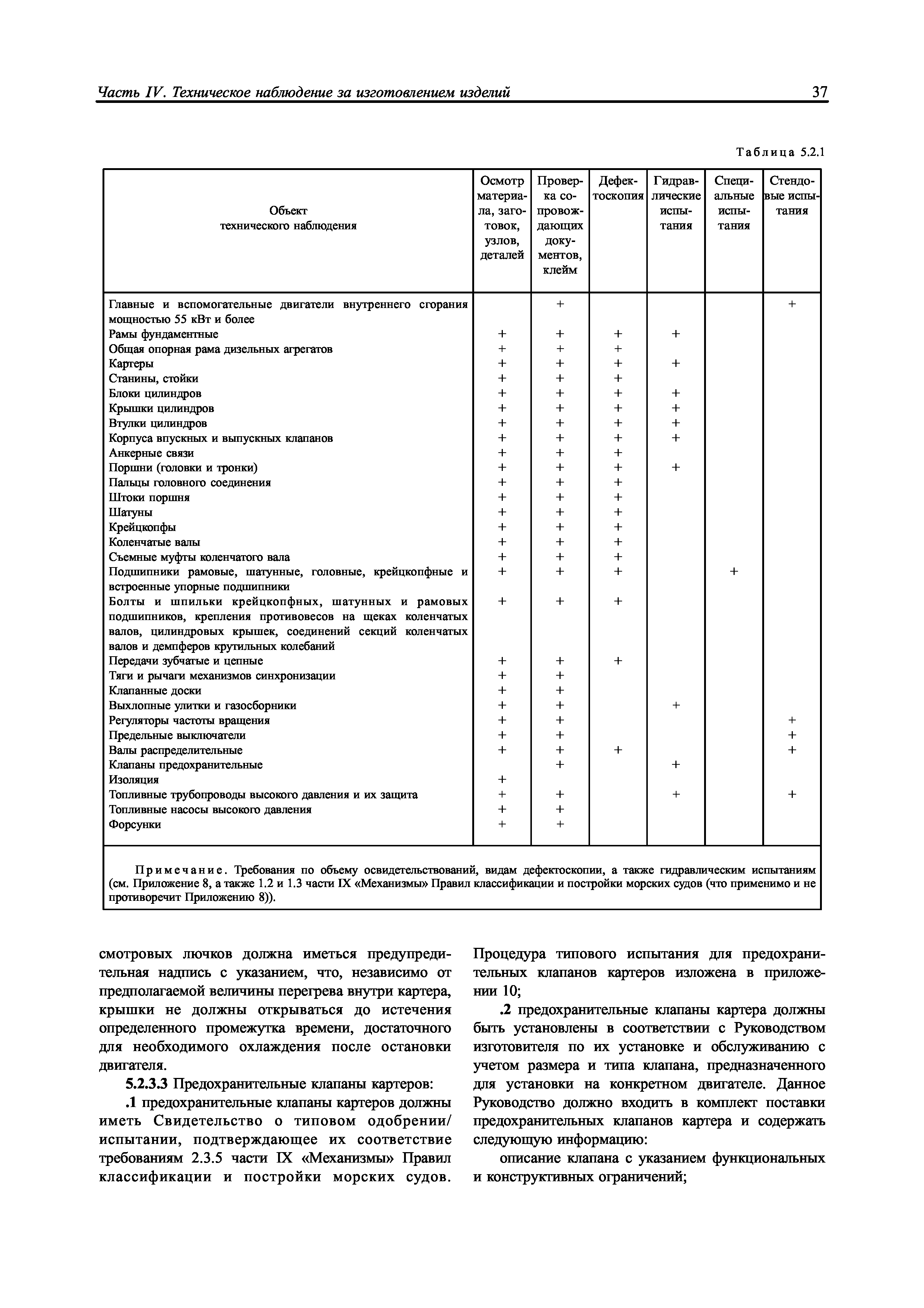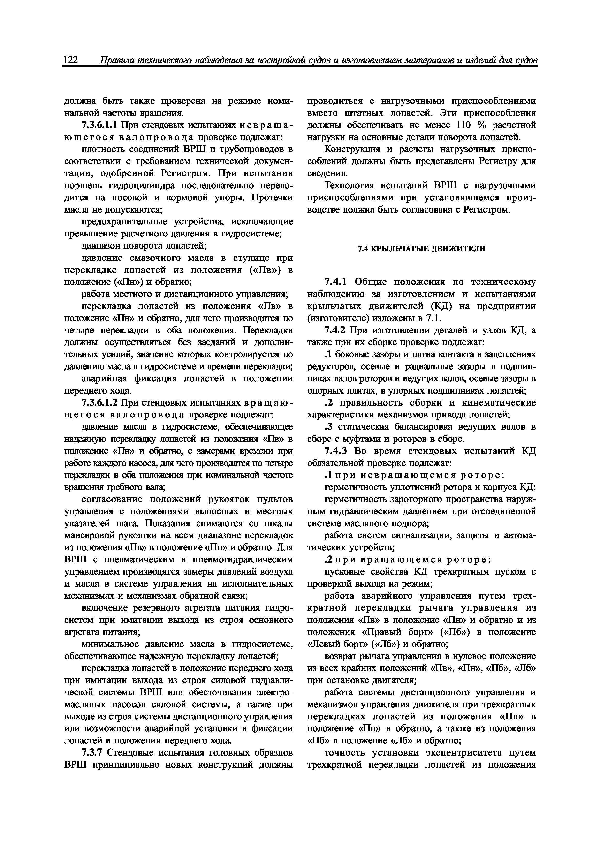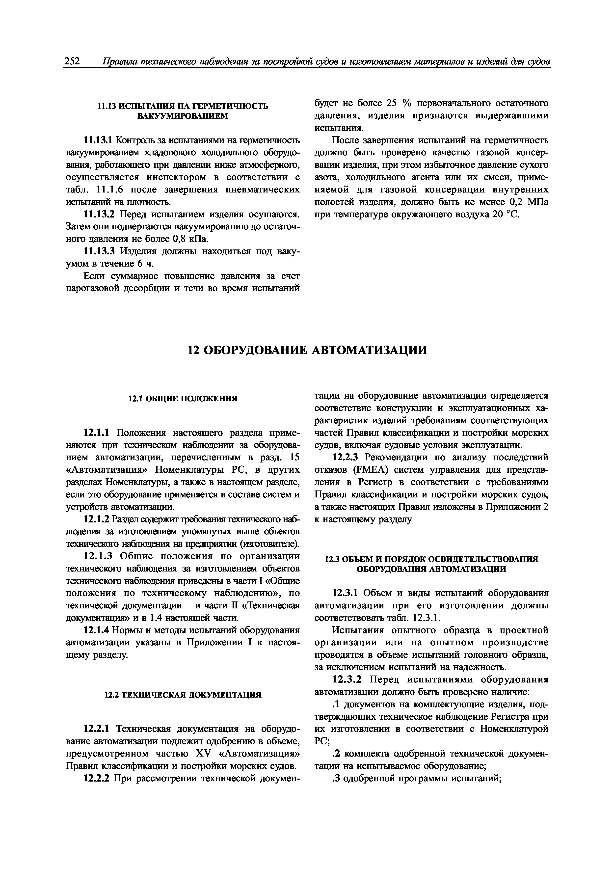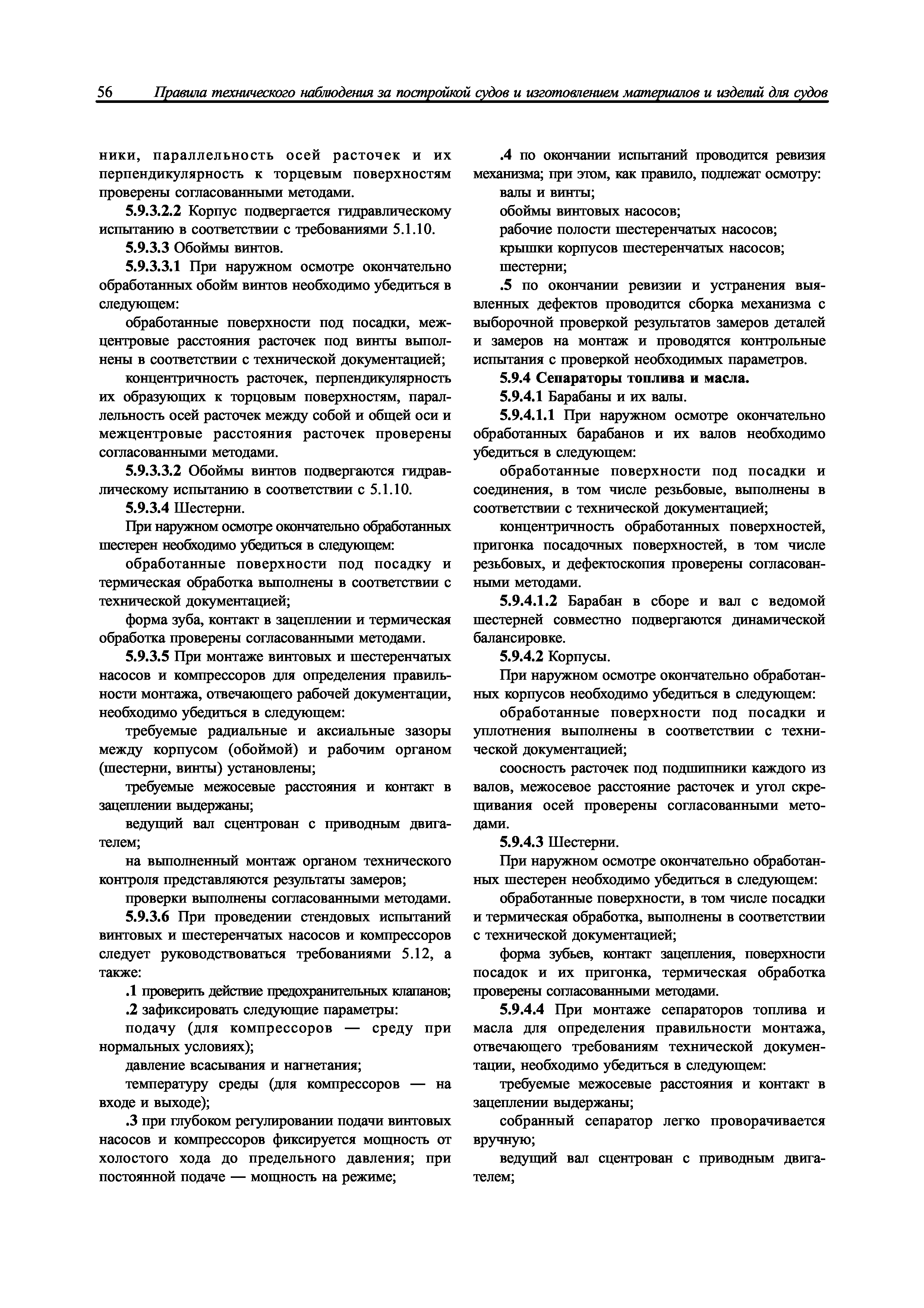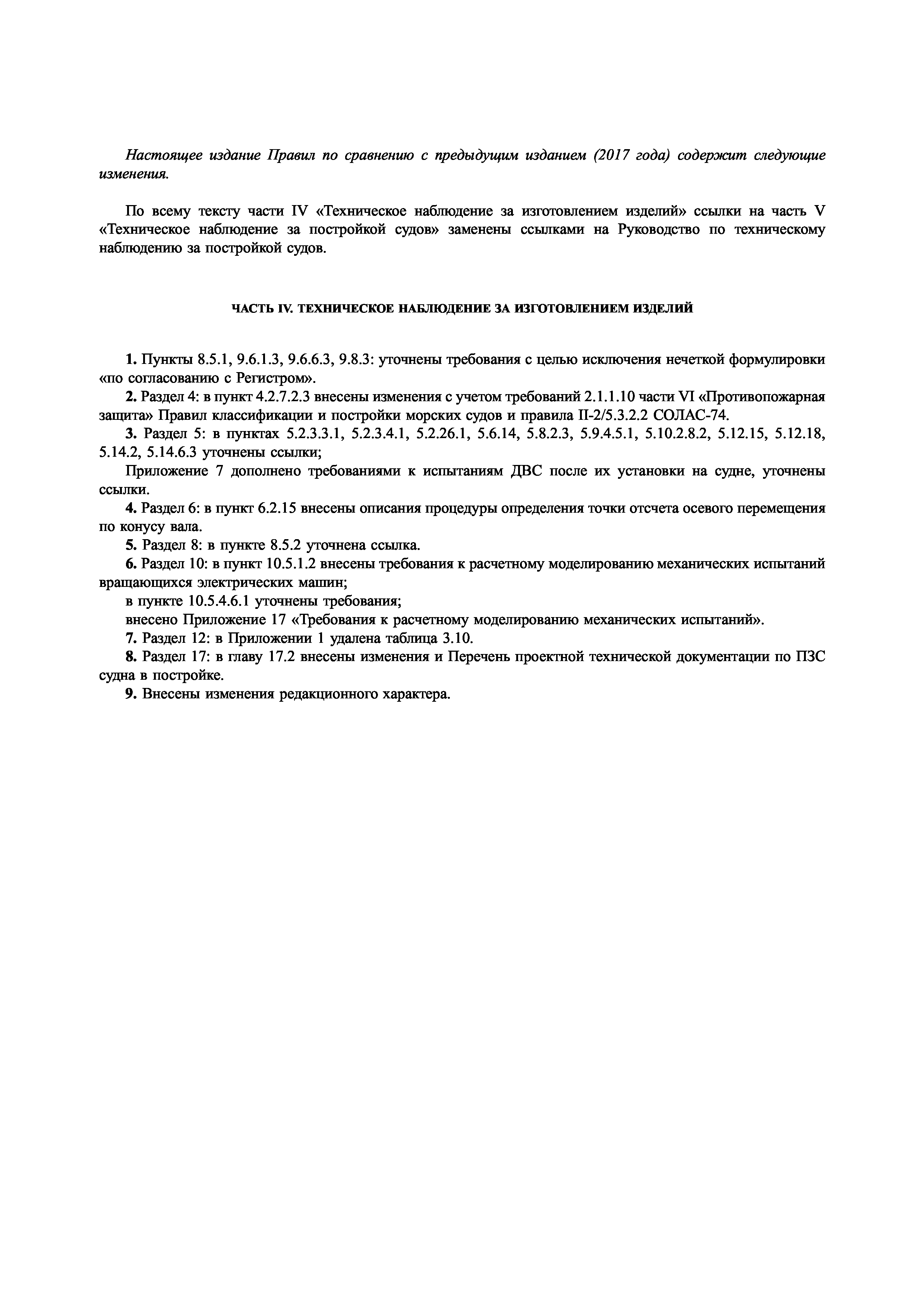 | Оглавление: | 1 Общие положения 1.1 Область распространения 1.2 Термины, определения, сокращения 1.3 Объем технического наблюдения 1.4 Техническая документация 1.5 Опытный образец изделия 1.6 Головной образец изделия 1.7 Серийные изделия установившегося производства 1.8 Эксплуатационные испытания изделий 2 Корпус 2.1 Общие положения 3 Устройства, оборудование и снабжение 3.1 Общие положения 3.2 Техническое наблюдение Регистра 3.3 Документация 3.4 Рулевые устройства 3.5 Якорные устройства 3.6 Швартовные устройства 3.7 Буксирные устройства 3.8 Сигнальные мачты 3.9 Устройства и закрытия отверстий в корпусе, надстройках и рубках 3.10 Устройство и оборудование помещений, различные устройства и оборудование, аварийное снабжение 3.11 Цепи без распорок, применяемые в судовых устройствах, кроме якорных 3.12 Стальные тросы 3.13 Растительные тросы и тросы из синтетического волокна (канаты) Приложение 1. Допустимые величины пороков на литых деталях якорей Приложение 2. Испытание якорей и их деталей бросанием Приложение 3. Испытание на растяжение пробной нагрузкой якорей и якорных скоб Приложение 4. Испытания буксирных гаков Приложение 5. Испытания головных образцов иллюминаторов, дверей надстройки и рубки, люков сходных, световых и вентиляционных Приложение 6. Испытания растительных тросов и тросов из синтетического волокна 4 Материалы, конструкции и изделия противопожарной защиты 4.1 Общие положения 4.2 Материалы, конструкции и изделия конструктивной противопожарной защиты 4.3 Изделия систем пожаротушения, противопожарного снабжения и огнетушащие вещества 5 Механизмы 5.1 Общие положения 5.2 Главные и вспомогательные двигатели внутреннего сгорания мощностью 55 кВт и более 5.3 Вспомогательные двигатели внутреннего сгорания мощностью менее 55 кВт 5.4 Главные паровые турбины и турбины электрогенераторов 5.5 Вспомогательные паровые турбины 5.6 Главные газотурбинные двигатели (ГТД) и газовые турбины (ГТ) для привода электрогенераторов 5.7 Передачи и разобщительные муфты главных и вспомогательных механизмов 5.8 Вспомогательные механизмы 5.9 Детали механизмов, перечисленных в таблице 5.8.1 5.10 Палубные механизмы 5.11 Телеграфы механические 5.12 Стендовые испытания 5.13 Документы Регистра 5.14 Документы Регистра для технического наблюдения за изготовлением и одобрения ДВС Приложение 1.Термины и определения (применительно к разд. 5 "Механизмы") (приведены в строгом соответствии с Приложением 1 "Глоссарий" УТ М44 (Rev.8 Mar 2015) МАКО) Приложение 2. Порядок представления и прохождения документации Приложение 3. Форма заявки на типовое одобрение ДВС и основные технические данные (в соответствии с приложением 3 к УТ МАКО М44, изм. 9) Приложение 4. Таблица соответствия документации и данных по ДВС лицензиара и лицензиата Приложение 5. Образец формы подтверждения лицензиаром изменений конструкции ДВС, выполненных лицензиатом Приложение 6. Типовые испытания ДВС Приложение 7. Стендовые испытания ДВС (заводские приемочные испытания) и испытания ДВС после установки на судне Приложение 8. Порядок освидетельствования и оформления документов на компоненты ДВС Приложение 9. Порядок освидетельствования, испытаний, одобрения турбонагнетателей и их компоновки с ДВС Приложение 10. Процедура типового испытания для предохранительных клапанов картеров Приложение 11. Процедура типовых испытаний приборов обнар