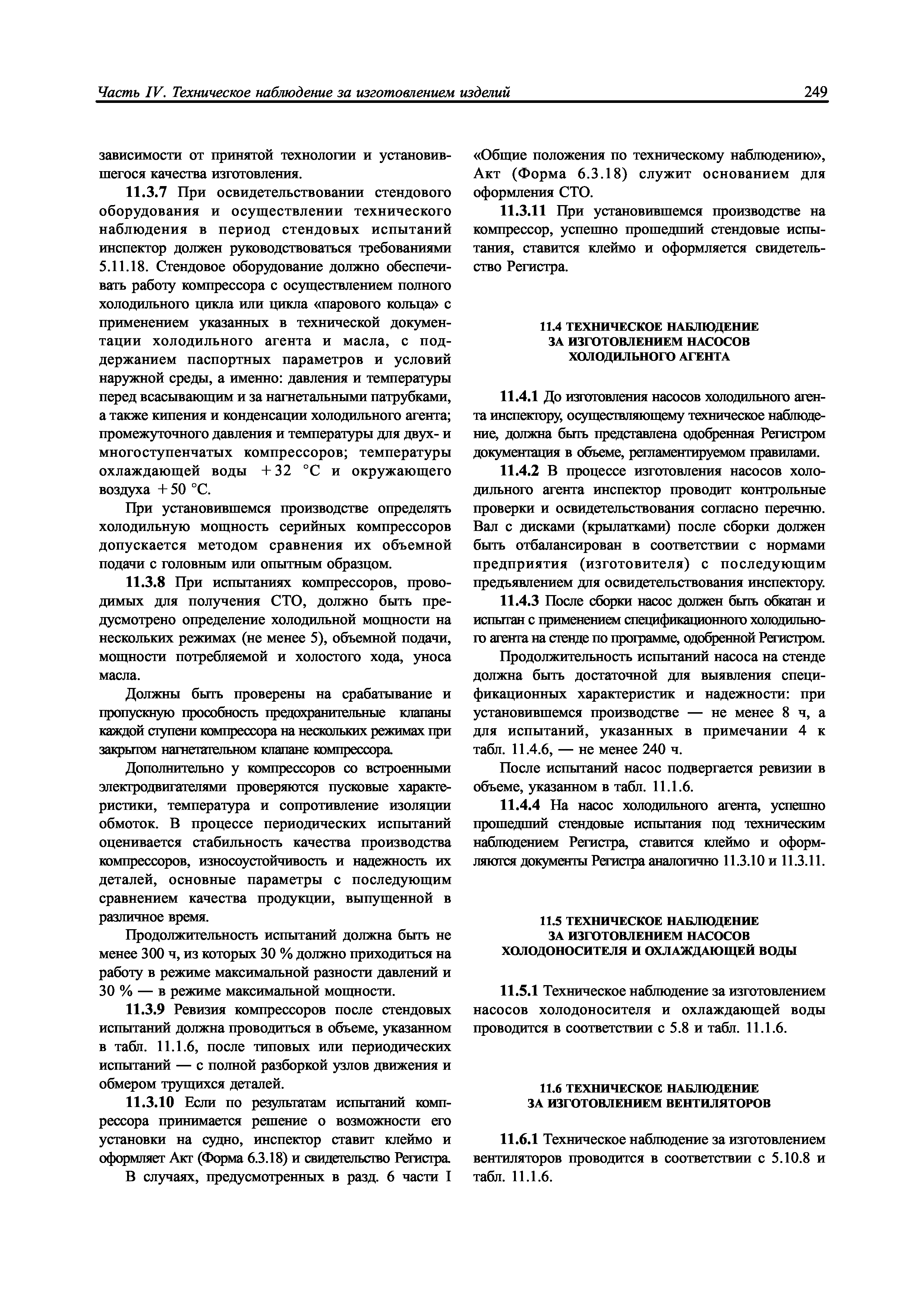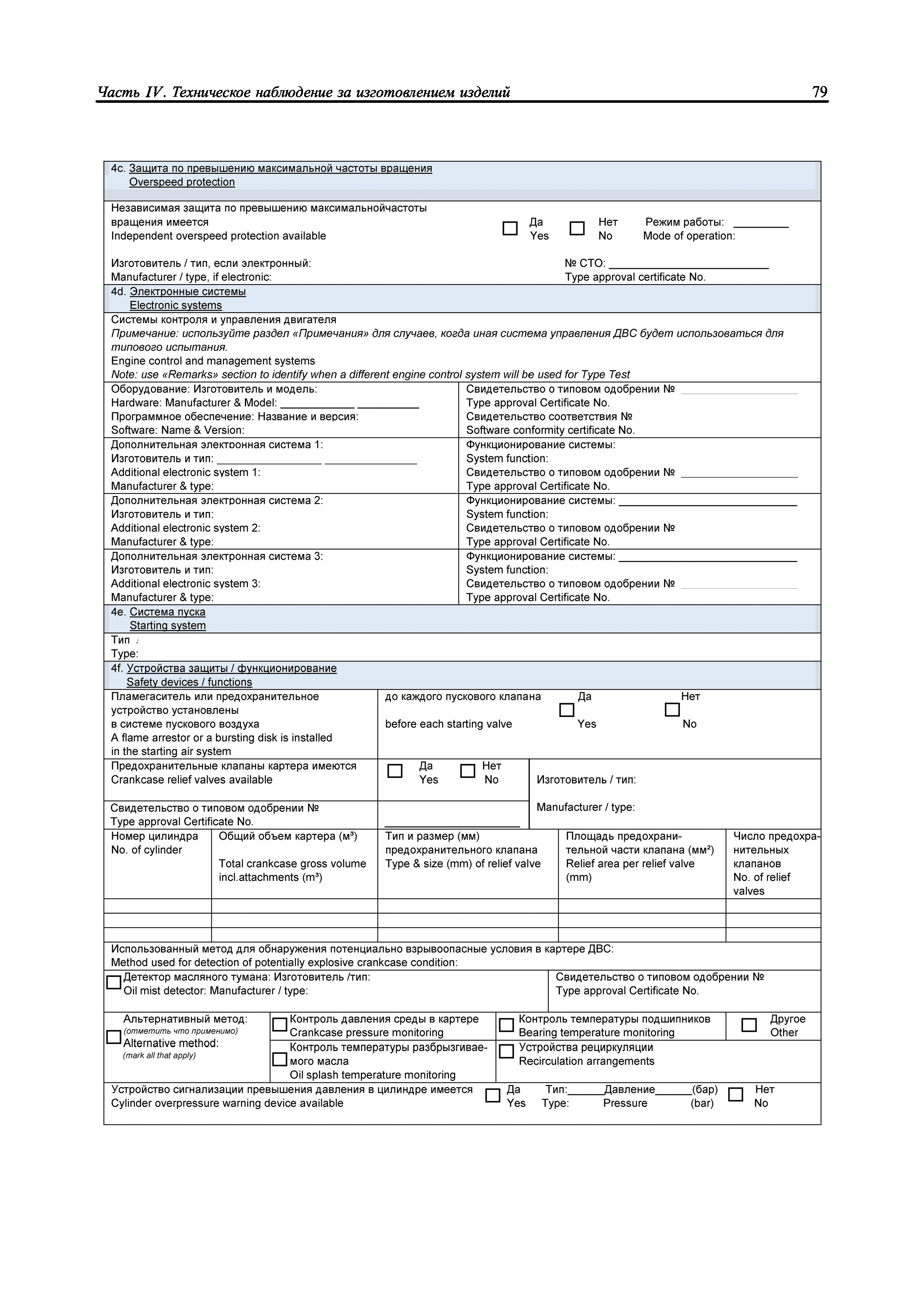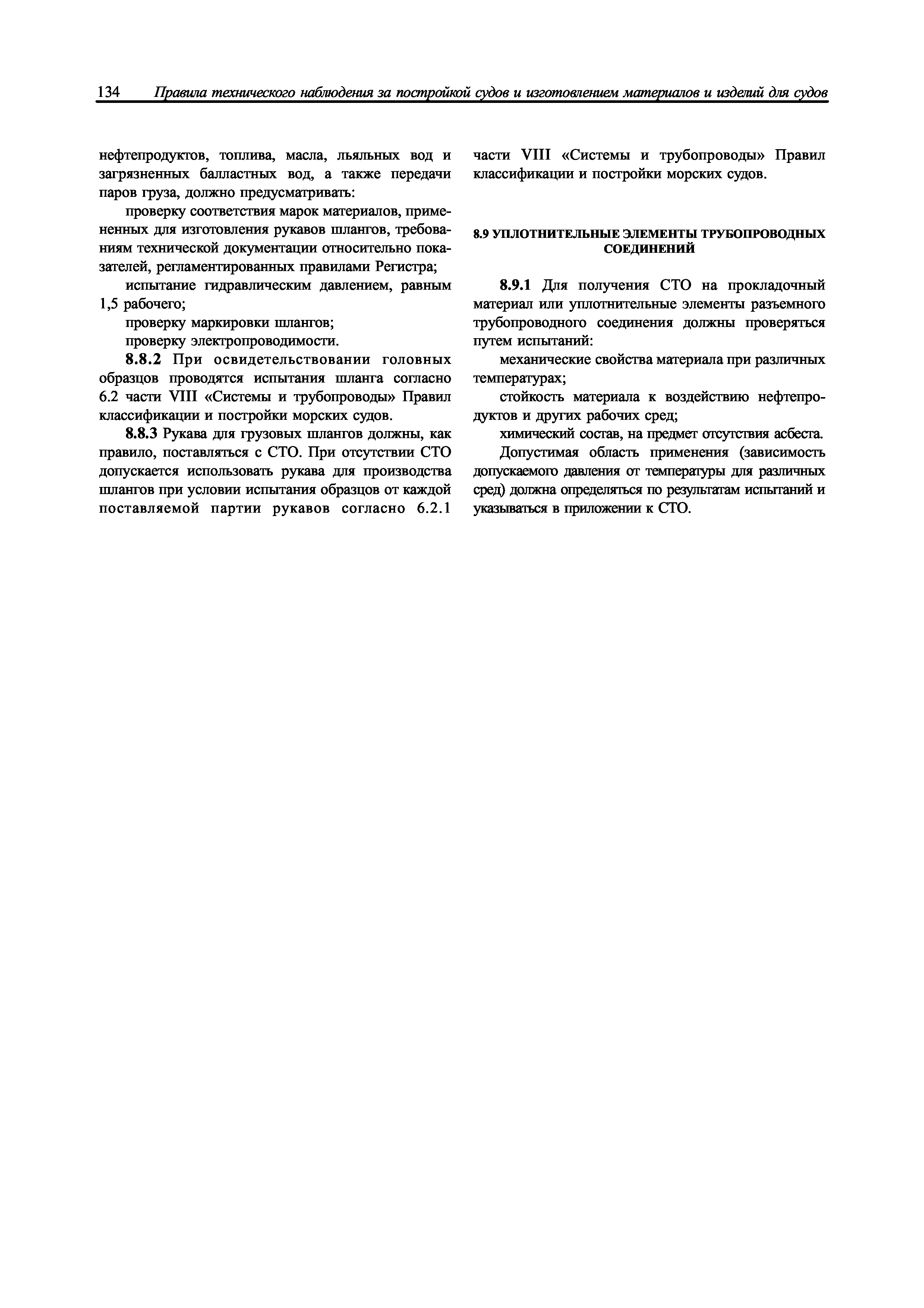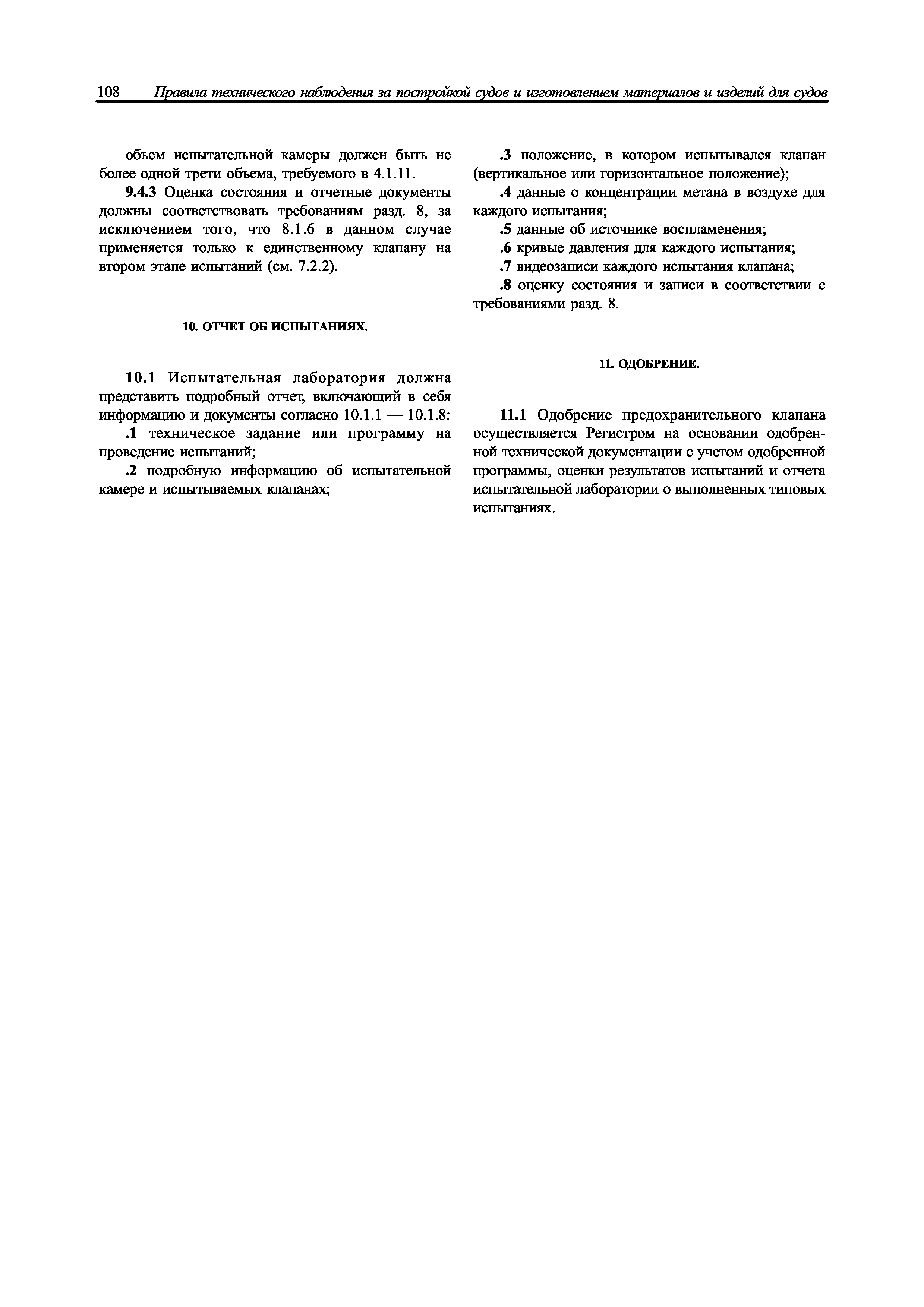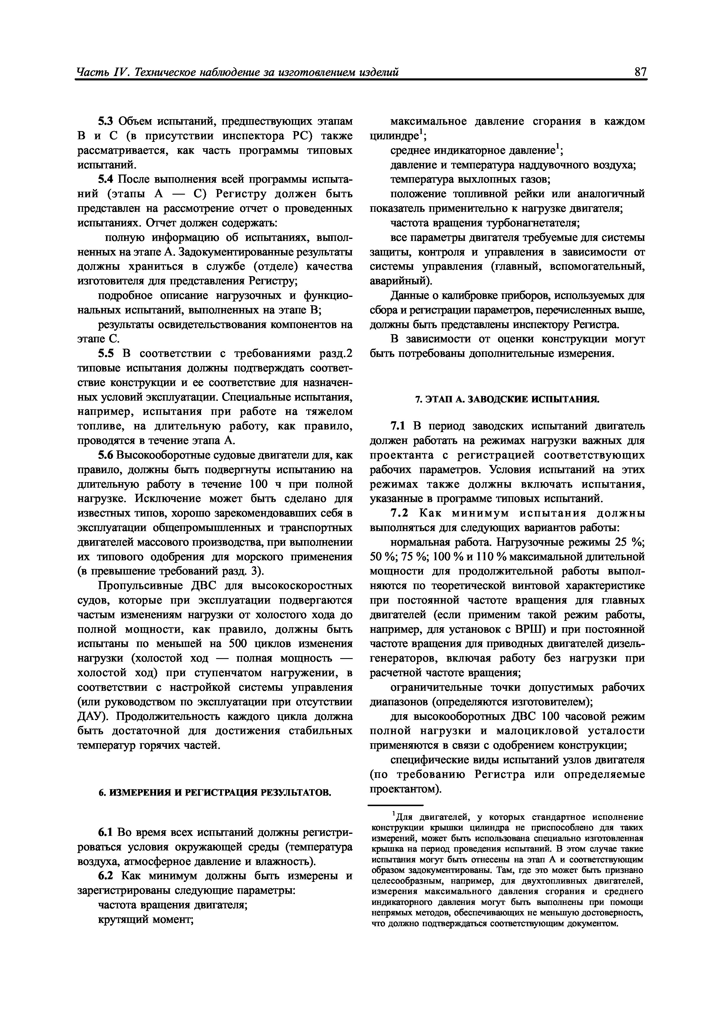 | Оглавление: | 1 Общие положения 1.1 Область распространения 1.2 Термины, определения, сокращения 1.3 Объем технического наблюдения 1.4 Техническая документация 1.5 Опытный образец изделия 1.6 Головной образец изделия 1.7 Серийные изделия установившегося производства 1.8 Эксплуатационные испытания изделий 2 Корпус 2.1 Общие положения 3 Устройства, оборудование и снабжение 3.1 Общие положения 3.2 Техническое наблюдение Регистра 3.3 Документация 3.4 Рулевые устройства 3.5 Якорные устройства 3.6 Швартовные устройства 3.7 Буксирные устройства 3.8 Сигнальные мачты 3.9 Устройства и закрытия отверстий в корпусе, надстройках и рубках 3.10 Устройство и оборудование помещений, различные устройства и оборудование, аварийное снабжение 3.11 Цепи без распорок, применяемые в судовых устройствах, кроме якорных 3.12 Стальные тросы 3.13 Растительные тросы и тросы из синтетического волокна (канаты) Приложение 1. Допустимые величины пороков на литых деталях якорей Приложение 2. Испытание якорей и их деталей бросанием Приложение 3. Испытание на растяжение пробной нагрузкой якорей и якорных скоб Приложение 4. Испытания буксирных гаков Приложение 5. Испытания головных образцов иллюминаторов, дверей надстройки и рубки, люков сходных, световых и вентиляционных Приложение 6. Испытания растительных тросов и тросов из синтетического волокна 4 Материалы, конструкции и изделия противопожарной защиты 4.1 Общие положения 4.2 Материалы, конструкции и изделия конструктивной противопожарной защиты 4.3 Изделия систем пожаротушения, противопожарного снабжения и огнетушащие вещества 5 Механизмы 5.1 Общие положения 5.2 Главные и вспомогательные двигатели внутреннего сгорания мощностью 55 кВт и более 5.3 Вспомогательные двигатели внутреннего сгорания мощностью менее 55 кВт 5.4 Главные паровые турбины и турбины электрогенераторов 5.5 Вспомогательные паровые турбины 5.6 Главные газотурбинные двигатели (ГТД) и газовые турбины (ГТ) для привода электрогенераторов 5.7 Передачи и разобщительные муфты главных и вспомогательных механизмов 5.8 Вспомогательные механизмы 5.9 Детали механизмов, перечисленных в таблице 5.8.1 5.10 Палубные механизмы 5.11 Телеграфы механические 5.12 Стендовые испытания 5.13 Документы Регистра 5.14 Документы Регистра для технического наблюдения за изготовлением и одобрения ДВС Приложение 1.Термины и определения (применительно к разд. 5 "Механизмы") (приведены в строгом соответствии с Приложением 1 "Глоссарий" УТ М44 (Rev.8 Mar 2015) МАКО) Приложение 2. Порядок представления и прохождения документации Приложение 3. Форма заявки на типовое одобрение ДВС и основные технические данные (в соответствии с приложением 3 к УТ МАКО М44, изм. 9) Приложение 4. Таблица соответствия документации и данных по ДВС лицензиара и лицензиата Приложение 5. Образец формы подтверждения лицензиаром изменений конструкции ДВС, выполненных лицензиатом Приложение 6. Типовые испытания ДВС Приложение 7. Стендовые испытания ДВС (заводские приемочные испытания) и испытания ДВС после установки на судне Приложение 8. Порядок освидетельствования и оформления документов на компоненты ДВС Приложение 9. Порядок освидетельствования, испытаний, одобрения турбонагнетателей и их компоновки с ДВС Приложение 10. Процедура типового испытания для предохранительных клапанов картеров Приложение 11. Процедура типовых испытаний приборов обнар