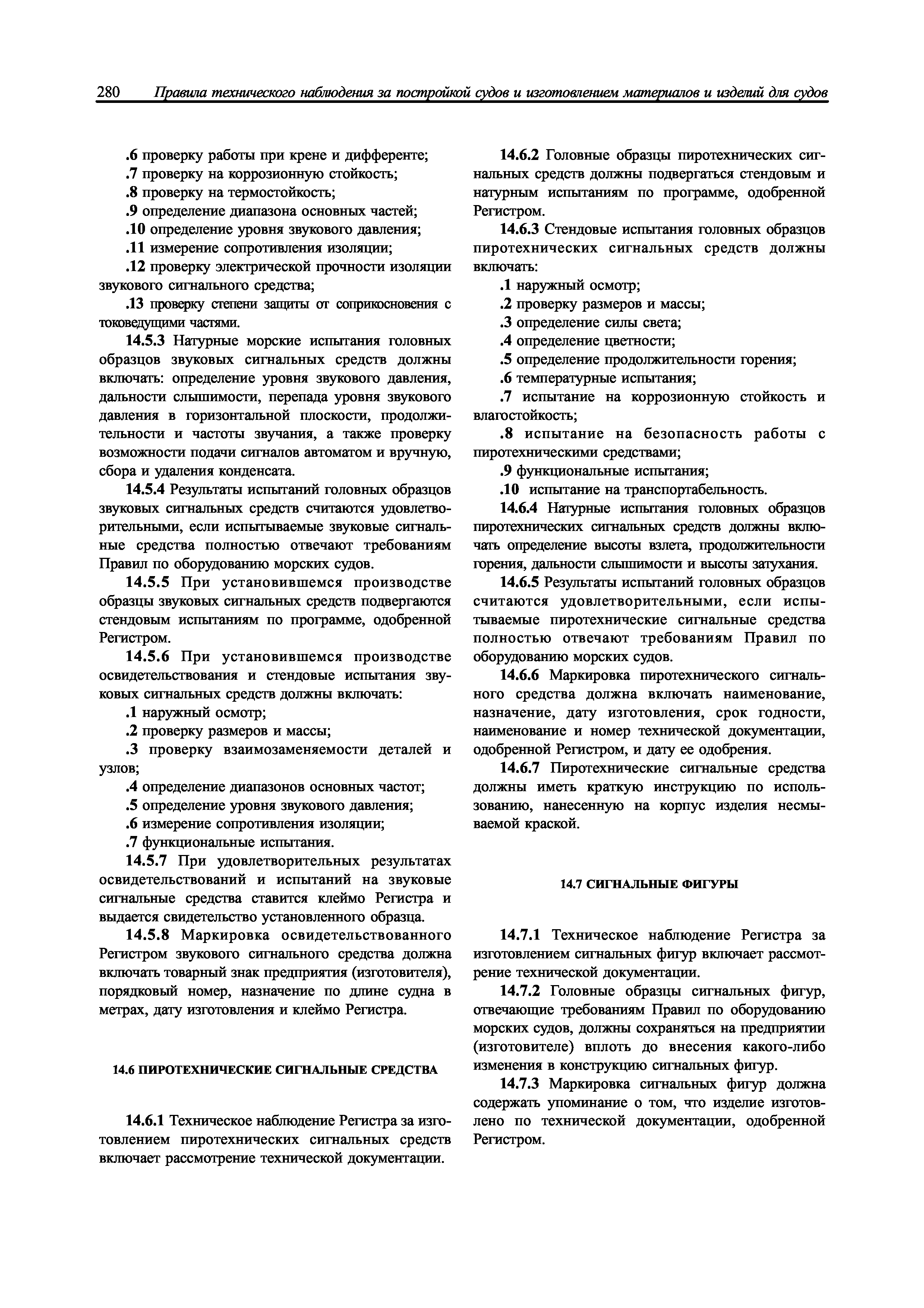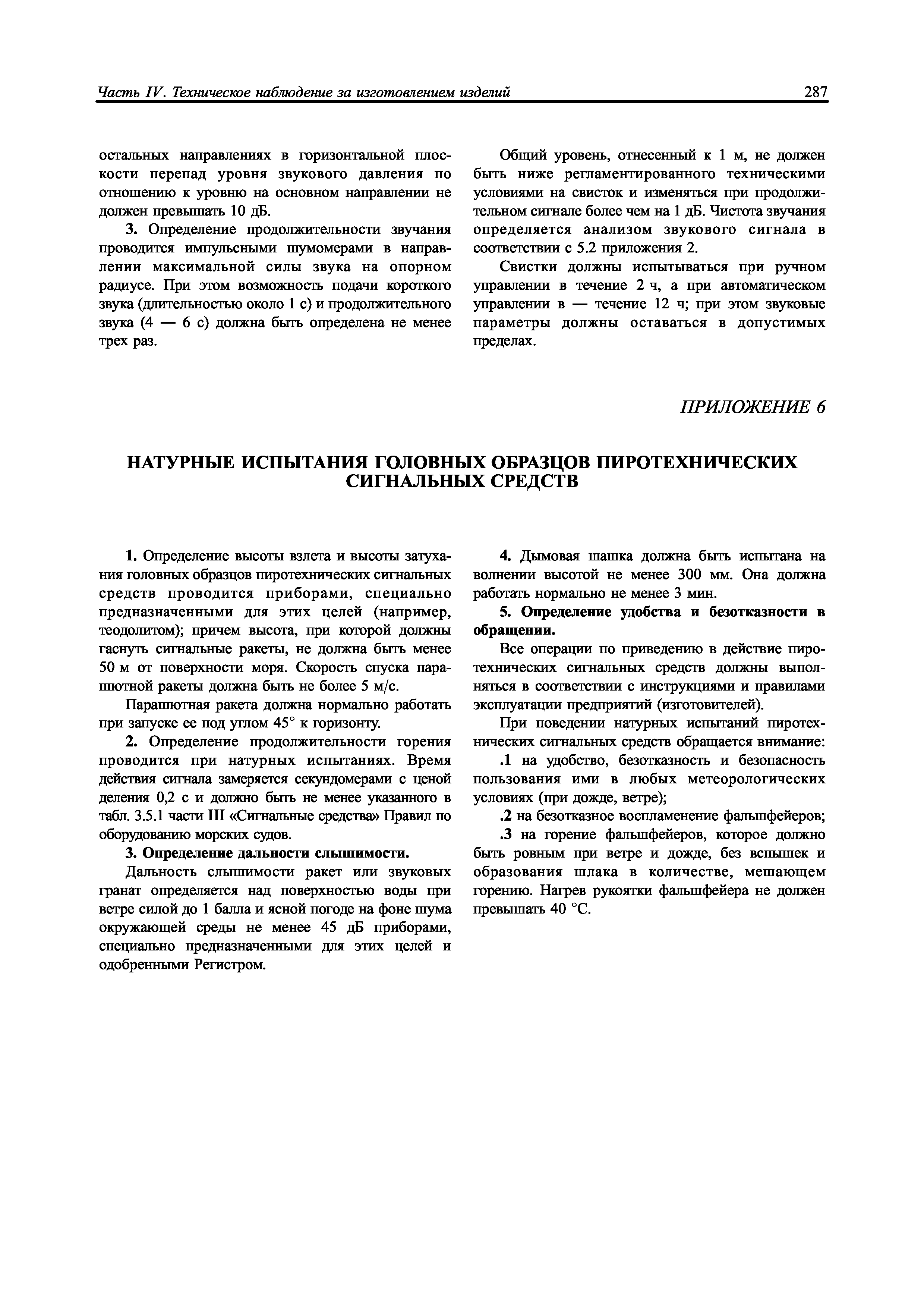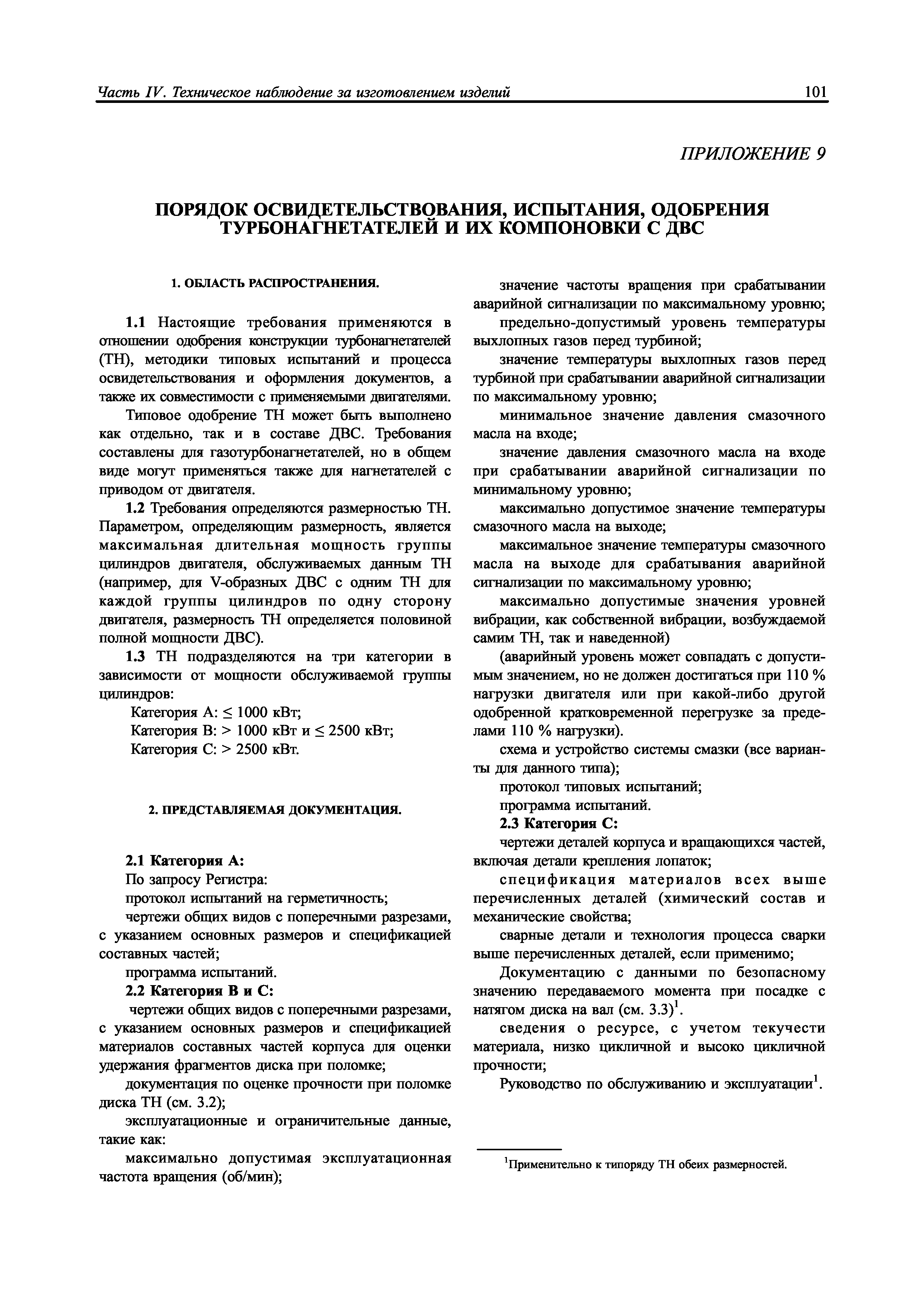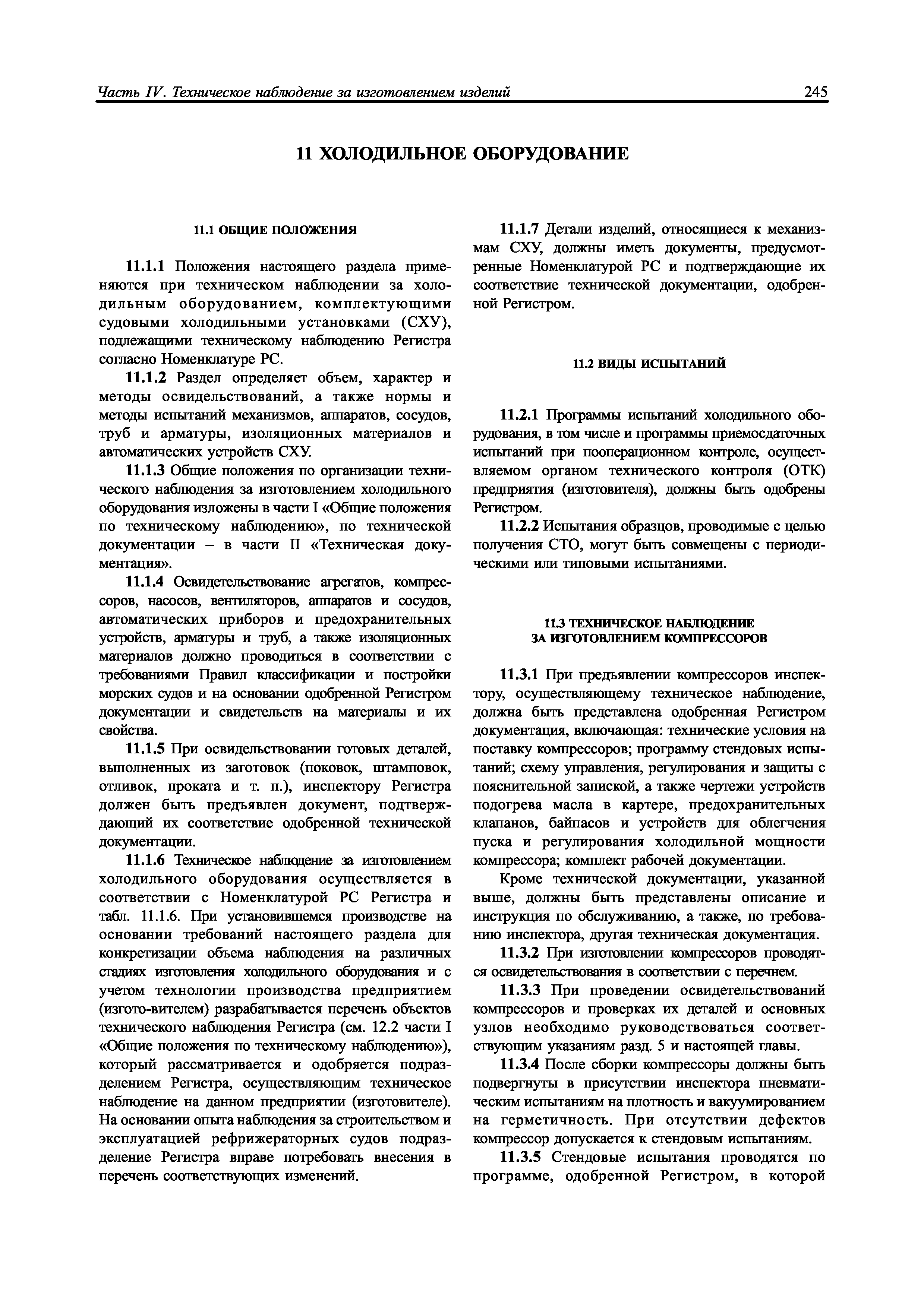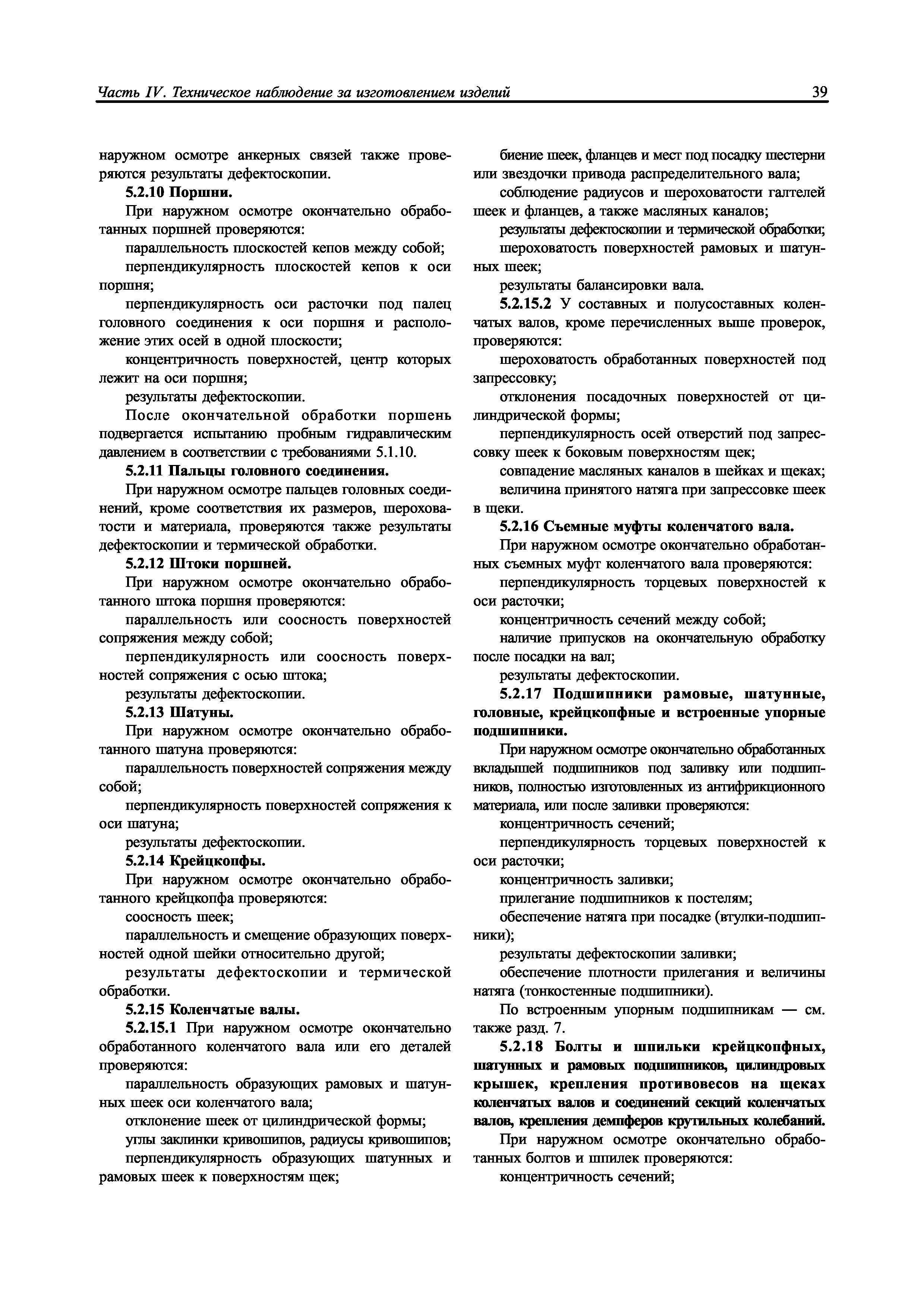 | Оглавление: | 1 Общие положения 1.1 Область распространения 1.2 Термины, определения, сокращения 1.3 Объем технического наблюдения 1.4 Техническая документация 1.5 Опытный образец изделия 1.6 Головной образец изделия 1.7 Серийные изделия установившегося производства 1.8 Эксплуатационные испытания изделий 2 Корпус 2.1 Общие положения 3 Устройства, оборудование и снабжение 3.1 Общие положения 3.2 Техническое наблюдение Регистра 3.3 Документация 3.4 Рулевые устройства 3.5 Якорные устройства 3.6 Швартовные устройства 3.7 Буксирные устройства 3.8 Сигнальные мачты 3.9 Устройства и закрытия отверстий в корпусе, надстройках и рубках 3.10 Устройство и оборудование помещений, различные устройства и оборудование, аварийное снабжение 3.11 Цепи без распорок, применяемые в судовых устройствах, кроме якорных 3.12 Стальные тросы 3.13 Растительные тросы и тросы из синтетического волокна (канаты) Приложение 1. Допустимые величины пороков на литых деталях якорей Приложение 2. Испытание якорей и их деталей бросанием Приложение 3. Испытание на растяжение пробной нагрузкой якорей и якорных скоб Приложение 4. Испытания буксирных гаков Приложение 5. Испытания головных образцов иллюминаторов, дверей надстройки и рубки, люков сходных, световых и вентиляционных Приложение 6. Испытания растительных тросов и тросов из синтетического волокна 4 Материалы, конструкции и изделия противопожарной защиты 4.1 Общие положения 4.2 Материалы, конструкции и изделия конструктивной противопожарной защиты 4.3 Изделия систем пожаротушения, противопожарного снабжения и огнетушащие вещества 5 Механизмы 5.1 Общие положения 5.2 Главные и вспомогательные двигатели внутреннего сгорания мощностью 55 кВт и более 5.3 Вспомогательные двигатели внутреннего сгорания мощностью менее 55 кВт 5.4 Главные паровые турбины и турбины электрогенераторов 5.5 Вспомогательные паровые турбины 5.6 Главные газотурбинные двигатели (ГТД) и газовые турбины (ГТ) для привода электрогенераторов 5.7 Передачи и разобщительные муфты главных и вспомогательных механизмов 5.8 Вспомогательные механизмы 5.9 Детали механизмов, перечисленных в таблице 5.8.1 5.10 Палубные механизмы 5.11 Телеграфы механические 5.12 Стендовые испытания 5.13 Документы Регистра 5.14 Документы Регистра для технического наблюдения за изготовлением и одобрения ДВС Приложение 1.Термины и определения (применительно к разд. 5 "Механизмы") (приведены в строгом соответствии с Приложением 1 "Глоссарий" УТ М44 (Rev.8 Mar 2015) МАКО) Приложение 2. Порядок представления и прохождения документации Приложение 3. Форма заявки на типовое одобрение ДВС и основные технические данные (в соответствии с приложением 3 к УТ МАКО М44, изм. 9) Приложение 4. Таблица соответствия документации и данных по ДВС лицензиара и лицензиата Приложение 5. Образец формы подтверждения лицензиаром изменений конструкции ДВС, выполненных лицензиатом Приложение 6. Типовые испытания ДВС Приложение 7. Стендовые испытания ДВС (заводские приемочные испытания) и испытания ДВС после установки на судне Приложение 8. Порядок освидетельствования и оформления документов на компоненты ДВС Приложение 9. Порядок освидетельствования, испытаний, одобрения турбонагнетателей и их компоновки с ДВС Приложение 10. Процедура типового испытания для предохранительных клапанов картеров Приложение 11. Процедура типовых испытаний приборов обнар
