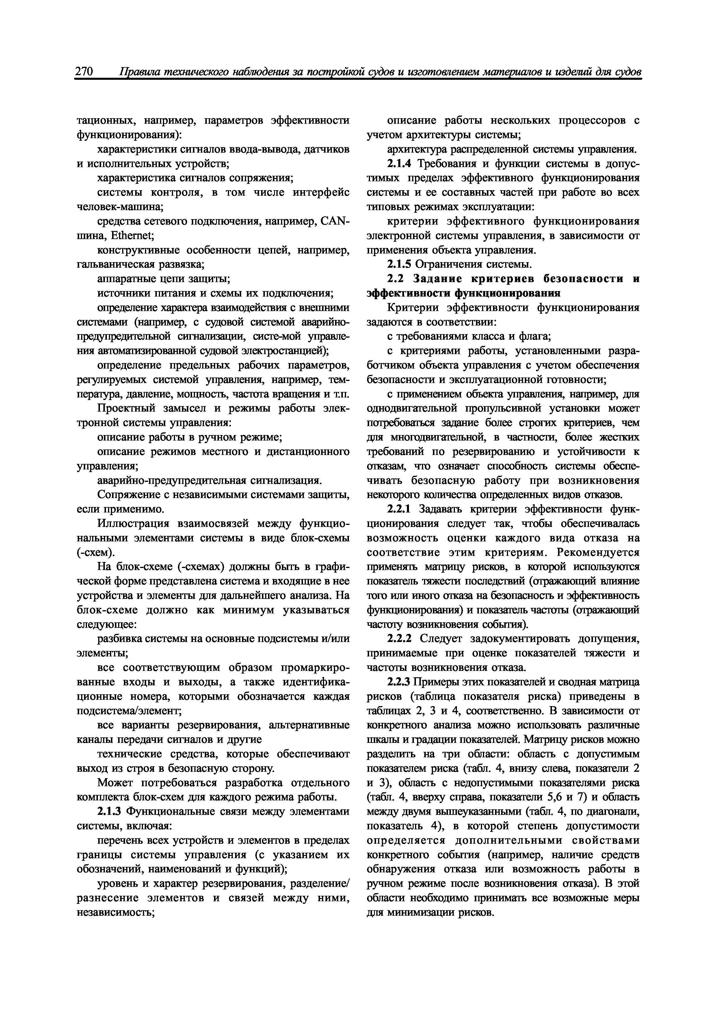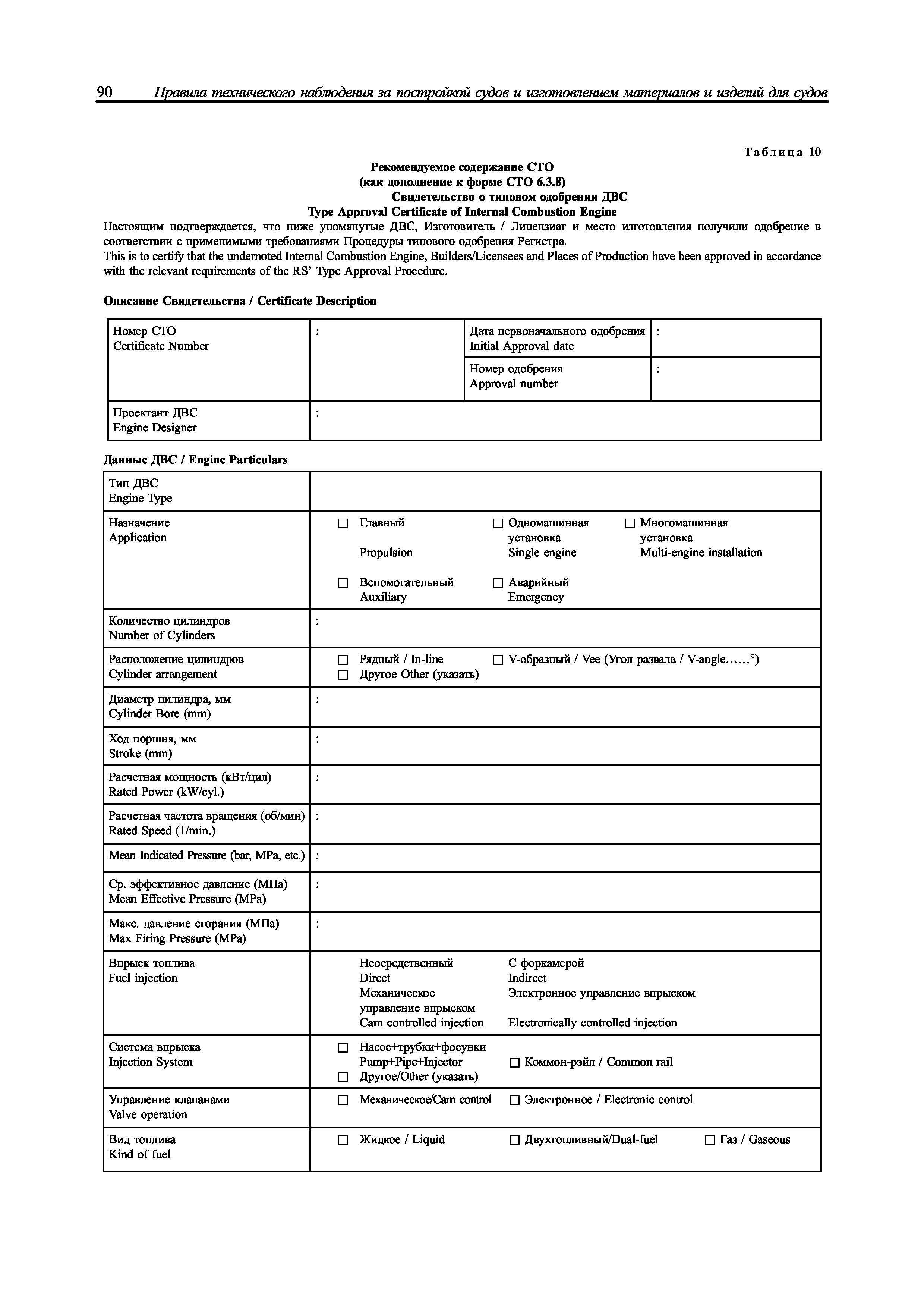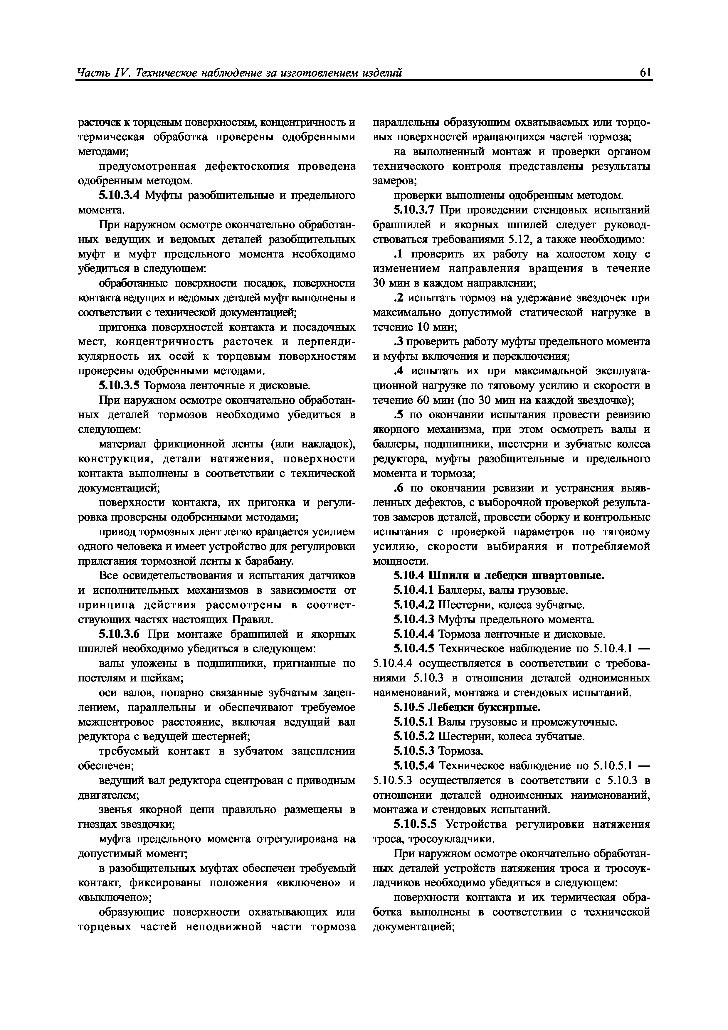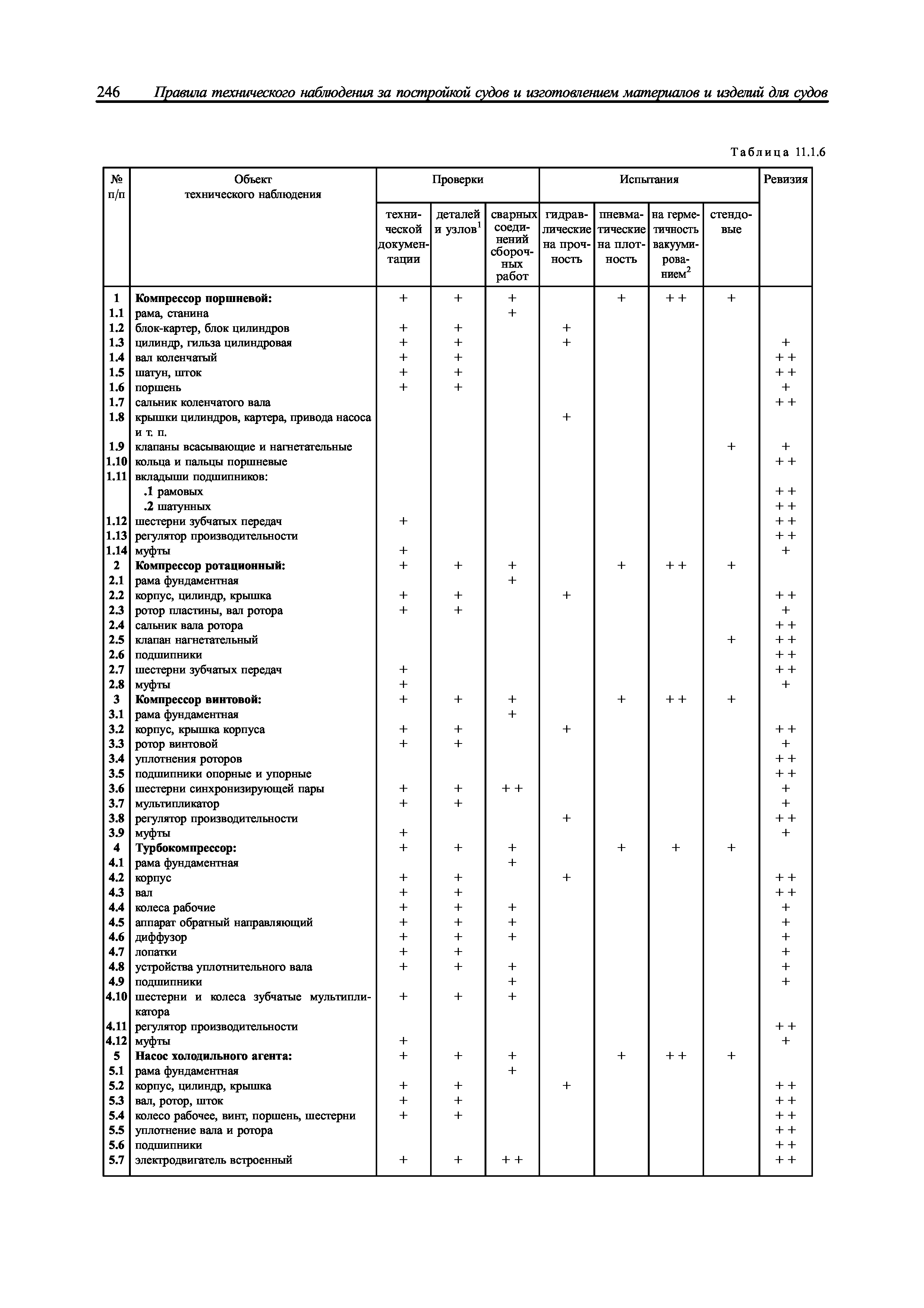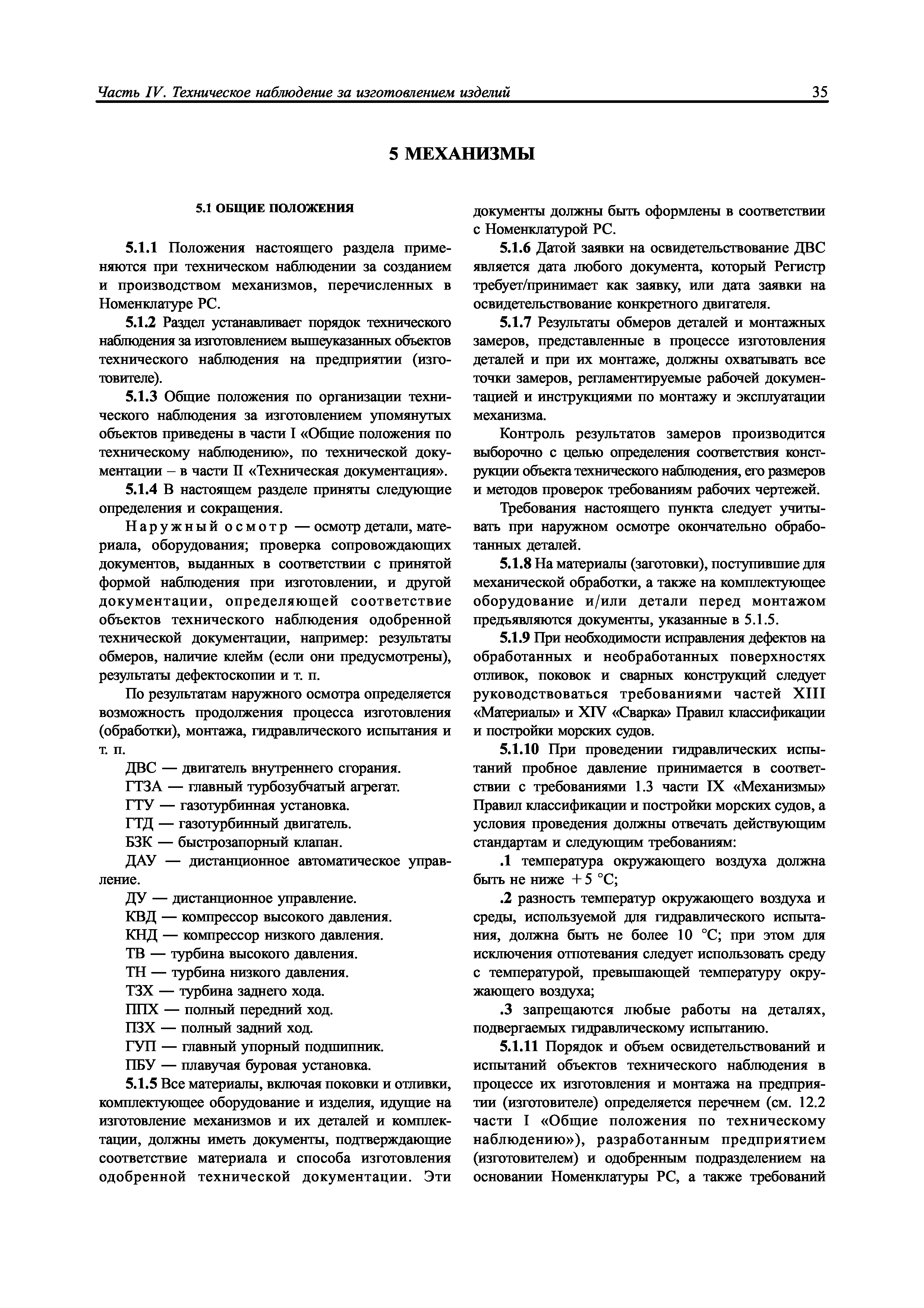 | Оглавление: | 1 Общие положения 1.1 Область распространения 1.2 Термины, определения, сокращения 1.3 Объем технического наблюдения 1.4 Техническая документация 1.5 Опытный образец изделия 1.6 Головной образец изделия 1.7 Серийные изделия установившегося производства 1.8 Эксплуатационные испытания изделий 2 Корпус 2.1 Общие положения 3 Устройства, оборудование и снабжение 3.1 Общие положения 3.2 Техническое наблюдение Регистра 3.3 Документация 3.4 Рулевые устройства 3.5 Якорные устройства 3.6 Швартовные устройства 3.7 Буксирные устройства 3.8 Сигнальные мачты 3.9 Устройства и закрытия отверстий в корпусе, надстройках и рубках 3.10 Устройство и оборудование помещений, различные устройства и оборудование, аварийное снабжение 3.11 Цепи без распорок, применяемые в судовых устройствах, кроме якорных 3.12 Стальные тросы 3.13 Растительные тросы и тросы из синтетического волокна (канаты) Приложение 1. Допустимые величины пороков на литых деталях якорей Приложение 2. Испытание якорей и их деталей бросанием Приложение 3. Испытание на растяжение пробной нагрузкой якорей и якорных скоб Приложение 4. Испытания буксирных гаков Приложение 5. Испытания головных образцов иллюминаторов, дверей надстройки и рубки, люков сходных, световых и вентиляционных Приложение 6. Испытания растительных тросов и тросов из синтетического волокна 4 Материалы, конструкции и изделия противопожарной защиты 4.1 Общие положения 4.2 Материалы, конструкции и изделия конструктивной противопожарной защиты 4.3 Изделия систем пожаротушения, противопожарного снабжения и огнетушащие вещества 5 Механизмы 5.1 Общие положения 5.2 Главные и вспомогательные двигатели внутреннего сгорания мощностью 55 кВт и более 5.3 Вспомогательные двигатели внутреннего сгорания мощностью менее 55 кВт 5.4 Главные паровые турбины и турбины электрогенераторов 5.5 Вспомогательные паровые турбины 5.6 Главные газотурбинные двигатели (ГТД) и газовые турбины (ГТ) для привода электрогенераторов 5.7 Передачи и разобщительные муфты главных и вспомогательных механизмов 5.8 Вспомогательные механизмы 5.9 Детали механизмов, перечисленных в таблице 5.8.1 5.10 Палубные механизмы 5.11 Телеграфы механические 5.12 Стендовые испытания 5.13 Документы Регистра 5.14 Документы Регистра для технического наблюдения за изготовлением и одобрения ДВС Приложение 1.Термины и определения (применительно к разд. 5 "Механизмы") (приведены в строгом соответствии с Приложением 1 "Глоссарий" УТ М44 (Rev.8 Mar 2015) МАКО) Приложение 2. Порядок представления и прохождения документации Приложение 3. Форма заявки на типовое одобрение ДВС и основные технические данные (в соответствии с приложением 3 к УТ МАКО М44, изм. 9) Приложение 4. Таблица соответствия документации и данных по ДВС лицензиара и лицензиата Приложение 5. Образец формы подтверждения лицензиаром изменений конструкции ДВС, выполненных лицензиатом Приложение 6. Типовые испытания ДВС Приложение 7. Стендовые испытания ДВС (заводские приемочные испытания) и испытания ДВС после установки на судне Приложение 8. Порядок освидетельствования и оформления документов на компоненты ДВС Приложение 9. Порядок освидетельствования, испытаний, одобрения турбонагнетателей и их компоновки с ДВС Приложение 10. Процедура типового испытания для предохранительных клапанов картеров Приложение 11. Процедура типовых испытаний приборов обнар