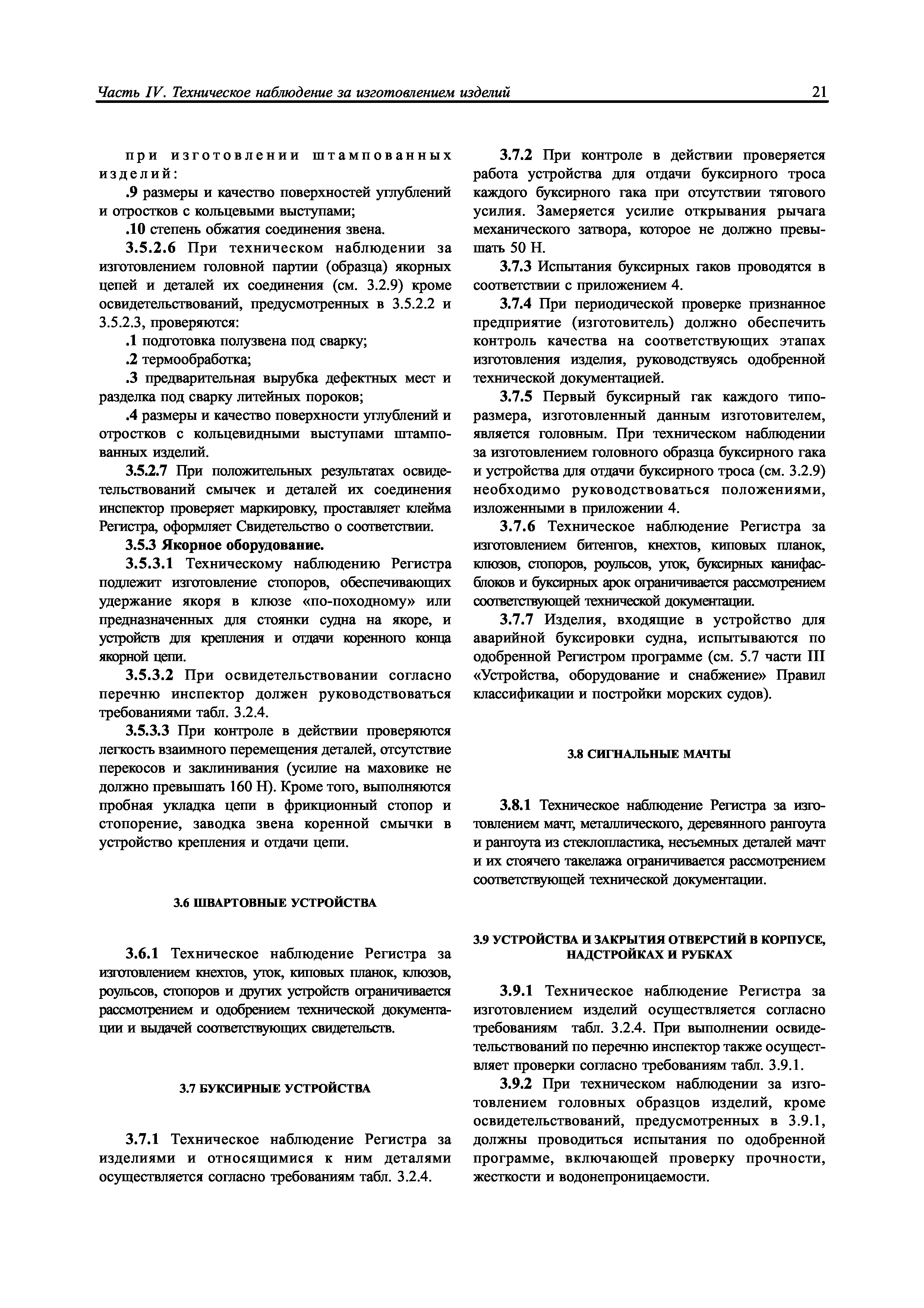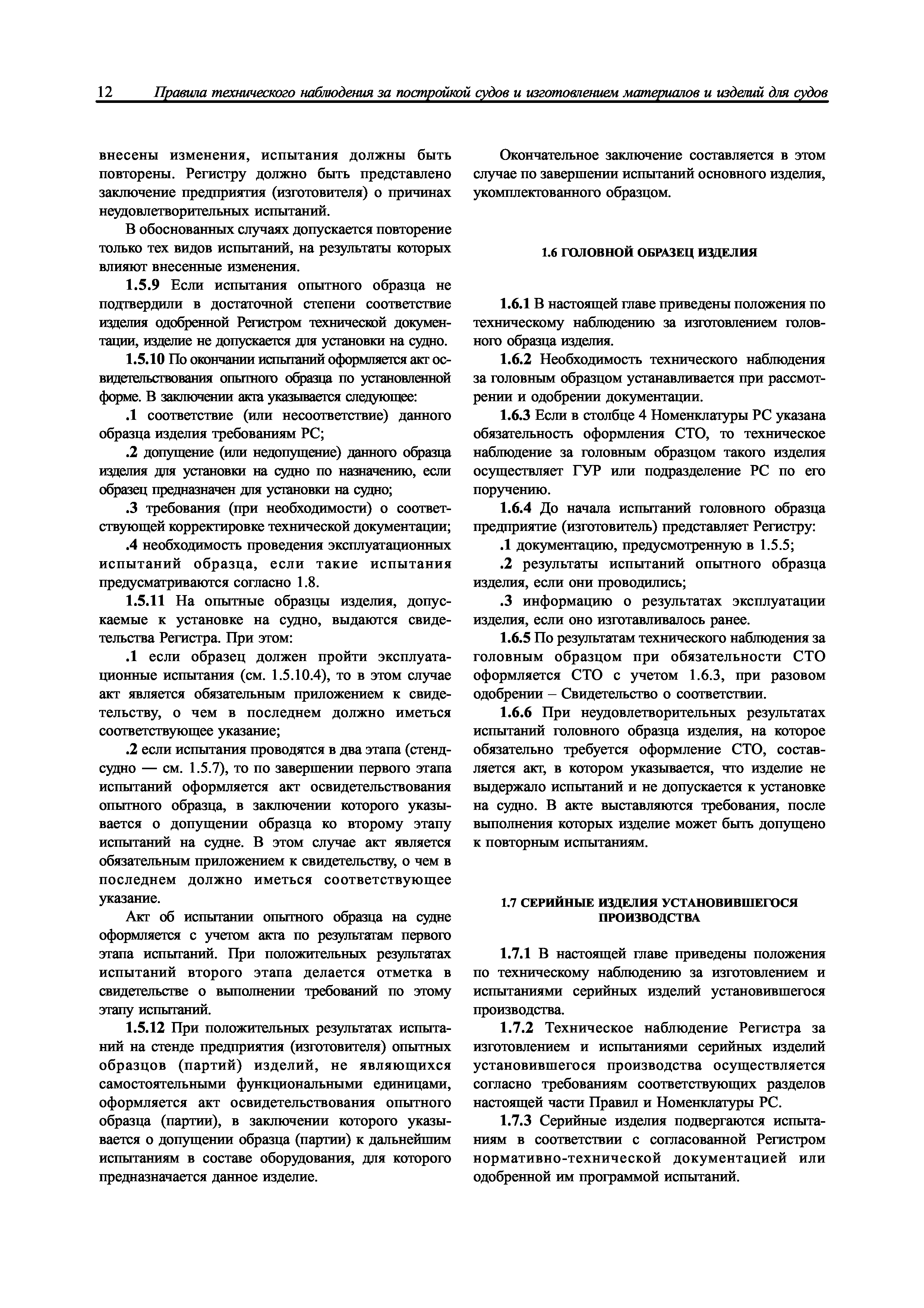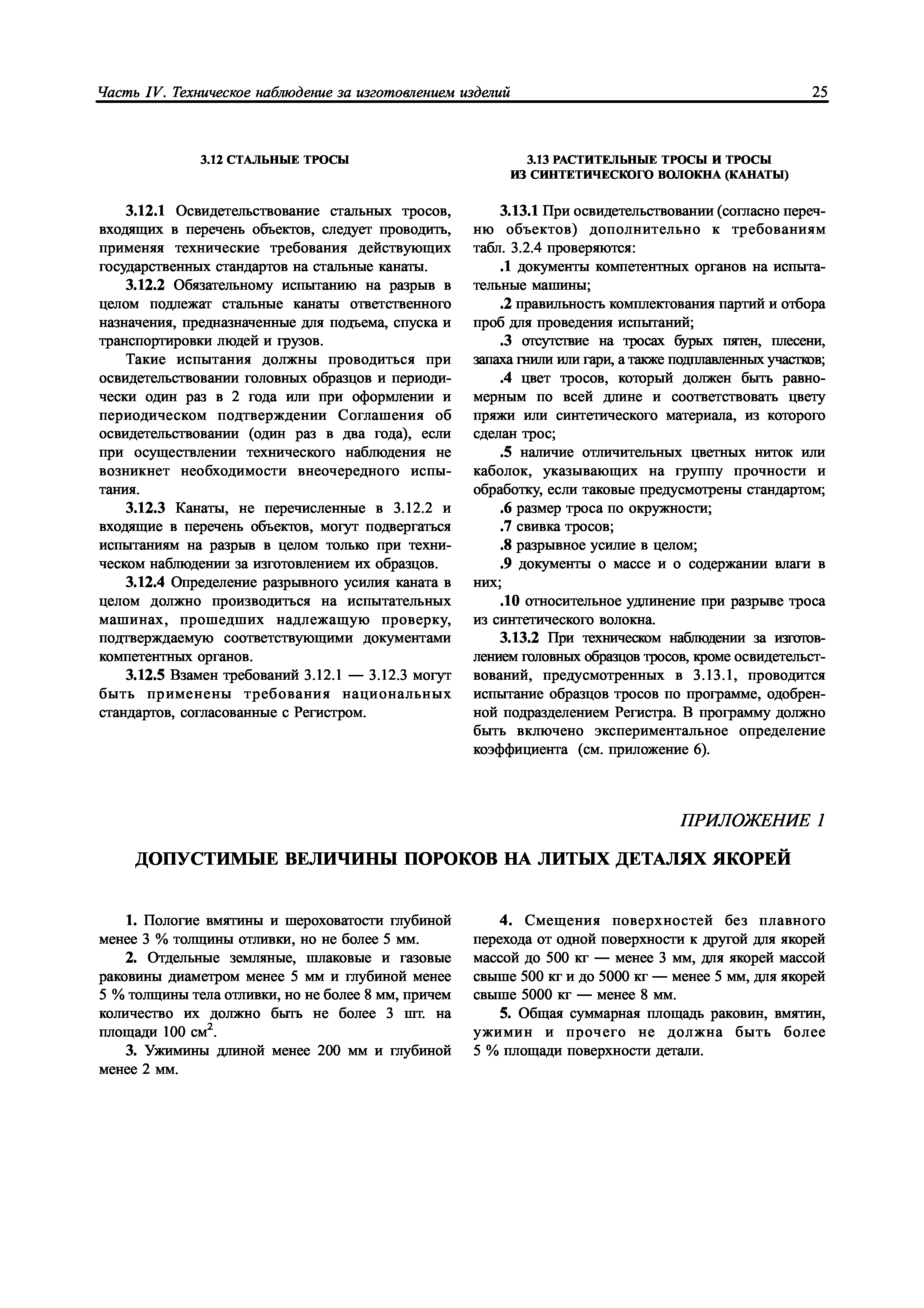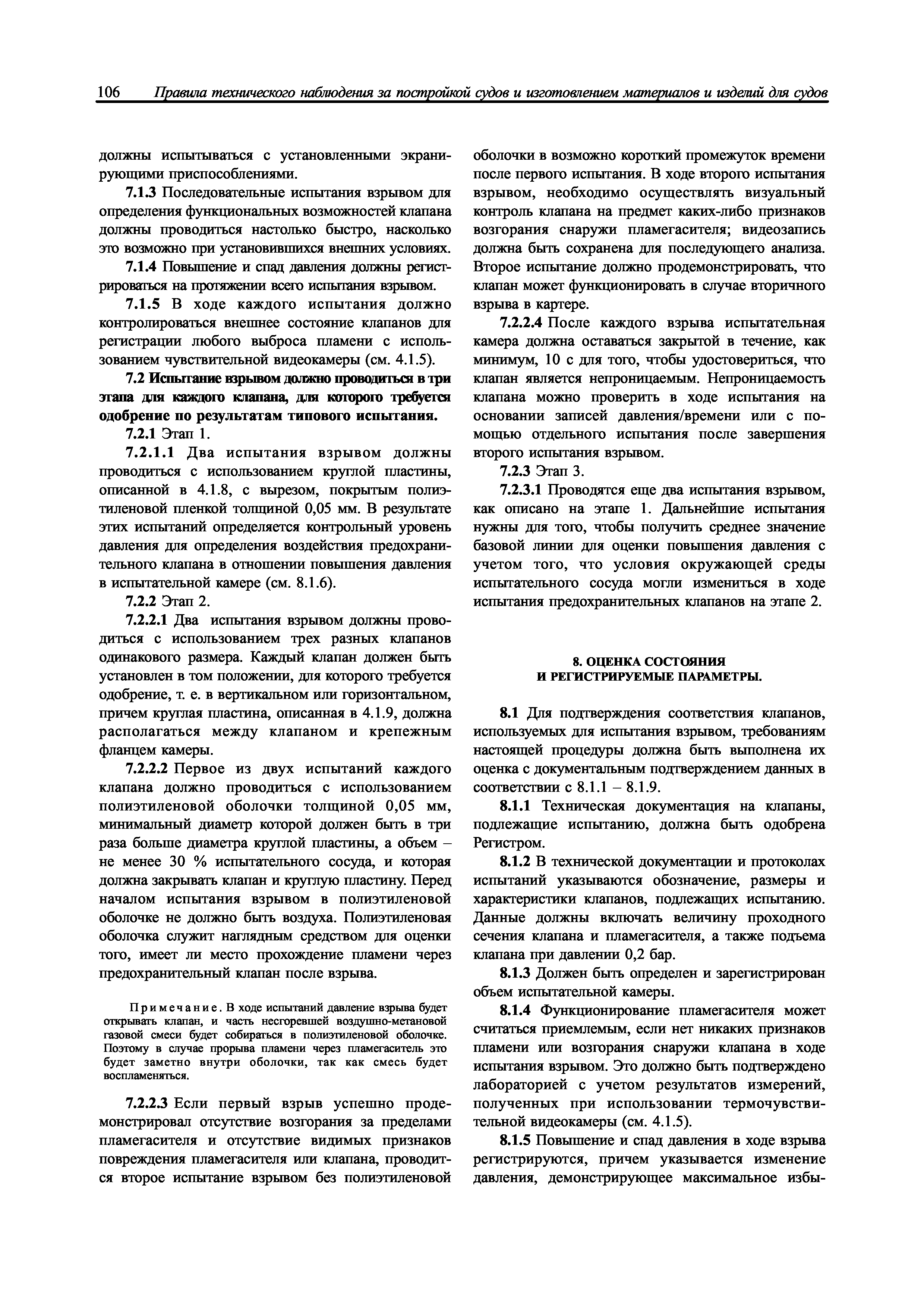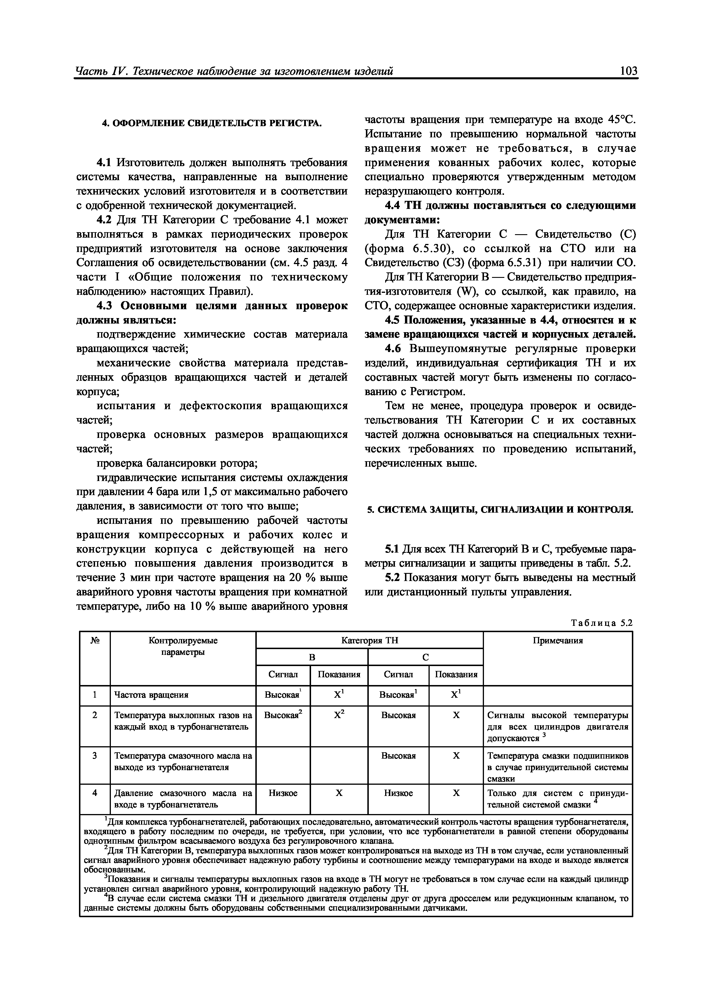 | Оглавление: | 1 Общие положения 1.1 Область распространения 1.2 Термины, определения, сокращения 1.3 Объем технического наблюдения 1.4 Техническая документация 1.5 Опытный образец изделия 1.6 Головной образец изделия 1.7 Серийные изделия установившегося производства 1.8 Эксплуатационные испытания изделий 2 Корпус 2.1 Общие положения 3 Устройства, оборудование и снабжение 3.1 Общие положения 3.2 Техническое наблюдение Регистра 3.3 Документация 3.4 Рулевые устройства 3.5 Якорные устройства 3.6 Швартовные устройства 3.7 Буксирные устройства 3.8 Сигнальные мачты 3.9 Устройства и закрытия отверстий в корпусе, надстройках и рубках 3.10 Устройство и оборудование помещений, различные устройства и оборудование, аварийное снабжение 3.11 Цепи без распорок, применяемые в судовых устройствах, кроме якорных 3.12 Стальные тросы 3.13 Растительные тросы и тросы из синтетического волокна (канаты) Приложение 1. Допустимые величины пороков на литых деталях якорей Приложение 2. Испытание якорей и их деталей бросанием Приложение 3. Испытание на растяжение пробной нагрузкой якорей и якорных скоб Приложение 4. Испытания буксирных гаков Приложение 5. Испытания головных образцов иллюминаторов, дверей надстройки и рубки, люков сходных, световых и вентиляционных Приложение 6. Испытания растительных тросов и тросов из синтетического волокна 4 Материалы, конструкции и изделия противопожарной защиты 4.1 Общие положения 4.2 Материалы, конструкции и изделия конструктивной противопожарной защиты 4.3 Изделия систем пожаротушения, противопожарного снабжения и огнетушащие вещества 5 Механизмы 5.1 Общие положения 5.2 Главные и вспомогательные двигатели внутреннего сгорания мощностью 55 кВт и более 5.3 Вспомогательные двигатели внутреннего сгорания мощностью менее 55 кВт 5.4 Главные паровые турбины и турбины электрогенераторов 5.5 Вспомогательные паровые турбины 5.6 Главные газотурбинные двигатели (ГТД) и газовые турбины (ГТ) для привода электрогенераторов 5.7 Передачи и разобщительные муфты главных и вспомогательных механизмов 5.8 Вспомогательные механизмы 5.9 Детали механизмов, перечисленных в таблице 5.8.1 5.10 Палубные механизмы 5.11 Телеграфы механические 5.12 Стендовые испытания 5.13 Документы Регистра 5.14 Документы Регистра для технического наблюдения за изготовлением и одобрения ДВС Приложение 1.Термины и определения (применительно к разд. 5 "Механизмы") (приведены в строгом соответствии с Приложением 1 "Глоссарий" УТ М44 (Rev.8 Mar 2015) МАКО) Приложение 2. Порядок представления и прохождения документации Приложение 3. Форма заявки на типовое одобрение ДВС и основные технические данные (в соответствии с приложением 3 к УТ МАКО М44, изм. 9) Приложение 4. Таблица соответствия документации и данных по ДВС лицензиара и лицензиата Приложение 5. Образец формы подтверждения лицензиаром изменений конструкции ДВС, выполненных лицензиатом Приложение 6. Типовые испытания ДВС Приложение 7. Стендовые испытания ДВС (заводские приемочные испытания) и испытания ДВС после установки на судне Приложение 8. Порядок освидетельствования и оформления документов на компоненты ДВС Приложение 9. Порядок освидетельствования, испытаний, одобрения турбонагнетателей и их компоновки с ДВС Приложение 10. Процедура типового испытания для предохранительных клапанов картеров Приложение 11. Процедура типовых испытаний приборов обнар