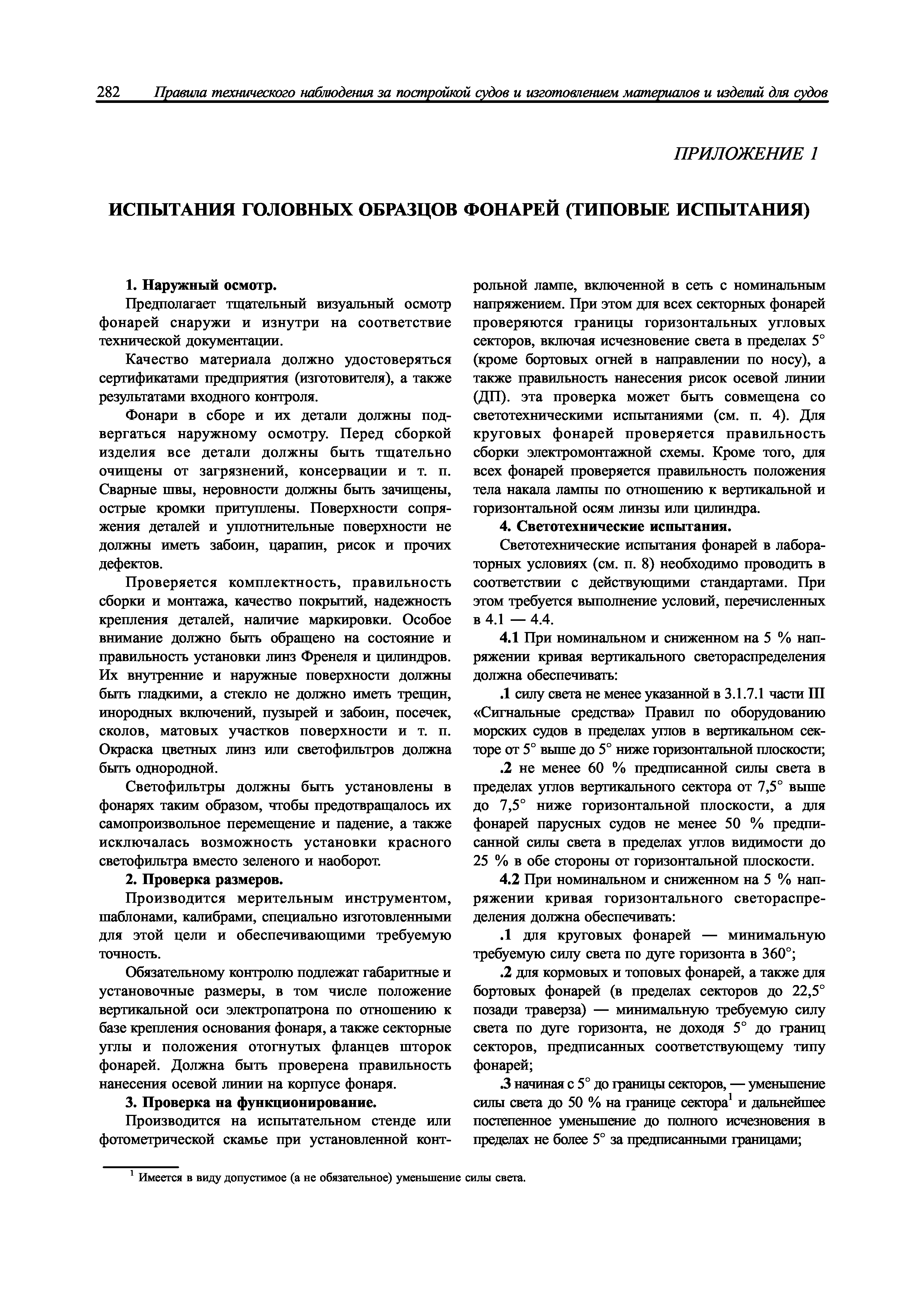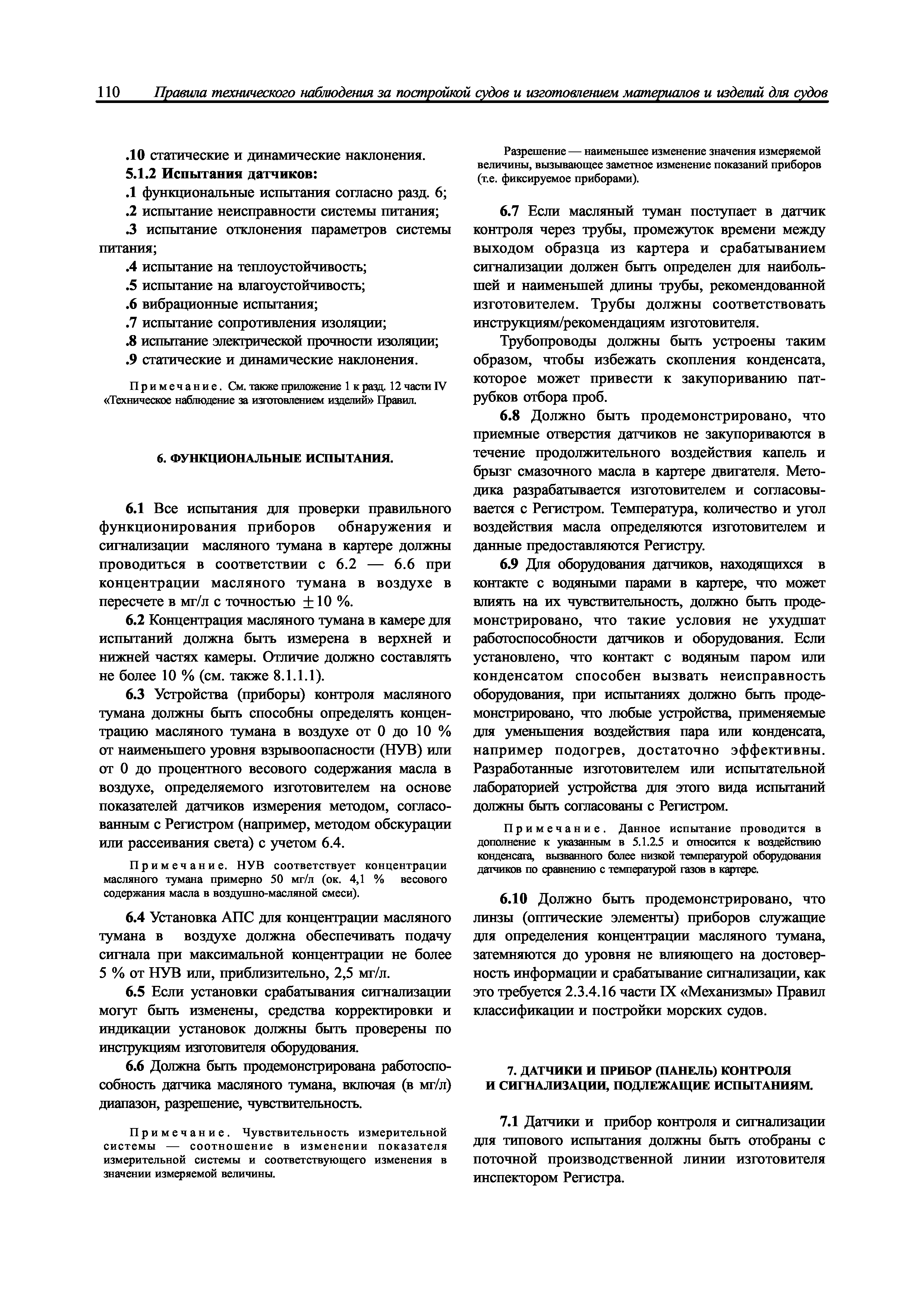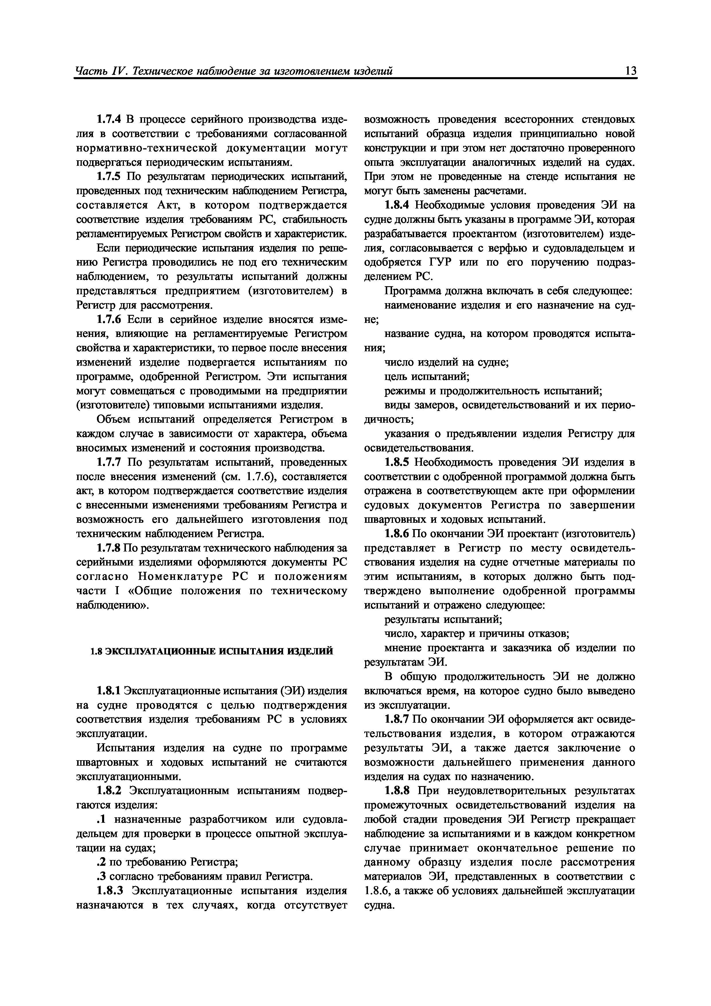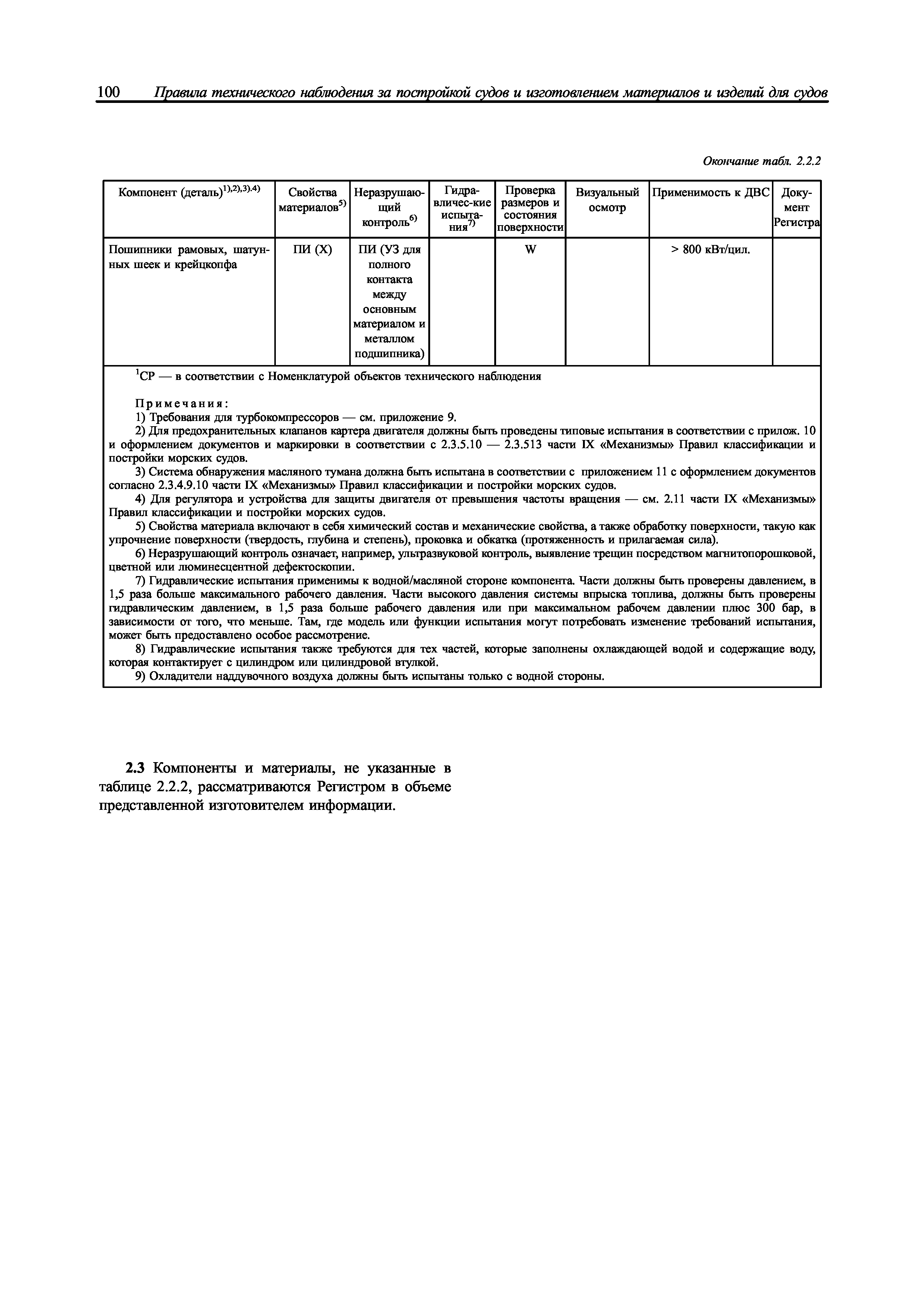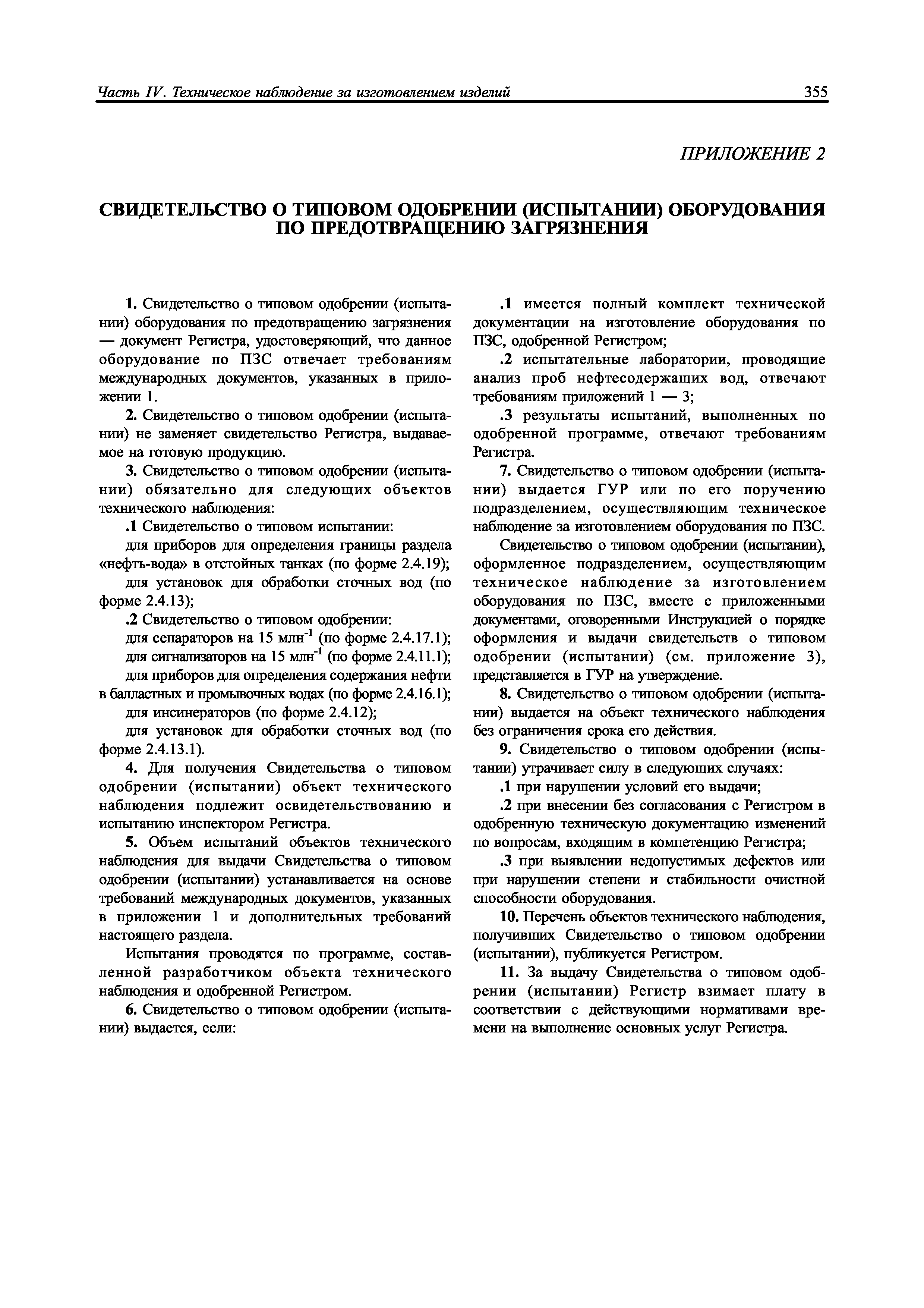 | Оглавление: | 1 Общие положения 1.1 Область распространения 1.2 Термины, определения, сокращения 1.3 Объем технического наблюдения 1.4 Техническая документация 1.5 Опытный образец изделия 1.6 Головной образец изделия 1.7 Серийные изделия установившегося производства 1.8 Эксплуатационные испытания изделий 2 Корпус 2.1 Общие положения 3 Устройства, оборудование и снабжение 3.1 Общие положения 3.2 Техническое наблюдение Регистра 3.3 Документация 3.4 Рулевые устройства 3.5 Якорные устройства 3.6 Швартовные устройства 3.7 Буксирные устройства 3.8 Сигнальные мачты 3.9 Устройства и закрытия отверстий в корпусе, надстройках и рубках 3.10 Устройство и оборудование помещений, различные устройства и оборудование, аварийное снабжение 3.11 Цепи без распорок, применяемые в судовых устройствах, кроме якорных 3.12 Стальные тросы 3.13 Растительные тросы и тросы из синтетического волокна (канаты) Приложение 1. Допустимые величины пороков на литых деталях якорей Приложение 2. Испытание якорей и их деталей бросанием Приложение 3. Испытание на растяжение пробной нагрузкой якорей и якорных скоб Приложение 4. Испытания буксирных гаков Приложение 5. Испытания головных образцов иллюминаторов, дверей надстройки и рубки, люков сходных, световых и вентиляционных Приложение 6. Испытания растительных тросов и тросов из синтетического волокна 4 Материалы, конструкции и изделия противопожарной защиты 4.1 Общие положения 4.2 Материалы, конструкции и изделия конструктивной противопожарной защиты 4.3 Изделия систем пожаротушения, противопожарного снабжения и огнетушащие вещества 5 Механизмы 5.1 Общие положения 5.2 Главные и вспомогательные двигатели внутреннего сгорания мощностью 55 кВт и более 5.3 Вспомогательные двигатели внутреннего сгорания мощностью менее 55 кВт 5.4 Главные паровые турбины и турбины электрогенераторов 5.5 Вспомогательные паровые турбины 5.6 Главные газотурбинные двигатели (ГТД) и газовые турбины (ГТ) для привода электрогенераторов 5.7 Передачи и разобщительные муфты главных и вспомогательных механизмов 5.8 Вспомогательные механизмы 5.9 Детали механизмов, перечисленных в таблице 5.8.1 5.10 Палубные механизмы 5.11 Телеграфы механические 5.12 Стендовые испытания 5.13 Документы Регистра 5.14 Документы Регистра для технического наблюдения за изготовлением и одобрения ДВС Приложение 1.Термины и определения (применительно к разд. 5 "Механизмы") (приведены в строгом соответствии с Приложением 1 "Глоссарий" УТ М44 (Rev.8 Mar 2015) МАКО) Приложение 2. Порядок представления и прохождения документации Приложение 3. Форма заявки на типовое одобрение ДВС и основные технические данные (в соответствии с приложением 3 к УТ МАКО М44, изм. 9) Приложение 4. Таблица соответствия документации и данных по ДВС лицензиара и лицензиата Приложение 5. Образец формы подтверждения лицензиаром изменений конструкции ДВС, выполненных лицензиатом Приложение 6. Типовые испытания ДВС Приложение 7. Стендовые испытания ДВС (заводские приемочные испытания) и испытания ДВС после установки на судне Приложение 8. Порядок освидетельствования и оформления документов на компоненты ДВС Приложение 9. Порядок освидетельствования, испытаний, одобрения турбонагнетателей и их компоновки с ДВС Приложение 10. Процедура типового испытания для предохранительных клапанов картеров Приложение 11. Процедура типовых испытаний приборов обнар