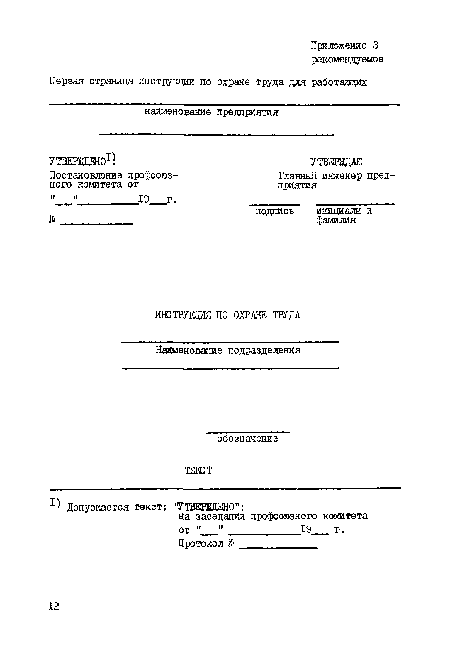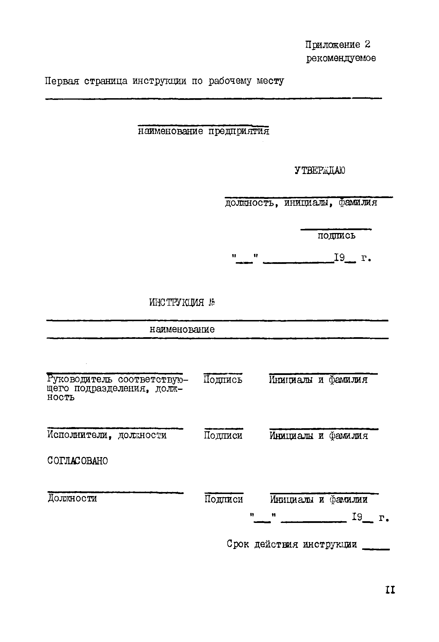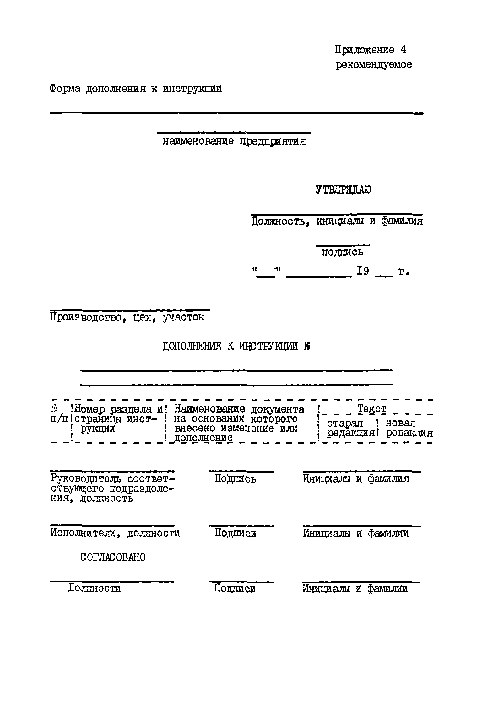 | Оглавление: | 1 Общие положения 2 Порядок разработки и утверждения инструкций 3 Изложение требований в инструкциях 4 Содержание инструкций 5 Регистрация, учет и пересмотр инструкций Приложение 1 (рекомендуемое). Форма перечня инструкций Приложение 2 (рекомендуемое). Первая страница инструкции по рабочему месту Приложение 3 (рекомендуемое). Первая страница инструкции по охране труда для работающих Приложение 4 (рекомендуемое). Форма дополнения к инструкции |