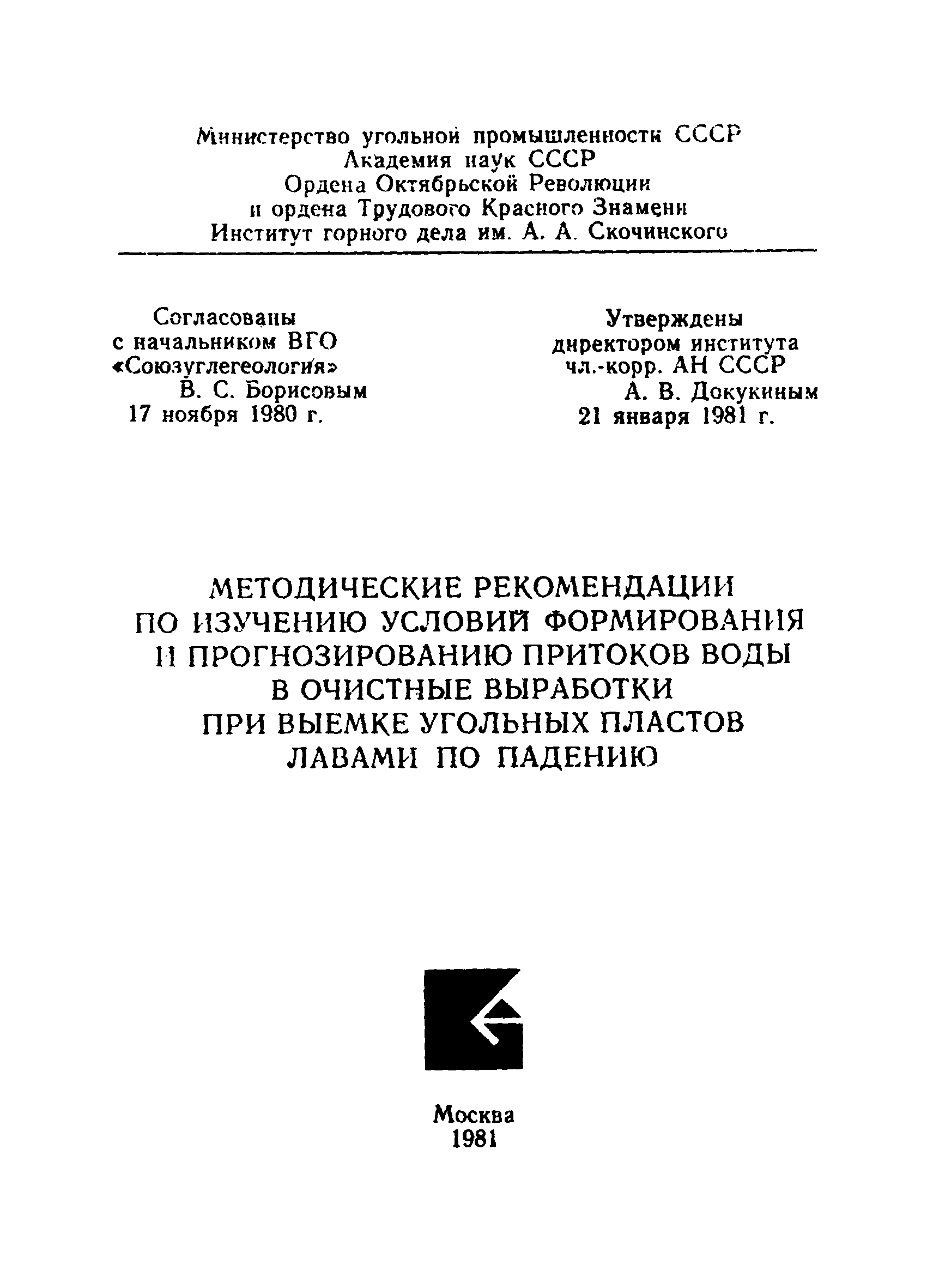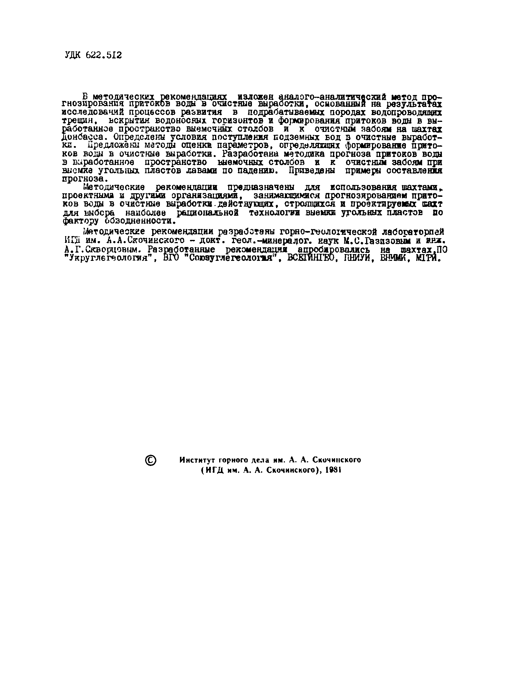 | Название рус.: | Методические рекомендации по изучению условий формирования и прогнозированию притоков воды в очистные выработки при выемке угольных пластов лавами по падению |