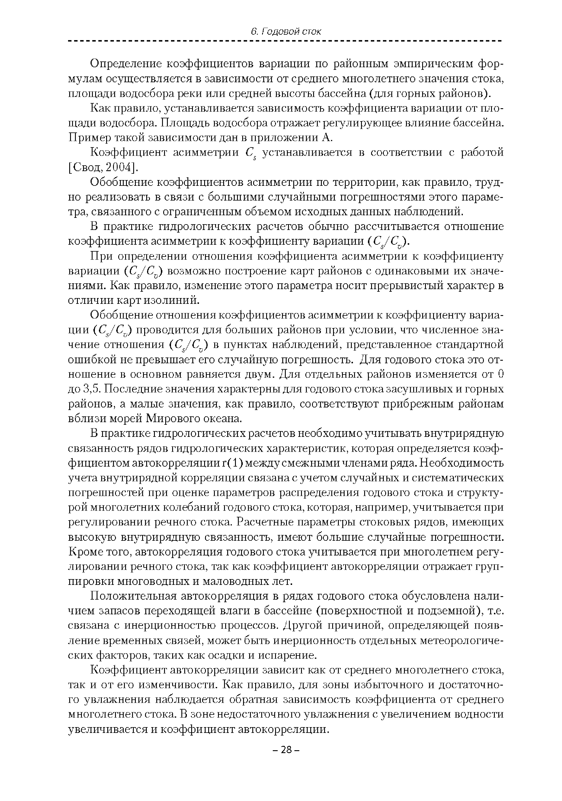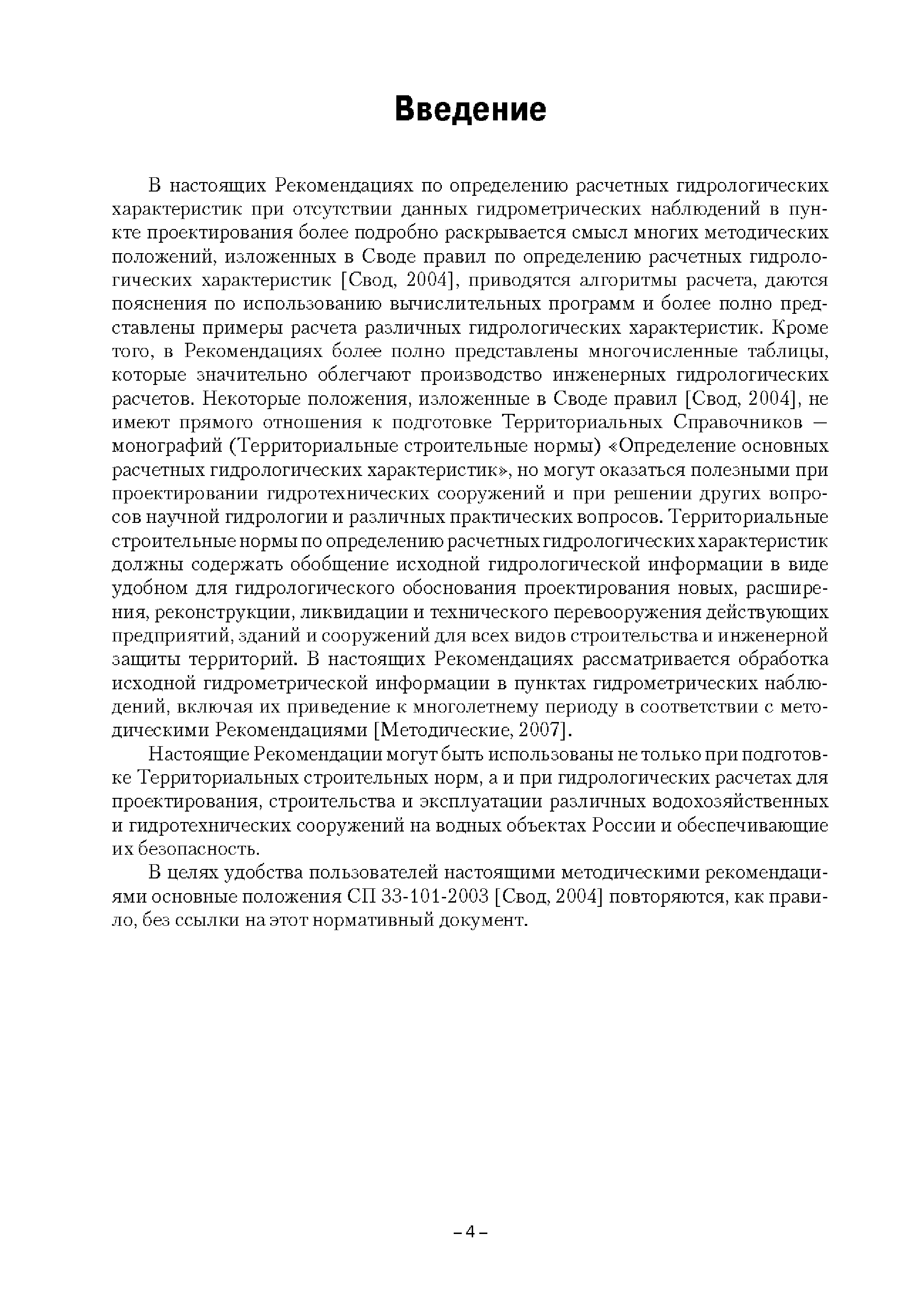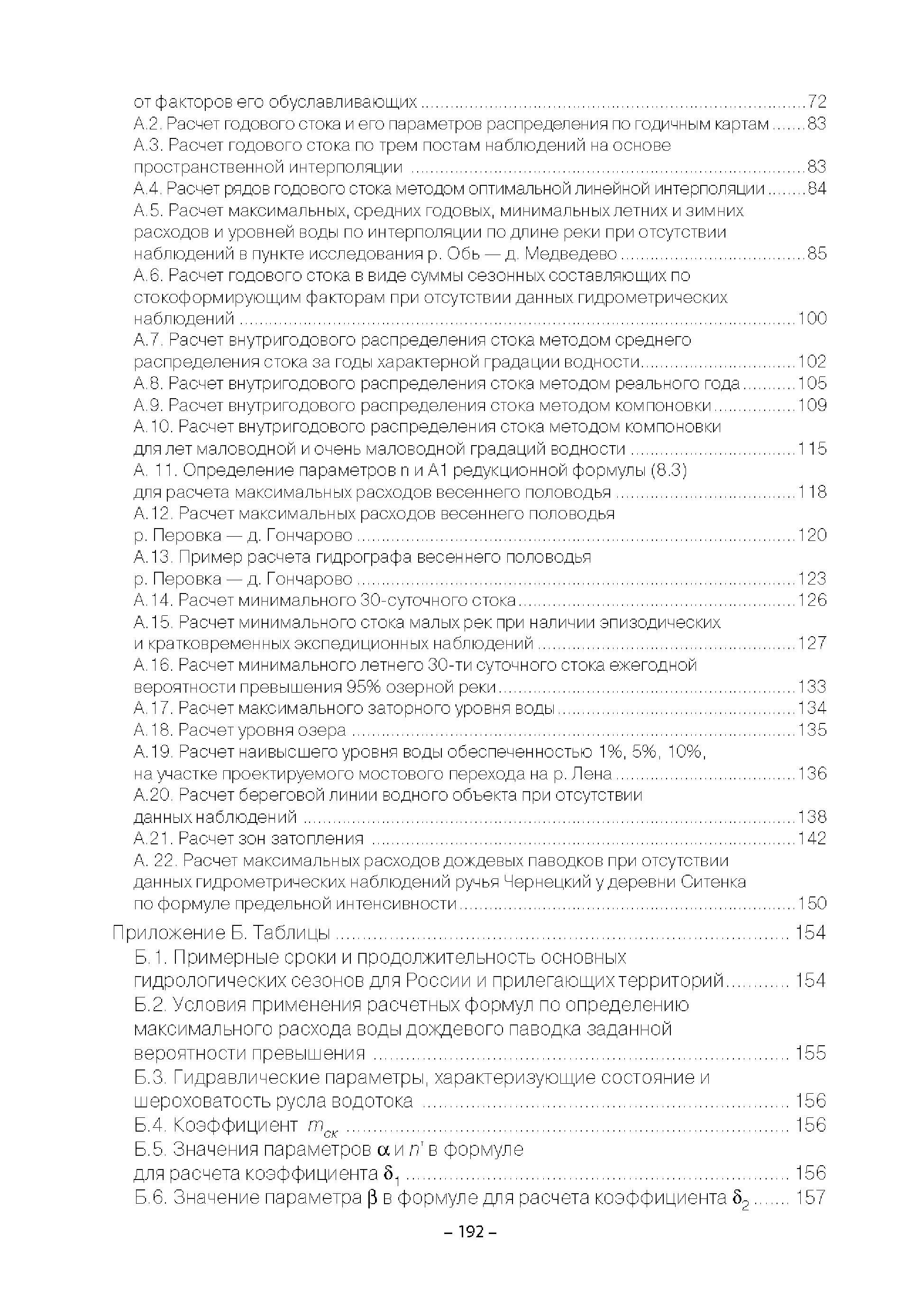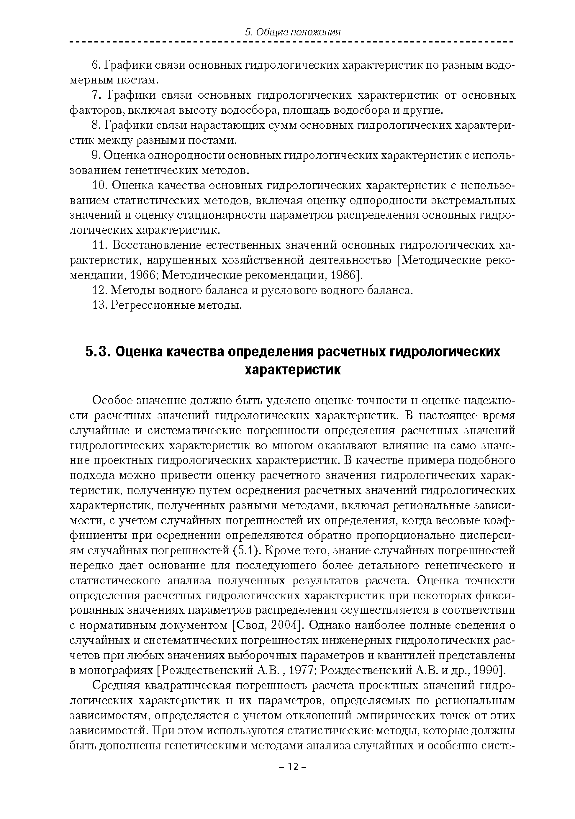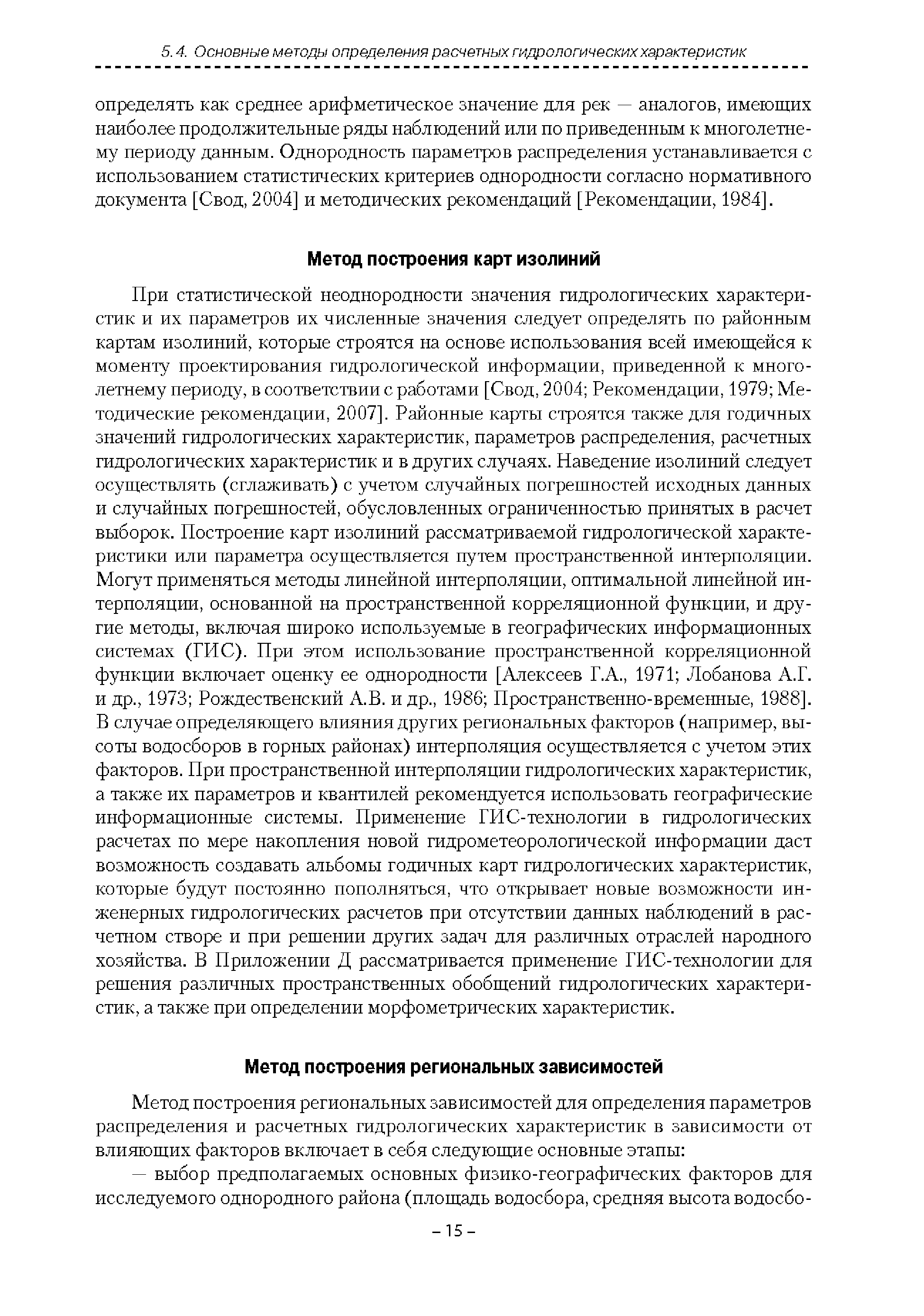 | Оглавление: | Введение 1. Область применения 2. Нормативные ссылки 3. Термины и определения 4. Обозначения и сокращения 5. Общие положения 5.1. Исходная гидрометеорологическая информация 5.2. Оценка качества исходной гидрометеорологической информации 5.3. Оценка качества определения расчетных гидрологических характеристик 5.4. Основные методы определения расчетных гидрогеологических характеристик 6. Годовой сток 6.1. Карты параметров распределения годового стока 6.2. Карты изолиний годового стока за конкретные годы 6.3. Поправочные коэффициенты к картам параметров распределения для малых рек 6.4. Региональные зависимости параметров распределения годового стока от основных факторов 6.5. Определение коэффициентов вариации, асимметрии и автокорреляции 6.6. Определение параметров стока на основе метода оптимальной линейной интерполяции 6.7. Определение значений стока по интерполяции по длине реки 6.8. Расчеты годового стока на основе суммы сезонных компонент 6.9. Учет влияния хозяйственной деятельности 7. Внутригодовое распределение стока 8. Максимальный сток рек 8.1. Весеннее половодье 8.2. Дождевые паводки 8.3. Гидрографы стока воды рек весеннего половодья и дождевых паводков 9. Минимальный сток воды рек 10. Расчет наивысших уровней воды рек 10.1. Полевые изыскания 10.2. Определение расчетных наивысших уровней воды, обусловленных весенним половодьем и дождевыми паводками на реках 10.3. Расчет наивысших зажорных и заторных уровней воды 11. Определение расчетных уровней воды за безледоставный период для установления границ водоохранных зон и прибрежных защитных полос 11.1. Основные положения, регламентирующие порядок определения водоохранных зон и прибрежных защитных полос 11.2. Методика определения береговой линии водных объектов при отсутствии данных наблюдений 12. Определение зон затопления для уровней воды различной обеспеченности Приложение А. Примеры Приложение Б. Таблицы Приложение В. Рекомендации по оценке параметров формул 1-го типа Приложение Г. Порядок уточнения ординат кривых редукции осадков и параметров формулы предельной интенсивности Приложение Д. Пространственная интерполяция гидрогеологических характеристик с использованием ГИС-технологии Список используемых источников |