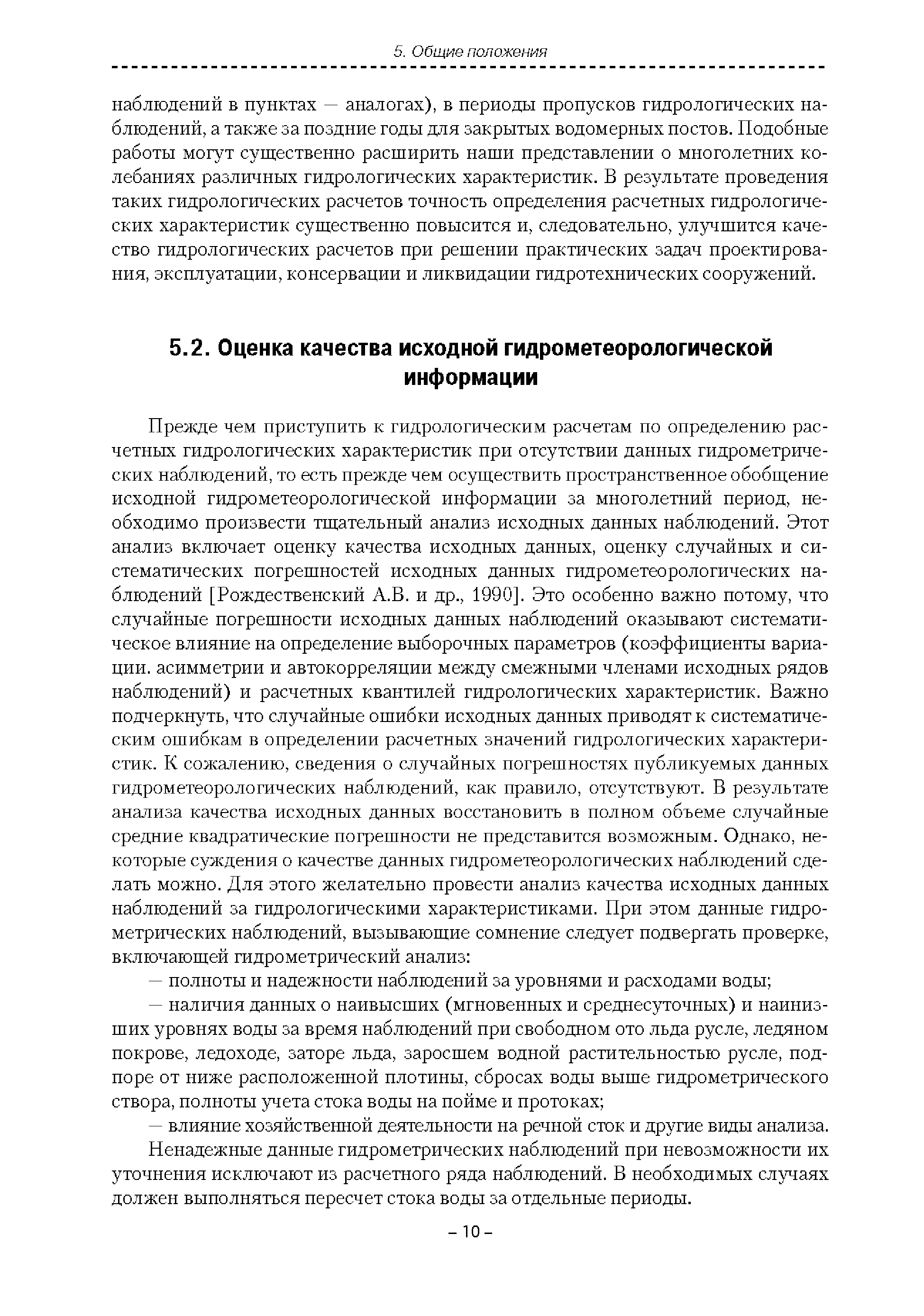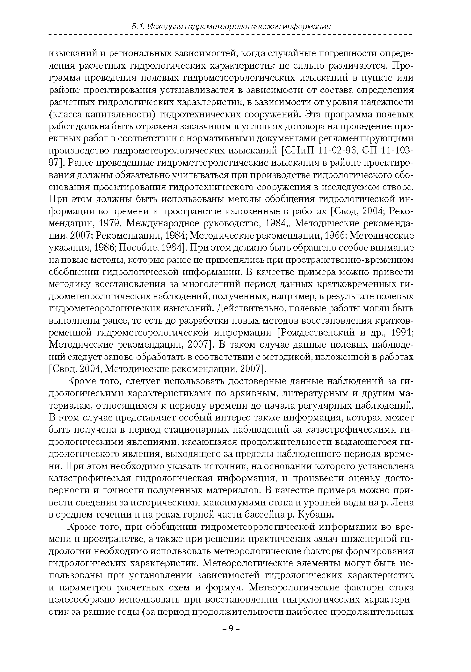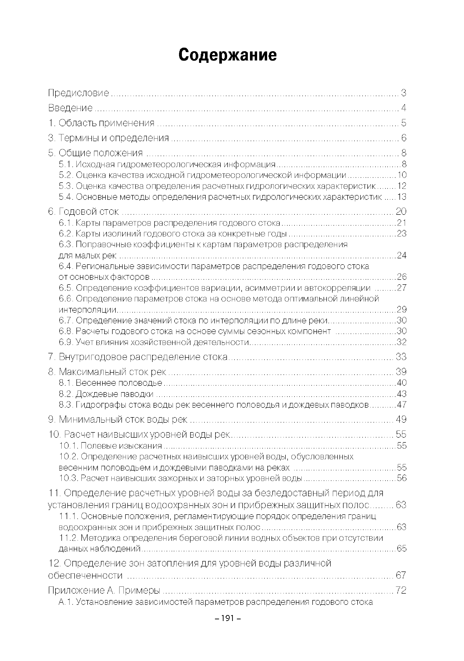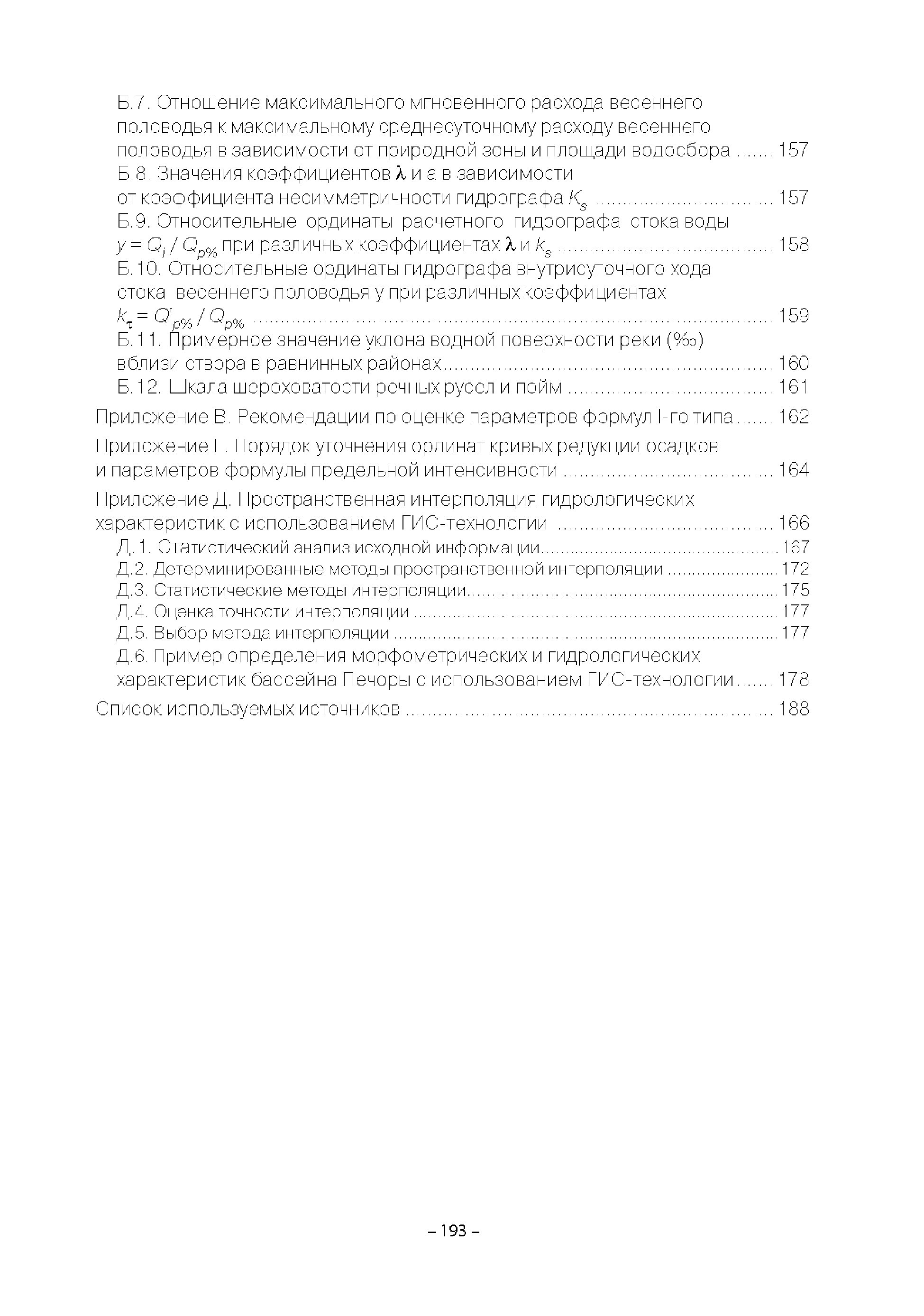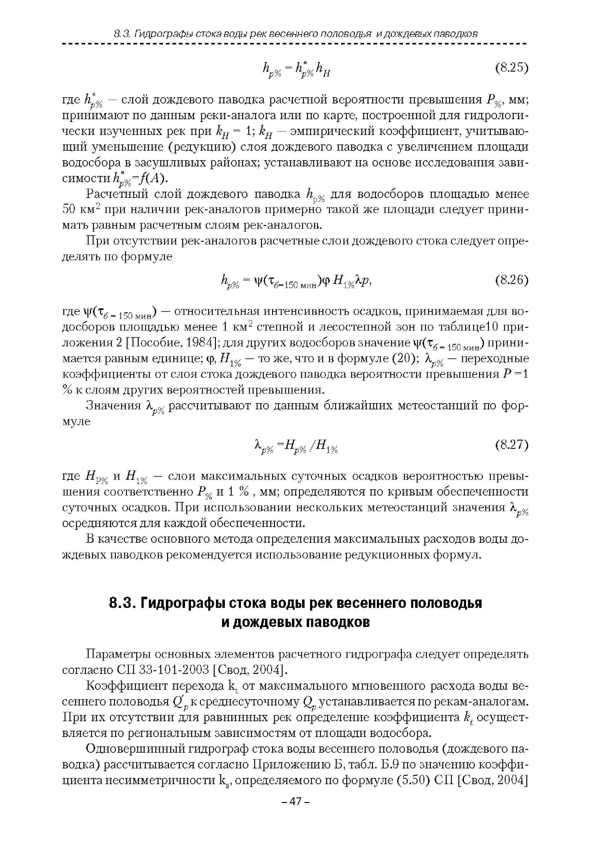 | Оглавление: | Введение 1. Область применения 2. Нормативные ссылки 3. Термины и определения 4. Обозначения и сокращения 5. Общие положения 5.1. Исходная гидрометеорологическая информация 5.2. Оценка качества исходной гидрометеорологической информации 5.3. Оценка качества определения расчетных гидрологических характеристик 5.4. Основные методы определения расчетных гидрогеологических характеристик 6. Годовой сток 6.1. Карты параметров распределения годового стока 6.2. Карты изолиний годового стока за конкретные годы 6.3. Поправочные коэффициенты к картам параметров распределения для малых рек 6.4. Региональные зависимости параметров распределения годового стока от основных факторов 6.5. Определение коэффициентов вариации, асимметрии и автокорреляции 6.6. Определение параметров стока на основе метода оптимальной линейной интерполяции 6.7. Определение значений стока по интерполяции по длине реки 6.8. Расчеты годового стока на основе суммы сезонных компонент 6.9. Учет влияния хозяйственной деятельности 7. Внутригодовое распределение стока 8. Максимальный сток рек 8.1. Весеннее половодье 8.2. Дождевые паводки 8.3. Гидрографы стока воды рек весеннего половодья и дождевых паводков 9. Минимальный сток воды рек 10. Расчет наивысших уровней воды рек 10.1. Полевые изыскания 10.2. Определение расчетных наивысших уровней воды, обусловленных весенним половодьем и дождевыми паводками на реках 10.3. Расчет наивысших зажорных и заторных уровней воды 11. Определение расчетных уровней воды за безледоставный период для установления границ водоохранных зон и прибрежных защитных полос 11.1. Основные положения, регламентирующие порядок определения водоохранных зон и прибрежных защитных полос 11.2. Методика определения береговой линии водных объектов при отсутствии данных наблюдений 12. Определение зон затопления для уровней воды различной обеспеченности Приложение А. Примеры Приложение Б. Таблицы Приложение В. Рекомендации по оценке параметров формул 1-го типа Приложение Г. Порядок уточнения ординат кривых редукции осадков и параметров формулы предельной интенсивности Приложение Д. Пространственная интерполяция гидрогеологических характеристик с использованием ГИС-технологии Список используемых источников |