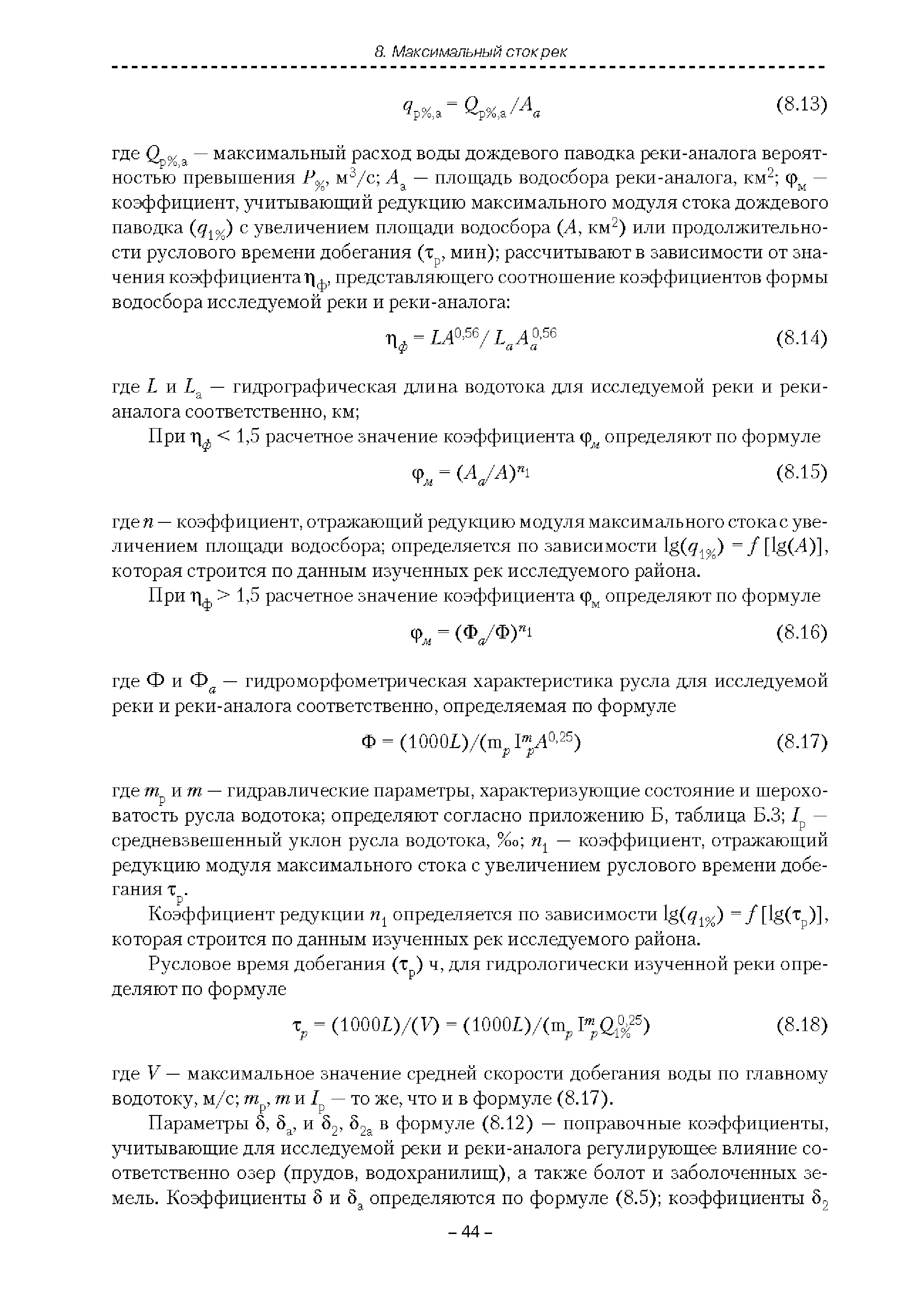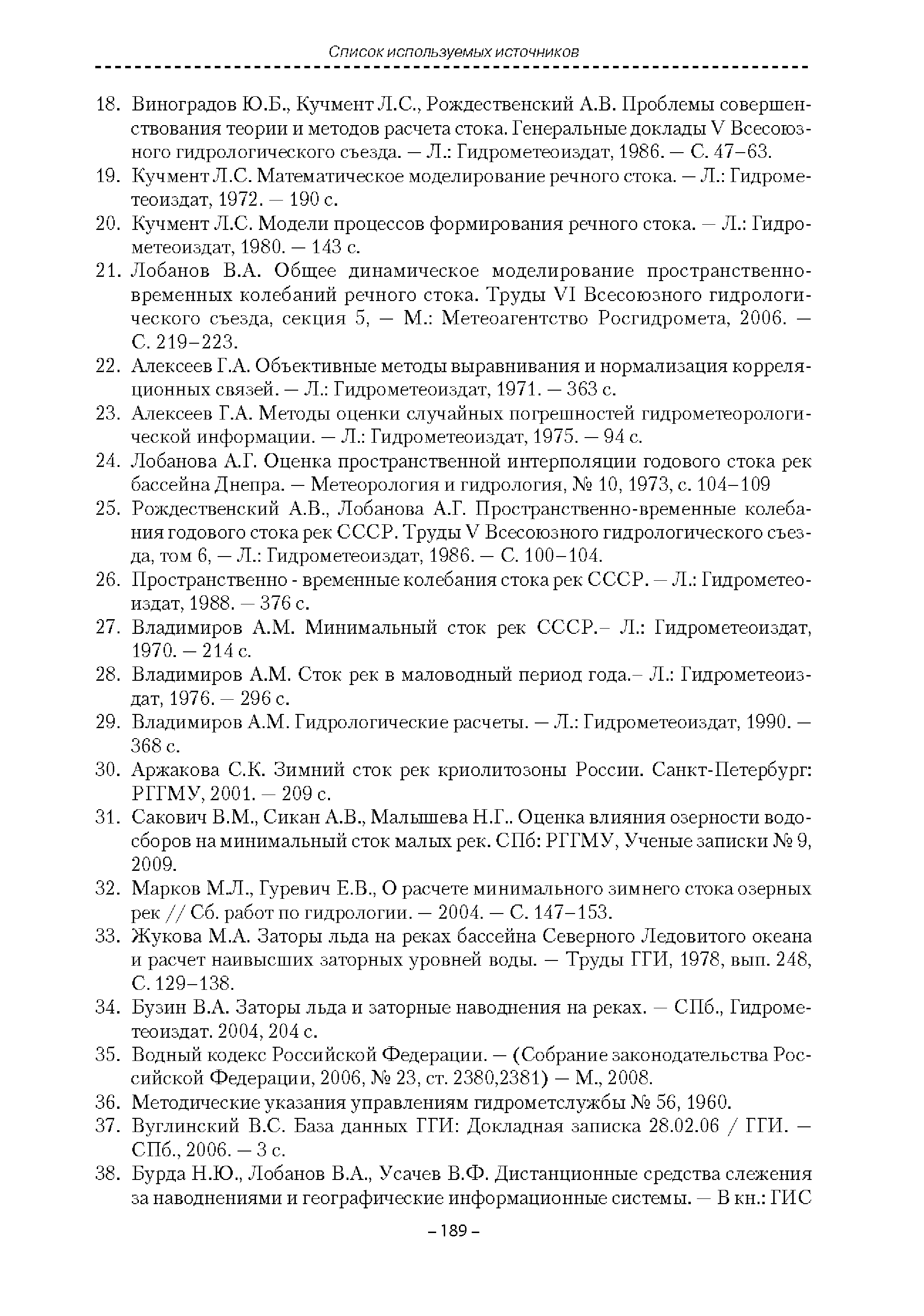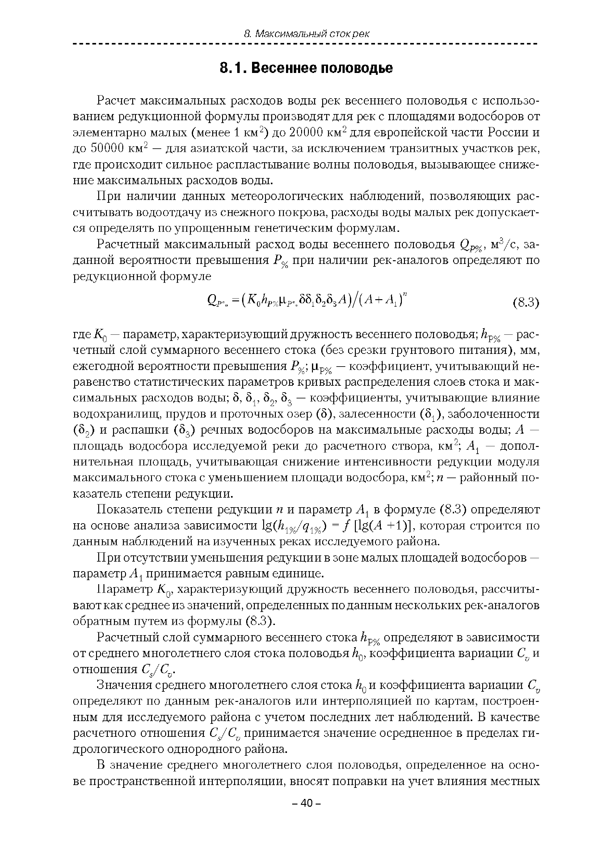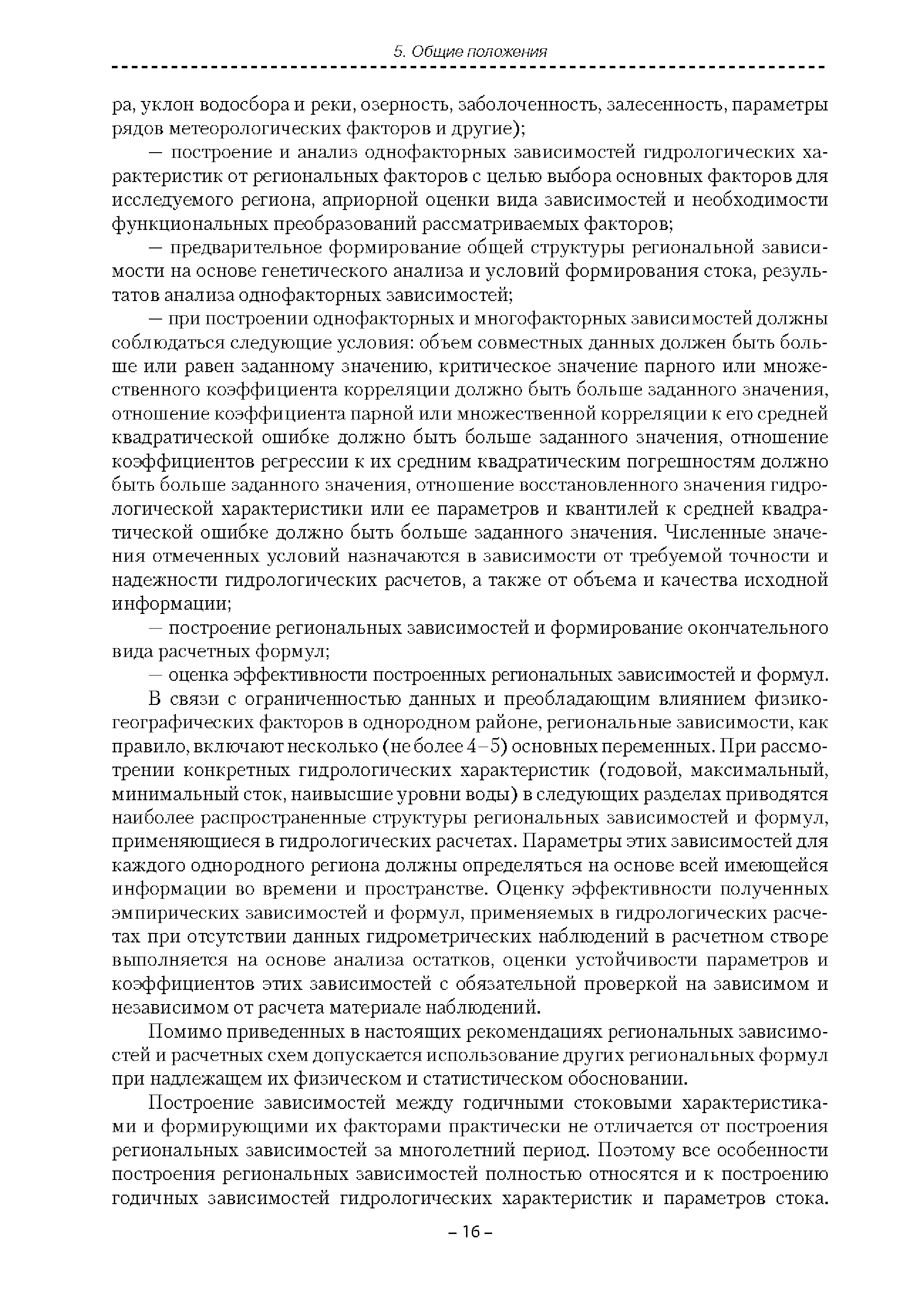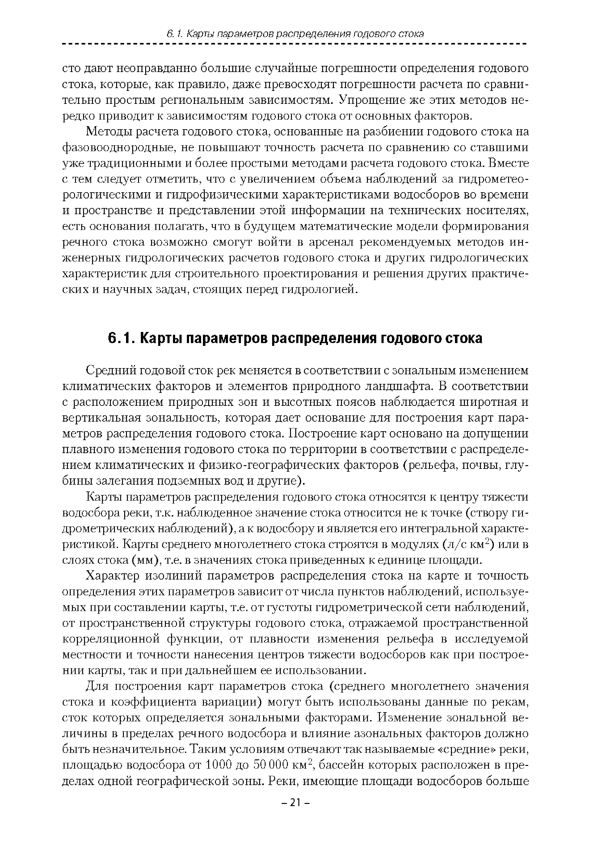 | Оглавление: | Введение 1. Область применения 2. Нормативные ссылки 3. Термины и определения 4. Обозначения и сокращения 5. Общие положения 5.1. Исходная гидрометеорологическая информация 5.2. Оценка качества исходной гидрометеорологической информации 5.3. Оценка качества определения расчетных гидрологических характеристик 5.4. Основные методы определения расчетных гидрогеологических характеристик 6. Годовой сток 6.1. Карты параметров распределения годового стока 6.2. Карты изолиний годового стока за конкретные годы 6.3. Поправочные коэффициенты к картам параметров распределения для малых рек 6.4. Региональные зависимости параметров распределения годового стока от основных факторов 6.5. Определение коэффициентов вариации, асимметрии и автокорреляции 6.6. Определение параметров стока на основе метода оптимальной линейной интерполяции 6.7. Определение значений стока по интерполяции по длине реки 6.8. Расчеты годового стока на основе суммы сезонных компонент 6.9. Учет влияния хозяйственной деятельности 7. Внутригодовое распределение стока 8. Максимальный сток рек 8.1. Весеннее половодье 8.2. Дождевые паводки 8.3. Гидрографы стока воды рек весеннего половодья и дождевых паводков 9. Минимальный сток воды рек 10. Расчет наивысших уровней воды рек 10.1. Полевые изыскания 10.2. Определение расчетных наивысших уровней воды, обусловленных весенним половодьем и дождевыми паводками на реках 10.3. Расчет наивысших зажорных и заторных уровней воды 11. Определение расчетных уровней воды за безледоставный период для установления границ водоохранных зон и прибрежных защитных полос 11.1. Основные положения, регламентирующие порядок определения водоохранных зон и прибрежных защитных полос 11.2. Методика определения береговой линии водных объектов при отсутствии данных наблюдений 12. Определение зон затопления для уровней воды различной обеспеченности Приложение А. Примеры Приложение Б. Таблицы Приложение В. Рекомендации по оценке параметров формул 1-го типа Приложение Г. Порядок уточнения ординат кривых редукции осадков и параметров формулы предельной интенсивности Приложение Д. Пространственная интерполяция гидрогеологических характеристик с использованием ГИС-технологии Список используемых источников |