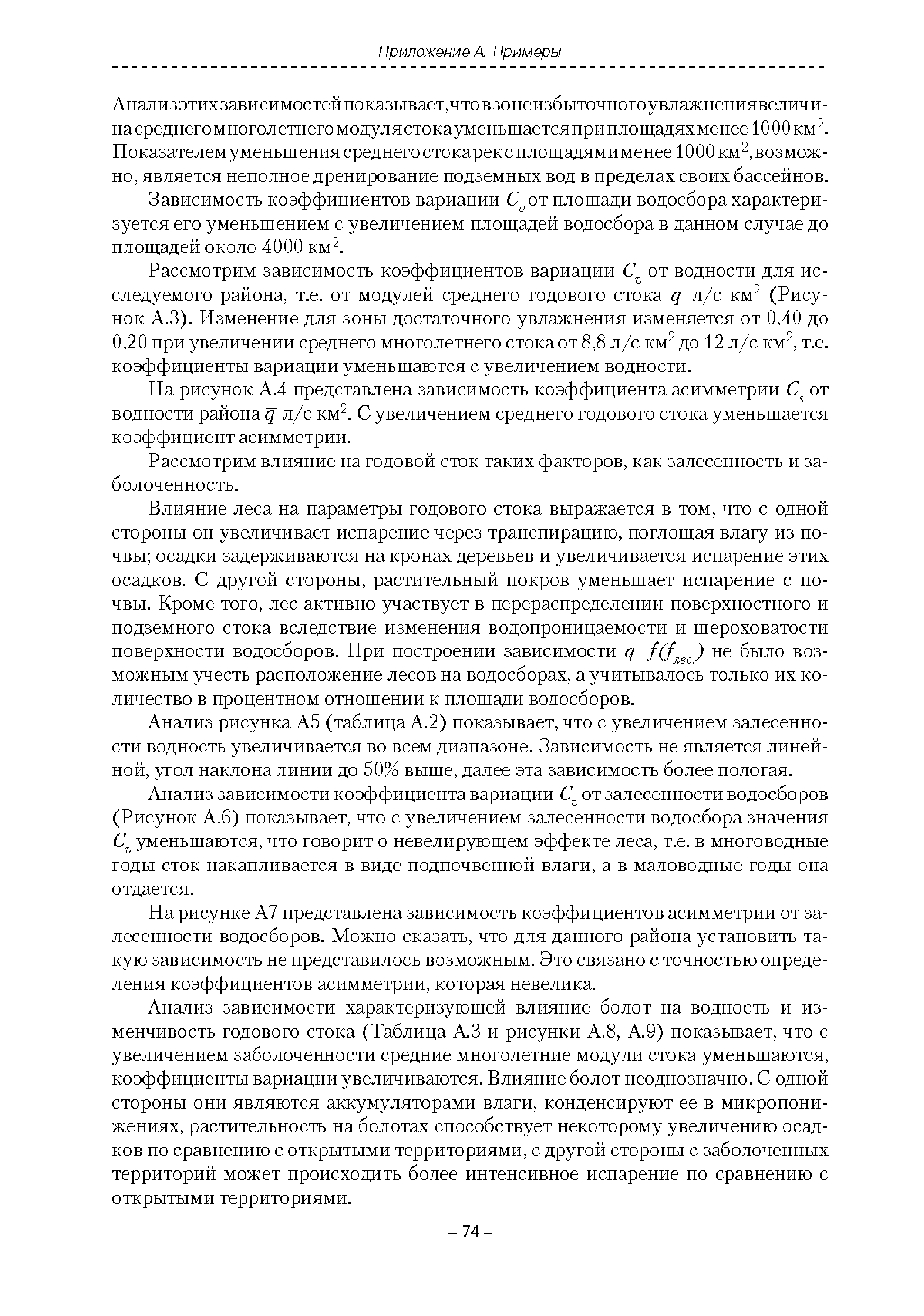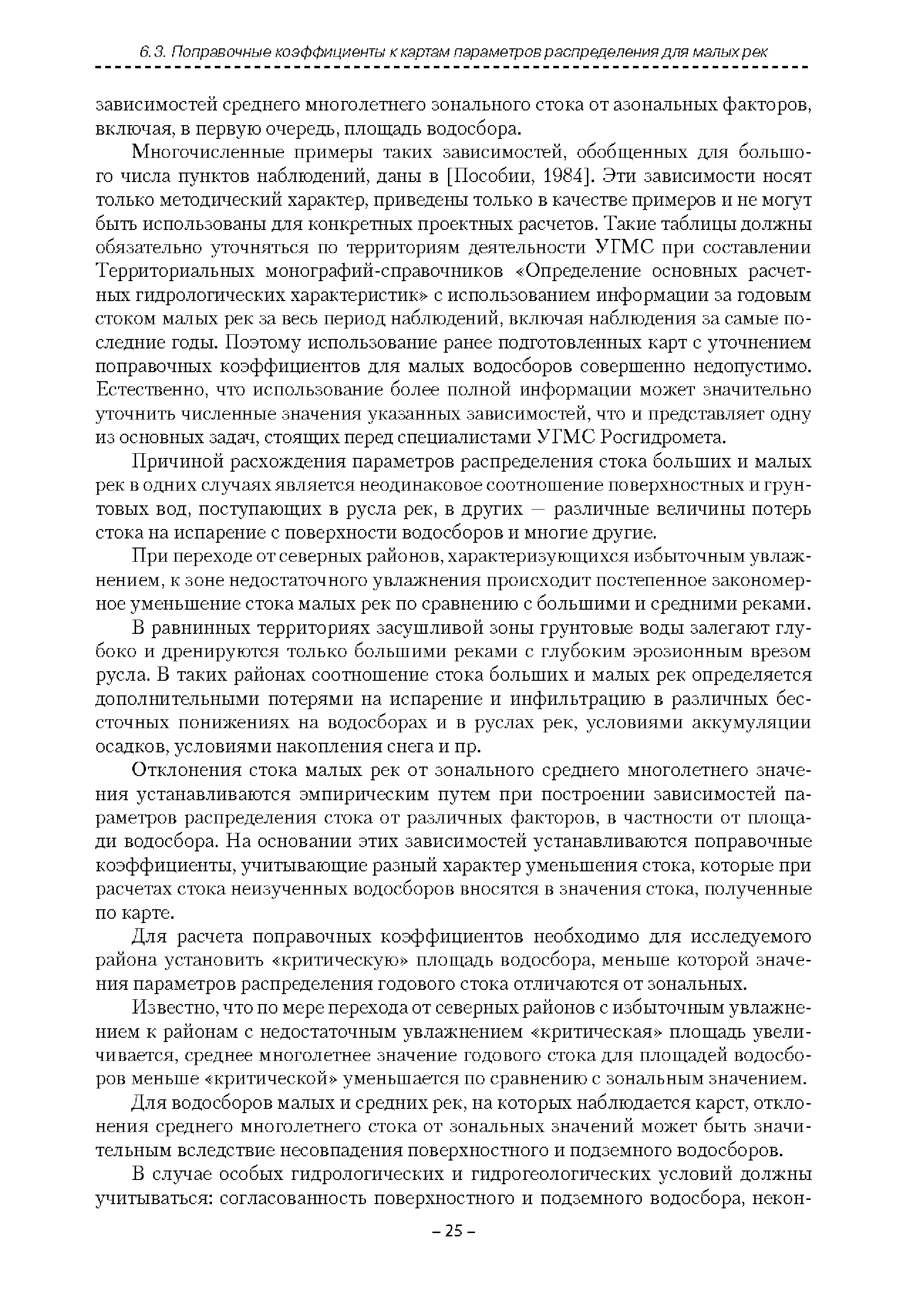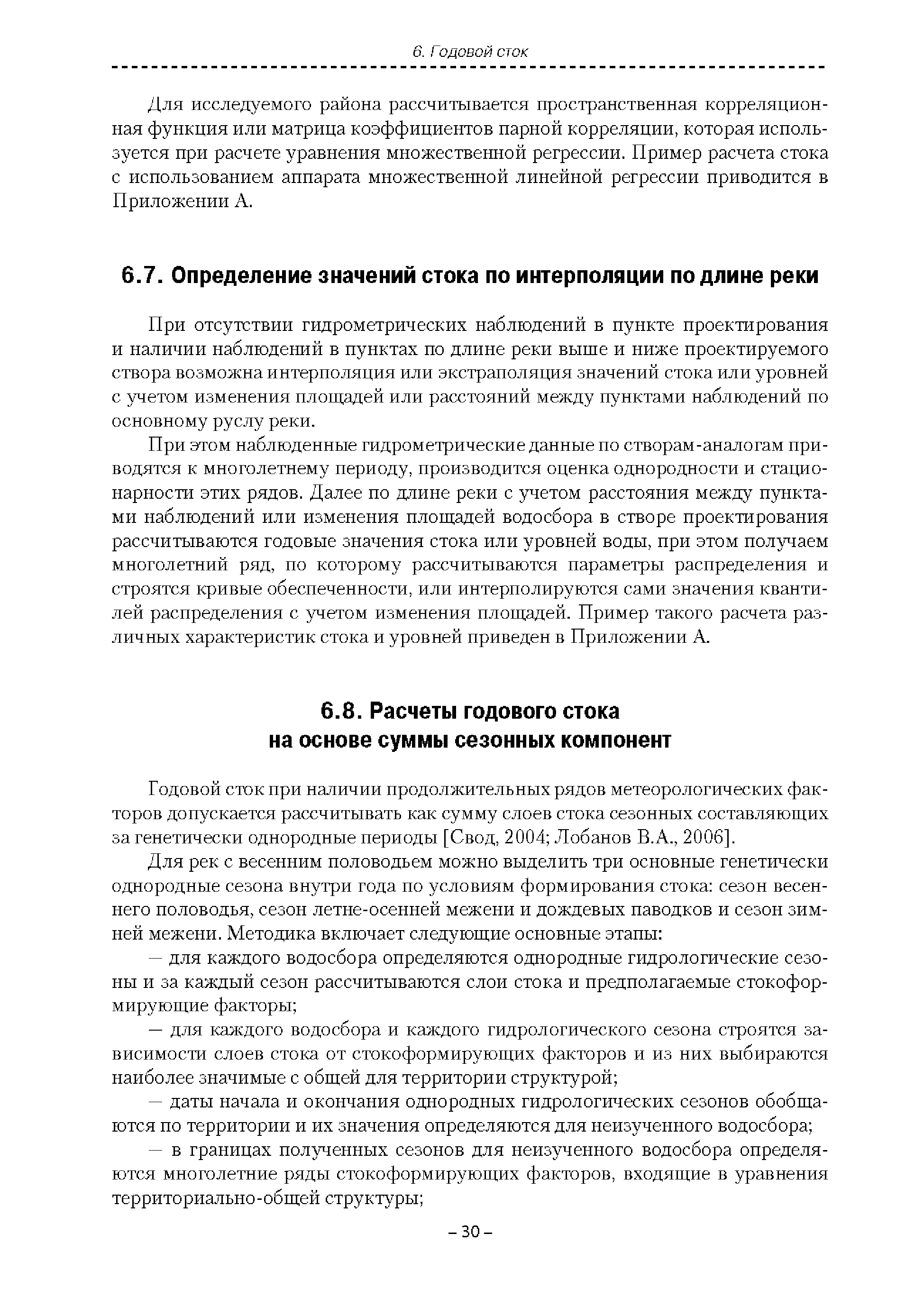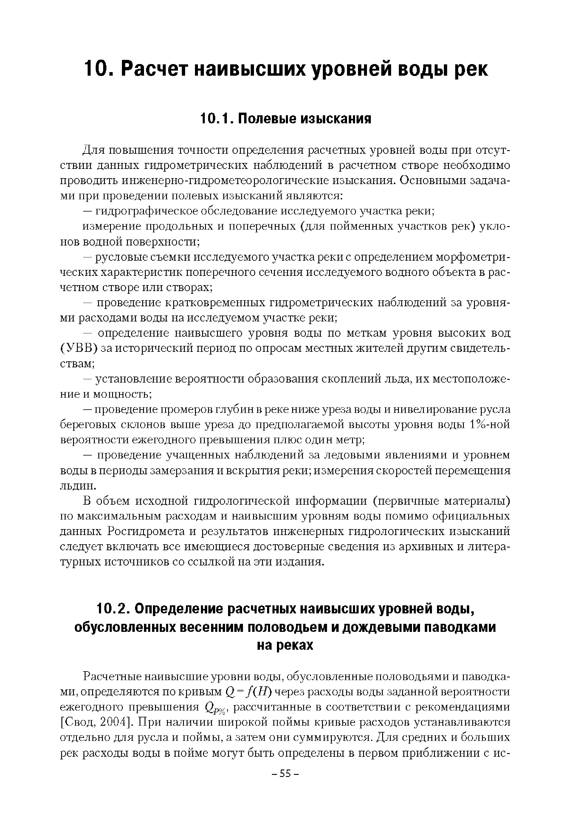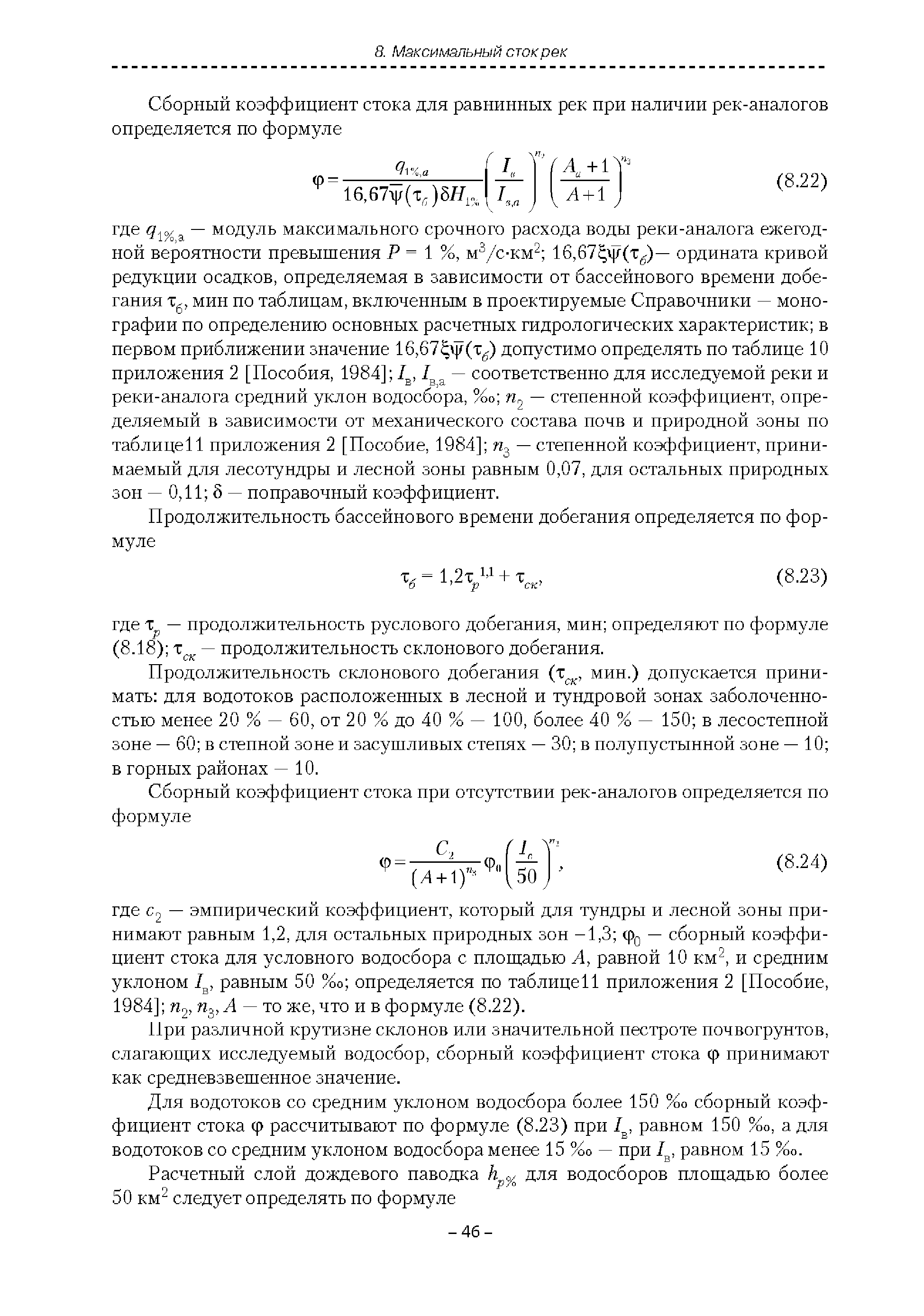 | Оглавление: | Введение 1. Область применения 2. Нормативные ссылки 3. Термины и определения 4. Обозначения и сокращения 5. Общие положения 5.1. Исходная гидрометеорологическая информация 5.2. Оценка качества исходной гидрометеорологической информации 5.3. Оценка качества определения расчетных гидрологических характеристик 5.4. Основные методы определения расчетных гидрогеологических характеристик 6. Годовой сток 6.1. Карты параметров распределения годового стока 6.2. Карты изолиний годового стока за конкретные годы 6.3. Поправочные коэффициенты к картам параметров распределения для малых рек 6.4. Региональные зависимости параметров распределения годового стока от основных факторов 6.5. Определение коэффициентов вариации, асимметрии и автокорреляции 6.6. Определение параметров стока на основе метода оптимальной линейной интерполяции 6.7. Определение значений стока по интерполяции по длине реки 6.8. Расчеты годового стока на основе суммы сезонных компонент 6.9. Учет влияния хозяйственной деятельности 7. Внутригодовое распределение стока 8. Максимальный сток рек 8.1. Весеннее половодье 8.2. Дождевые паводки 8.3. Гидрографы стока воды рек весеннего половодья и дождевых паводков 9. Минимальный сток воды рек 10. Расчет наивысших уровней воды рек 10.1. Полевые изыскания 10.2. Определение расчетных наивысших уровней воды, обусловленных весенним половодьем и дождевыми паводками на реках 10.3. Расчет наивысших зажорных и заторных уровней воды 11. Определение расчетных уровней воды за безледоставный период для установления границ водоохранных зон и прибрежных защитных полос 11.1. Основные положения, регламентирующие порядок определения водоохранных зон и прибрежных защитных полос 11.2. Методика определения береговой линии водных объектов при отсутствии данных наблюдений 12. Определение зон затопления для уровней воды различной обеспеченности Приложение А. Примеры Приложение Б. Таблицы Приложение В. Рекомендации по оценке параметров формул 1-го типа Приложение Г. Порядок уточнения ординат кривых редукции осадков и параметров формулы предельной интенсивности Приложение Д. Пространственная интерполяция гидрогеологических характеристик с использованием ГИС-технологии Список используемых источников |