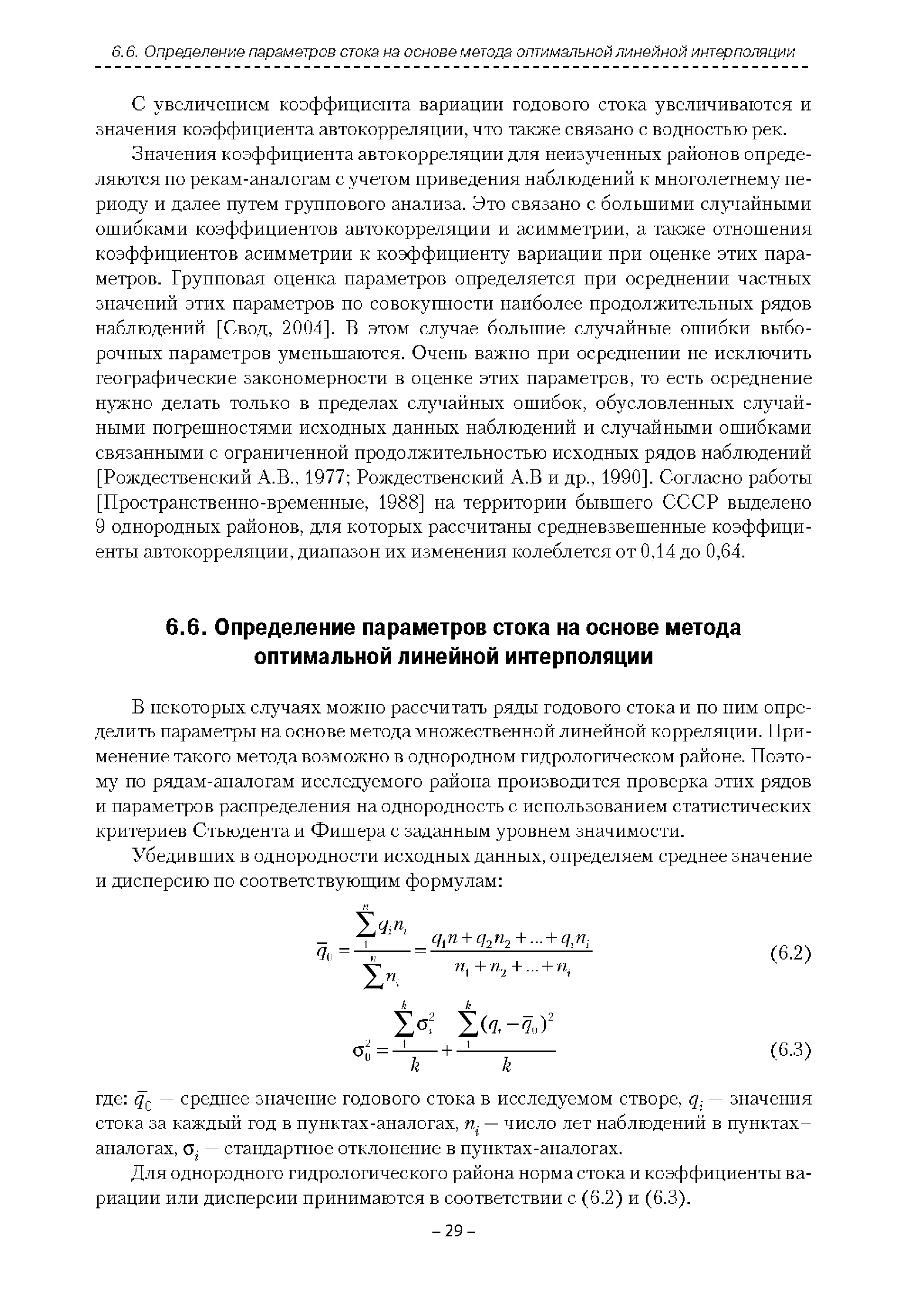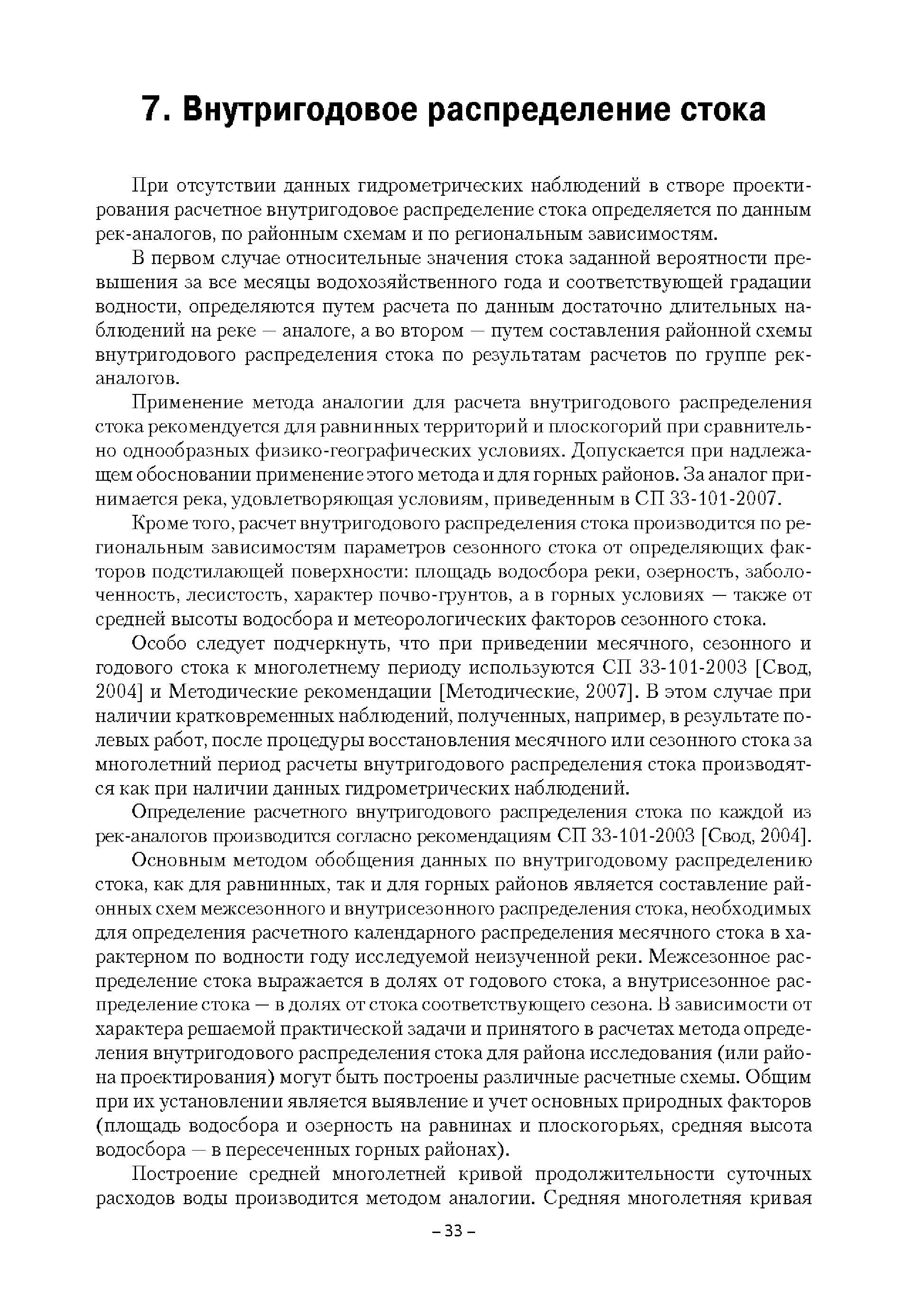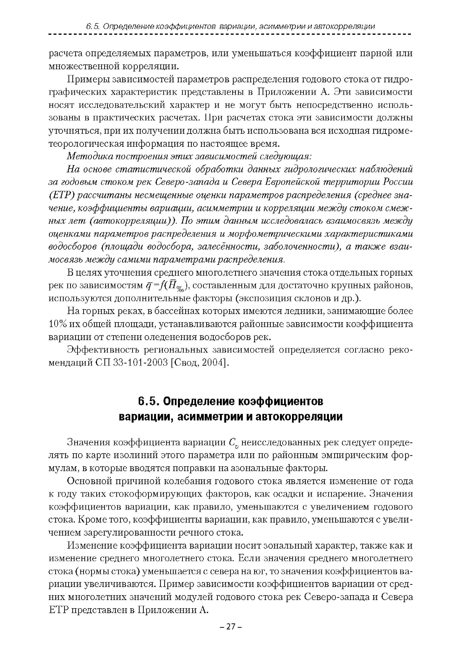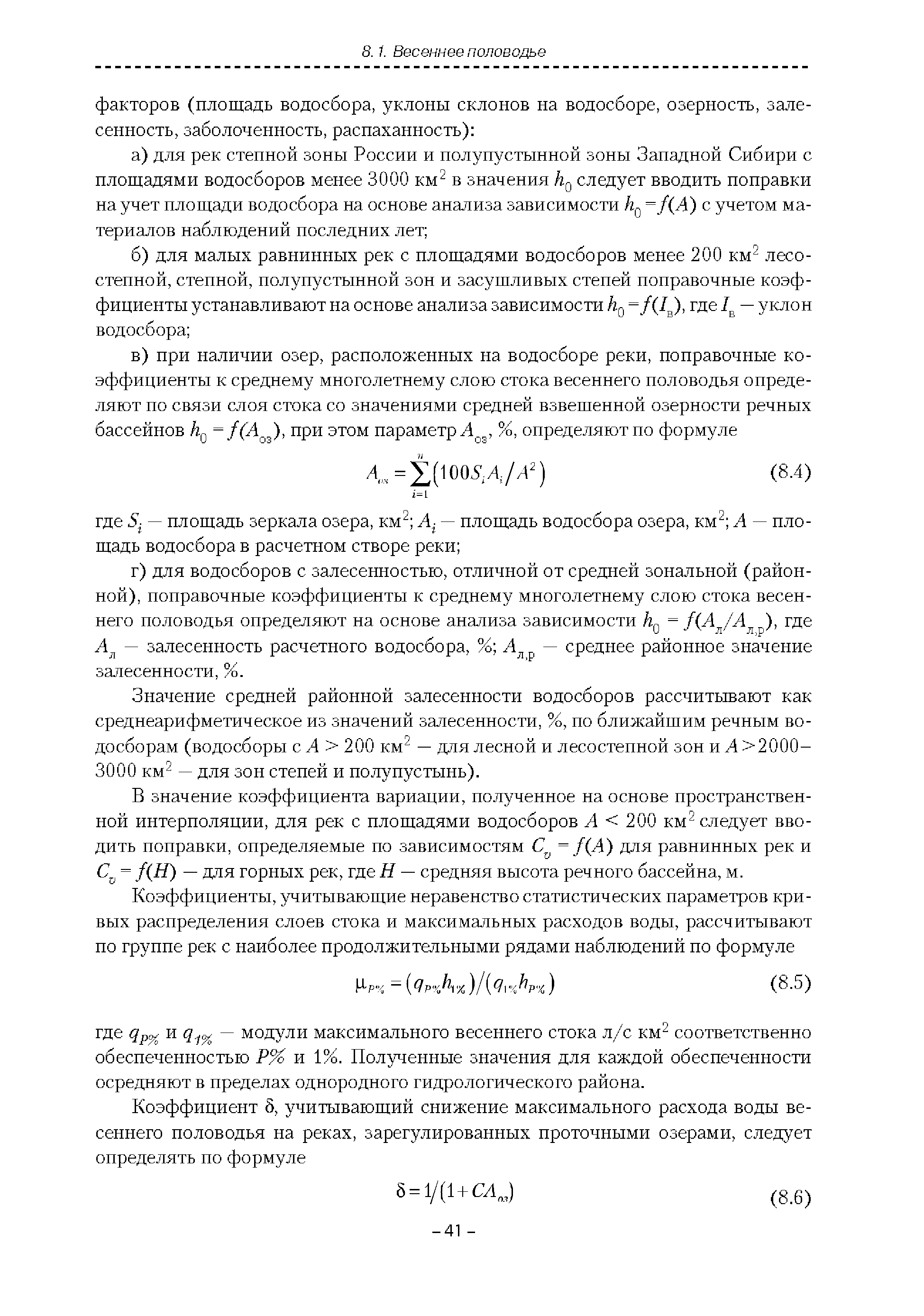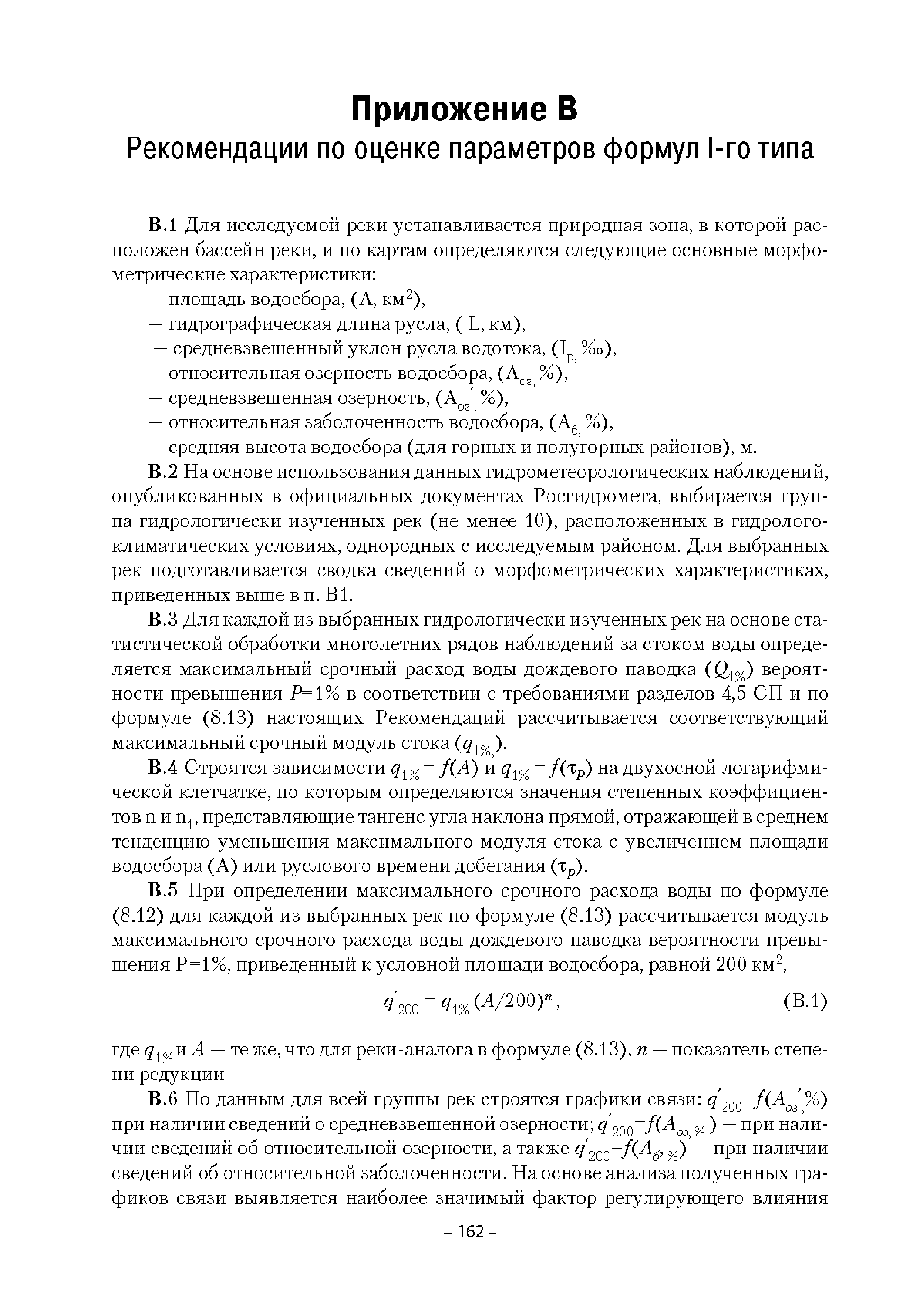 | Оглавление: | Введение 1. Область применения 2. Нормативные ссылки 3. Термины и определения 4. Обозначения и сокращения 5. Общие положения 5.1. Исходная гидрометеорологическая информация 5.2. Оценка качества исходной гидрометеорологической информации 5.3. Оценка качества определения расчетных гидрологических характеристик 5.4. Основные методы определения расчетных гидрогеологических характеристик 6. Годовой сток 6.1. Карты параметров распределения годового стока 6.2. Карты изолиний годового стока за конкретные годы 6.3. Поправочные коэффициенты к картам параметров распределения для малых рек 6.4. Региональные зависимости параметров распределения годового стока от основных факторов 6.5. Определение коэффициентов вариации, асимметрии и автокорреляции 6.6. Определение параметров стока на основе метода оптимальной линейной интерполяции 6.7. Определение значений стока по интерполяции по длине реки 6.8. Расчеты годового стока на основе суммы сезонных компонент 6.9. Учет влияния хозяйственной деятельности 7. Внутригодовое распределение стока 8. Максимальный сток рек 8.1. Весеннее половодье 8.2. Дождевые паводки 8.3. Гидрографы стока воды рек весеннего половодья и дождевых паводков 9. Минимальный сток воды рек 10. Расчет наивысших уровней воды рек 10.1. Полевые изыскания 10.2. Определение расчетных наивысших уровней воды, обусловленных весенним половодьем и дождевыми паводками на реках 10.3. Расчет наивысших зажорных и заторных уровней воды 11. Определение расчетных уровней воды за безледоставный период для установления границ водоохранных зон и прибрежных защитных полос 11.1. Основные положения, регламентирующие порядок определения водоохранных зон и прибрежных защитных полос 11.2. Методика определения береговой линии водных объектов при отсутствии данных наблюдений 12. Определение зон затопления для уровней воды различной обеспеченности Приложение А. Примеры Приложение Б. Таблицы Приложение В. Рекомендации по оценке параметров формул 1-го типа Приложение Г. Порядок уточнения ординат кривых редукции осадков и параметров формулы предельной интенсивности Приложение Д. Пространственная интерполяция гидрогеологических характеристик с использованием ГИС-технологии Список используемых источников |