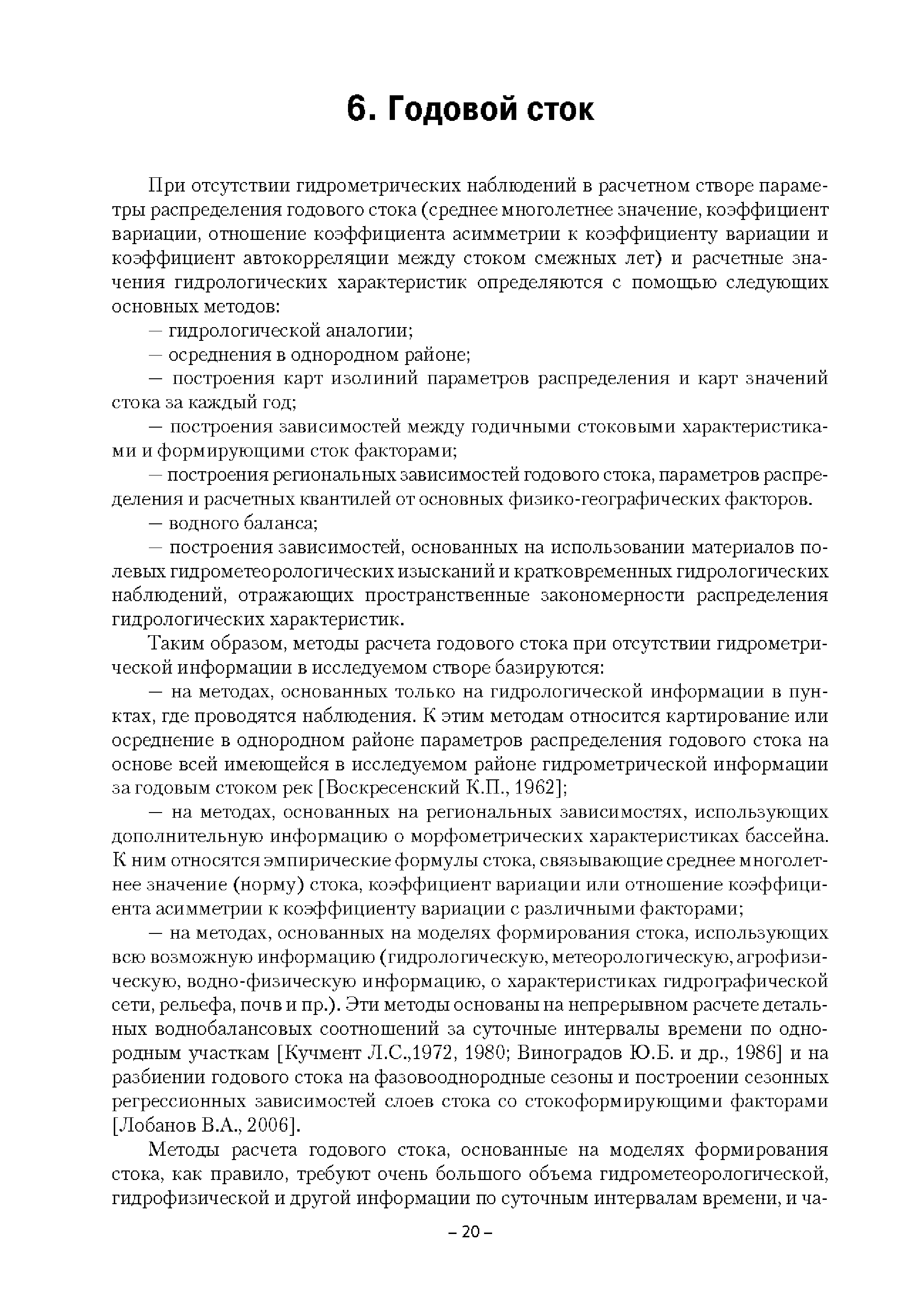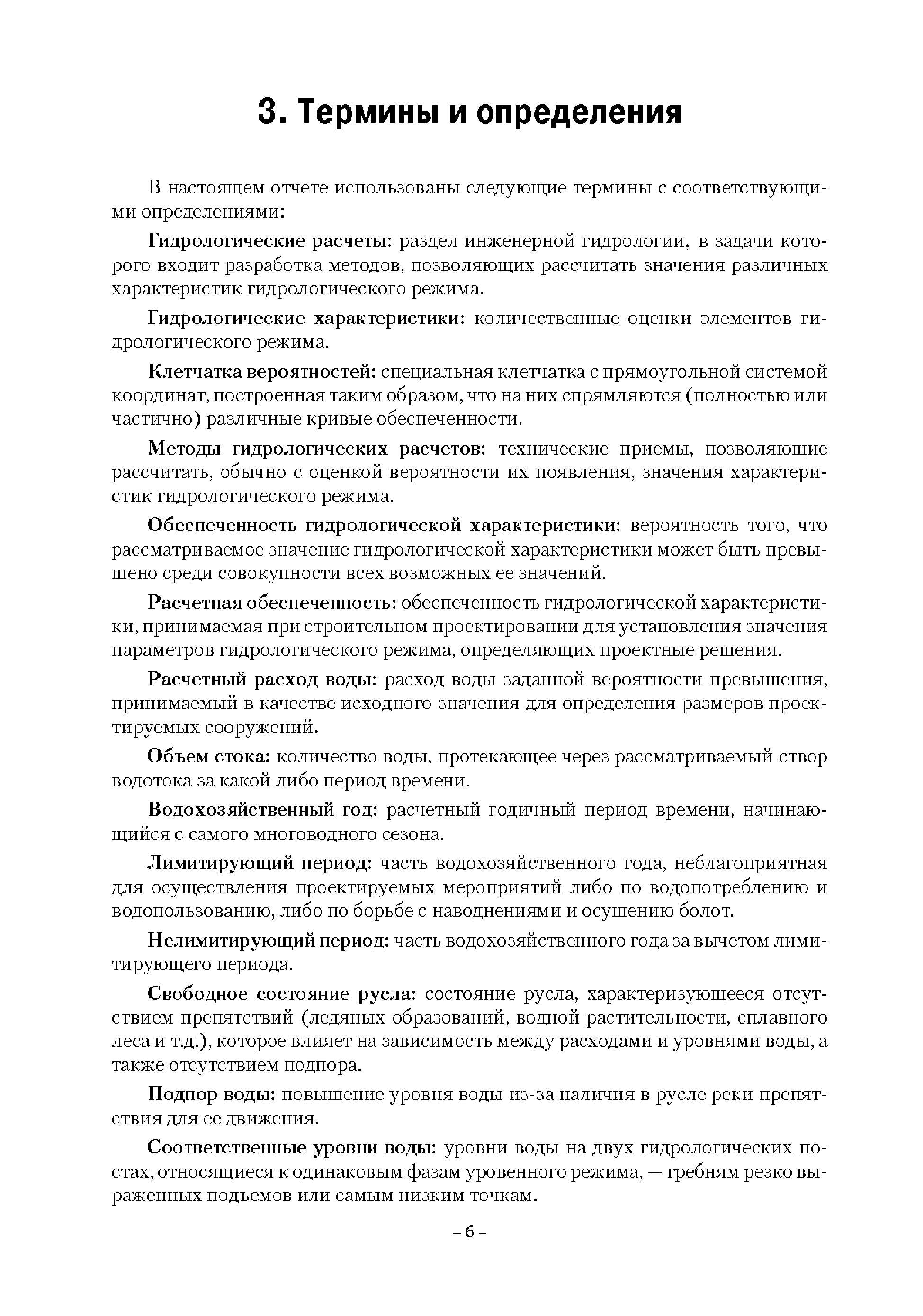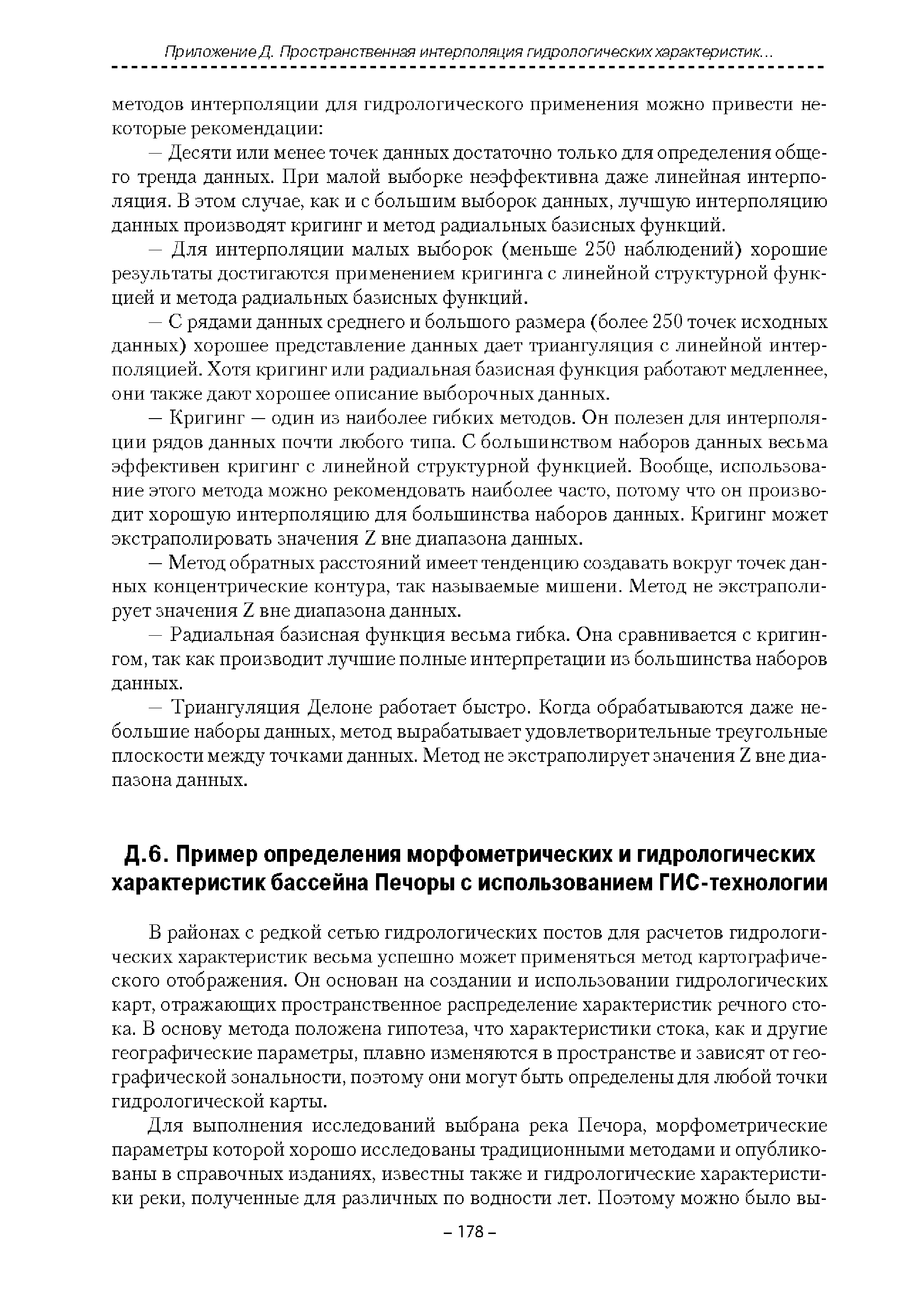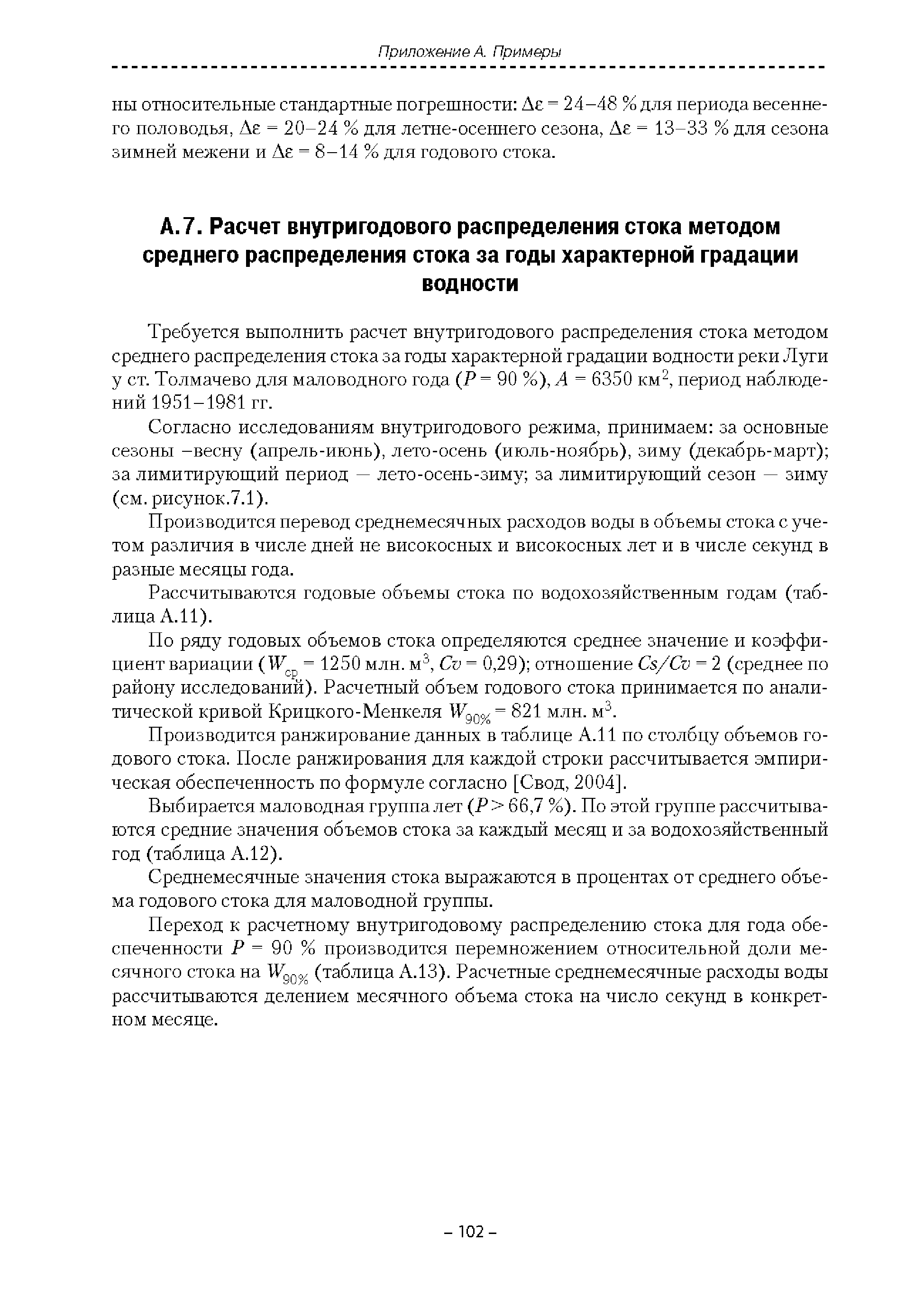 | Оглавление: | Введение 1. Область применения 2. Нормативные ссылки 3. Термины и определения 4. Обозначения и сокращения 5. Общие положения 5.1. Исходная гидрометеорологическая информация 5.2. Оценка качества исходной гидрометеорологической информации 5.3. Оценка качества определения расчетных гидрологических характеристик 5.4. Основные методы определения расчетных гидрогеологических характеристик 6. Годовой сток 6.1. Карты параметров распределения годового стока 6.2. Карты изолиний годового стока за конкретные годы 6.3. Поправочные коэффициенты к картам параметров распределения для малых рек 6.4. Региональные зависимости параметров распределения годового стока от основных факторов 6.5. Определение коэффициентов вариации, асимметрии и автокорреляции 6.6. Определение параметров стока на основе метода оптимальной линейной интерполяции 6.7. Определение значений стока по интерполяции по длине реки 6.8. Расчеты годового стока на основе суммы сезонных компонент 6.9. Учет влияния хозяйственной деятельности 7. Внутригодовое распределение стока 8. Максимальный сток рек 8.1. Весеннее половодье 8.2. Дождевые паводки 8.3. Гидрографы стока воды рек весеннего половодья и дождевых паводков 9. Минимальный сток воды рек 10. Расчет наивысших уровней воды рек 10.1. Полевые изыскания 10.2. Определение расчетных наивысших уровней воды, обусловленных весенним половодьем и дождевыми паводками на реках 10.3. Расчет наивысших зажорных и заторных уровней воды 11. Определение расчетных уровней воды за безледоставный период для установления границ водоохранных зон и прибрежных защитных полос 11.1. Основные положения, регламентирующие порядок определения водоохранных зон и прибрежных защитных полос 11.2. Методика определения береговой линии водных объектов при отсутствии данных наблюдений 12. Определение зон затопления для уровней воды различной обеспеченности Приложение А. Примеры Приложение Б. Таблицы Приложение В. Рекомендации по оценке параметров формул 1-го типа Приложение Г. Порядок уточнения ординат кривых редукции осадков и параметров формулы предельной интенсивности Приложение Д. Пространственная интерполяция гидрогеологических характеристик с использованием ГИС-технологии Список используемых источников |