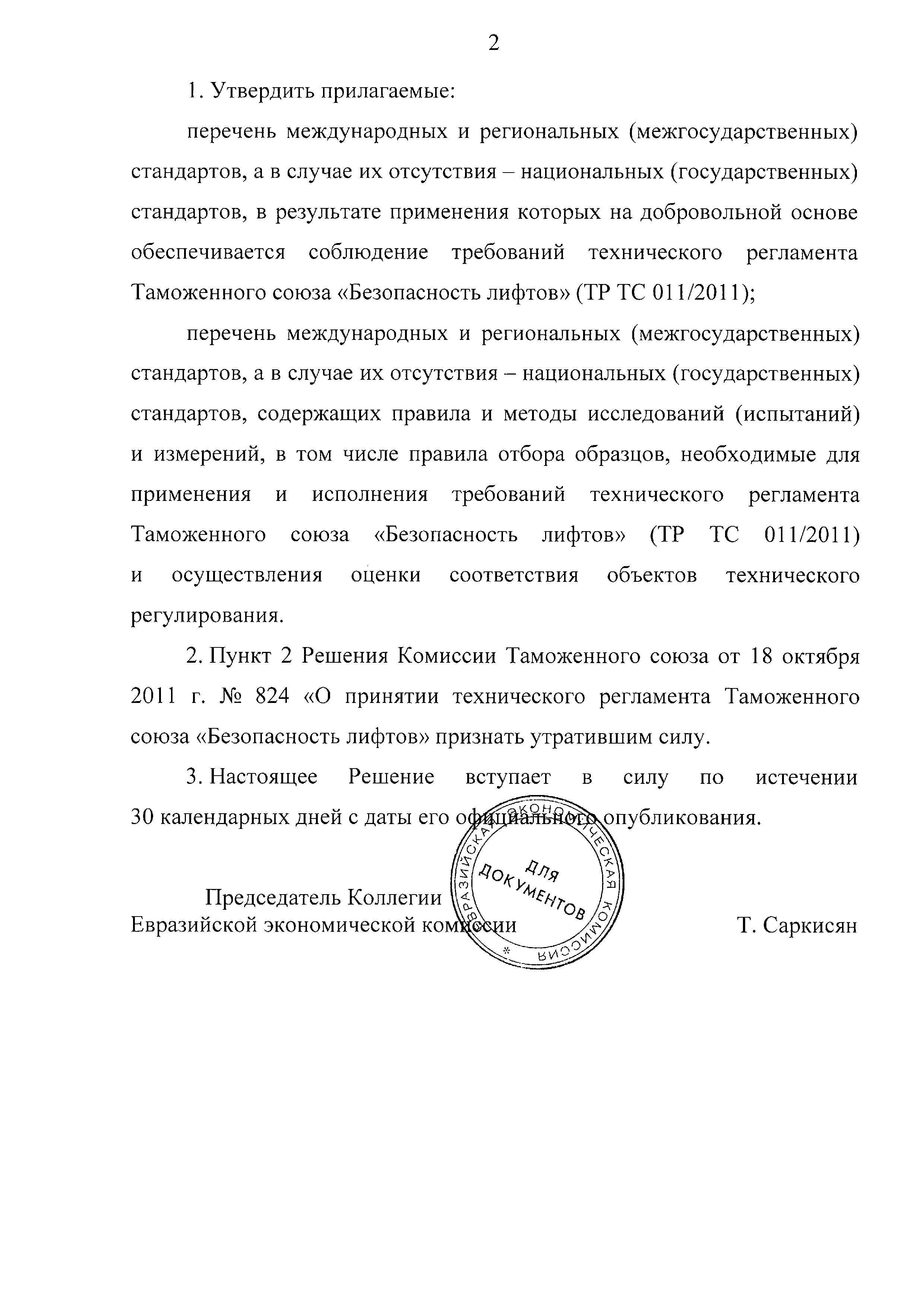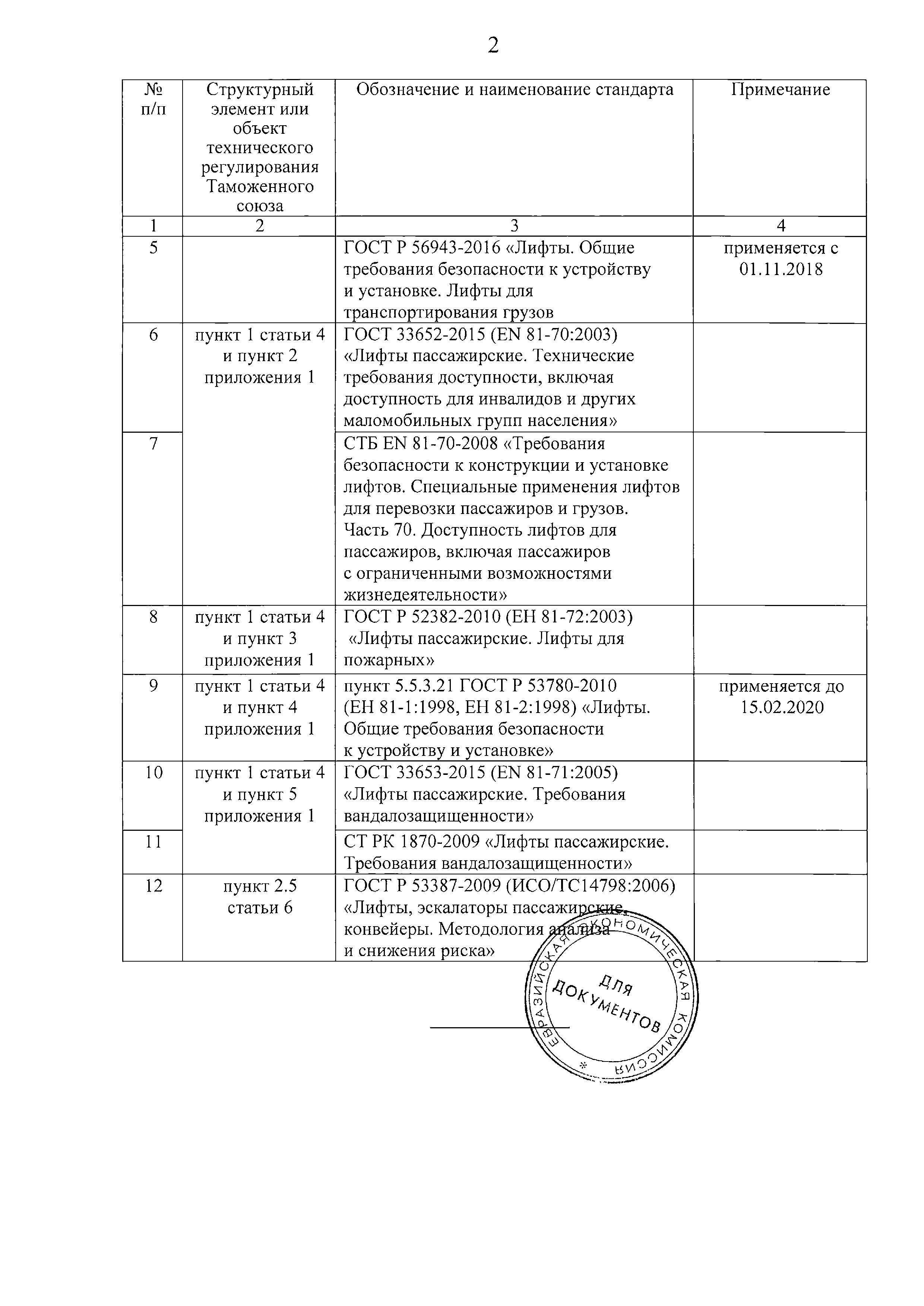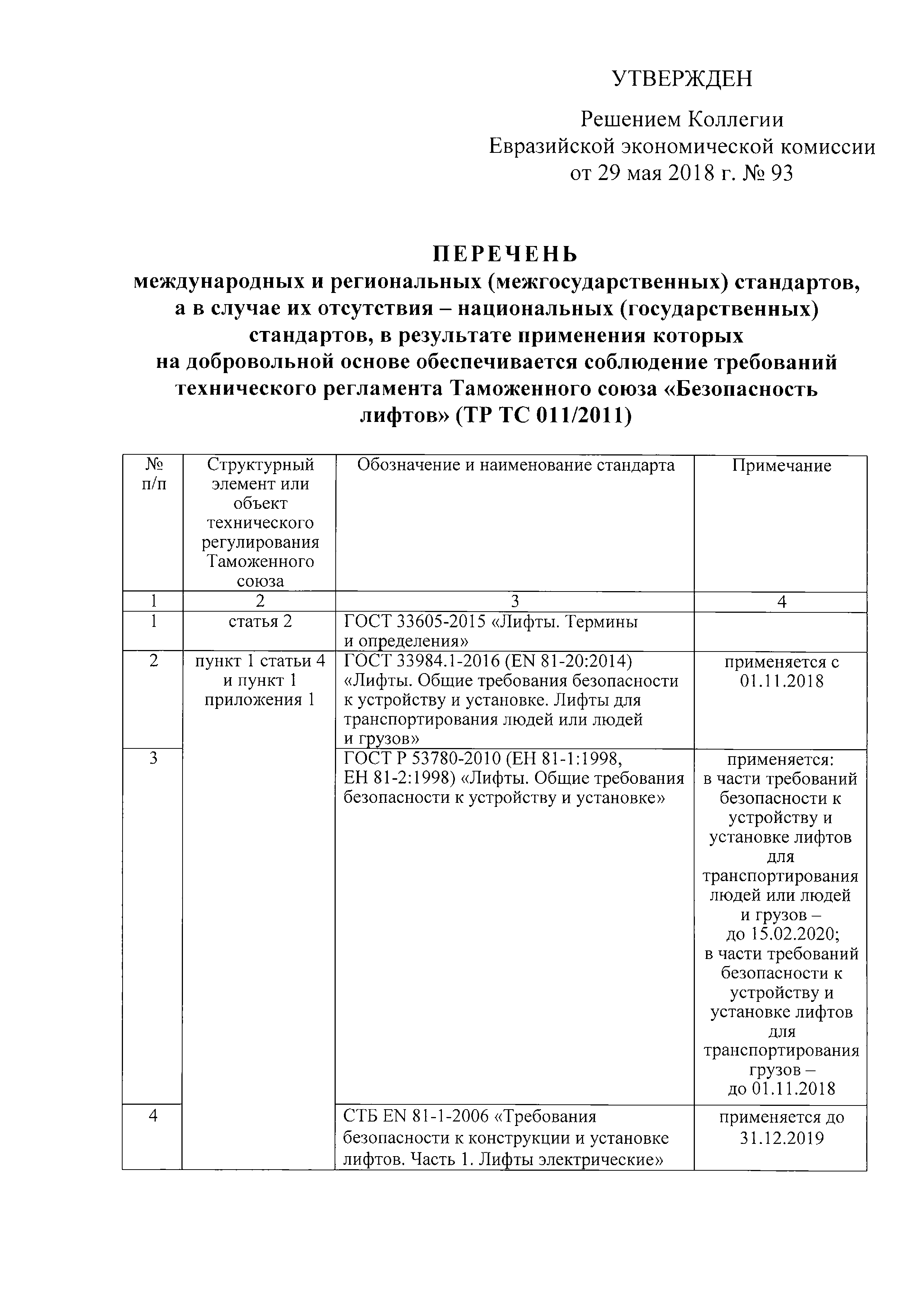 | Название рус.: | Перечень международных и региональных (межгосударственных) стандартов, а в случае их отсутствия - национальных (государственных) стандартов, в результате применения которых на добровольной основе обеспечивается соблюдение требований технического регламента Таможенного союза "Безопасность лифтов" (ТР ТС 011/2011) |