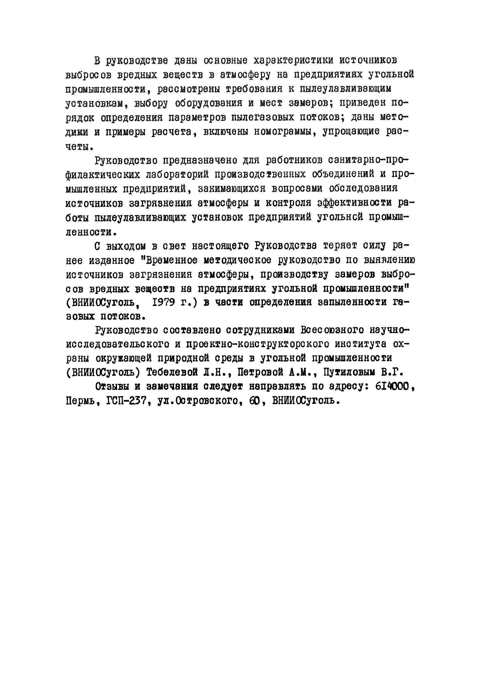 | Область применения: | В руководстве даны основные характеристики источников выбросов вредных веществ в атмосферу на предприятиях угольной промышленности, рассмотрены требования к пылеулавливающим установкам, выбору оборудования и мест замеров; приведен порядок определения параметров пылегазовых потоков; даны методики и примеры расчета, включены номограммы, упрощающие расчеты. Руководство предназначено для работников санитарно-профилактических лабораторий производственных объединений и промышленных предприятий, занимающихся вопросами обследования источников загрязнения атмосферы и контроля эффективности работы пылеулавливающих установок предприятий угольной промышленности |