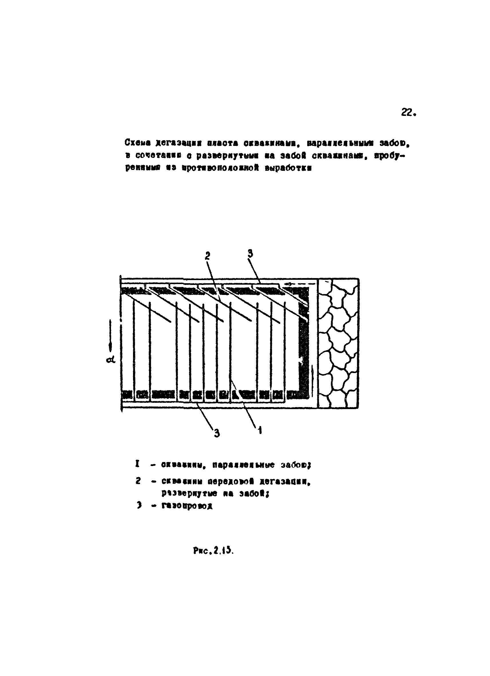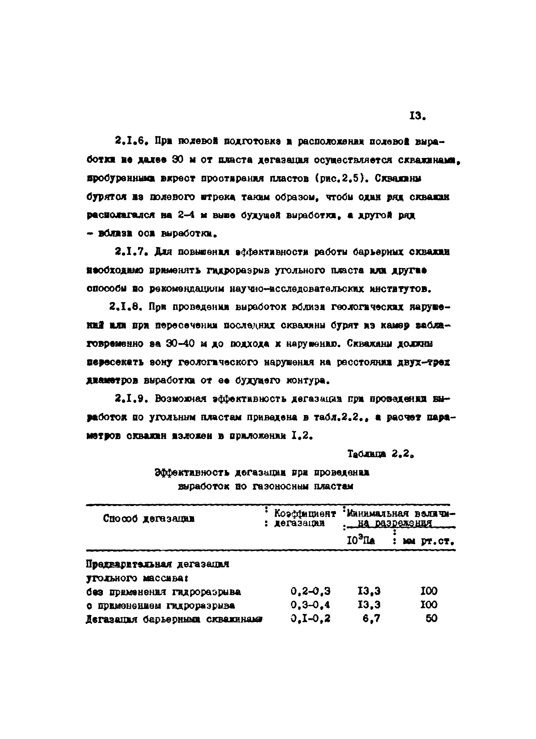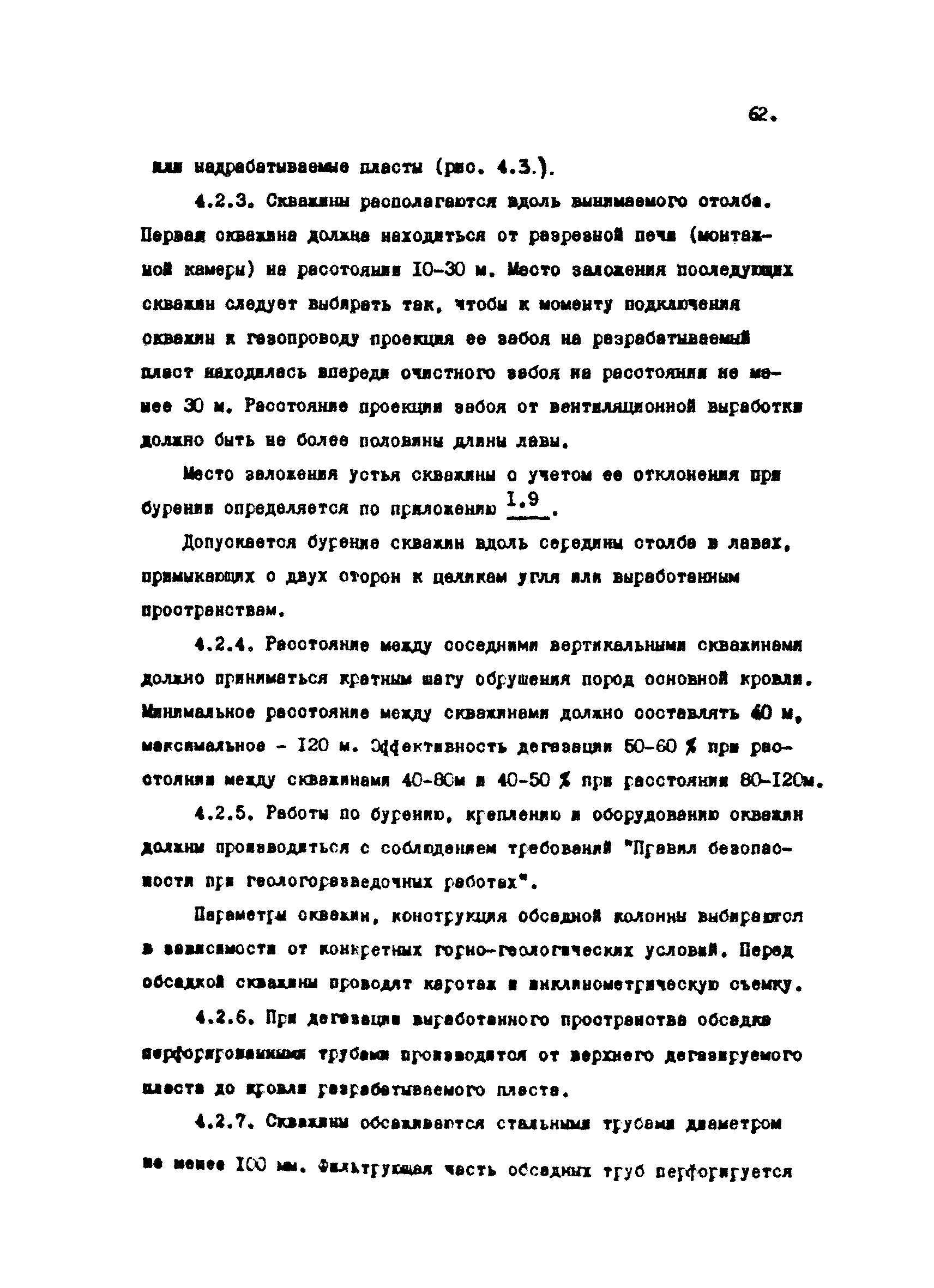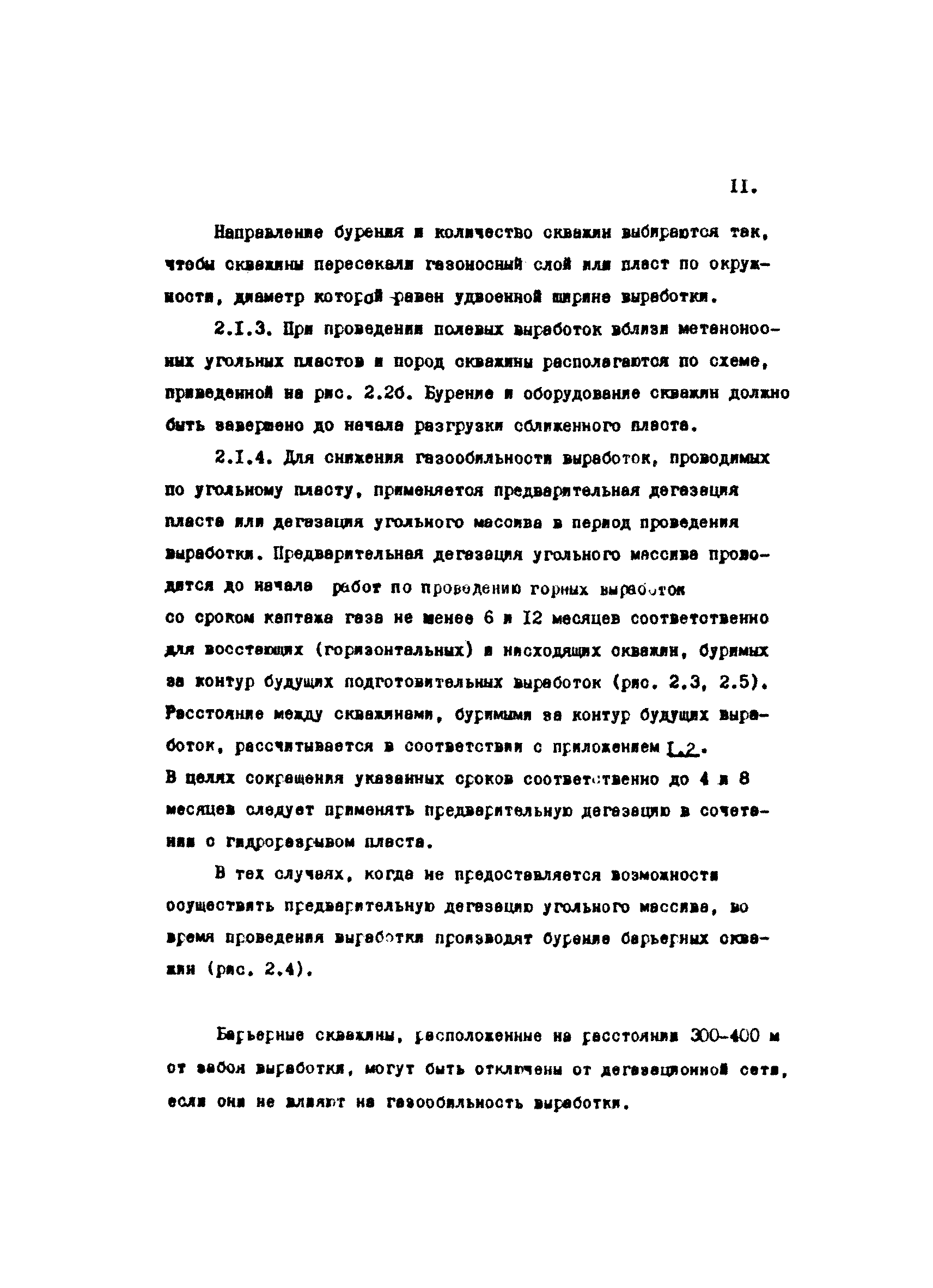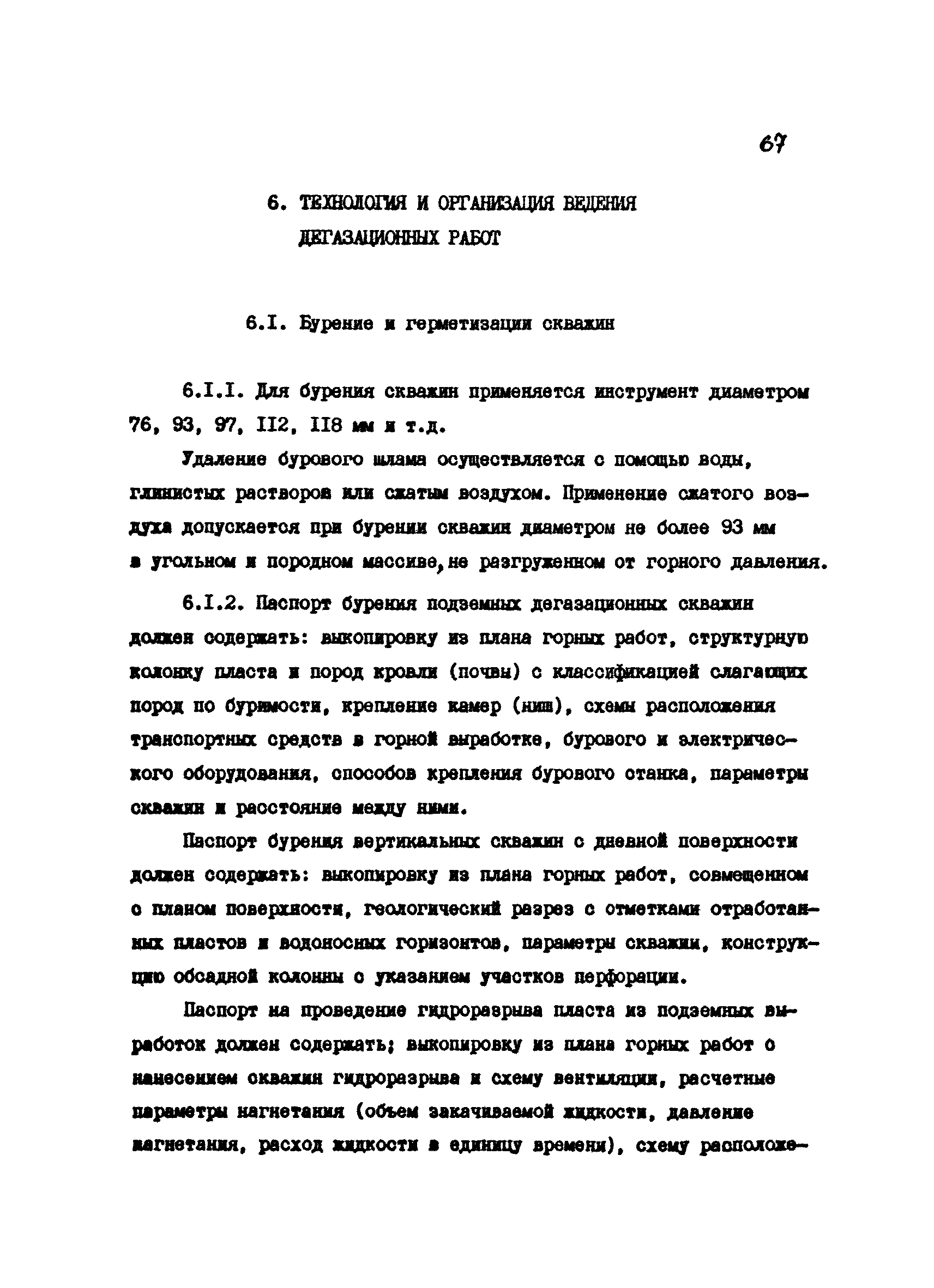 | Оглавление: | 1. Общие положения по дегазации угольных шахт 2. Способы дегазации неразгруженных угольных пластов 2.1. Дегазация при проведении горных выработок 2.2. Дегазация разрабатываемых угольных пластов скважинами, пробуренными из выработок 2.3. Дегазация разрабатываемых пластов скважинами с применением гидроразрыва 2.4. Дегазация угольных пластов скважинами гидрорасчленения, пробуренными с поверхности 3. Дегазация сближенных угольных пластов и вмещающих пород 3.1. Дегазация подрабатываемых пологих и наклонных пластов скважинами из выработок 3.2. Дегазация подрабатываемых пологих и наклонных пластов скважинами с поверхности 3.3. Дегазация надрабатываемых пологих и наклонных пластов 3.4. Дегазация подрабатываемых и надрабатываемых крутых пластов 4. Дегазация выработанного пространства 4.1. Дегазация выработанного пространства скважинами из подземных выработок 4.2. Дегазация выработанного пространства скважинами с поверхности 5. Метод предупреждения борьбы с суфлярами 6. Технология и организация ведения дегазационных работ 6.1. Бурение и герметизация скважин 6.2. Газопроводы 6.3. Контроль работы дегазационной сети 6.4. Организация службы дегазации 7. Вакуум-насосные станции (ВНС) 7.1. Общие положения 7.2. Стационарная вакуум-насосная станция на поверхности 7.3. Передвижные поверхностные вакуум-насосные станции 7.4. Передвижная подземная дегазационная установка Инструкция по безопасному ведению дегазационных работ на шахтах I. Общие положения II. Вакуум-насосные станции III. Газопроводы IV. Бурение дегазационных скважин V. Обслуживание дегазационной системы Приложение 1. Указания по определению параметров дегазации 1. Эффективность дегазации и ее контроль 2. Параметры дегазации при проведении подготовительных выработок 3. Параметры дегазации разрабатываемых пластов скважинами 4. Параметры гидроразрыва пласта через скважины, пробуренные из выработок 5. Параметры гидрорасчленения пластов Карагандинского бассейна через скважины, пробуренные с поверхности 6. Параметры дегазации подрабатываемых пологих и наклонных пластов 7. Параметры дегазации надрабатываемых пологих и наклонных пластов скважинами, пробуренными из выработок 8. Параметры дегазации подрабатываемых и надрабатываемых крутых пластов скважинами, пробуренными из выработок 9. Параметры дегазации выработанного пространства 10. Расчет газопроводов, выбор вакуум-насосов 11. Определение объемов каптируемого в шахтах метана 12. Приближенное определение необходимого количества скважин и разрежения в них при дегазации подрабатываемого массива Приложение 2. Методические указания по проведению вакуумно-газовой съемки в дегазационном трубопроводе Приложение 3. Определение мест подсосов воздуха в скважины, выбор способов их снижения Условные обозначения к приложениям |