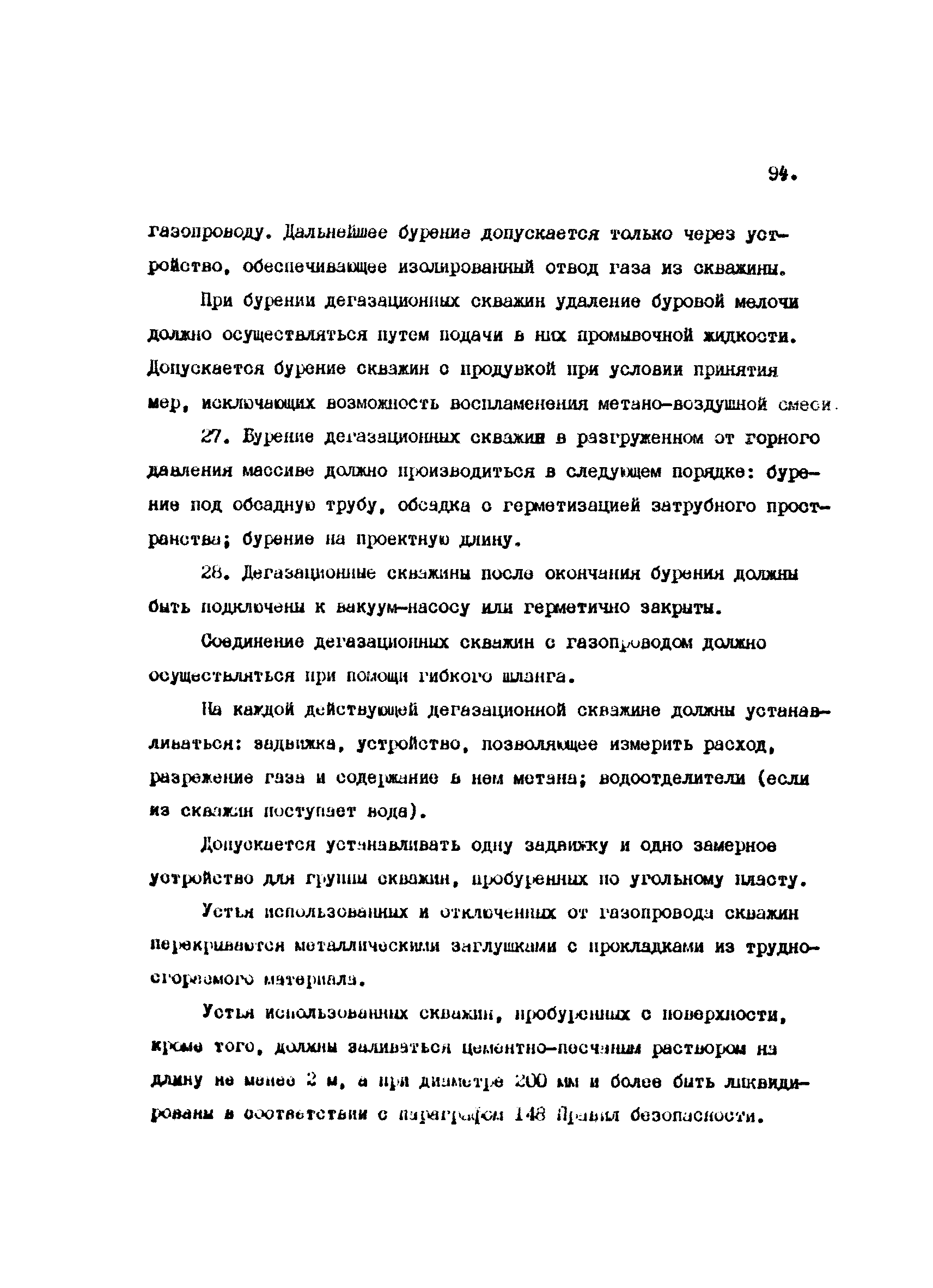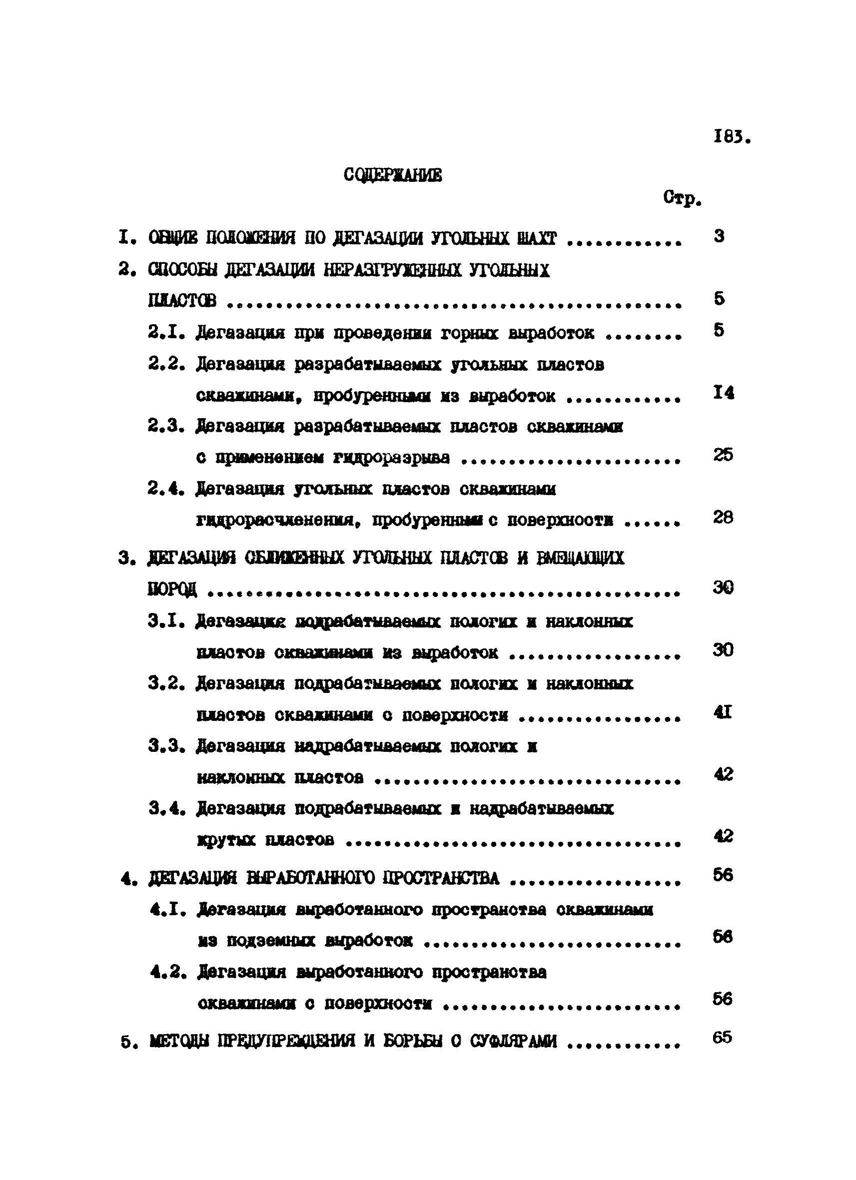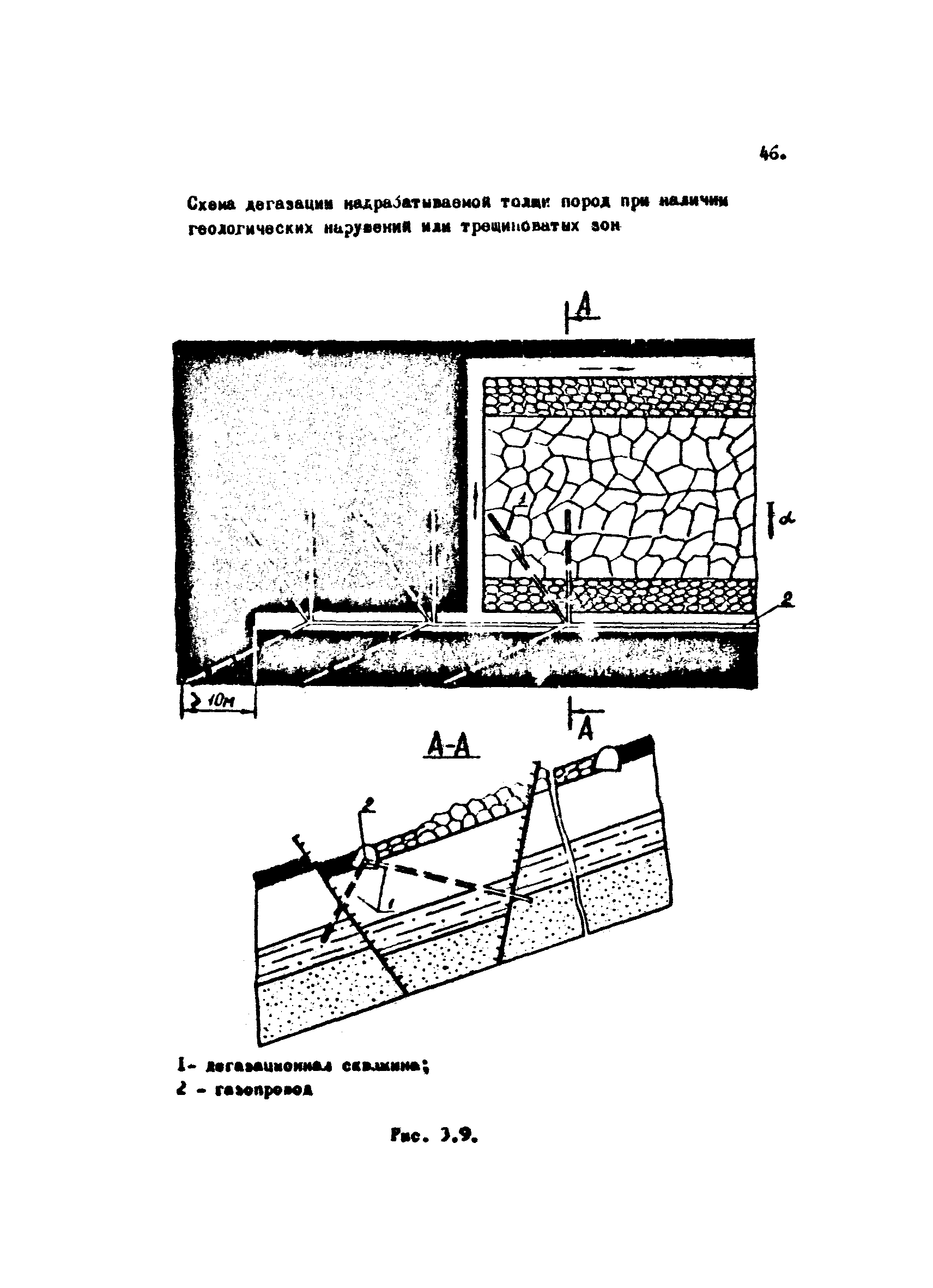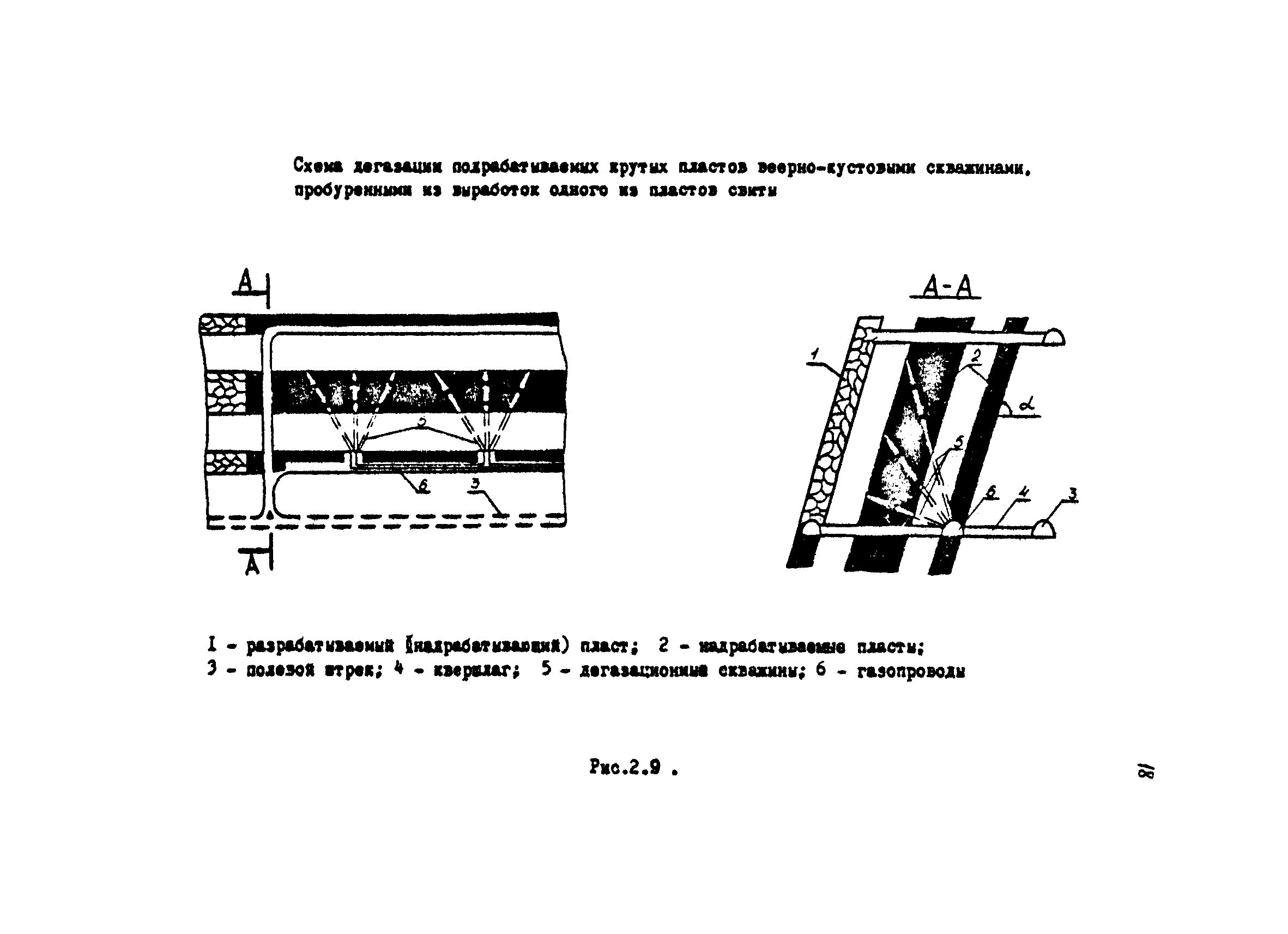 | Оглавление: | 1. Общие положения по дегазации угольных шахт 2. Способы дегазации неразгруженных угольных пластов 2.1. Дегазация при проведении горных выработок 2.2. Дегазация разрабатываемых угольных пластов скважинами, пробуренными из выработок 2.3. Дегазация разрабатываемых пластов скважинами с применением гидроразрыва 2.4. Дегазация угольных пластов скважинами гидрорасчленения, пробуренными с поверхности 3. Дегазация сближенных угольных пластов и вмещающих пород 3.1. Дегазация подрабатываемых пологих и наклонных пластов скважинами из выработок 3.2. Дегазация подрабатываемых пологих и наклонных пластов скважинами с поверхности 3.3. Дегазация надрабатываемых пологих и наклонных пластов 3.4. Дегазация подрабатываемых и надрабатываемых крутых пластов 4. Дегазация выработанного пространства 4.1. Дегазация выработанного пространства скважинами из подземных выработок 4.2. Дегазация выработанного пространства скважинами с поверхности 5. Метод предупреждения борьбы с суфлярами 6. Технология и организация ведения дегазационных работ 6.1. Бурение и герметизация скважин 6.2. Газопроводы 6.3. Контроль работы дегазационной сети 6.4. Организация службы дегазации 7. Вакуум-насосные станции (ВНС) 7.1. Общие положения 7.2. Стационарная вакуум-насосная станция на поверхности 7.3. Передвижные поверхностные вакуум-насосные станции 7.4. Передвижная подземная дегазационная установка Инструкция по безопасному ведению дегазационных работ на шахтах I. Общие положения II. Вакуум-насосные станции III. Газопроводы IV. Бурение дегазационных скважин V. Обслуживание дегазационной системы Приложение 1. Указания по определению параметров дегазации 1. Эффективность дегазации и ее контроль 2. Параметры дегазации при проведении подготовительных выработок 3. Параметры дегазации разрабатываемых пластов скважинами 4. Параметры гидроразрыва пласта через скважины, пробуренные из выработок 5. Параметры гидрорасчленения пластов Карагандинского бассейна через скважины, пробуренные с поверхности 6. Параметры дегазации подрабатываемых пологих и наклонных пластов 7. Параметры дегазации надрабатываемых пологих и наклонных пластов скважинами, пробуренными из выработок 8. Параметры дегазации подрабатываемых и надрабатываемых крутых пластов скважинами, пробуренными из выработок 9. Параметры дегазации выработанного пространства 10. Расчет газопроводов, выбор вакуум-насосов 11. Определение объемов каптируемого в шахтах метана 12. Приближенное определение необходимого количества скважин и разрежения в них при дегазации подрабатываемого массива Приложение 2. Методические указания по проведению вакуумно-газовой съемки в дегазационном трубопроводе Приложение 3. Определение мест подсосов воздуха в скважины, выбор способов их снижения Условные обозначения к приложениям |