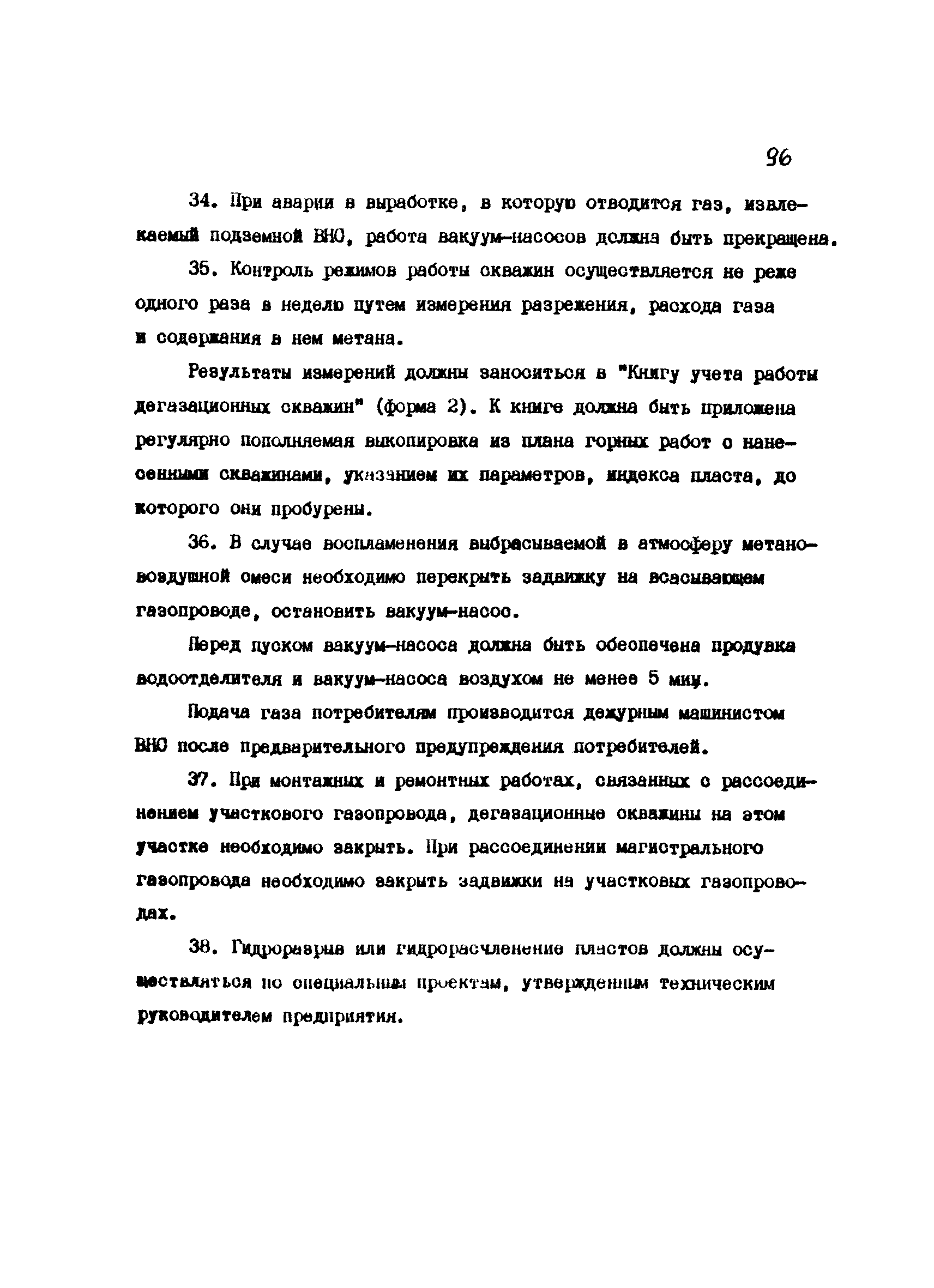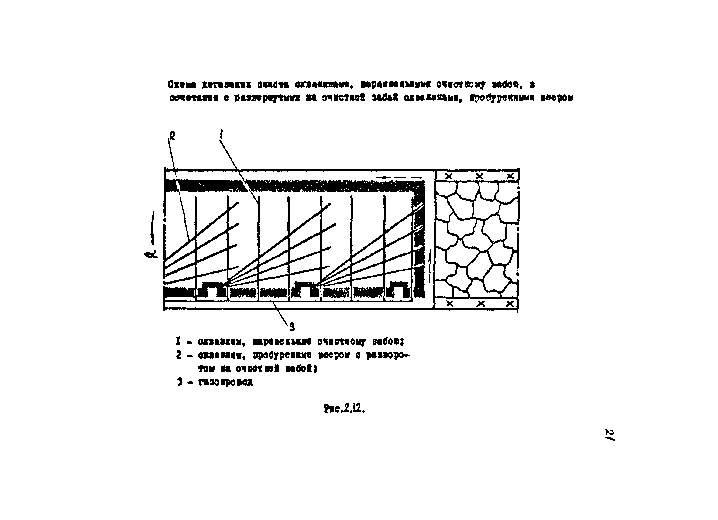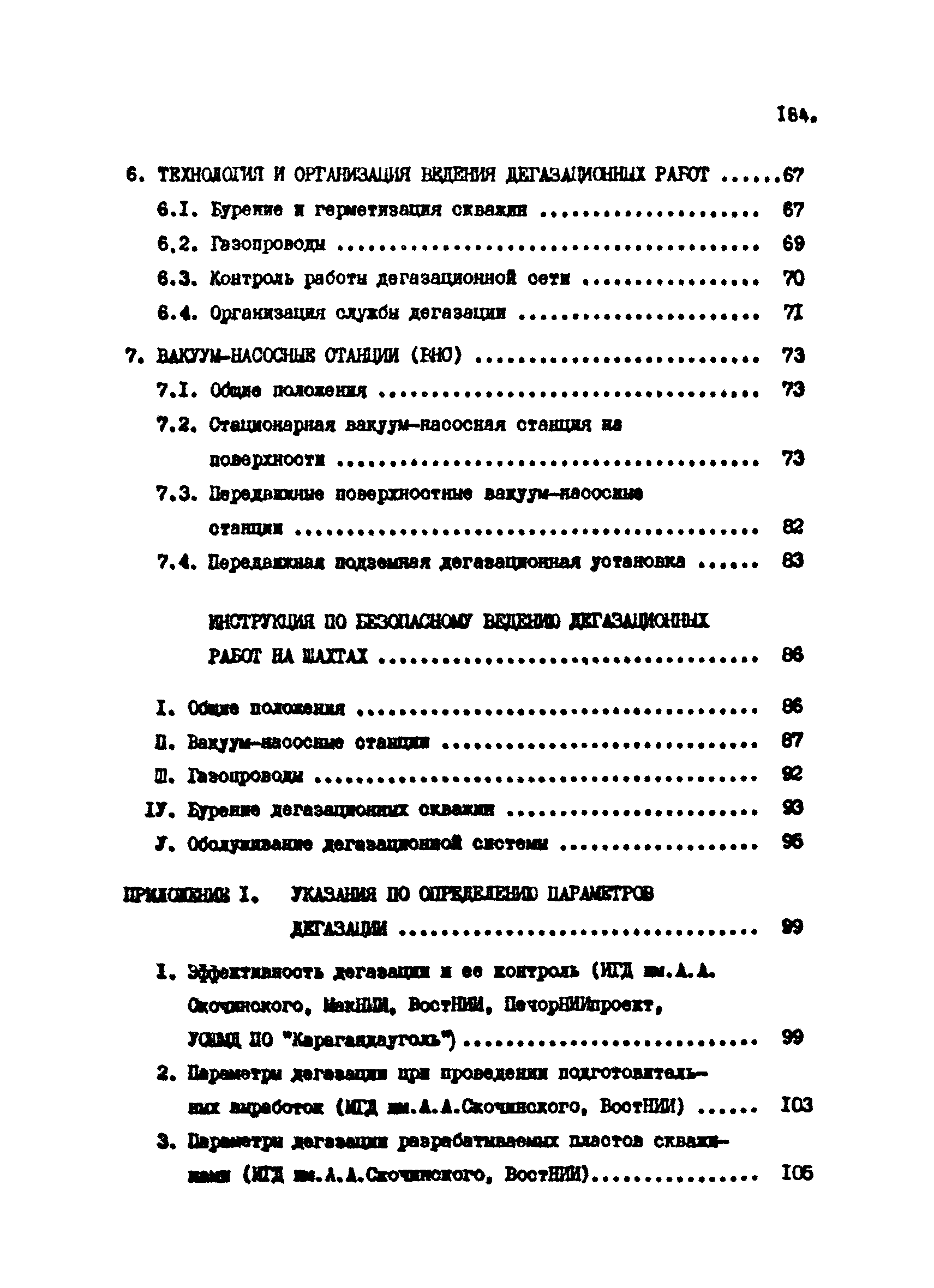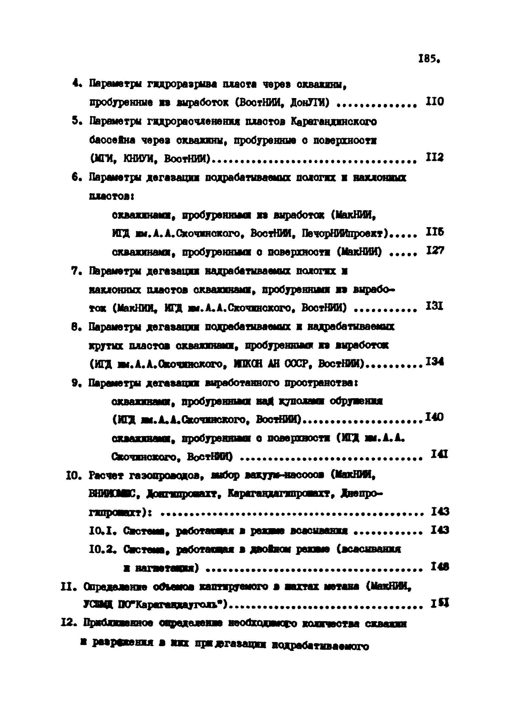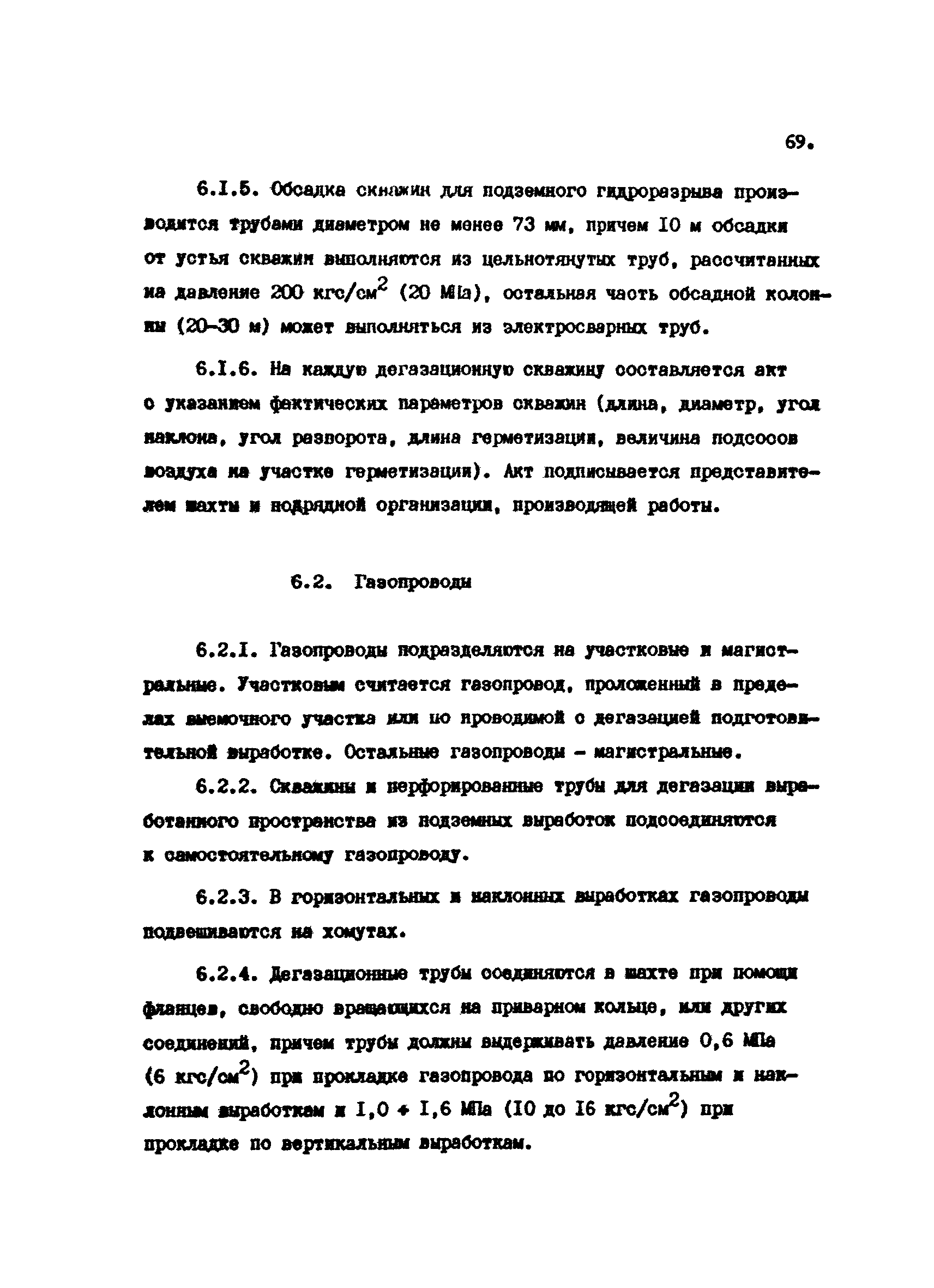 | Оглавление: | 1. Общие положения по дегазации угольных шахт 2. Способы дегазации неразгруженных угольных пластов 2.1. Дегазация при проведении горных выработок 2.2. Дегазация разрабатываемых угольных пластов скважинами, пробуренными из выработок 2.3. Дегазация разрабатываемых пластов скважинами с применением гидроразрыва 2.4. Дегазация угольных пластов скважинами гидрорасчленения, пробуренными с поверхности 3. Дегазация сближенных угольных пластов и вмещающих пород 3.1. Дегазация подрабатываемых пологих и наклонных пластов скважинами из выработок 3.2. Дегазация подрабатываемых пологих и наклонных пластов скважинами с поверхности 3.3. Дегазация надрабатываемых пологих и наклонных пластов 3.4. Дегазация подрабатываемых и надрабатываемых крутых пластов 4. Дегазация выработанного пространства 4.1. Дегазация выработанного пространства скважинами из подземных выработок 4.2. Дегазация выработанного пространства скважинами с поверхности 5. Метод предупреждения борьбы с суфлярами 6. Технология и организация ведения дегазационных работ 6.1. Бурение и герметизация скважин 6.2. Газопроводы 6.3. Контроль работы дегазационной сети 6.4. Организация службы дегазации 7. Вакуум-насосные станции (ВНС) 7.1. Общие положения 7.2. Стационарная вакуум-насосная станция на поверхности 7.3. Передвижные поверхностные вакуум-насосные станции 7.4. Передвижная подземная дегазационная установка Инструкция по безопасному ведению дегазационных работ на шахтах I. Общие положения II. Вакуум-насосные станции III. Газопроводы IV. Бурение дегазационных скважин V. Обслуживание дегазационной системы Приложение 1. Указания по определению параметров дегазации 1. Эффективность дегазации и ее контроль 2. Параметры дегазации при проведении подготовительных выработок 3. Параметры дегазации разрабатываемых пластов скважинами 4. Параметры гидроразрыва пласта через скважины, пробуренные из выработок 5. Параметры гидрорасчленения пластов Карагандинского бассейна через скважины, пробуренные с поверхности 6. Параметры дегазации подрабатываемых пологих и наклонных пластов 7. Параметры дегазации надрабатываемых пологих и наклонных пластов скважинами, пробуренными из выработок 8. Параметры дегазации подрабатываемых и надрабатываемых крутых пластов скважинами, пробуренными из выработок 9. Параметры дегазации выработанного пространства 10. Расчет газопроводов, выбор вакуум-насосов 11. Определение объемов каптируемого в шахтах метана 12. Приближенное определение необходимого количества скважин и разрежения в них при дегазации подрабатываемого массива Приложение 2. Методические указания по проведению вакуумно-газовой съемки в дегазационном трубопроводе Приложение 3. Определение мест подсосов воздуха в скважины, выбор способов их снижения Условные обозначения к приложениям |