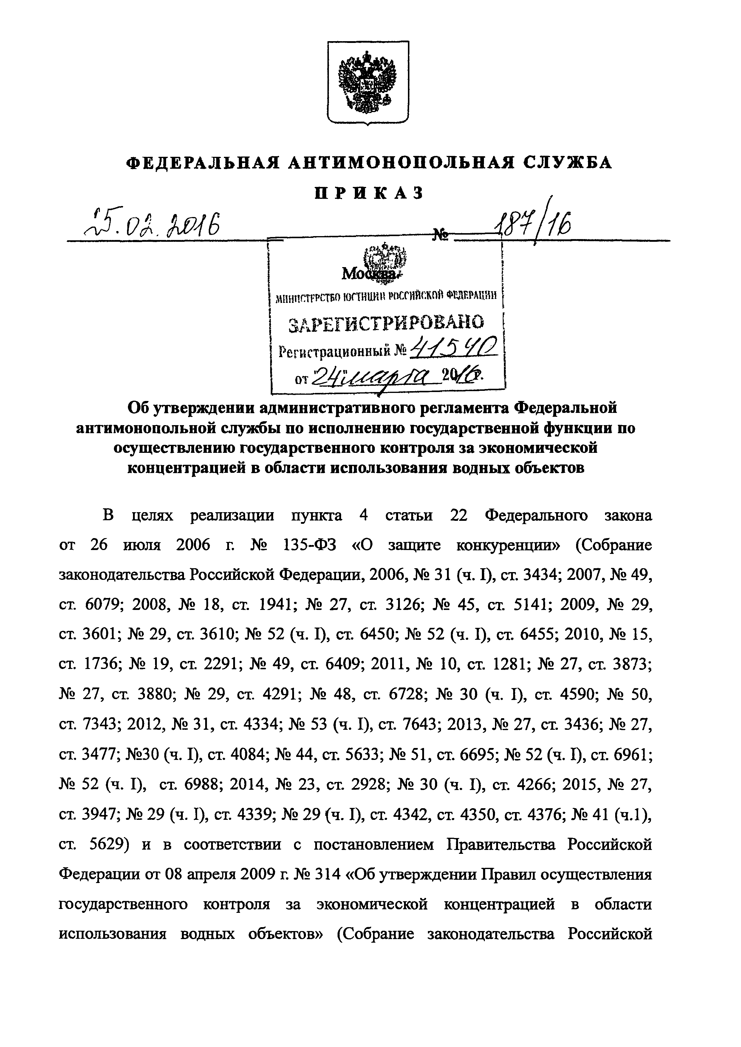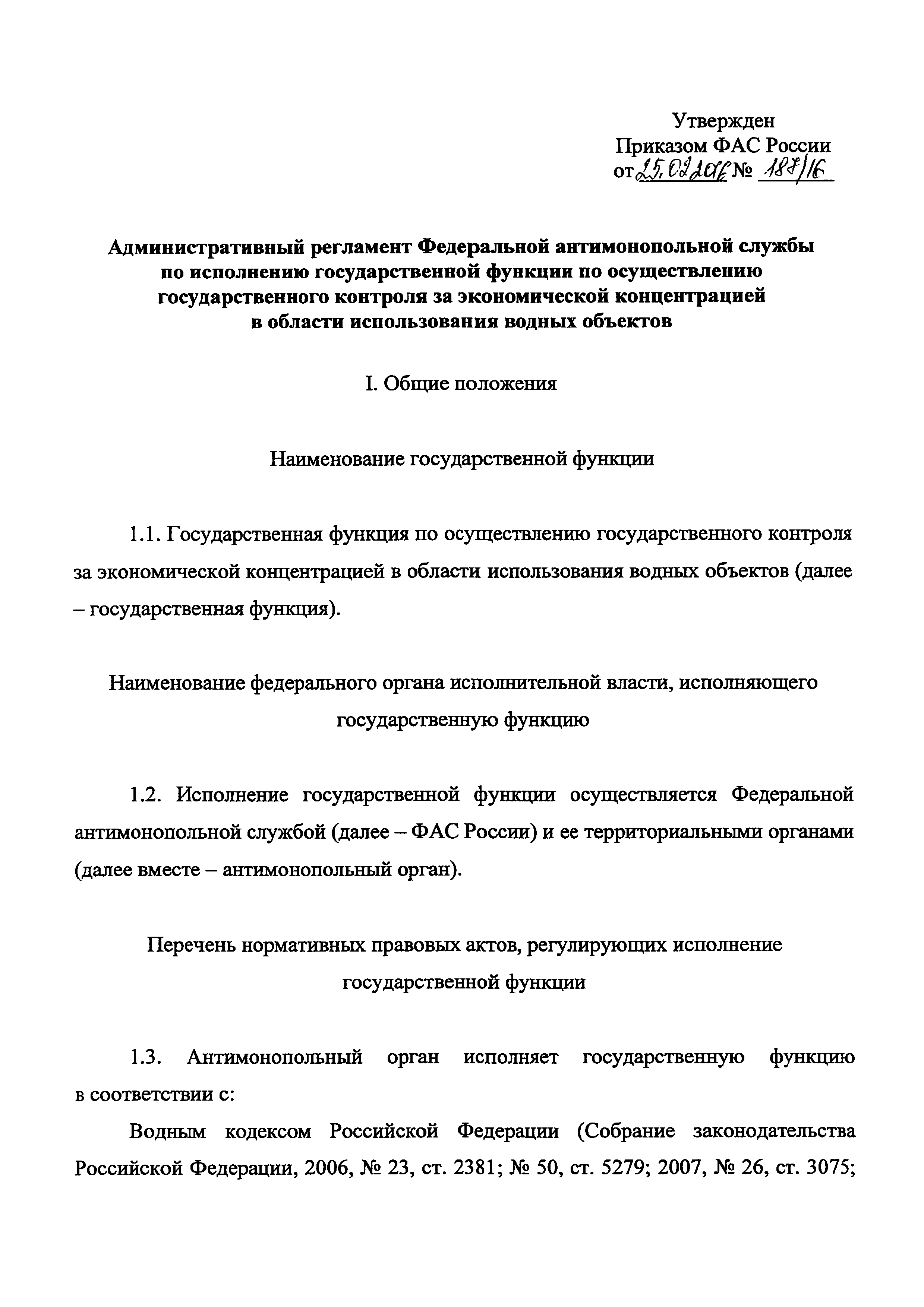 | Название рус.: | Административный регламент Федеральной антимонопольной службы по исполнению государственной функции по осуществлению государственного контроля за экономической концентрацией в области использования водных объектов |