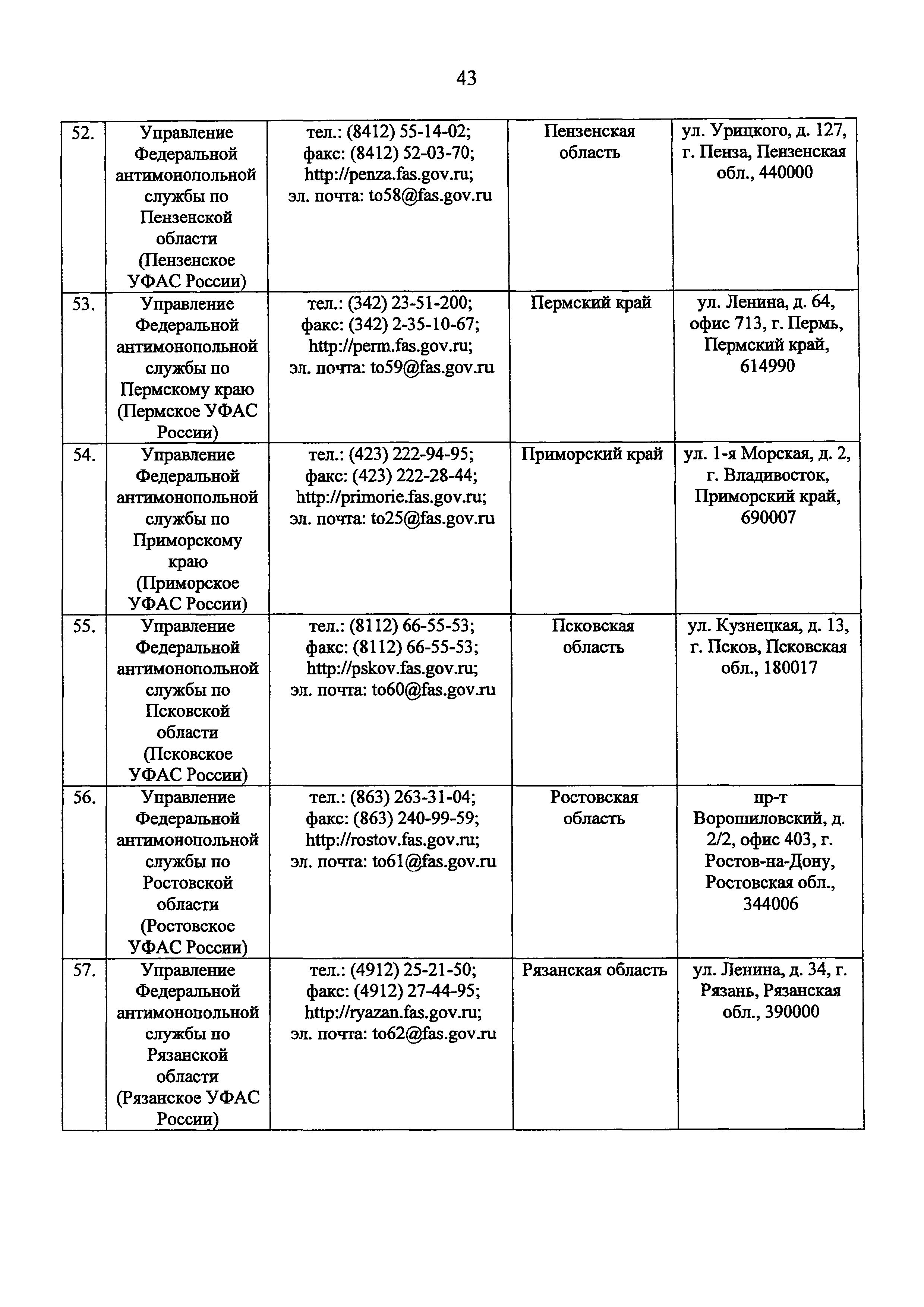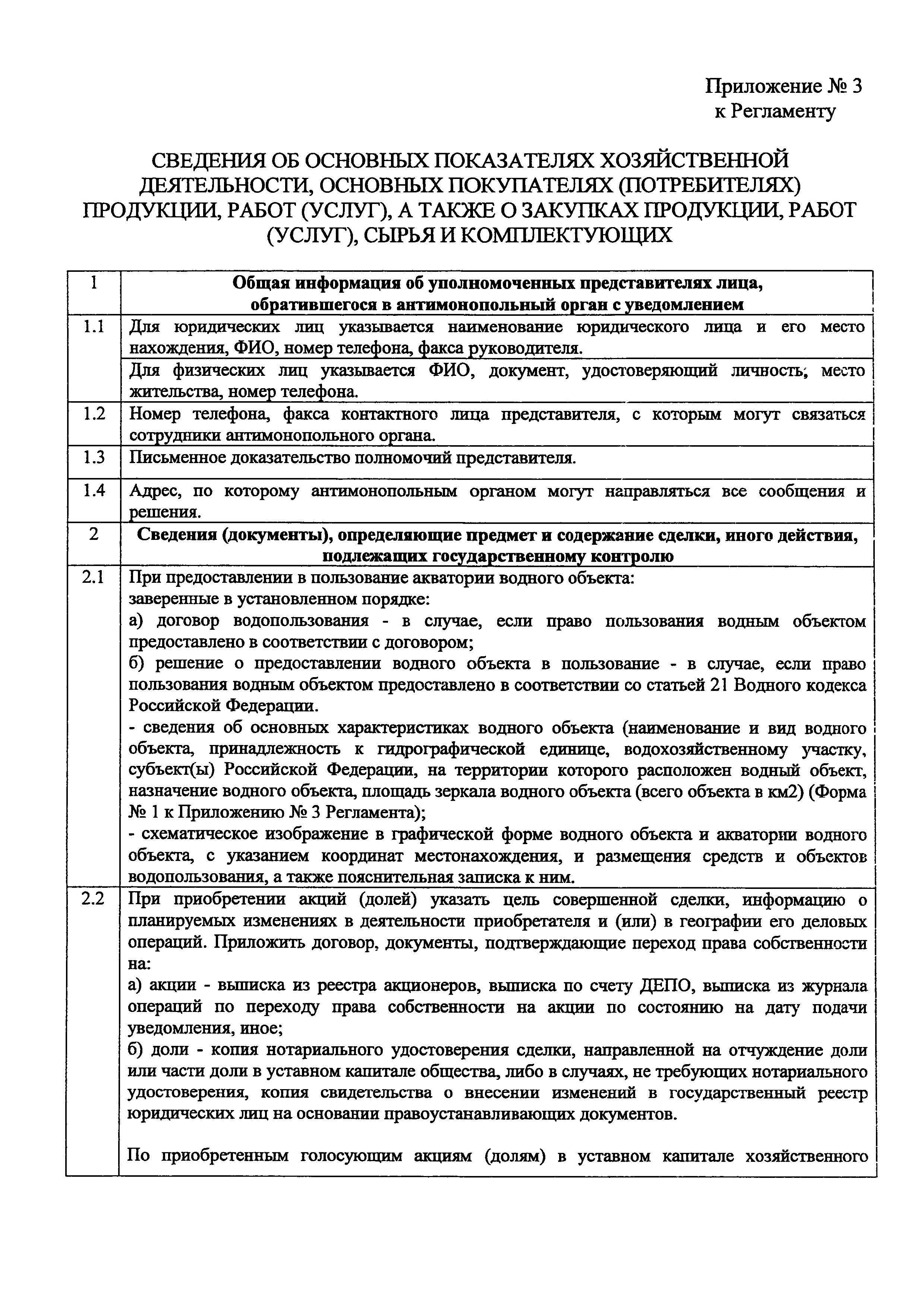 | Оглавление: | I. Общие положения II. Требования к порядку исполнения государственной функции III. Состав, последовательность и сроки выполнения административных процедур (действий), требования к порядку их выполнения, в том числе особенности выполнения административных процедур (действий) в электронной форме IV. Порядок и формы контроля за исполнением государственной функции V. Досудебный (внесудебный) порядок обжалования действий (бездействия) антимонопольного органа, а также должностных лиц ФАС России Приложение № 1. Перечень территориальных органов ФАС России, исполняющих государственную функцию Приложение № 2. Блок-схема исполнения ФАС России государственной функции по осуществлению государственного контроля за экономической концентрацией в области использования водных объектов Приложение № 3. Сведения об основных показателях хозяйственной деятельности, основных покупателях (потребителях) продукции, работ (услуг), а также о закупках продукции, работ (услуг), сырья и комплектующих Форма № 1. Сведения об основных характеристиках водного объекта Форма № 2. Сведения об основных показателях хозяйственной деятельности, об основных покупателях (потребителях) продукции (работ, услуг), о закупках продукции (работ, услуг), сырья и комплектующих |