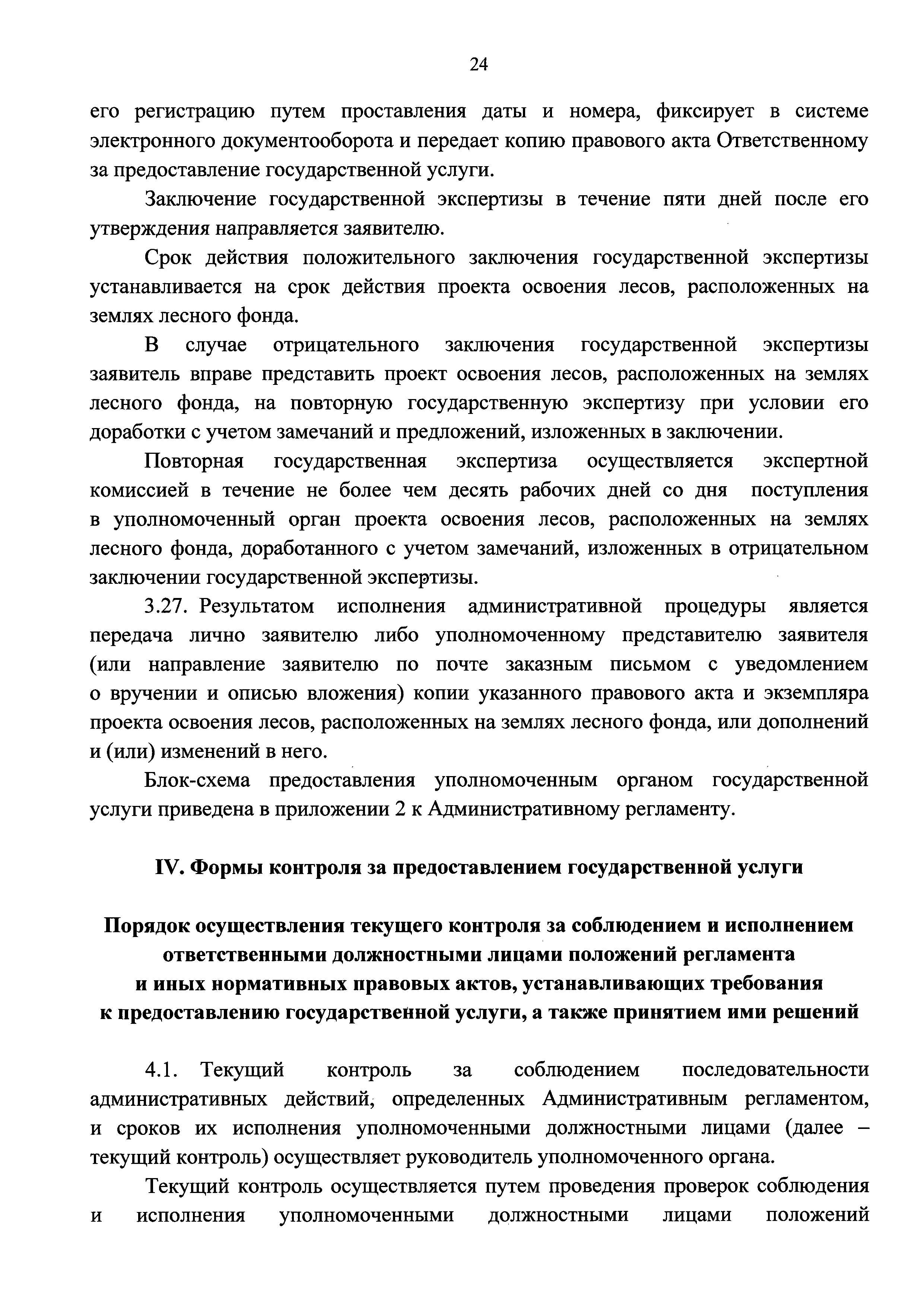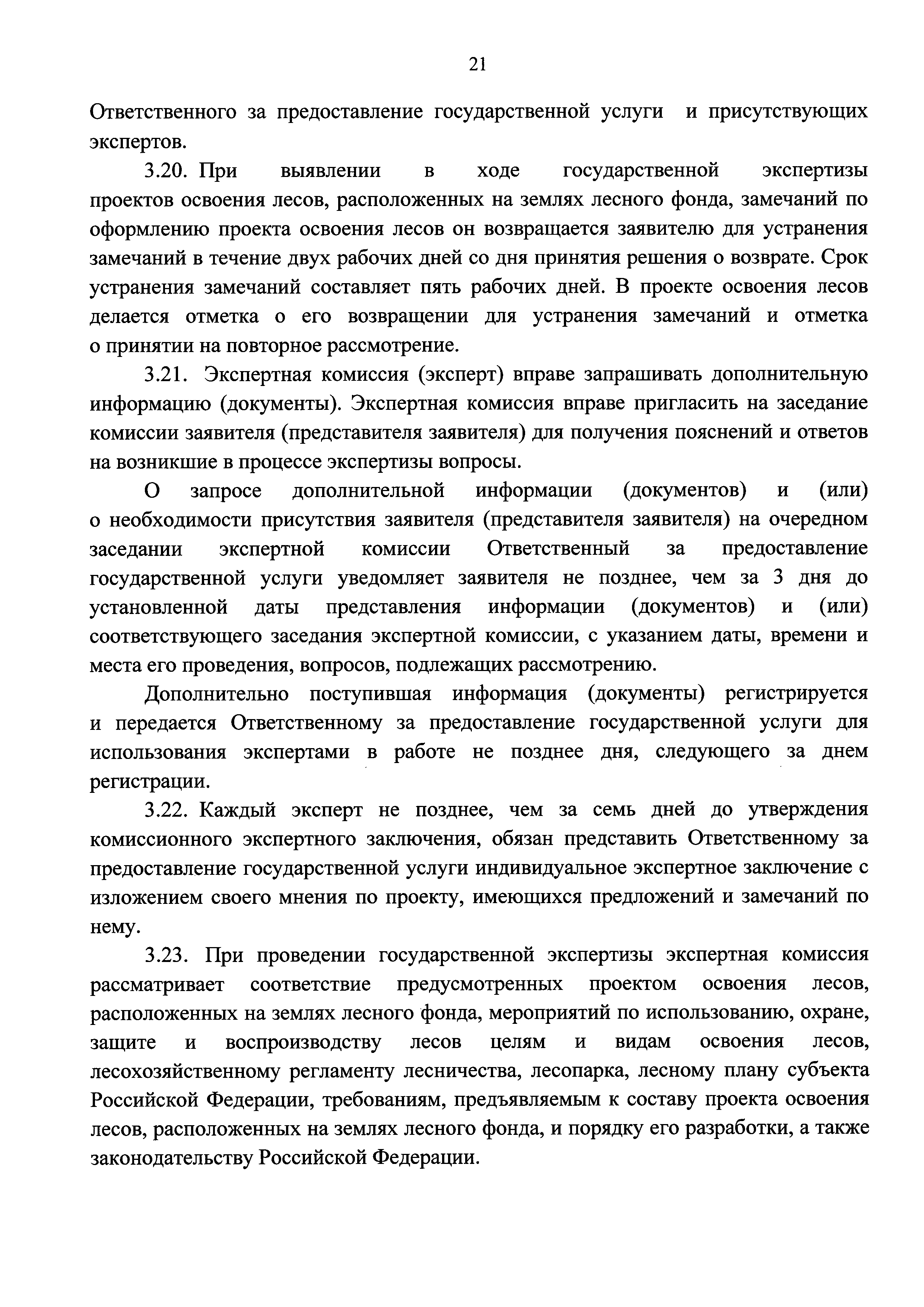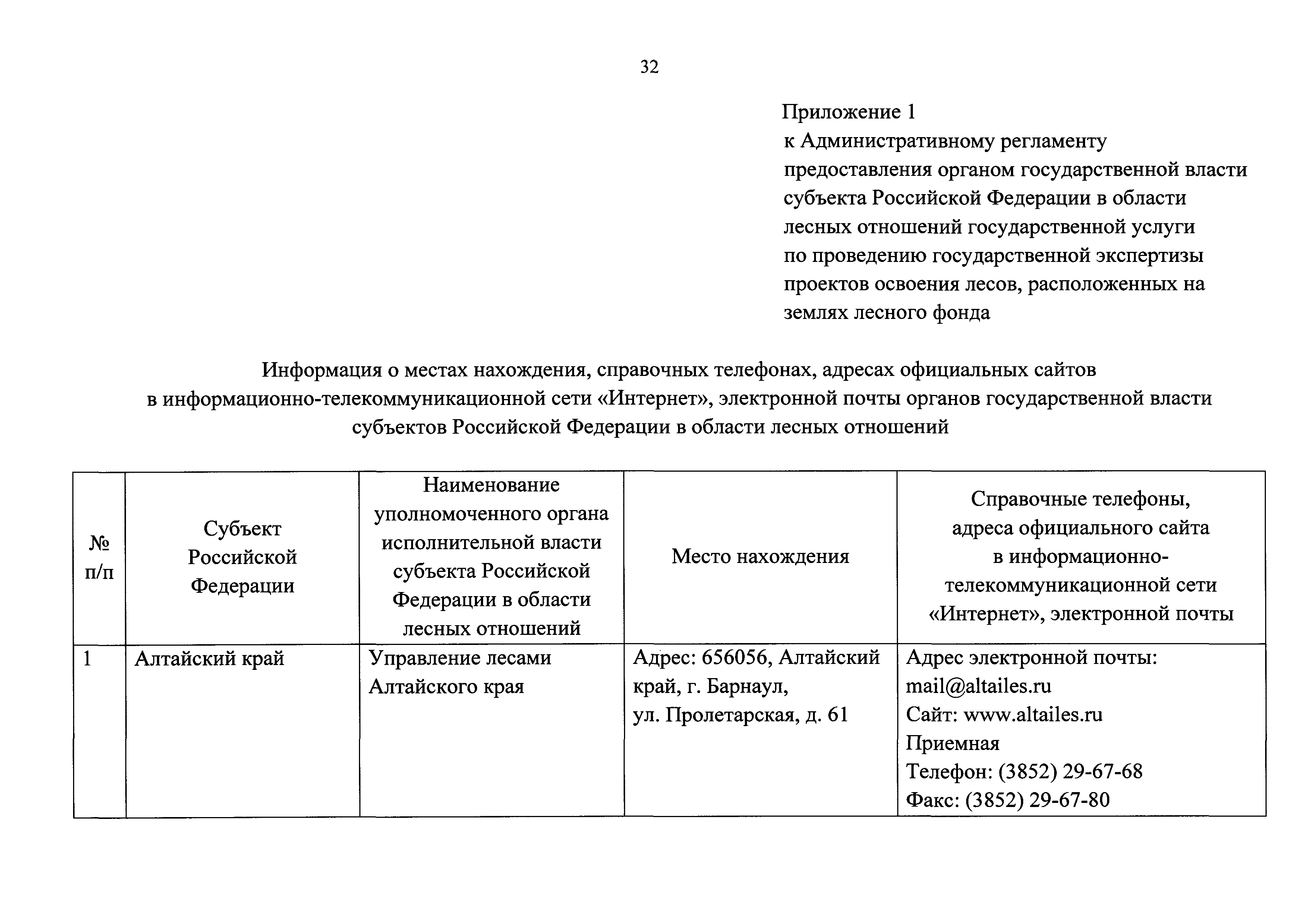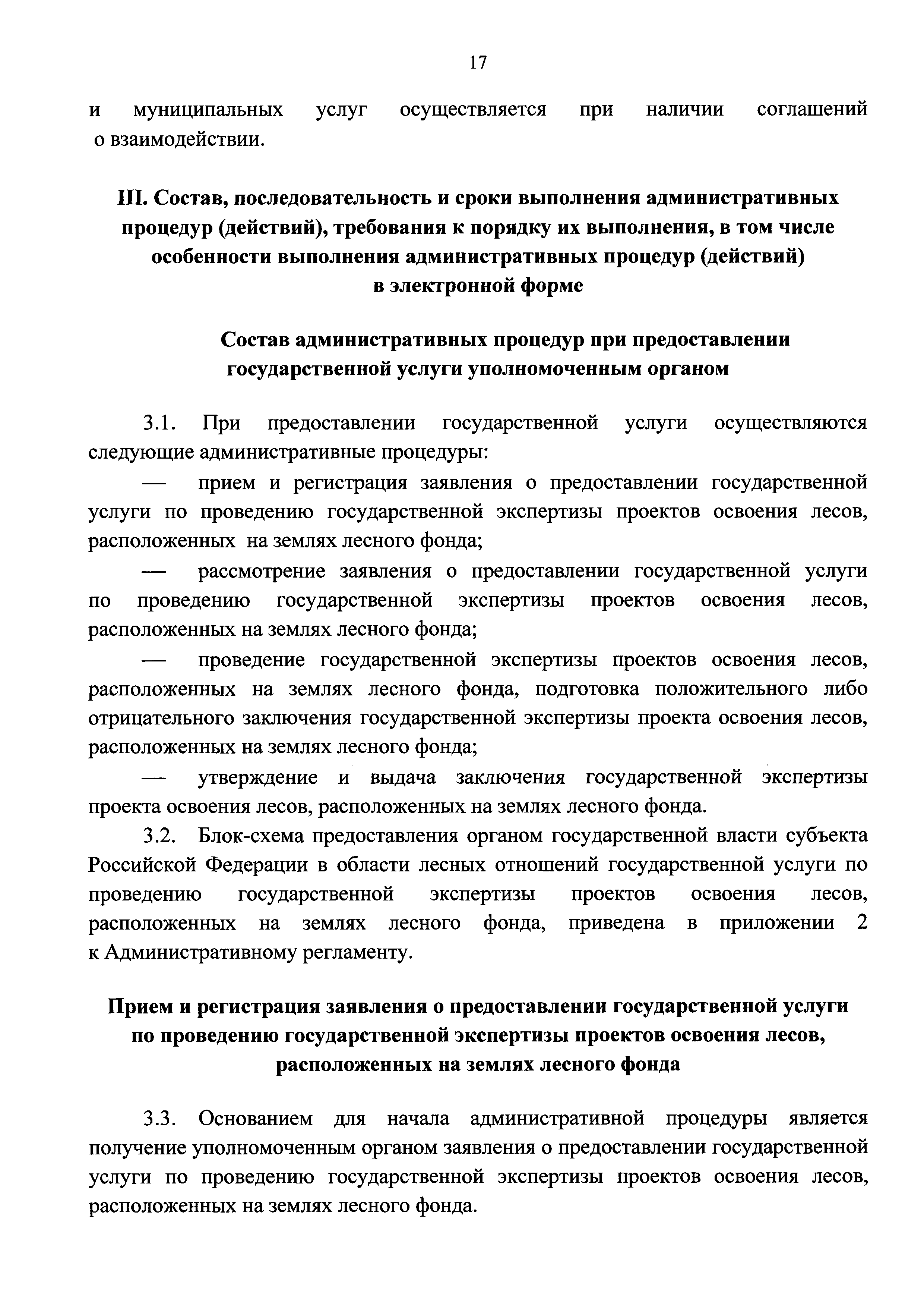 | Оглавление: | I. Общие положения II. Стандарт предоставления государственной услуги III. Состав, последовательность и сроки выполнения административных процедур (действий), требования к порядку их выполнения, в том числе особенности выполнения административных процедур (действий) в электронной форме IV. Формы контроля за предоставлением государственной услуги V. Досудебный (внесудебный) порядок обжалования решений и действий (бездействия) уполномоченного органа, предоставляющего государственную услугу, а также его должностных лиц Приложение 1. Информация о местах нахождения, справочных телефонах, адресах официальных сайтов в информационно-телекоммуникационной сети "Интернет", электронной почты органов государственной власти субъектов Российской Федерации в области лесных отношений Приложение 2. Блок-схема предоставления органом государственной власти субъекта Российской Федерации в области лесных отношений государственной услуги по проведению государственной экспертизы проектов освоения лесов, расположенных на землях лесного фонда Приложение 3. Заявление о проведении государственной экспертизы проекта освоения лесов, расположенных на землях лесного фонда |