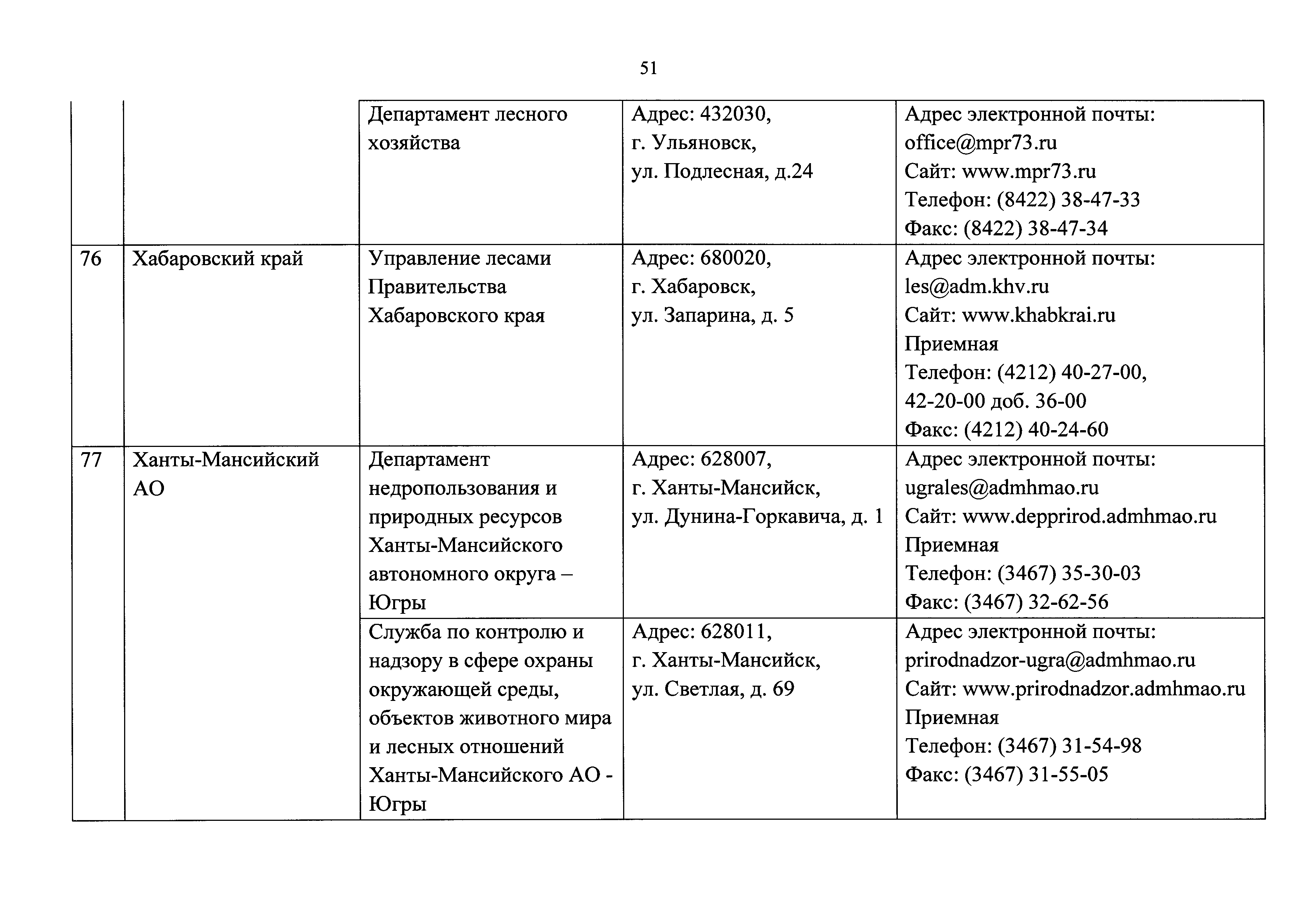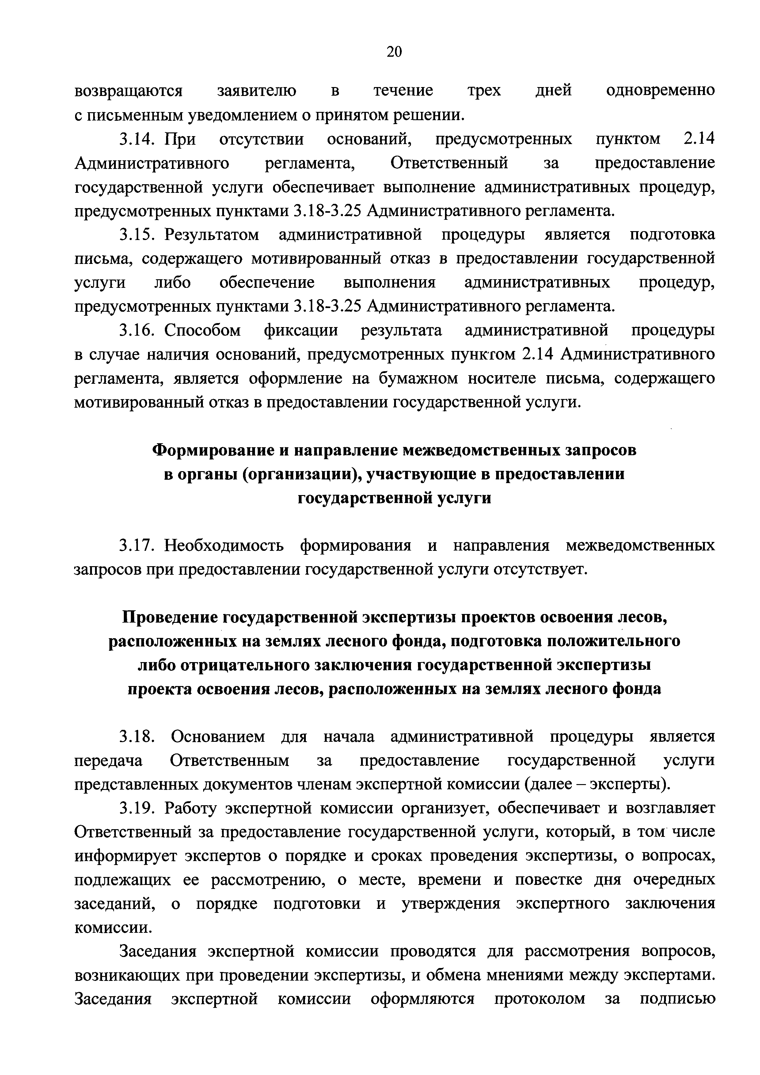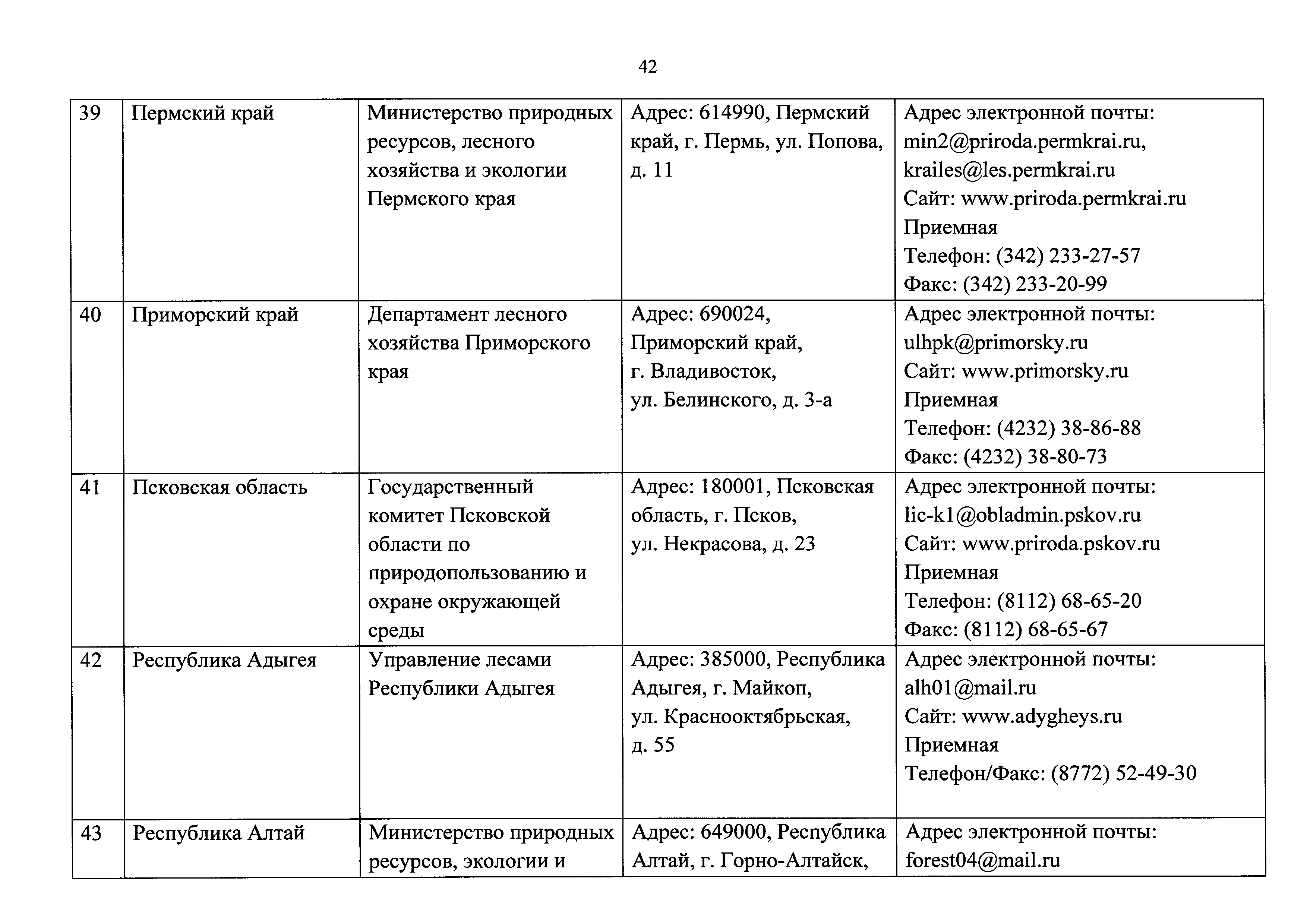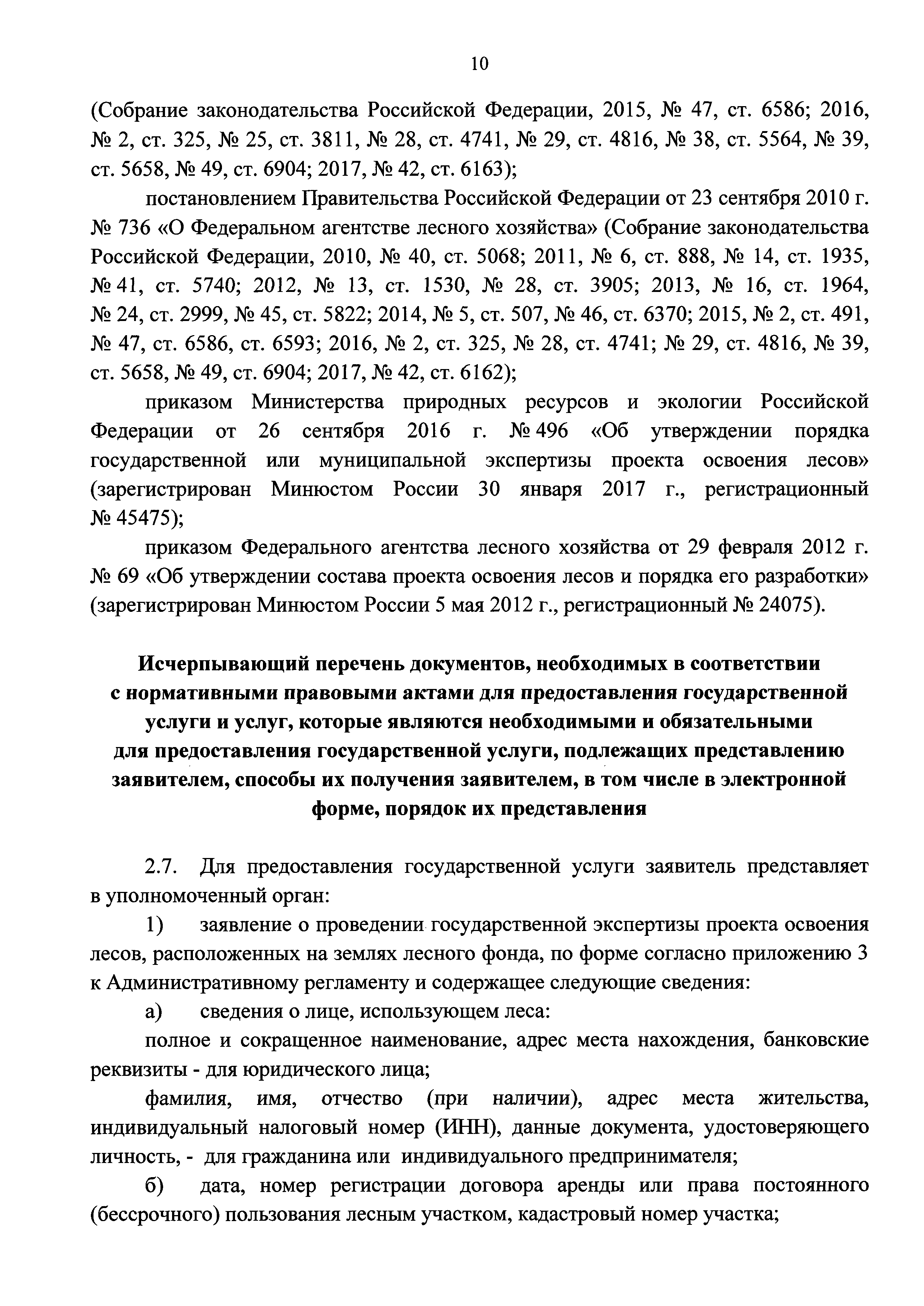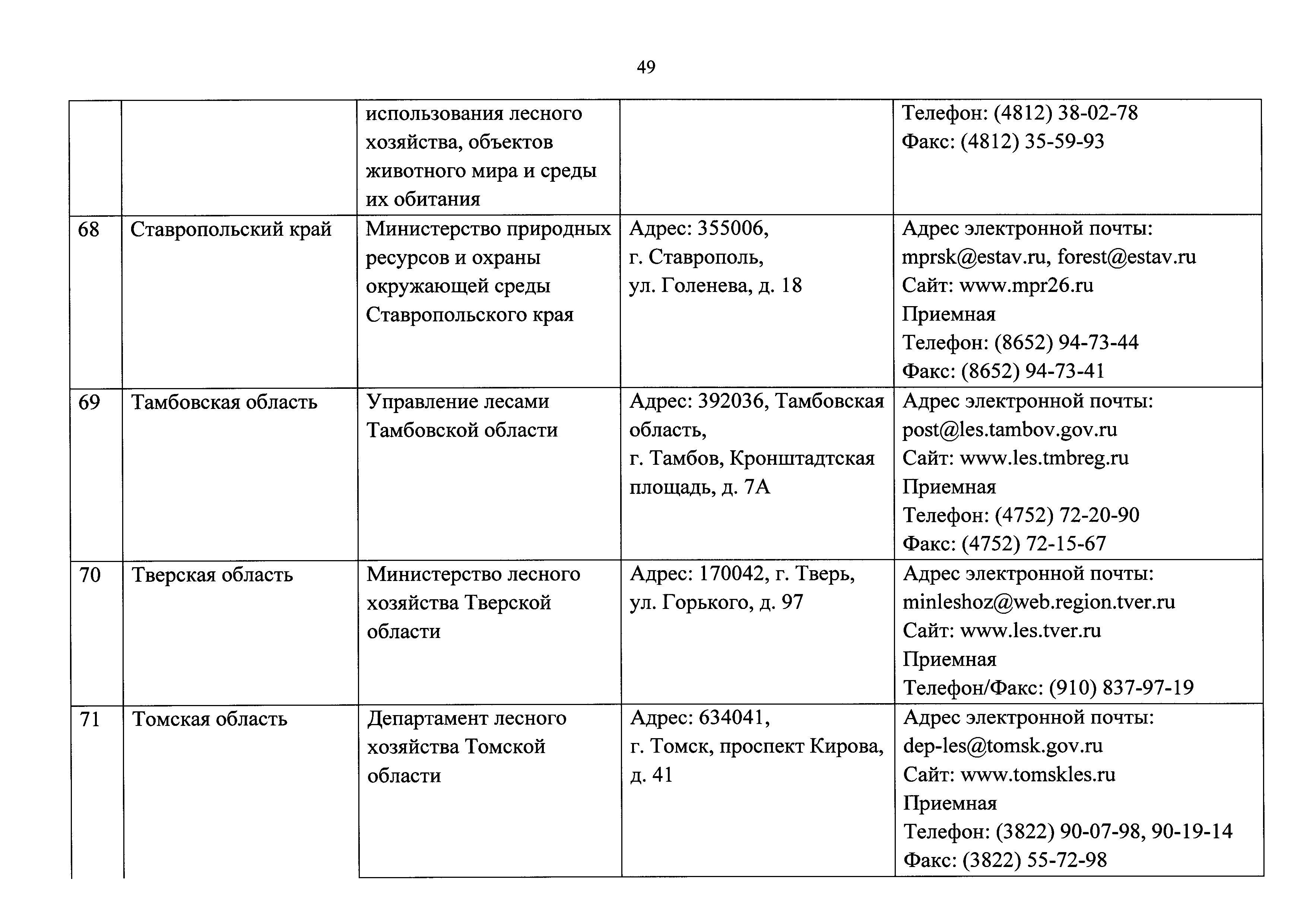 | Оглавление: | I. Общие положения II. Стандарт предоставления государственной услуги III. Состав, последовательность и сроки выполнения административных процедур (действий), требования к порядку их выполнения, в том числе особенности выполнения административных процедур (действий) в электронной форме IV. Формы контроля за предоставлением государственной услуги V. Досудебный (внесудебный) порядок обжалования решений и действий (бездействия) уполномоченного органа, предоставляющего государственную услугу, а также его должностных лиц Приложение 1. Информация о местах нахождения, справочных телефонах, адресах официальных сайтов в информационно-телекоммуникационной сети "Интернет", электронной почты органов государственной власти субъектов Российской Федерации в области лесных отношений Приложение 2. Блок-схема предоставления органом государственной власти субъекта Российской Федерации в области лесных отношений государственной услуги по проведению государственной экспертизы проектов освоения лесов, расположенных на землях лесного фонда Приложение 3. Заявление о проведении государственной экспертизы проекта освоения лесов, расположенных на землях лесного фонда |
