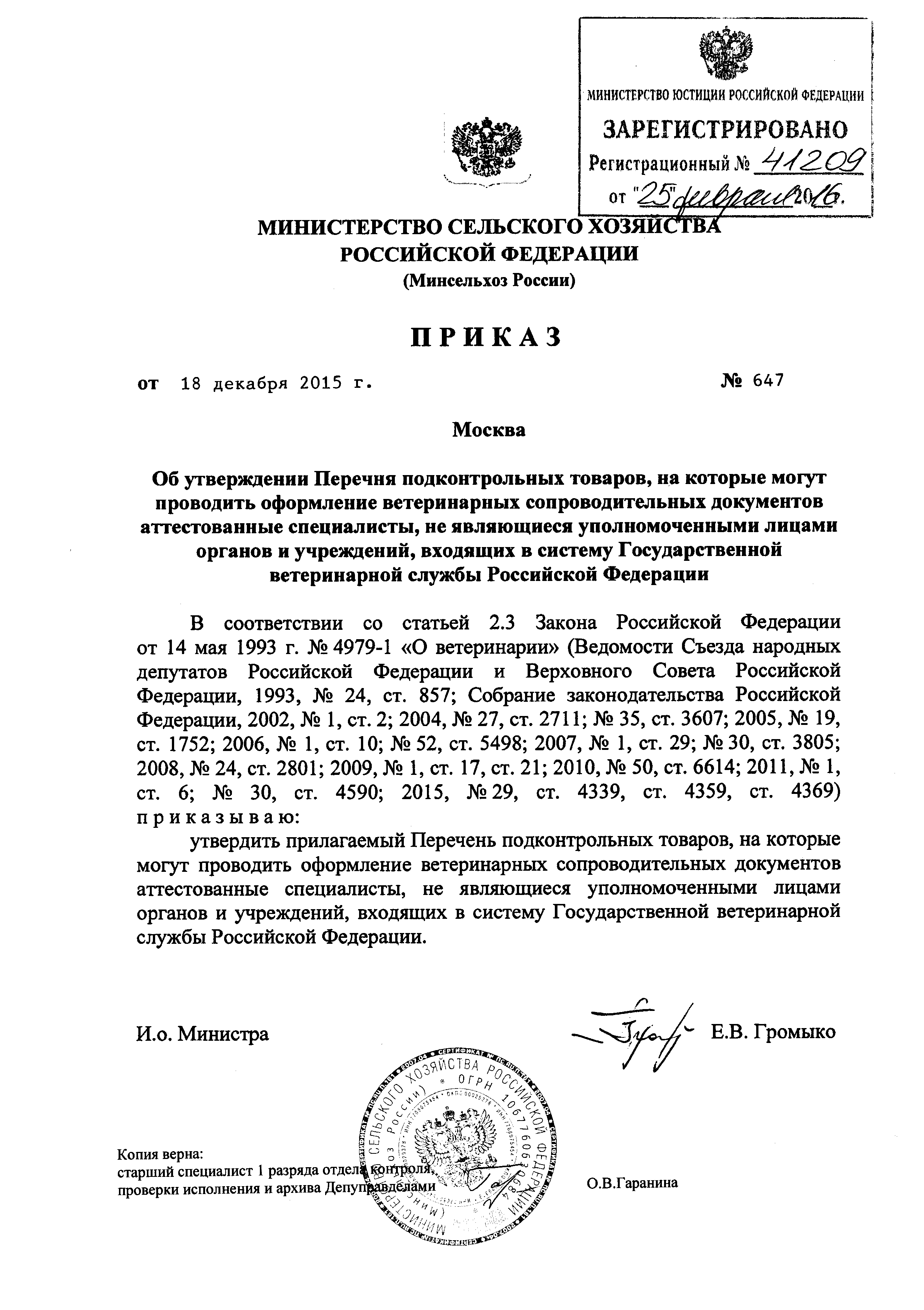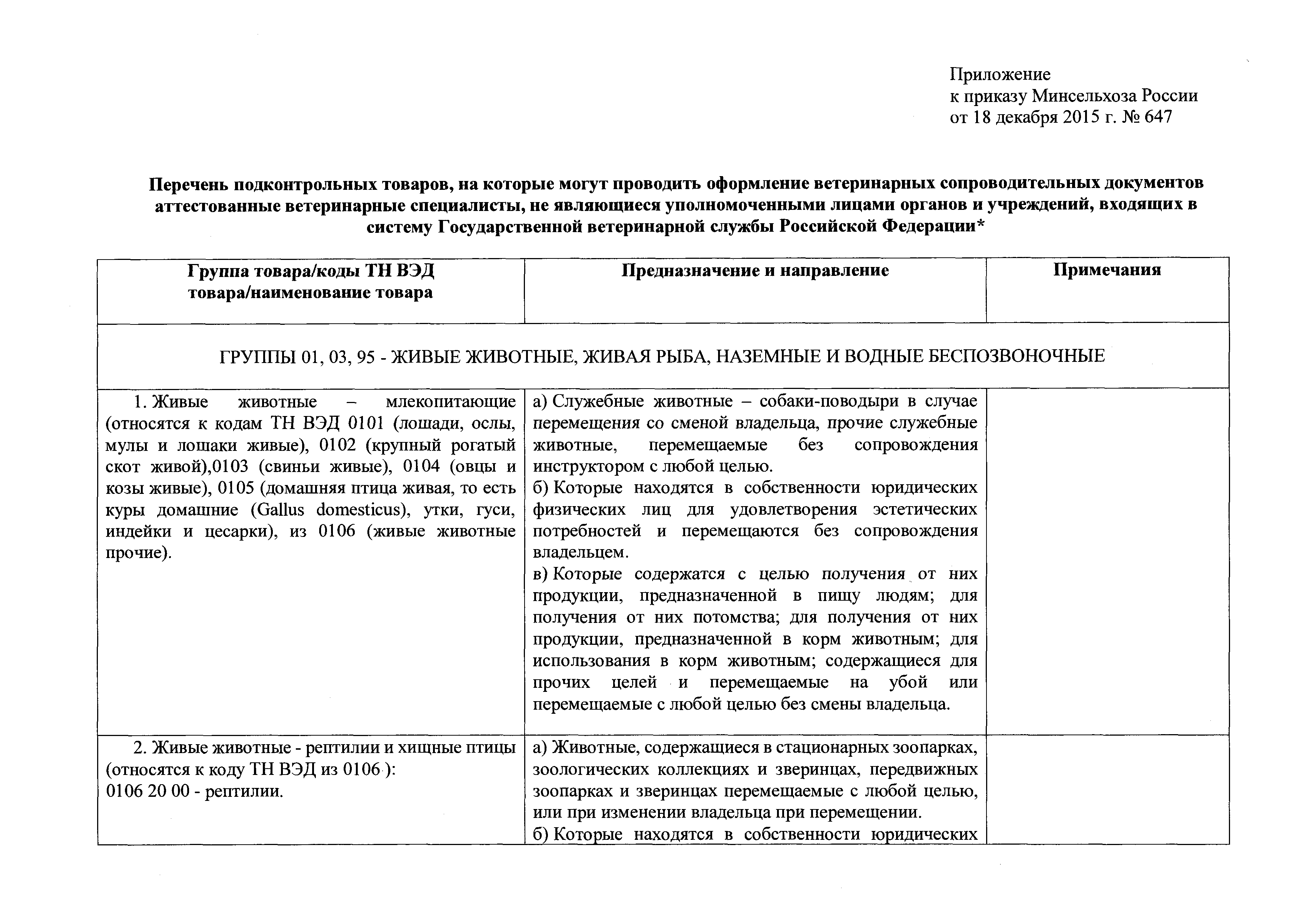 Перечень подконтрольных товаров, на которые могут проводить оформление ветеринарных сопроводительных документов аттестованные ветеринарные специалисты, не являющиеся уполномоченными лицами органов и учреждений, входящих в систему Государственной ветеринарной службы Российской Федерации| Статус: | утратил силу | | Название рус.: | Перечень подконтрольных товаров, на которые могут проводить оформление ветеринарных сопроводительных документов аттестованные ветеринарные специалисты, не являющиеся уполномоченными лицами органов и учреждений, входящих в систему Государственной ветеринарной службы Российской Федерации | | Дата добавления в базу: | 01.01.2019 | | Дата актуализации: | 01.01.2021 | | Дата введения: | 11.03.2016 | | Дата окончания срока действия: | 01.07.2019 | | Утверждён: | 18.12.2015 Министерство сельского хозяйства Российской Федерации (647)
