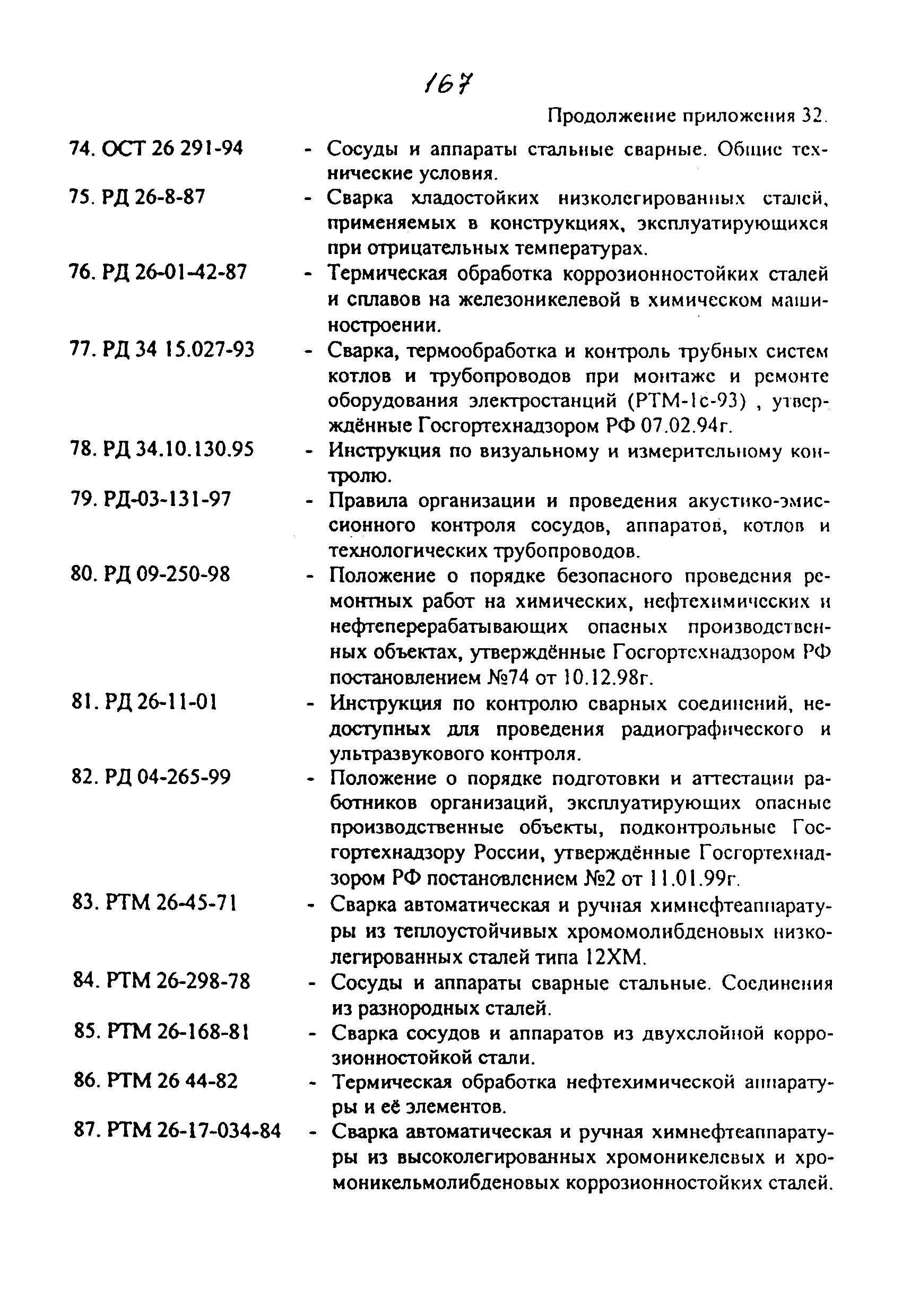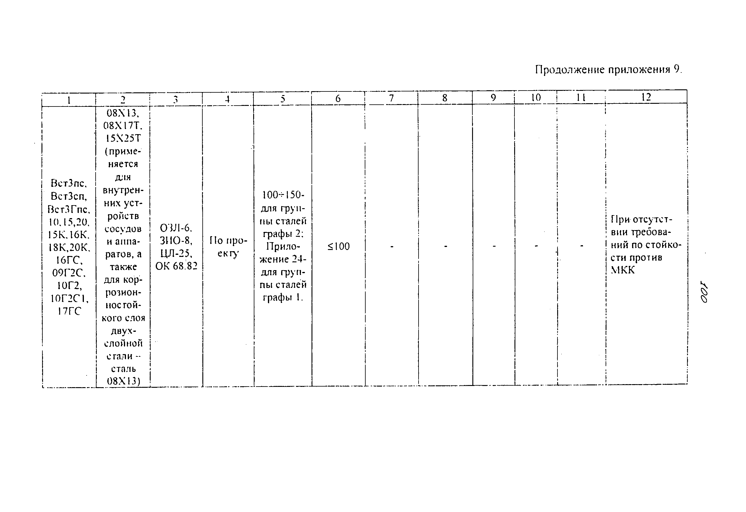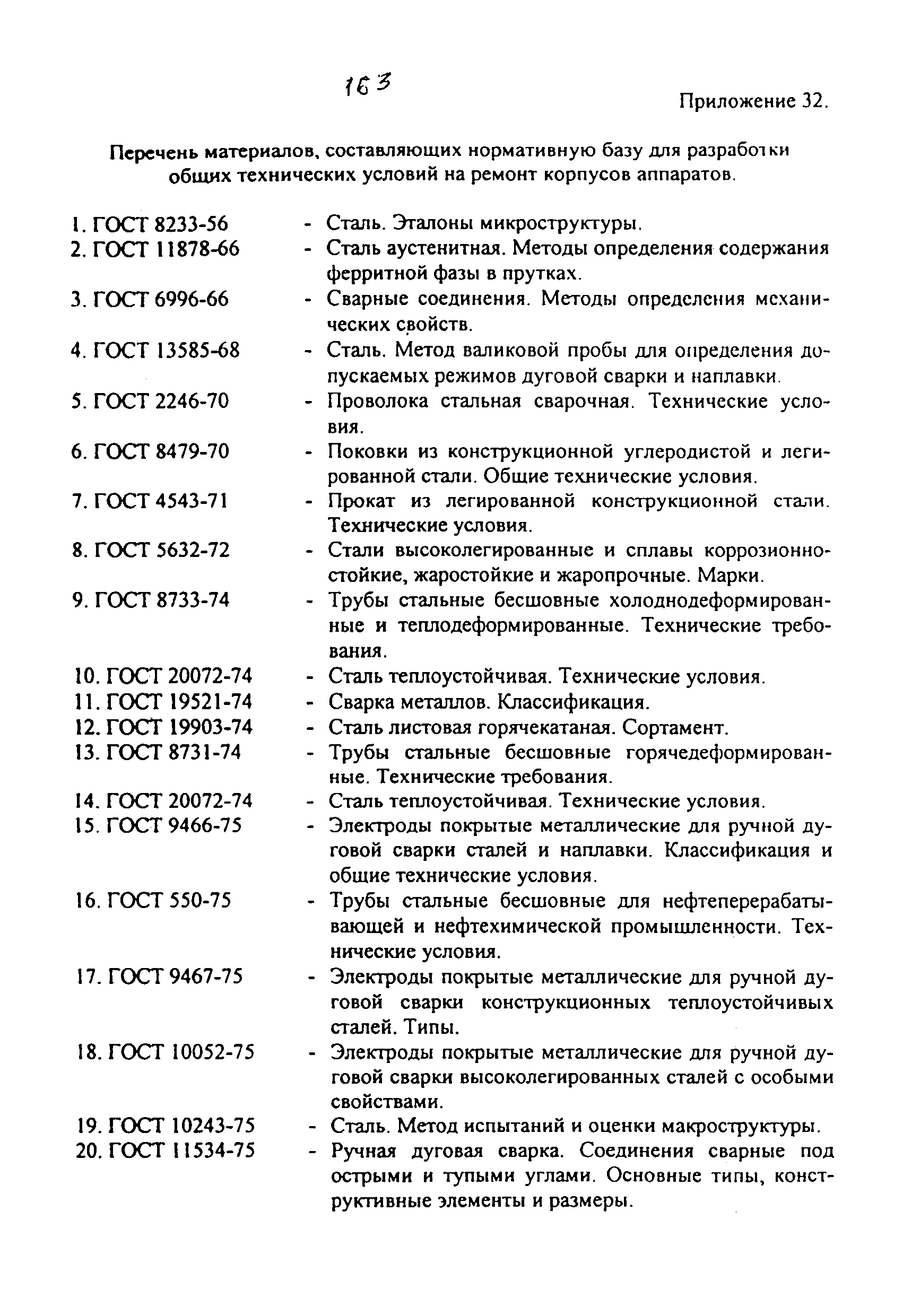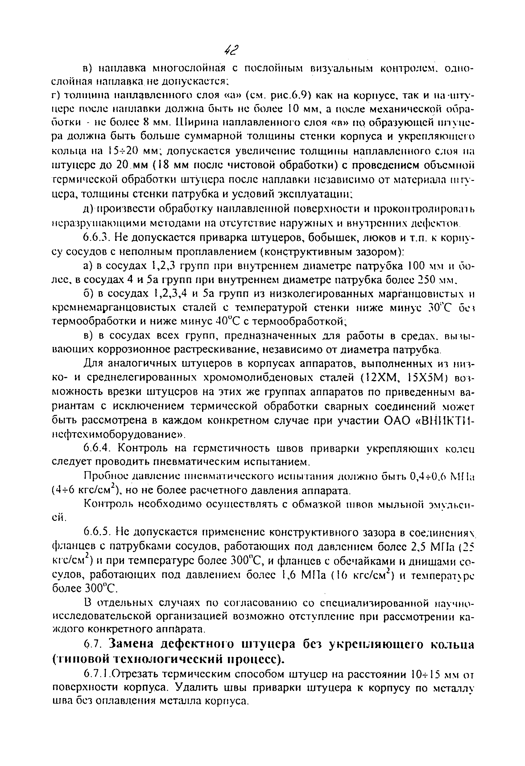 | | Нормативные ссылки: |   ПБ 10-115-96 «Правила устройства и безопасной эксплуатации сосудов, работающих под давлением»  ГОСТ 21.401-88 «Система проектной документации для строительства. Технология производства. Основные требования к рабочим чертежам»  ГОСТ 380-94 «Сталь углеродистая обыкновенного качества. Марки»  ГОСТ 535-88 «Прокат сортовой и фасонный из стали углеродистой обыкновенного качества. Общие технические условия»  ГОСТ 1050-88 «Прокат сортовой, калиброванный, со специальной отделкой поверхности из углеродистой качественной конструкционной стали. Общие технические условия»  ГОСТ 1577-93 «Прокат толстолистовой и широкополосный из конструкционной качественной стали. Технические условия»  ГОСТ 2246-70 «Проволока стальная сварочная. Технические условия»  ГОСТ 2601-84 «Сварка металлов. Термины и определения основных понятий»  ГОСТ 3242-79 «Соединения сварные. Методы контроля качества»  ГОСТ 5264-80 «Ручная дуговая сварка. Соединения сварные. Основные типы, конструктивные элементы и размеры»  ГОСТ 5520-79 «Прокат листовой из углеродистой, низколегированной и легированной стали для котлов и сосудов, работающих под давлением. Технические условия»  ГОСТ 5632-72 «Стали высоколегированные и сплавы коррозионно-стойкие, жаростойкие и жаропрочные. Марки»  ГОСТ 6996-66 «Сварные соединения. Методы определения механических свойств»  ГОСТ 7512-82 «Контроль неразрушающий. Соединения сварные. Радиографический метод»  ГОСТ 9466-75 «Электроды покрытые металлические для ручной дуговой сварки сталей и наплавки. Классификация и общие технические условия»  ГОСТ 9467-75 «Электроды покрытые металлические для ручной дуговой сварки конструкционных и теплоустойчивых сталей. Типы»  ГОСТ 10706-76 «Трубы стальные электросварные прямошовные. Технические требования»  ГОСТ 10707-80 «Трубы стальные электросварные холоднодеформированные. Технические условия»  ГОСТ 14637-89 «Прокат толстолистовой из углеродистой стали обыкновенного качества. Технические условия»  ГОСТ 14782-86 «Контроль неразрушающий. Соединения сварные. Методы ультразвуковые»  ГОСТ 16037-80 «Соединения сварные стальных трубопроводов. Основные типы, конструктивные элементы и размеры»  ГОСТ 16098-80 «Соединения сварные из двухслойной коррозионностойкой стали. Основные типы, конструктивные элементы и размеры»  ГОСТ 19281-89 «Прокат из стали повышенной прочности. Общие технические условия»  ГОСТ 19521-74 «Сварка металлов. Классификация»  ГОСТ 19903-74 «Прокат листовой горячекатаный. Сортамент»  ГОСТ 19904-90 «Прокат листовой холоднокатаный. Сортамент»  ГОСТ 20072-74 «Сталь теплоустойчивая. Технические условия»  ГОСТ 12.1.005-88 «Система стандартов безопасности труда. Общие санитарно-гигиенические требования к воздуху рабочей зоны»  ГОСТ 12.1.007-76 «Система стандартов безопасности труда. Вредные вещества. Классификация и общие требования безопасности»  ГОСТ 12.1.044-89 «Система стандартов безопасности труда. Пожаровзрывоопасность веществ и материалов. Номенклатура показателей и методы их определения»  ГОСТ 15467-79 «Управление качеством продукции. Основные понятия. Термины и определения»  ГОСТ 16504-81 «Система государственных испытаний продукции. Испытания и контроль качества продукции. Основные термины и определения»  ГОСТ 18442-80 «Контроль неразрушающий. Капиллярные методы. Общие требования»  ГОСТ 9941-81 «Трубы бесшовные холодно- и теплодеформированные из корр