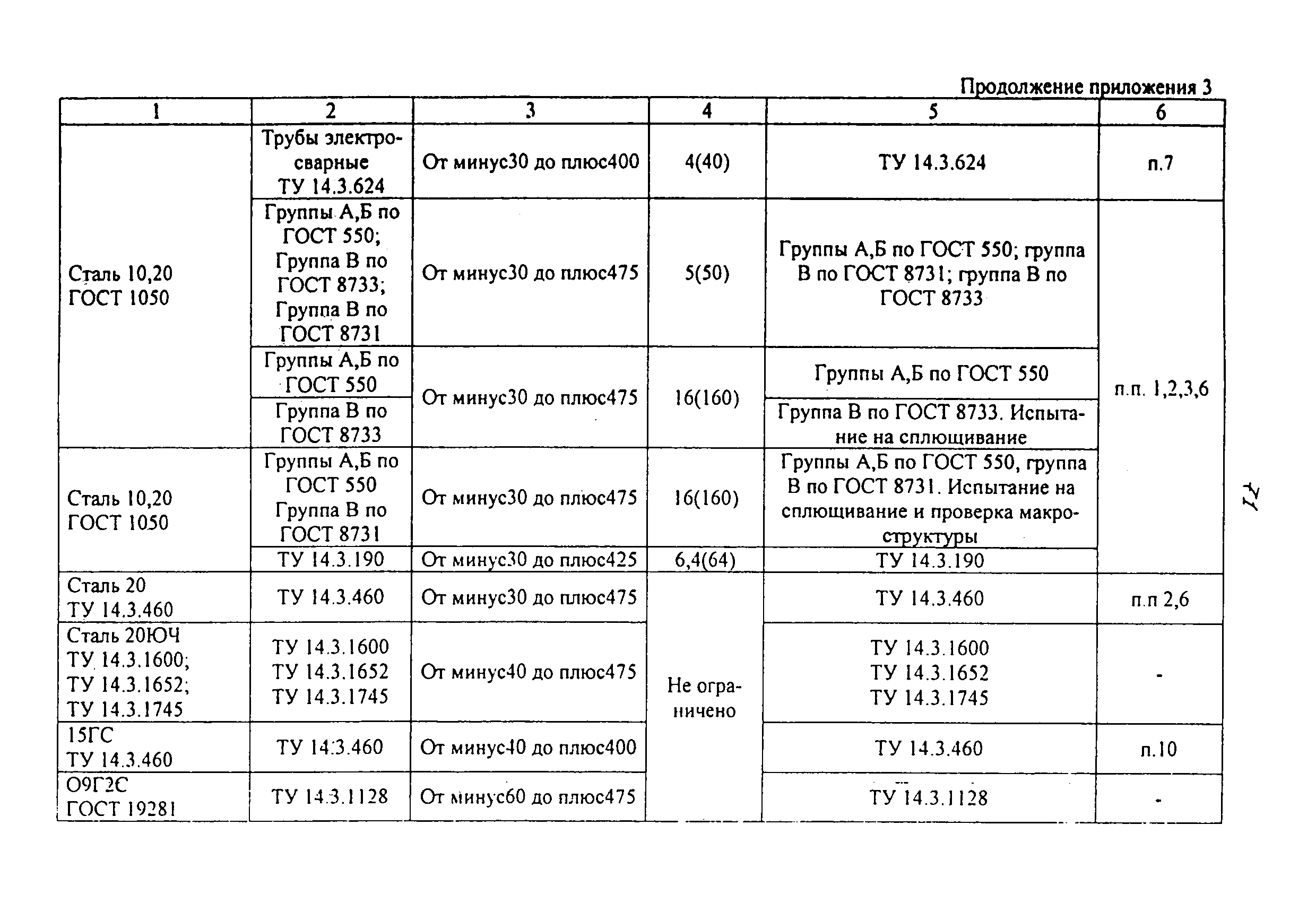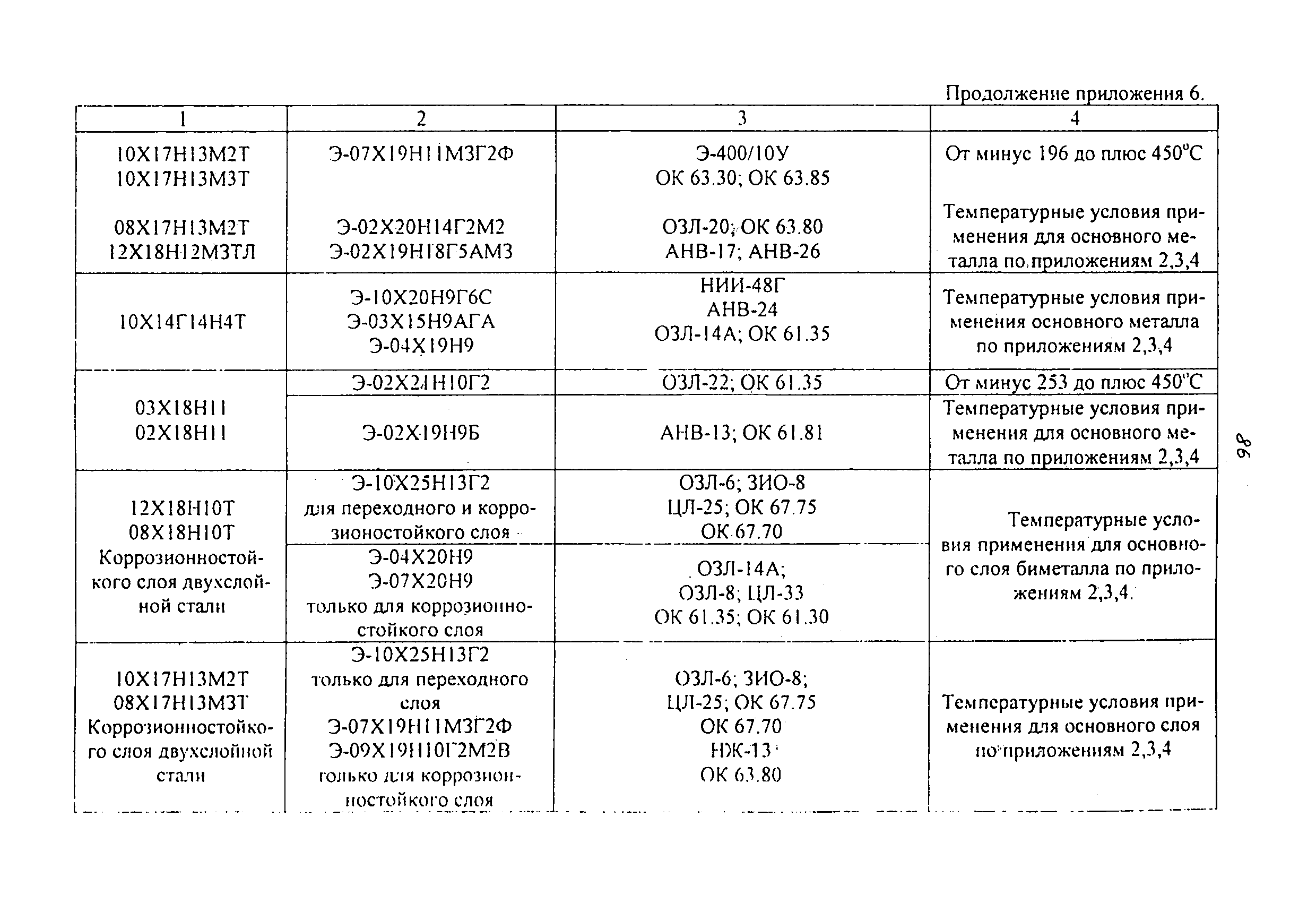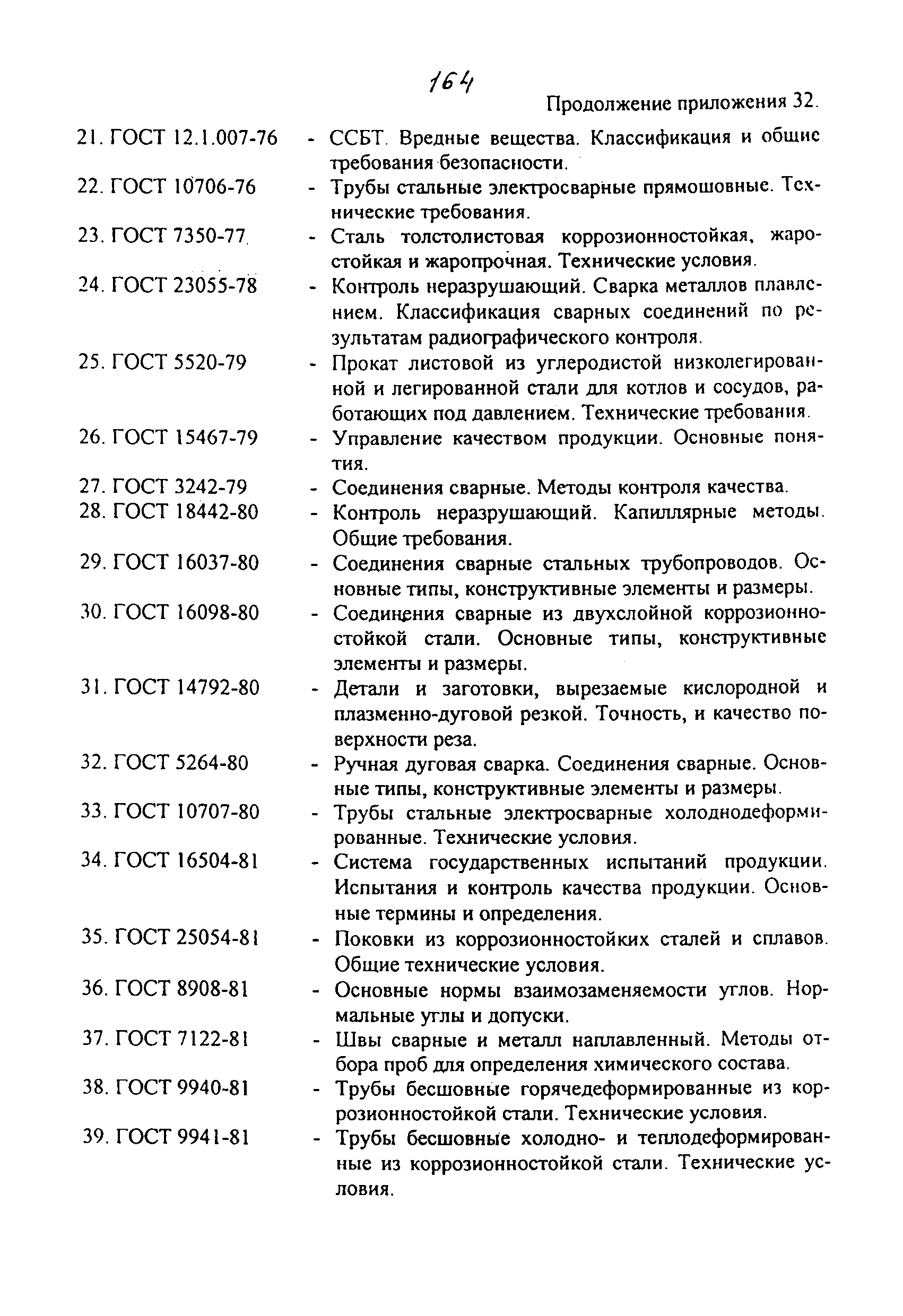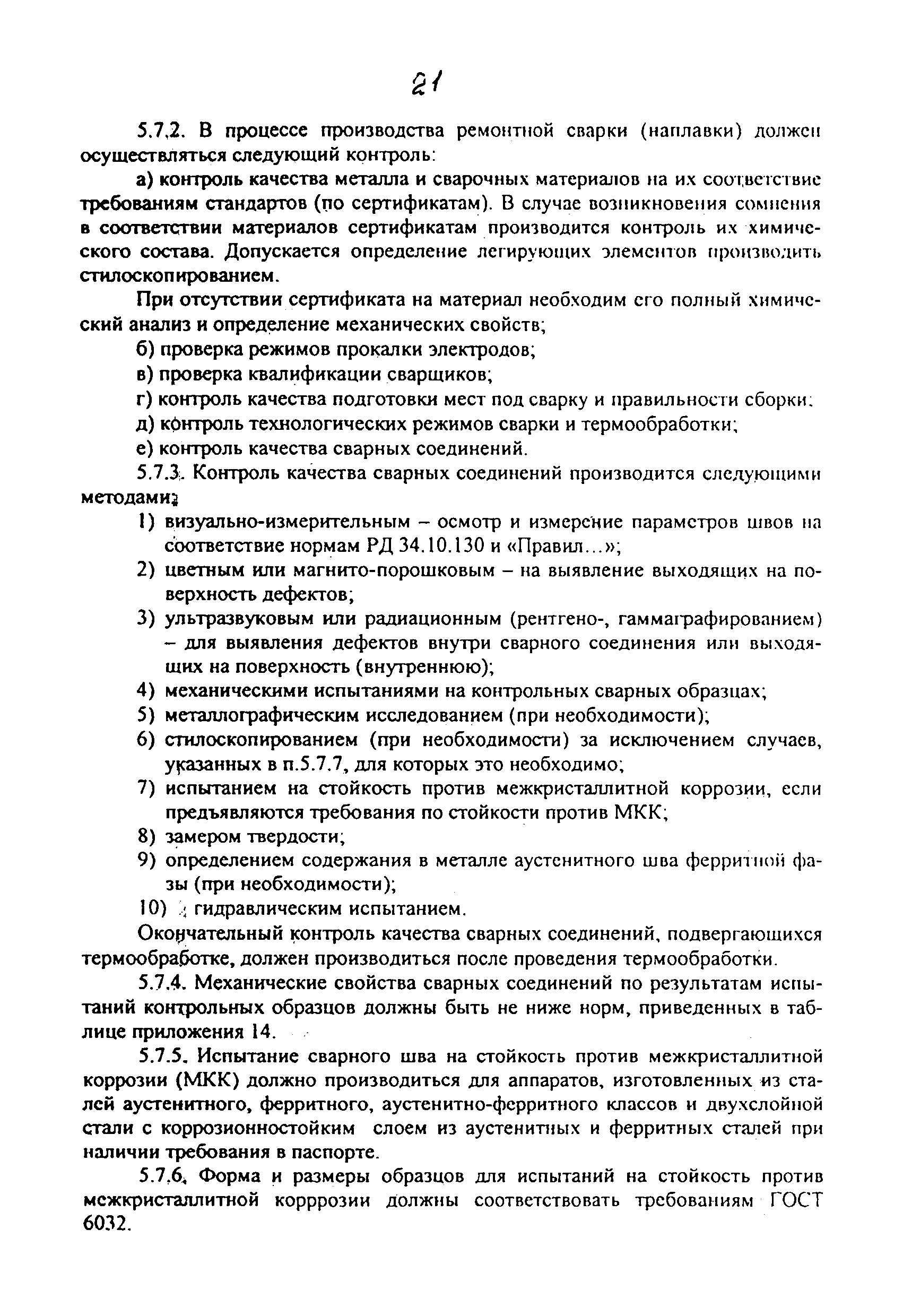 | | Нормативные ссылки: |   ПБ 10-115-96 «Правила устройства и безопасной эксплуатации сосудов, работающих под давлением»  ГОСТ 21.401-88 «Система проектной документации для строительства. Технология производства. Основные требования к рабочим чертежам»  ГОСТ 380-94 «Сталь углеродистая обыкновенного качества. Марки»  ГОСТ 535-88 «Прокат сортовой и фасонный из стали углеродистой обыкновенного качества. Общие технические условия»  ГОСТ 1050-88 «Прокат сортовой, калиброванный, со специальной отделкой поверхности из углеродистой качественной конструкционной стали. Общие технические условия»  ГОСТ 1577-93 «Прокат толстолистовой и широкополосный из конструкционной качественной стали. Технические условия»  ГОСТ 2246-70 «Проволока стальная сварочная. Технические условия»  ГОСТ 2601-84 «Сварка металлов. Термины и определения основных понятий»  ГОСТ 3242-79 «Соединения сварные. Методы контроля качества»  ГОСТ 5264-80 «Ручная дуговая сварка. Соединения сварные. Основные типы, конструктивные элементы и размеры»  ГОСТ 5520-79 «Прокат листовой из углеродистой, низколегированной и легированной стали для котлов и сосудов, работающих под давлением. Технические условия»  ГОСТ 5632-72 «Стали высоколегированные и сплавы коррозионно-стойкие, жаростойкие и жаропрочные. Марки»  ГОСТ 6996-66 «Сварные соединения. Методы определения механических свойств»  ГОСТ 7512-82 «Контроль неразрушающий. Соединения сварные. Радиографический метод»  ГОСТ 9466-75 «Электроды покрытые металлические для ручной дуговой сварки сталей и наплавки. Классификация и общие технические условия»  ГОСТ 9467-75 «Электроды покрытые металлические для ручной дуговой сварки конструкционных и теплоустойчивых сталей. Типы»  ГОСТ 10706-76 «Трубы стальные электросварные прямошовные. Технические требования»  ГОСТ 10707-80 «Трубы стальные электросварные холоднодеформированные. Технические условия»  ГОСТ 14637-89 «Прокат толстолистовой из углеродистой стали обыкновенного качества. Технические условия»  ГОСТ 14782-86 «Контроль неразрушающий. Соединения сварные. Методы ультразвуковые»  ГОСТ 16037-80 «Соединения сварные стальных трубопроводов. Основные типы, конструктивные элементы и размеры»  ГОСТ 16098-80 «Соединения сварные из двухслойной коррозионностойкой стали. Основные типы, конструктивные элементы и размеры»  ГОСТ 19281-89 «Прокат из стали повышенной прочности. Общие технические условия»  ГОСТ 19521-74 «Сварка металлов. Классификация»  ГОСТ 19903-74 «Прокат листовой горячекатаный. Сортамент»  ГОСТ 19904-90 «Прокат листовой холоднокатаный. Сортамент»  ГОСТ 20072-74 «Сталь теплоустойчивая. Технические условия»  ГОСТ 12.1.005-88 «Система стандартов безопасности труда. Общие санитарно-гигиенические требования к воздуху рабочей зоны»  ГОСТ 12.1.007-76 «Система стандартов безопасности труда. Вредные вещества. Классификация и общие требования безопасности»  ГОСТ 12.1.044-89 «Система стандартов безопасности труда. Пожаровзрывоопасность веществ и материалов. Номенклатура показателей и методы их определения»  ГОСТ 15467-79 «Управление качеством продукции. Основные понятия. Термины и определения»  ГОСТ 16504-81 «Система государственных испытаний продукции. Испытания и контроль качества продукции. Основные термины и определения»  ГОСТ 18442-80 «Контроль неразрушающий. Капиллярные методы. Общие требования»  ГОСТ 9941-81 «Трубы бесшовные холодно- и теплодеформированные из корр